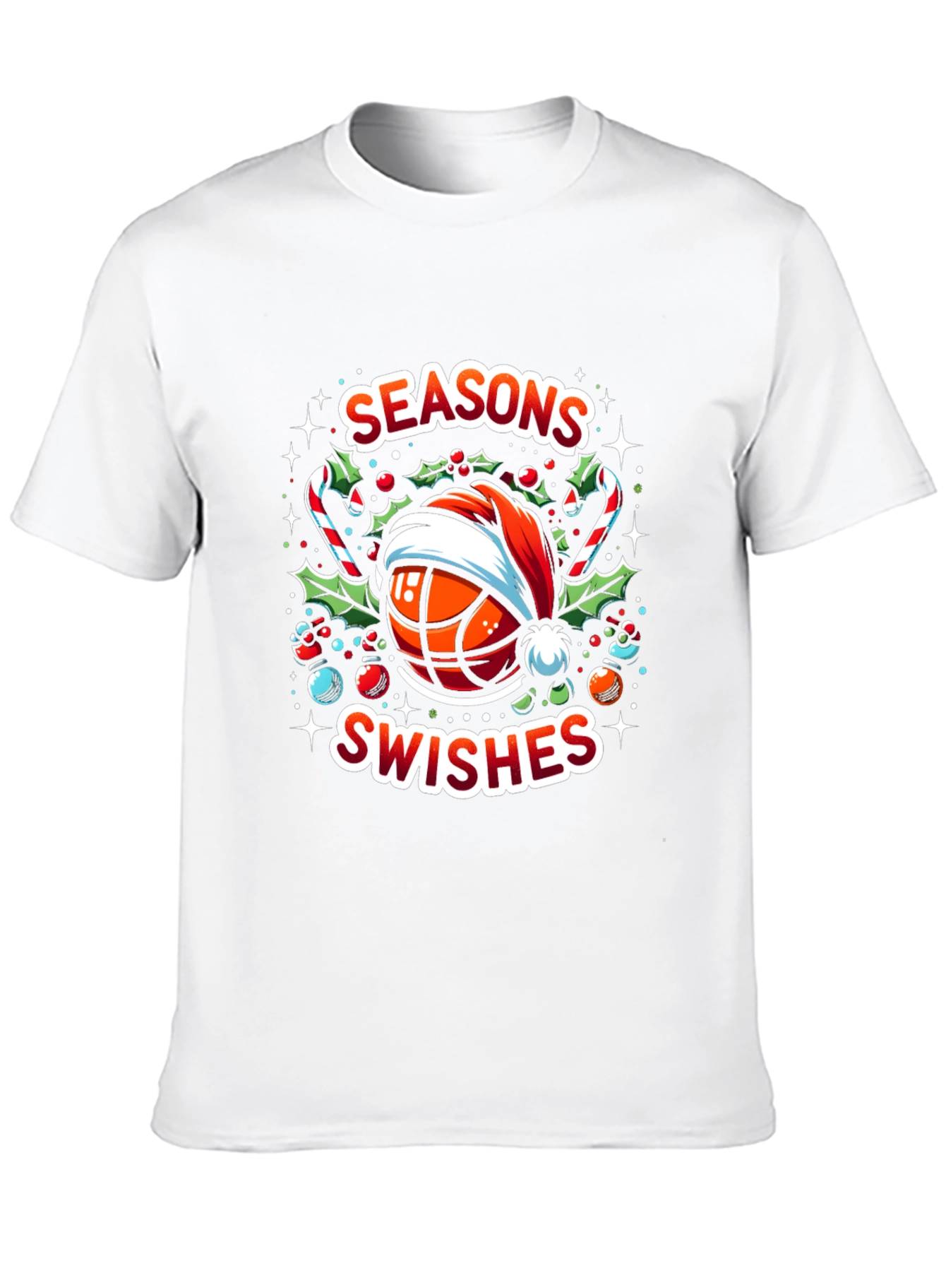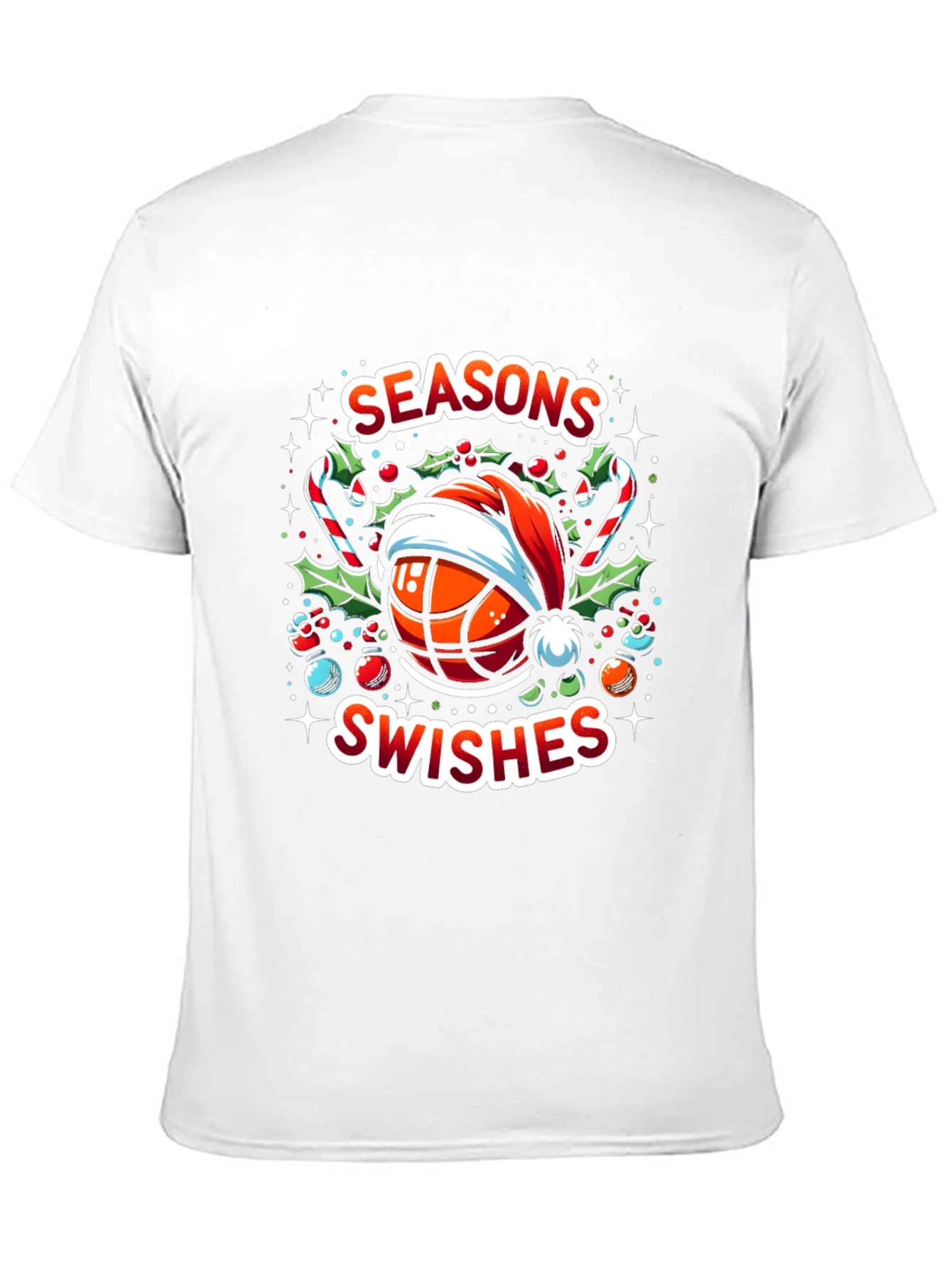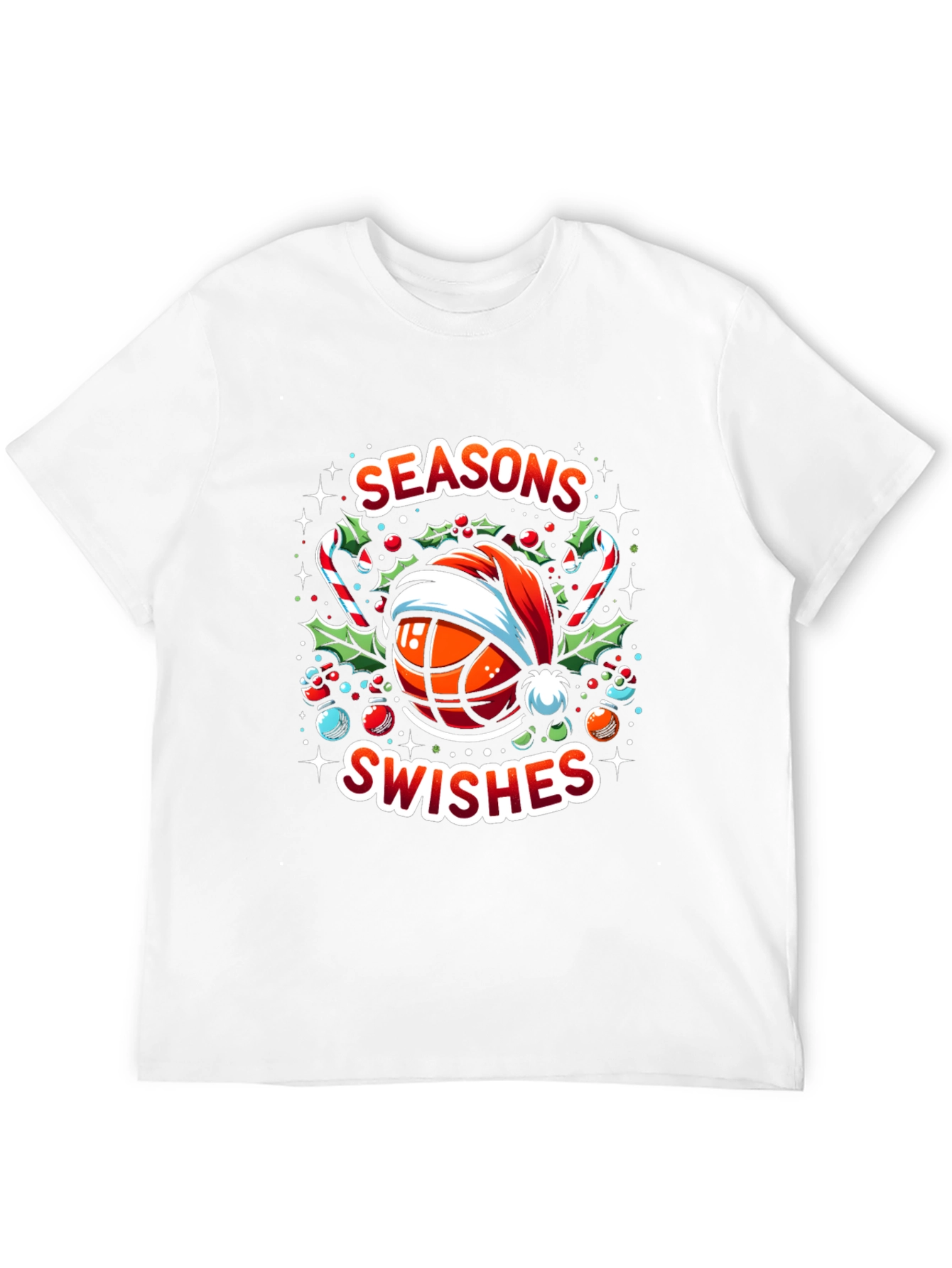 Celebra la temporada navideña con esta divertida camiseta negra. Presenta un diseño festivo que incluye un balón de baloncesto con un gorro de Papá Noel, bastones de caramelo y adornos navideños. La frase "Seasons Swishes" añade un toque deportivo y alegre. Perfecta para los amantes del baloncesto que desean mostrar su espíritu navideño con estilo. Ideal para usar en fiestas navideñas informales, entrenamientos de baloncesto temáticos o como un regalo original para un fanático del baloncesto. ¡Destaca en estas fiestas con esta camiseta única y llena de espíritu navideño!