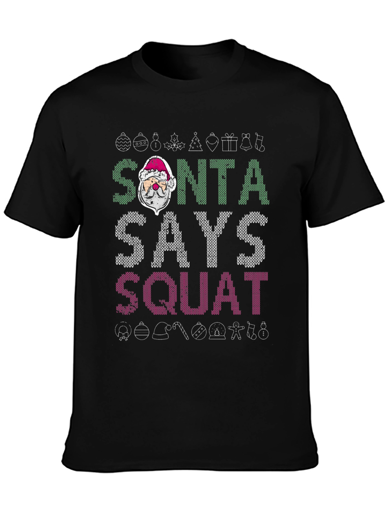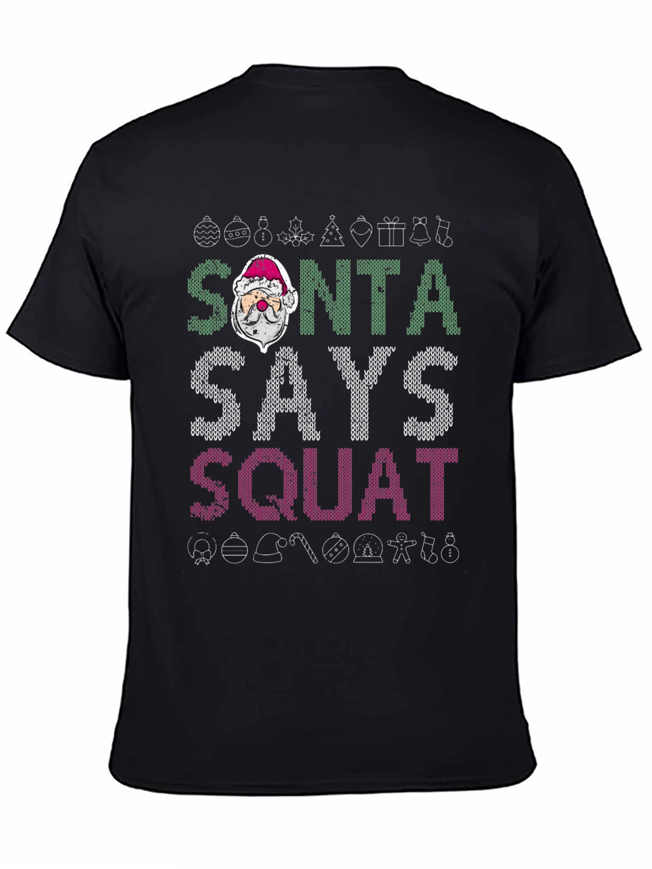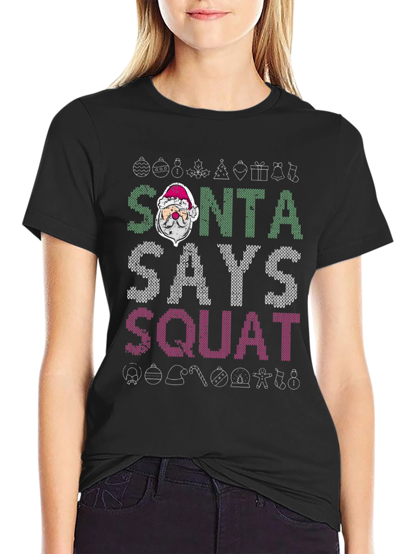 Prepárate para la temporada navideña con esta divertida camiseta negra. Presenta un diseño original con la frase "Santa Says Squat" en letras de estilo tejido, con Santa Claus y motivos navideños como adornos y regalos. Ideal para las fiestas navideñas, esta camiseta es perfecta para aquellos que aman la Navidad y el ejercicio. ¡Muestra tu espíritu festivo y tu amor por el fitness con esta prenda única y llamativa!