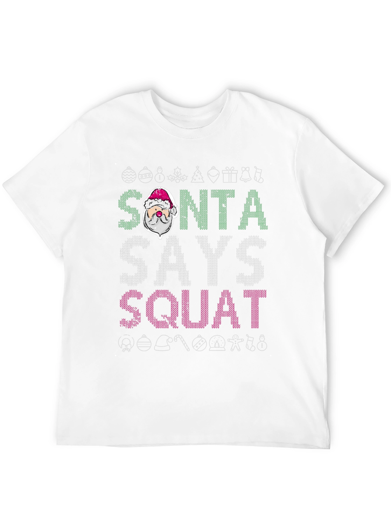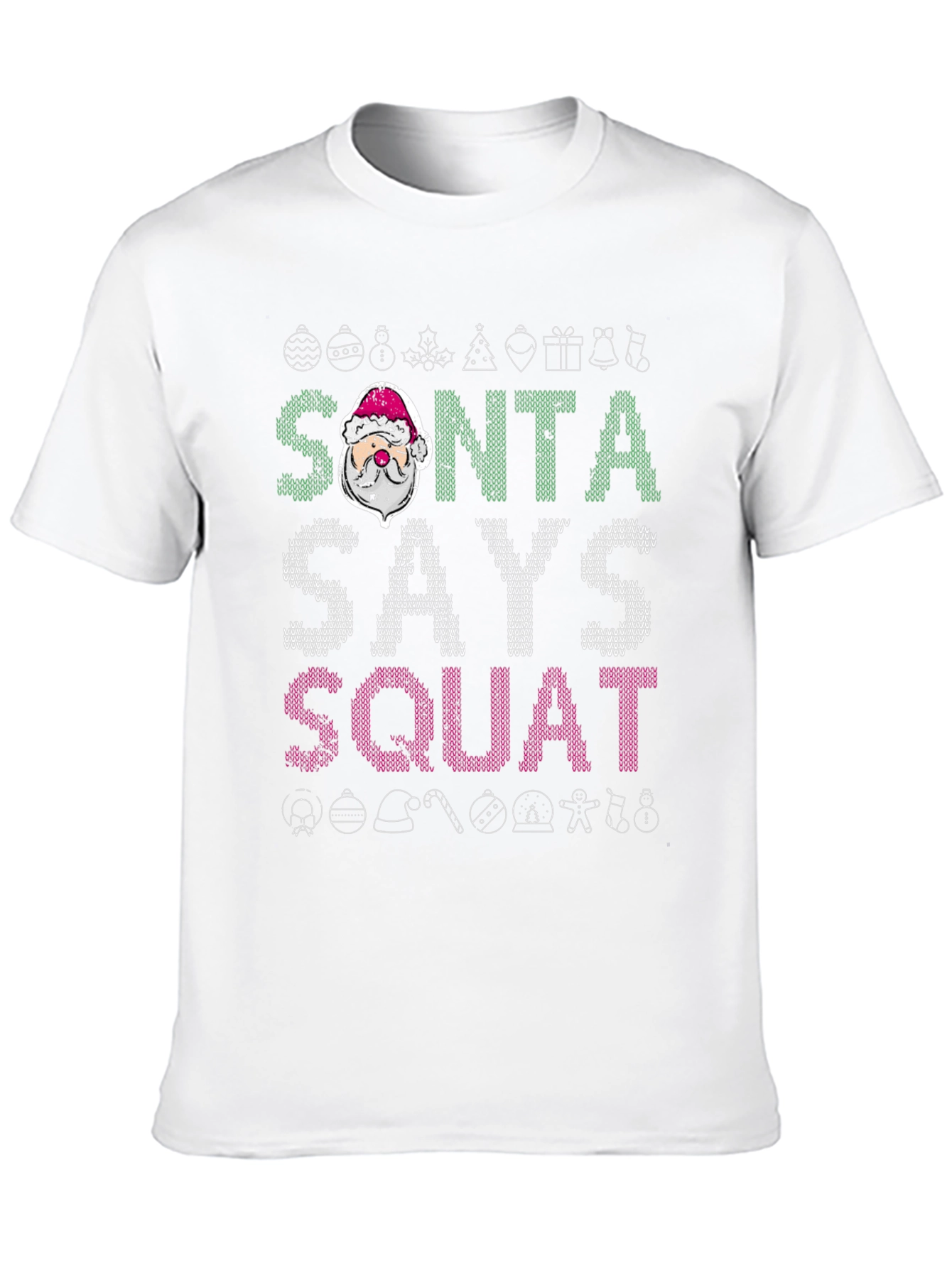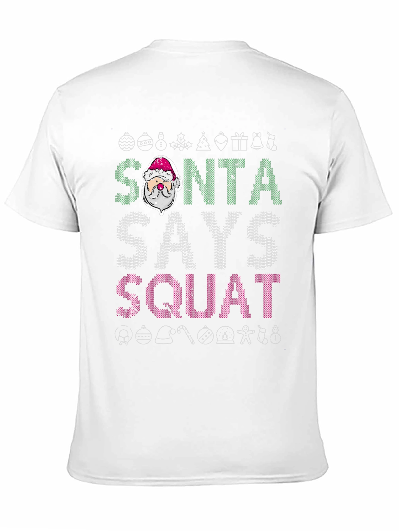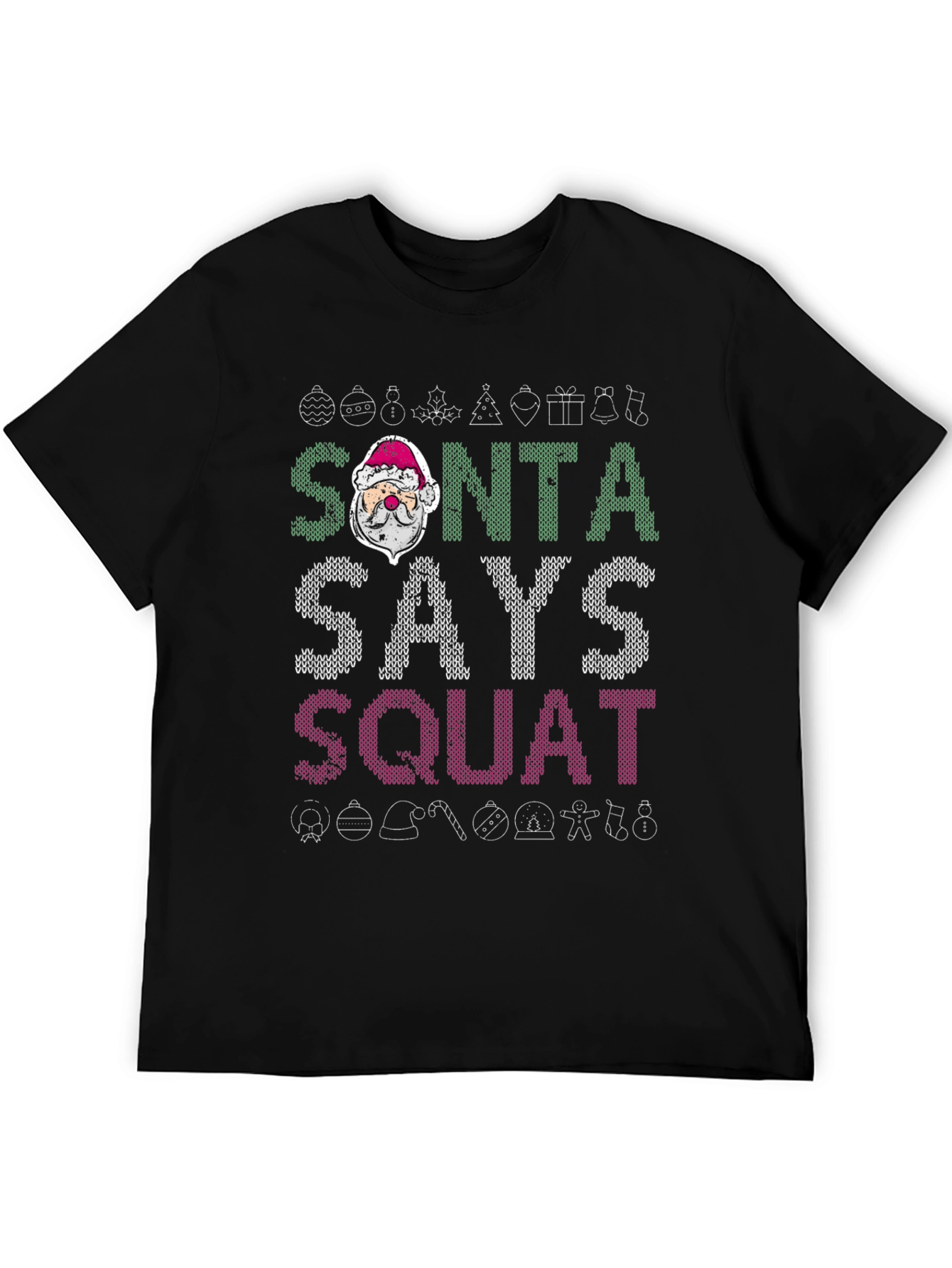 Prepárate para la temporada navideña con esta divertida camiseta negra. Presenta un diseño original con la frase "Santa Says Squat" en letras de estilo tejido, con Santa Claus y motivos navideños como adornos y regalos. Ideal para las fiestas navideñas, esta camiseta es perfecta para aquellos que aman la Navidad y el ejercicio. ¡Muestra tu espíritu festivo y tu amor por el fitness con esta prenda única y llamativa!