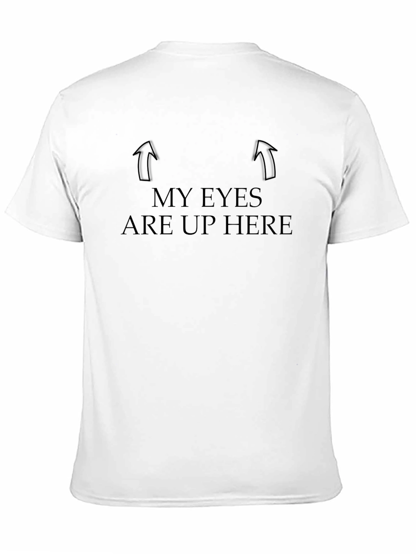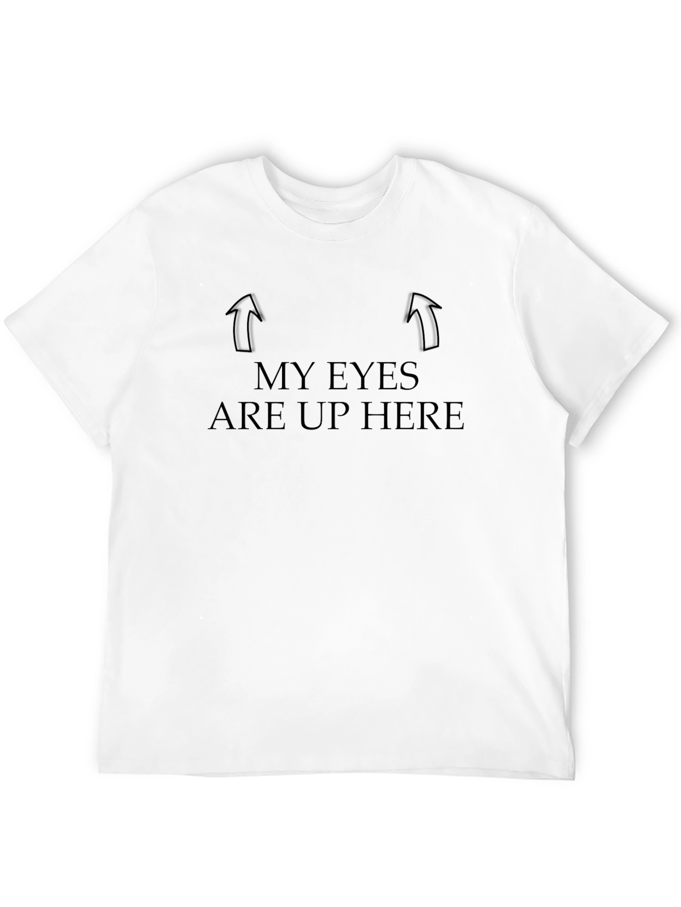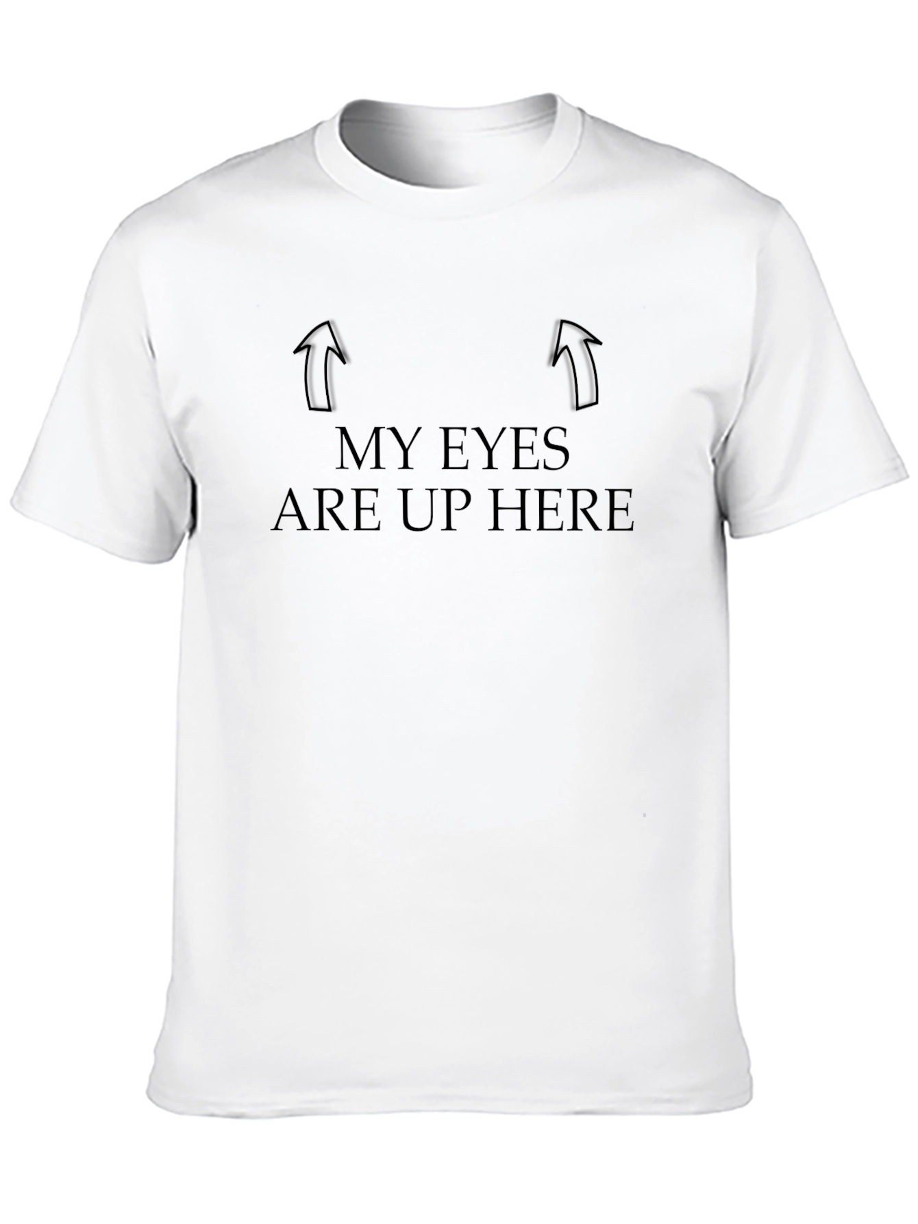 Esta camiseta negra presenta un diseño divertido y llamativo. Con la frase "MIS OJOS ESTÁN AQUÍ ARRIBA" impresa, acompañada de flechas apuntando hacia arriba, esta camiseta es perfecta para quienes buscan un toque de humor y originalidad en su vestimenta. Fabricada con materiales suaves y cómodos, esta prenda es ideal para usar en cualquier ocasión casual, desde una salida con amigos hasta un día relajado en casa. Su diseño clásico de manga corta y cuello redondo la convierte en una prenda versátil que se adapta a cualquier estilo. ¡Llama la atención con esta camiseta única y deja que tu sentido del humor brille!