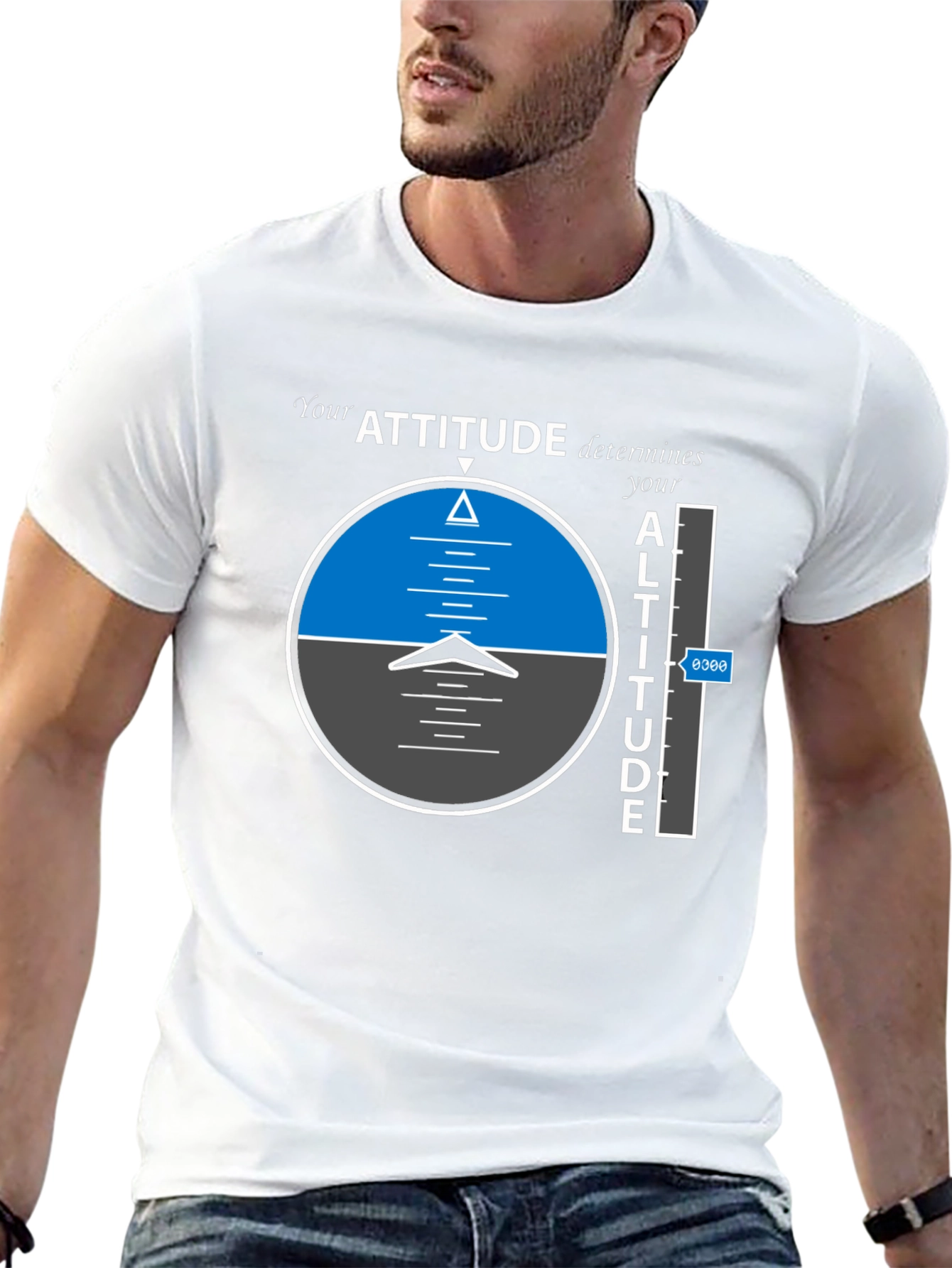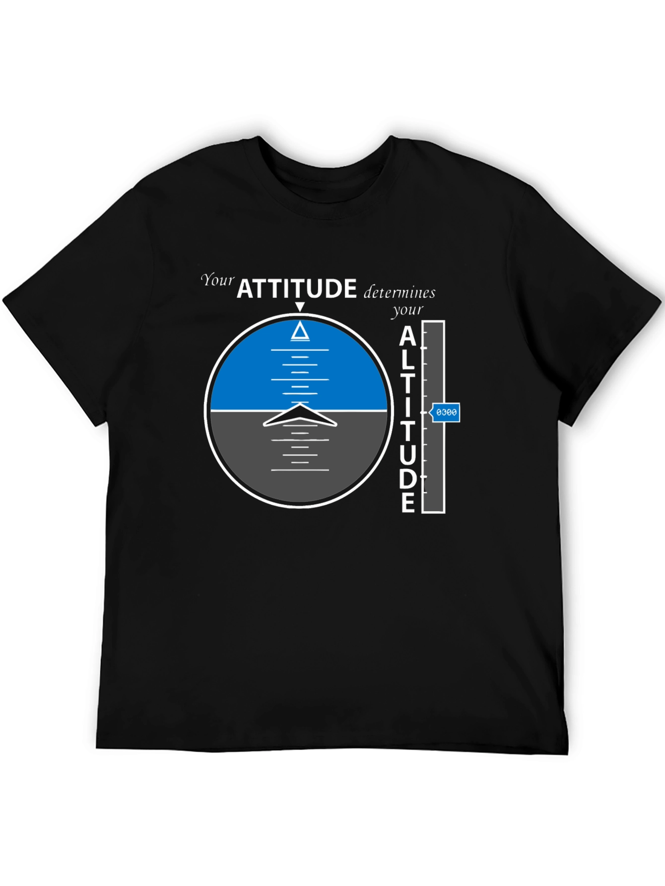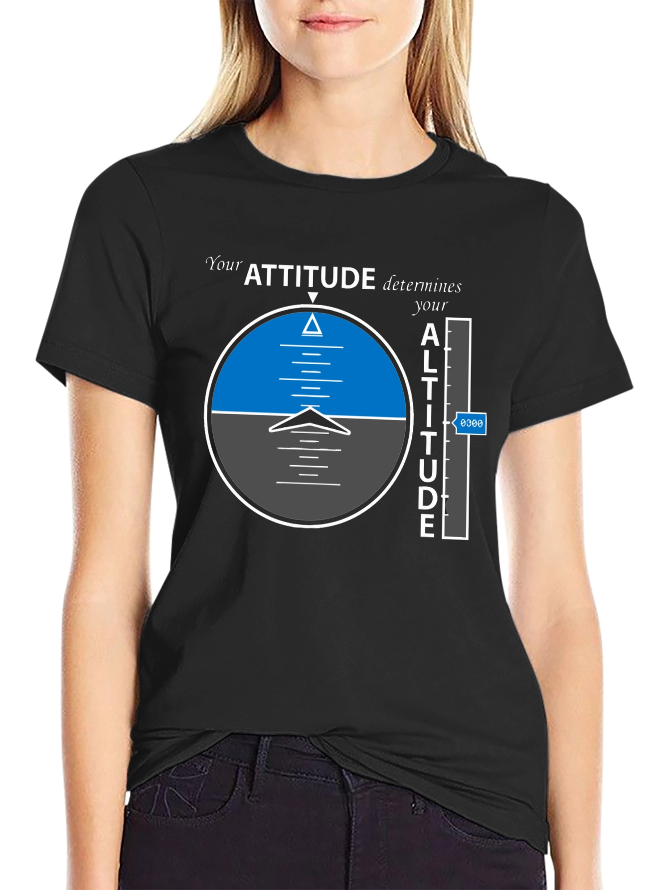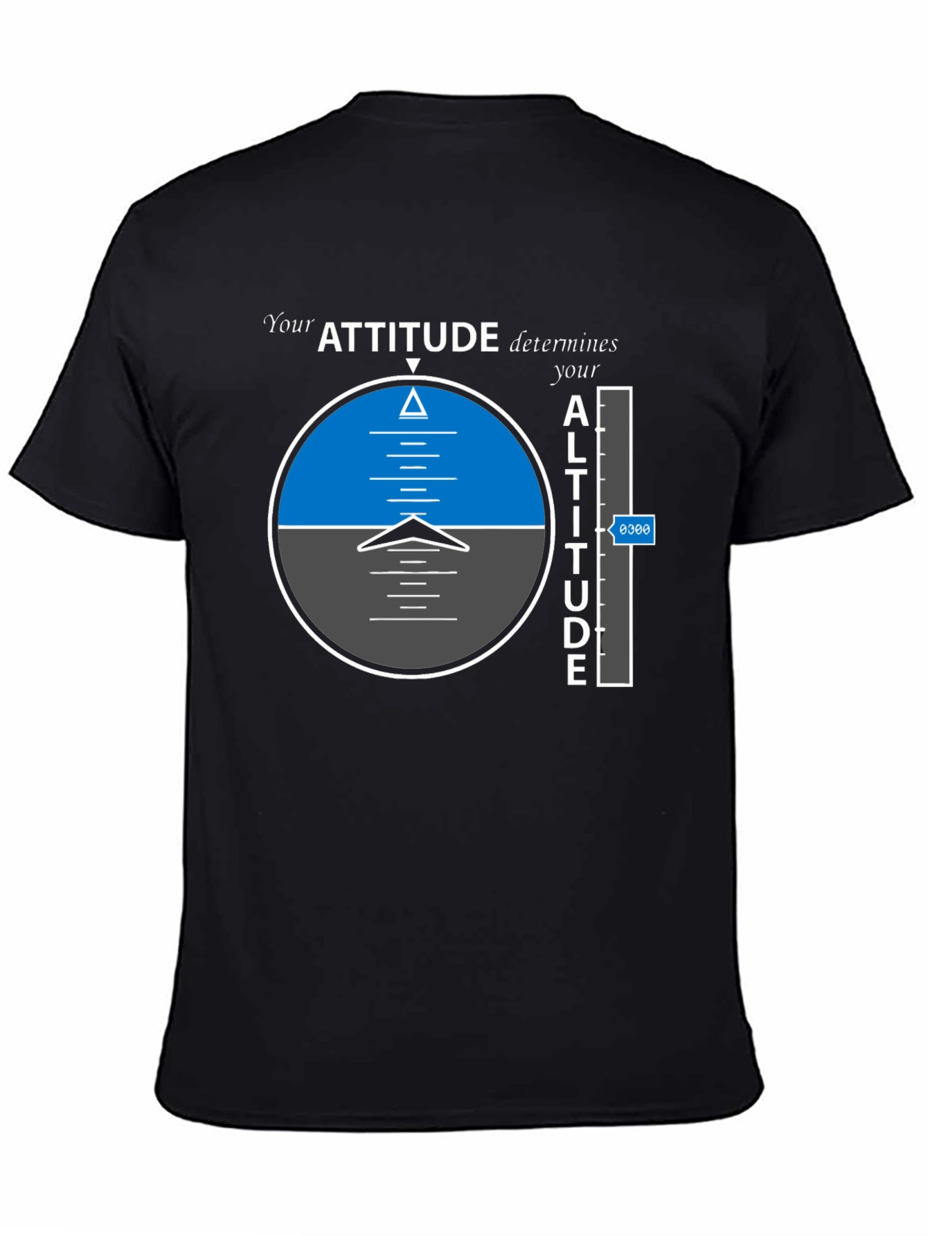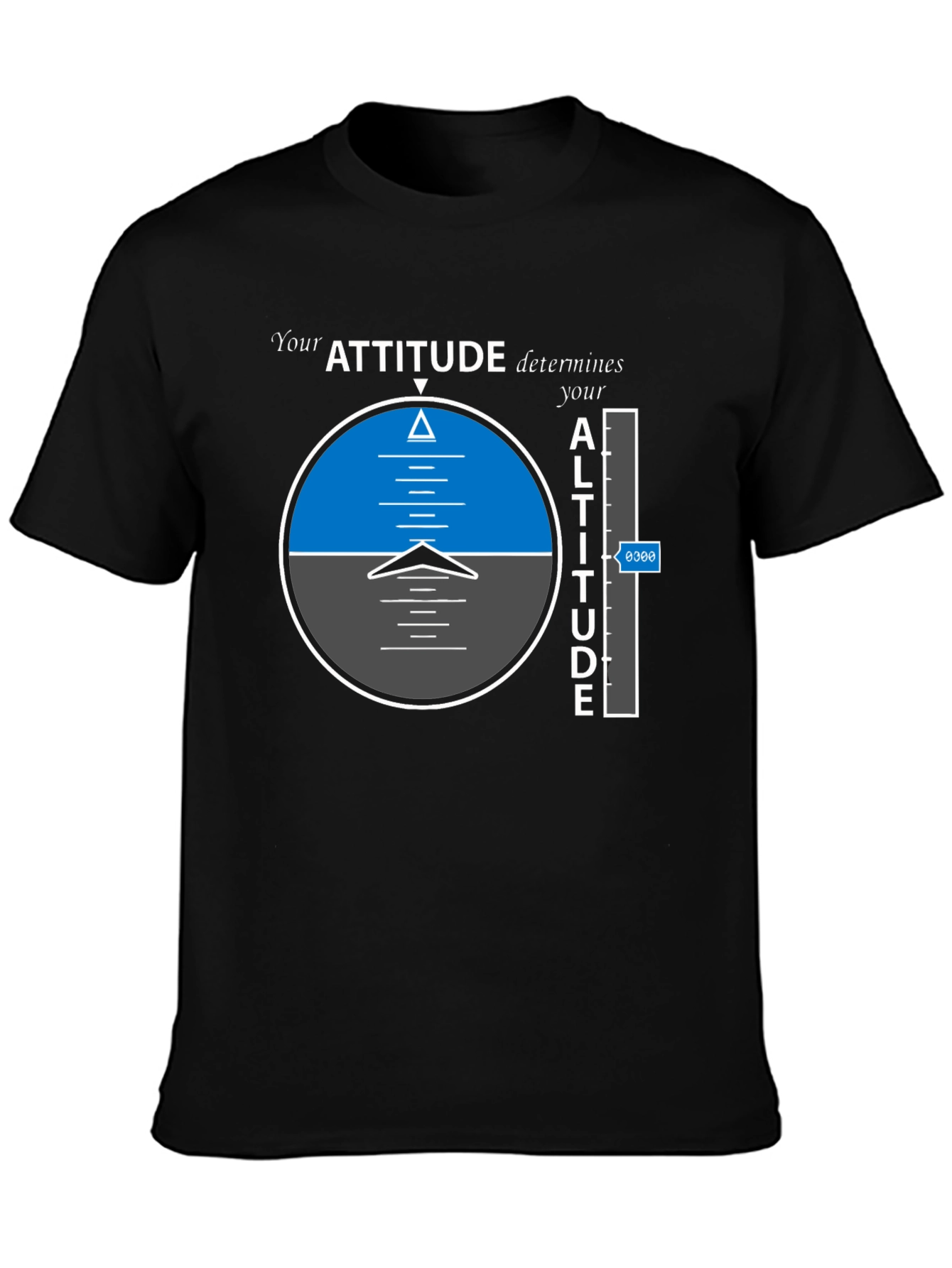 Eleva tu estilo con esta camiseta negra que fusiona moda y pasión por la aviación. Presenta un llamativo diseño gráfico que simula un indicador de actitud de vuelo, con una mitad superior en azul celeste y una inferior en gris, separadas por una línea que simula el horizonte. El mensaje "Your ATTITUDE determines your ALTITUDE" añade un toque inspirador. Perfecta para pilotos, entusiastas de la aviación o cualquier persona que aprecie un diseño único y motivador. Fabricada en algodón suave, ofrece comodidad y estilo en cada aventura.