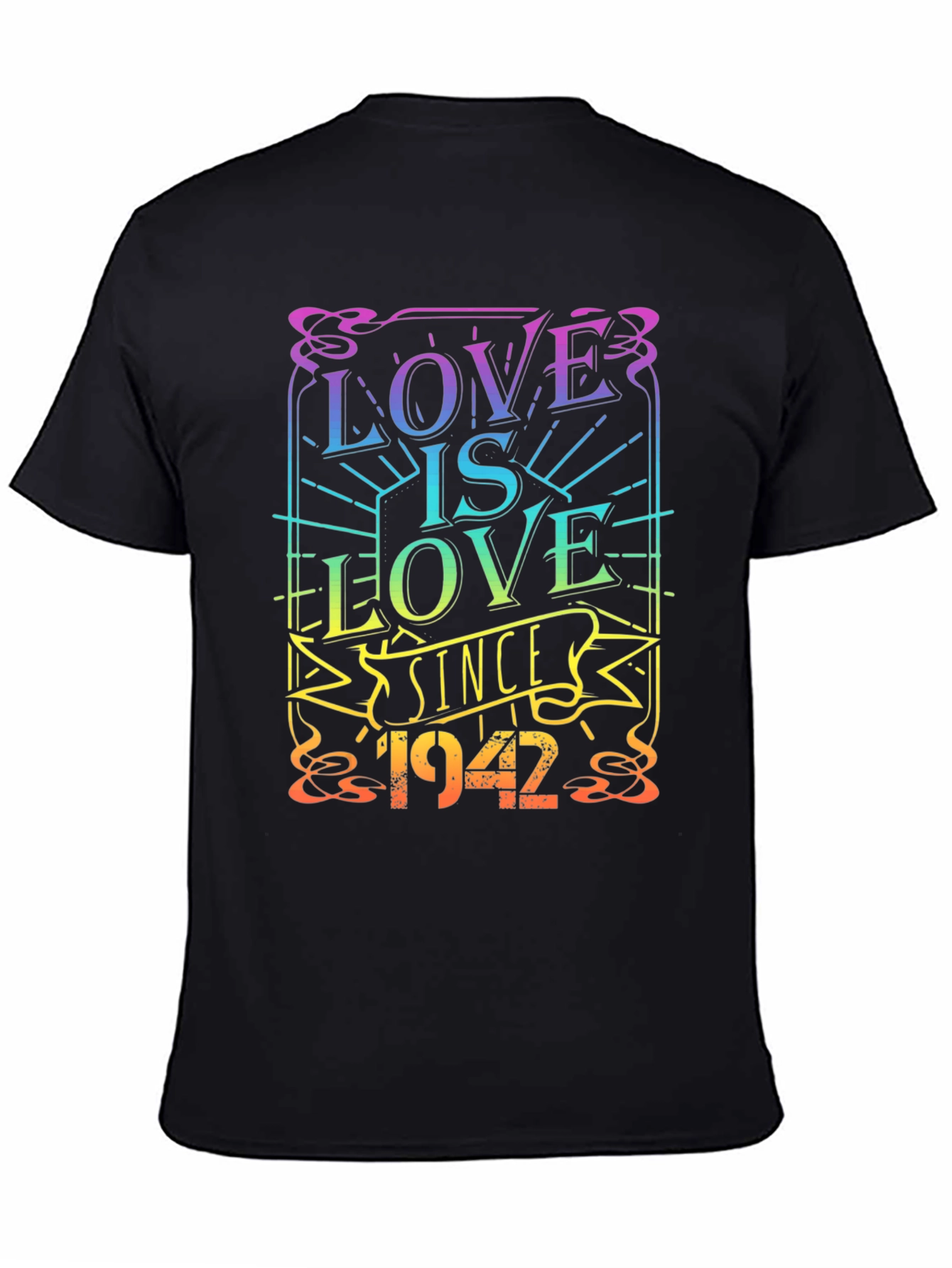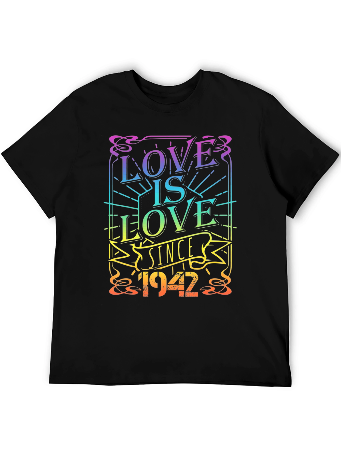 Celebra el amor con esta elegante camiseta negra. El diseño vibrante y colorido muestra la frase "Love is Love Since 1942", con letras que varían en un espectro de colores del arco iris. Ideal para expresar tu apoyo a la igualdad y el orgullo LGBTQ+. Perfecta para usar en eventos, manifestaciones o simplemente para el día a día. Fabricada con materiales cómodos y duraderos, esta camiseta es una adición imprescindible para cualquier guardarropa. Muestra tu estilo y tus valores con esta prenda única y significativa.