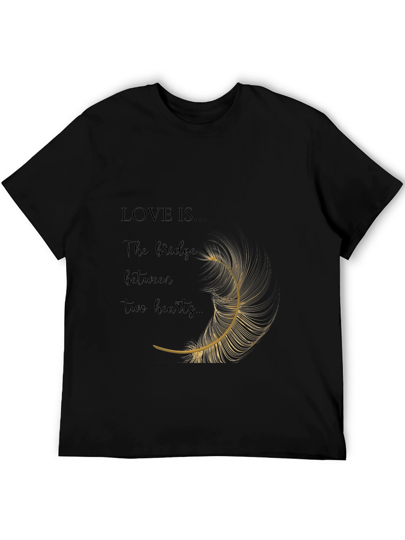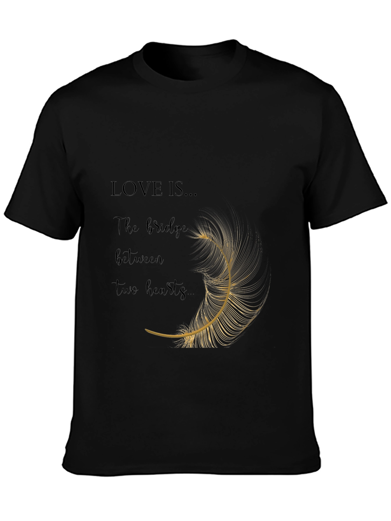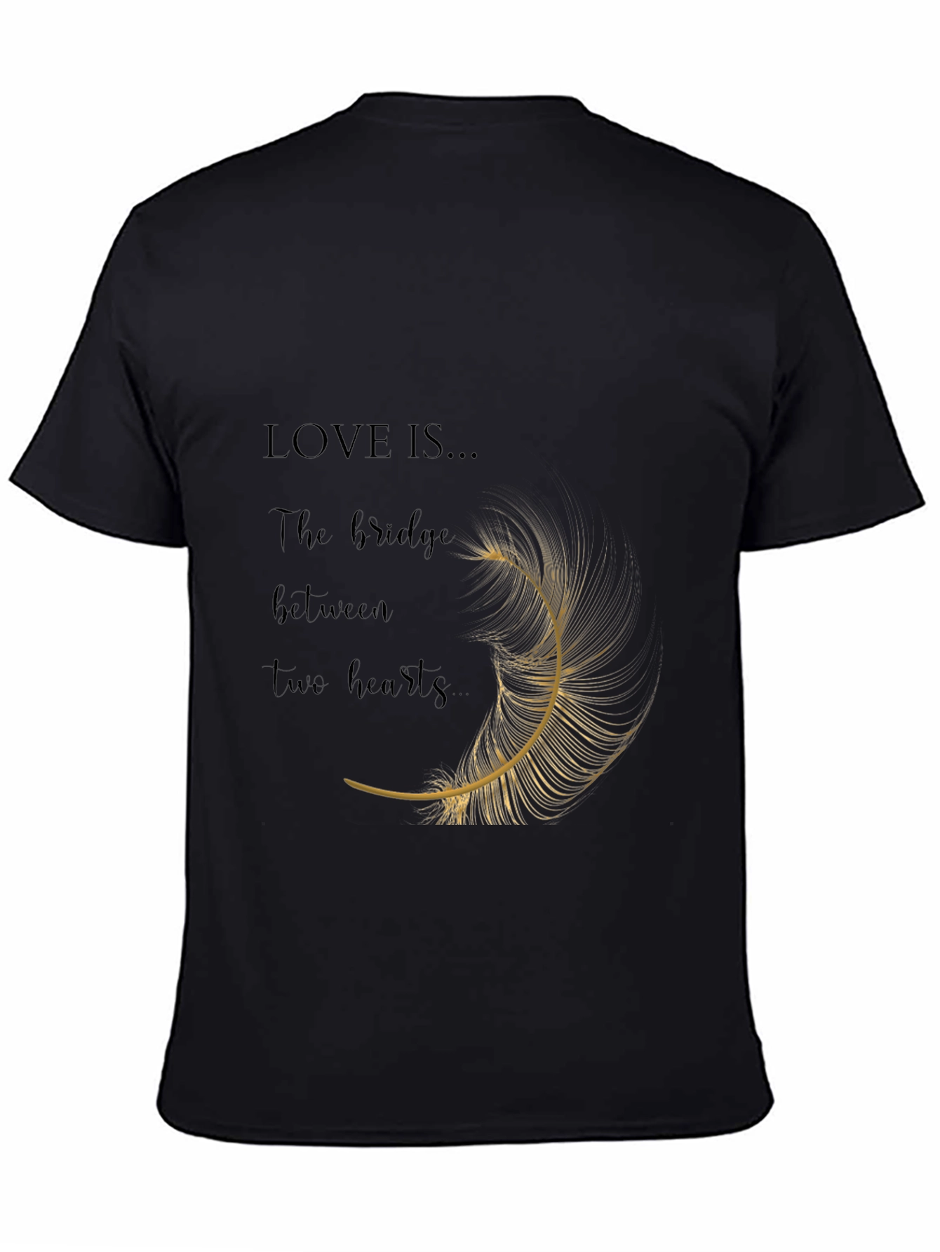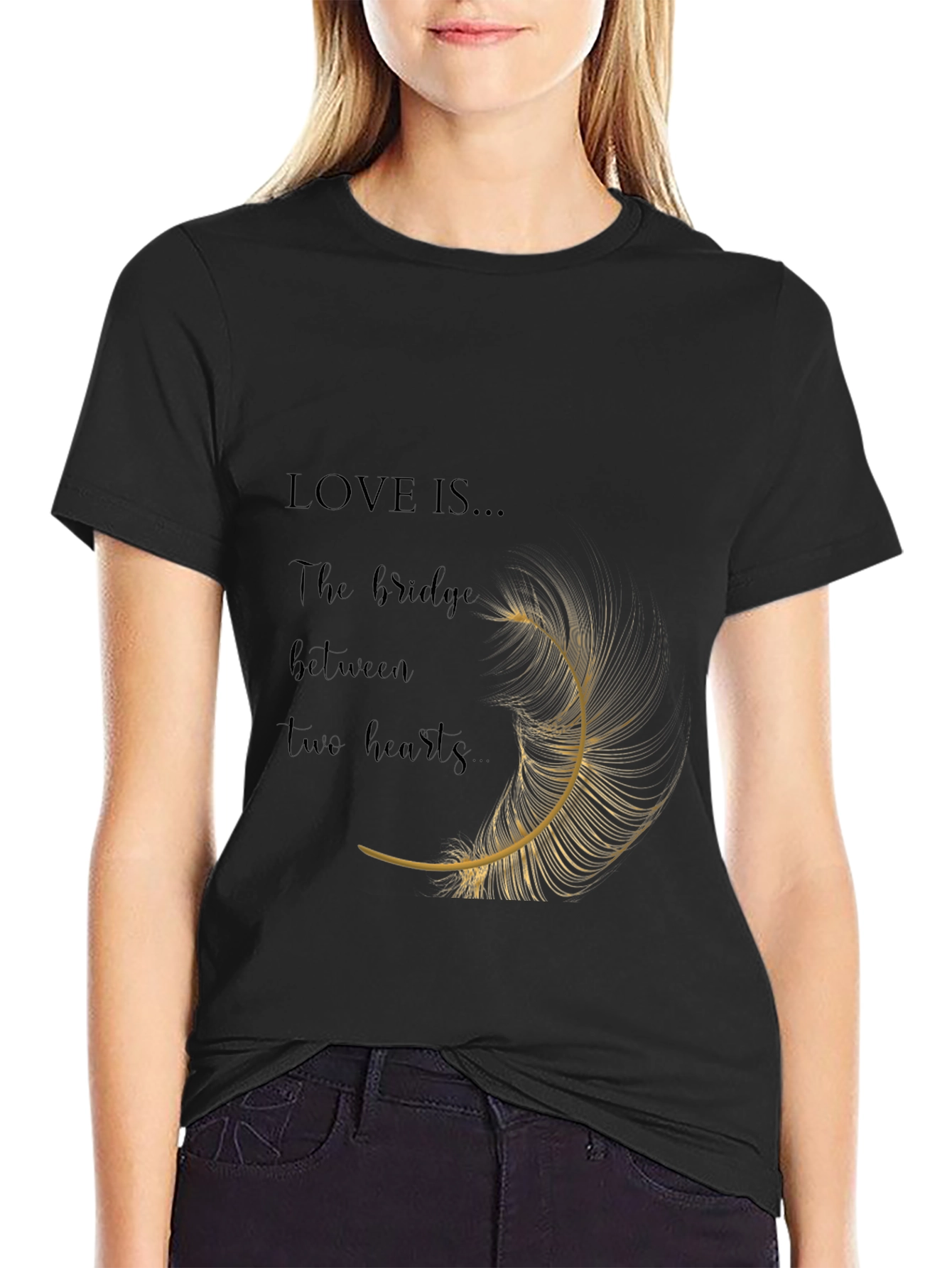 Luce esta elegante camiseta negra con un diseño único y significativo. Presenta la frase "Love is... The bridge between two hearts..." (El amor es... El puente entre dos corazones...), acompañada de una delicada ilustración de una pluma dorada que añade un toque de sofisticación. Fabricada con materiales suaves y cómodos, esta camiseta es perfecta para expresar tu estilo con un mensaje profundo. Ideal para uso diario, salidas casuales o como un regalo especial para esa persona amada. Una prenda que combina moda, arte y sentimiento.