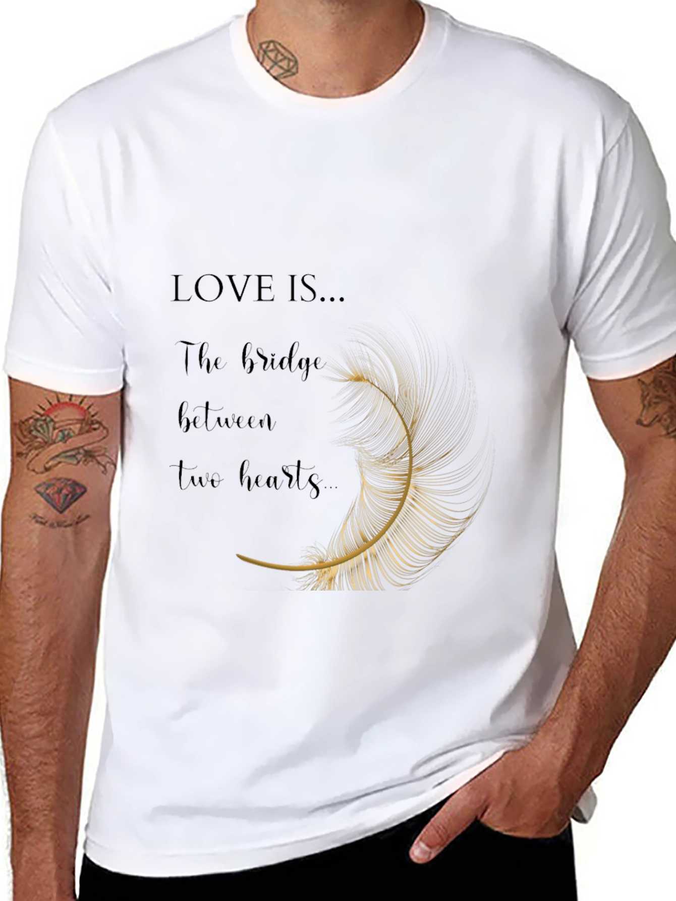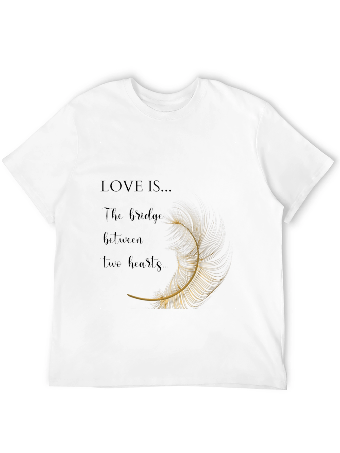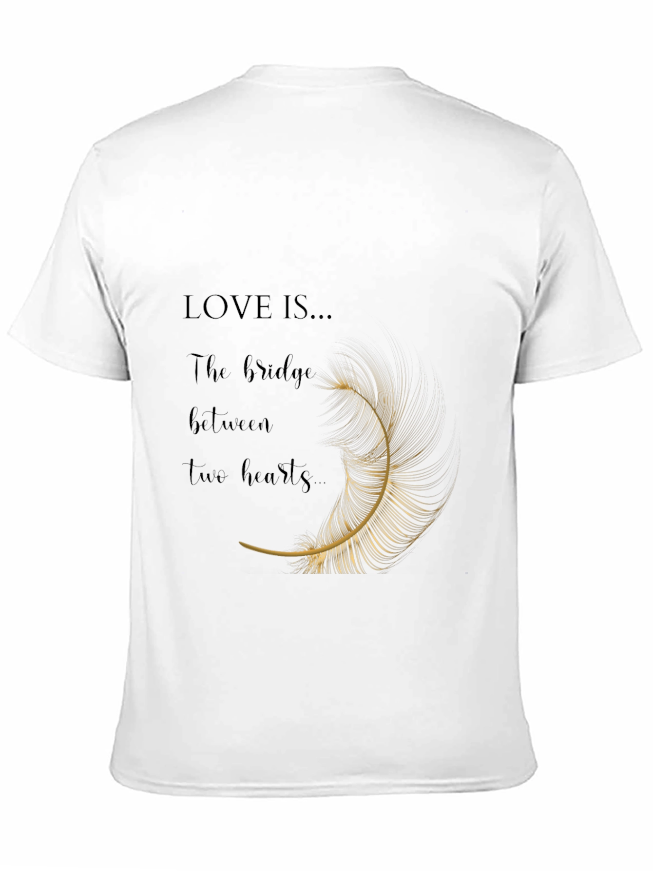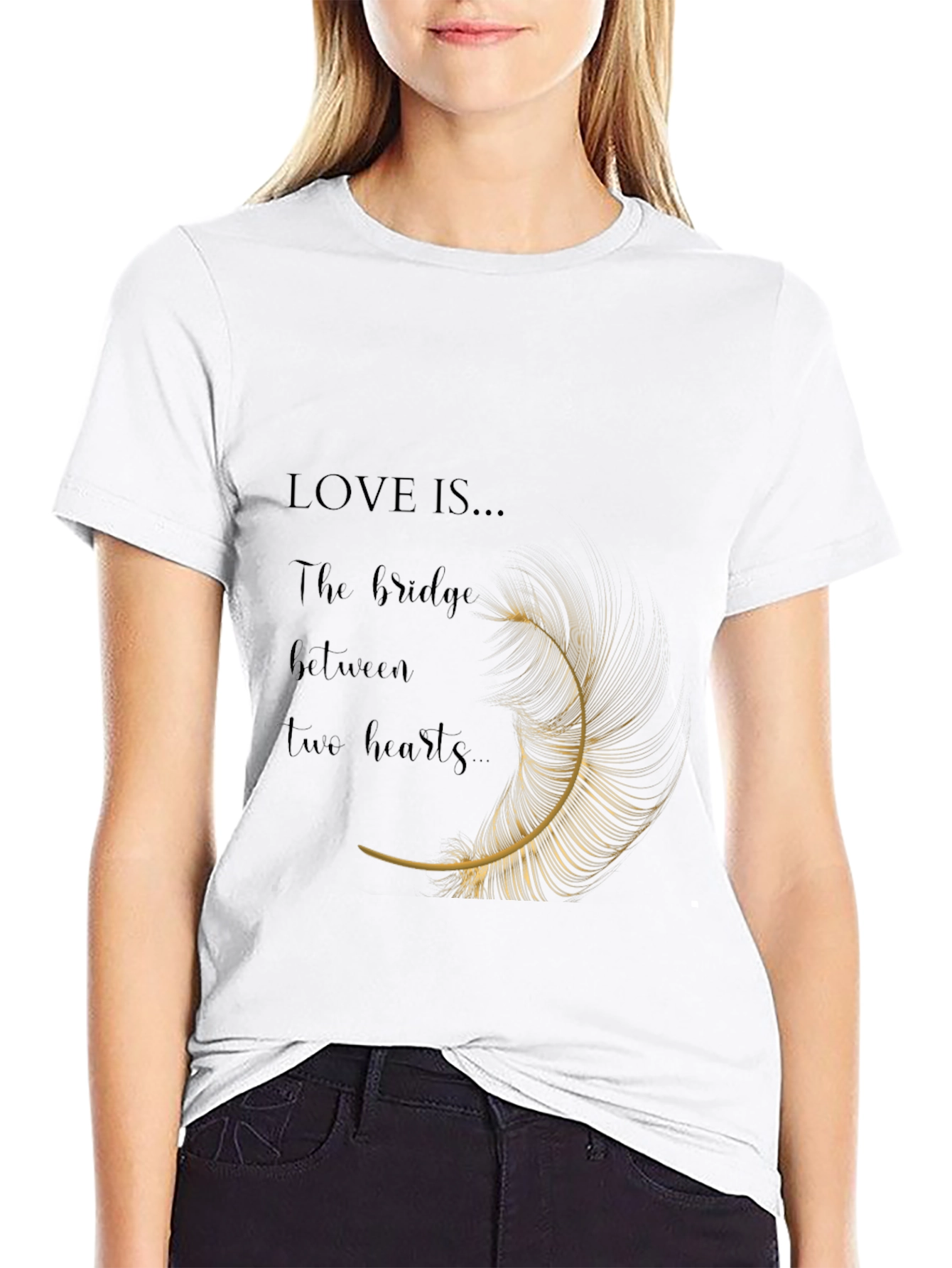 Luce esta elegante camiseta negra con un diseño único y significativo. Presenta la frase "Love is... The bridge between two hearts..." (El amor es... El puente entre dos corazones...), acompañada de una delicada ilustración de una pluma dorada que añade un toque de sofisticación. Fabricada con materiales suaves y cómodos, esta camiseta es perfecta para expresar tu estilo con un mensaje profundo. Ideal para uso diario, salidas casuales o como un regalo especial para esa persona amada. Una prenda que combina moda, arte y sentimiento.