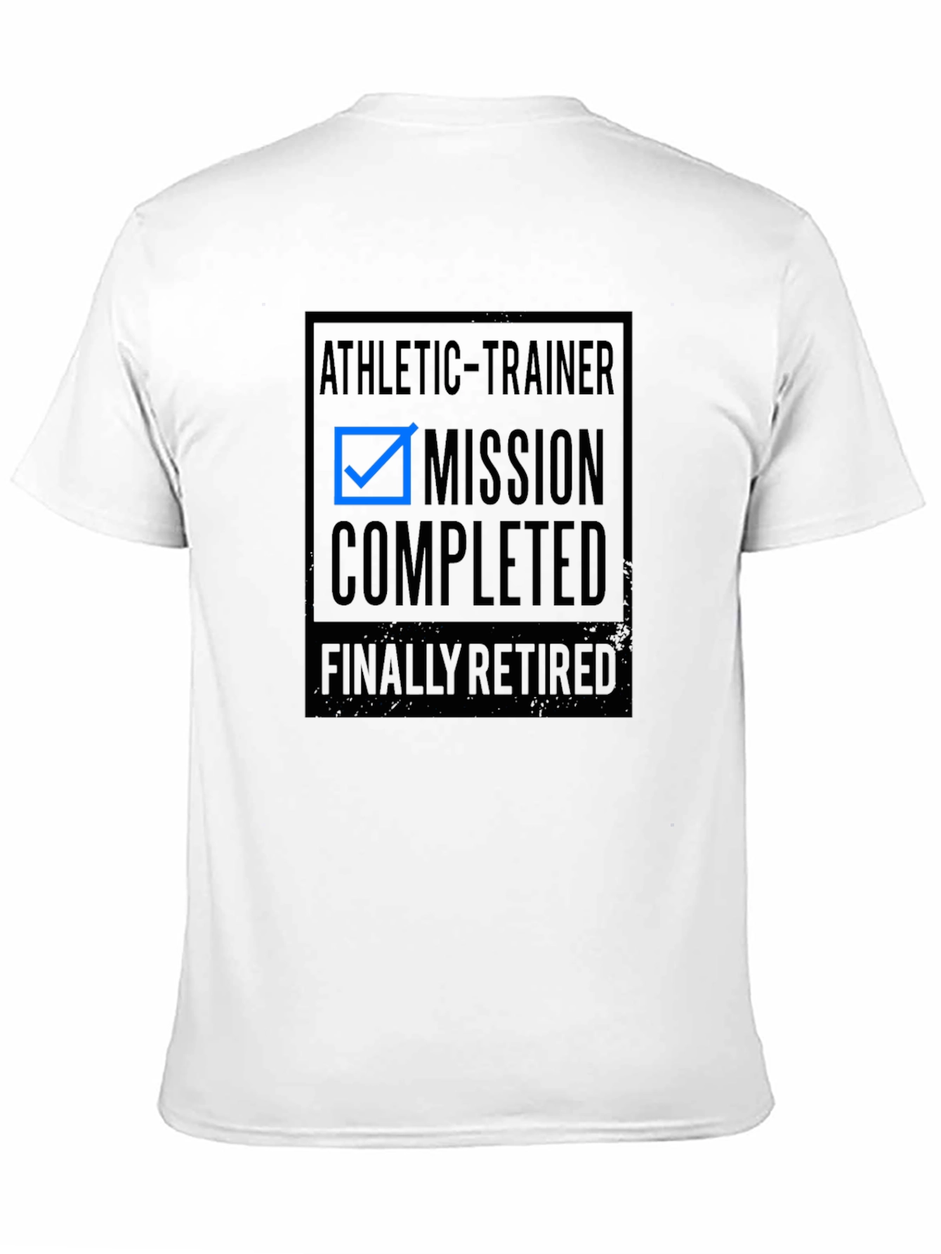 Esta camiseta negra presenta un diseño llamativo para entrenadores atléticos retirados. Con un estilo casual, la prenda lleva un gráfico rectangular que proclama con orgullo "ATHLETIC-TRAINER MISSION COMPLETED FINALLY RETIRED", con una marca de verificación azul que simboliza la finalización exitosa de una misión. El diseño implica un hito importante y celebra una carrera dedicada al entrenamiento atlético. Ideal para usar en reuniones informales, eventos deportivos o simplemente para mostrar con orgullo el logro de la jubilación. Muestra tu dedicación y logro con esta camiseta única.