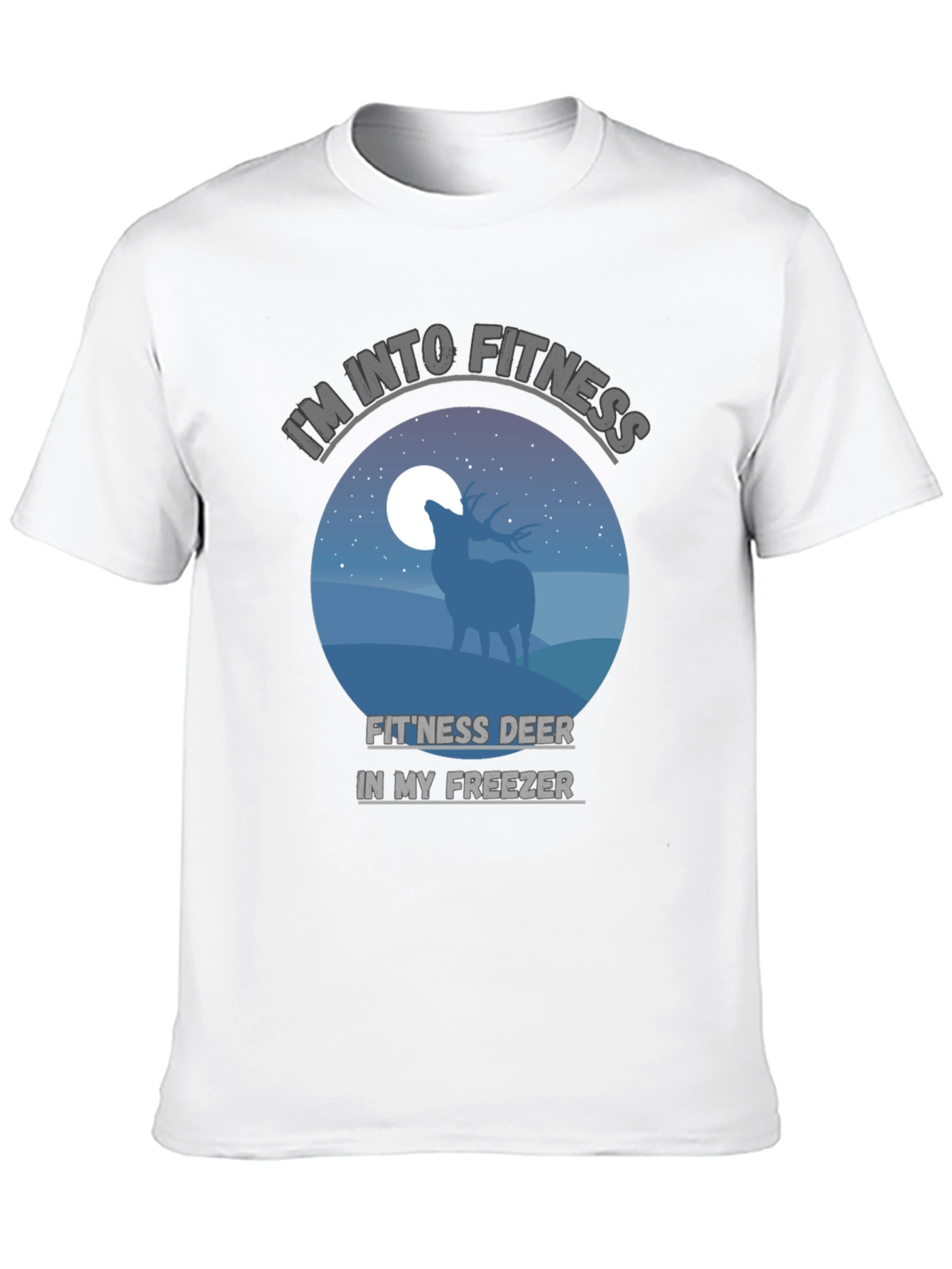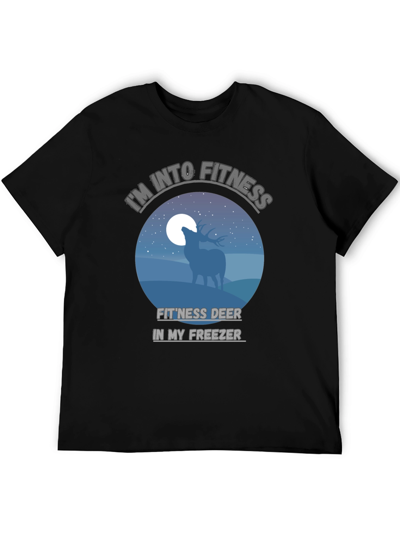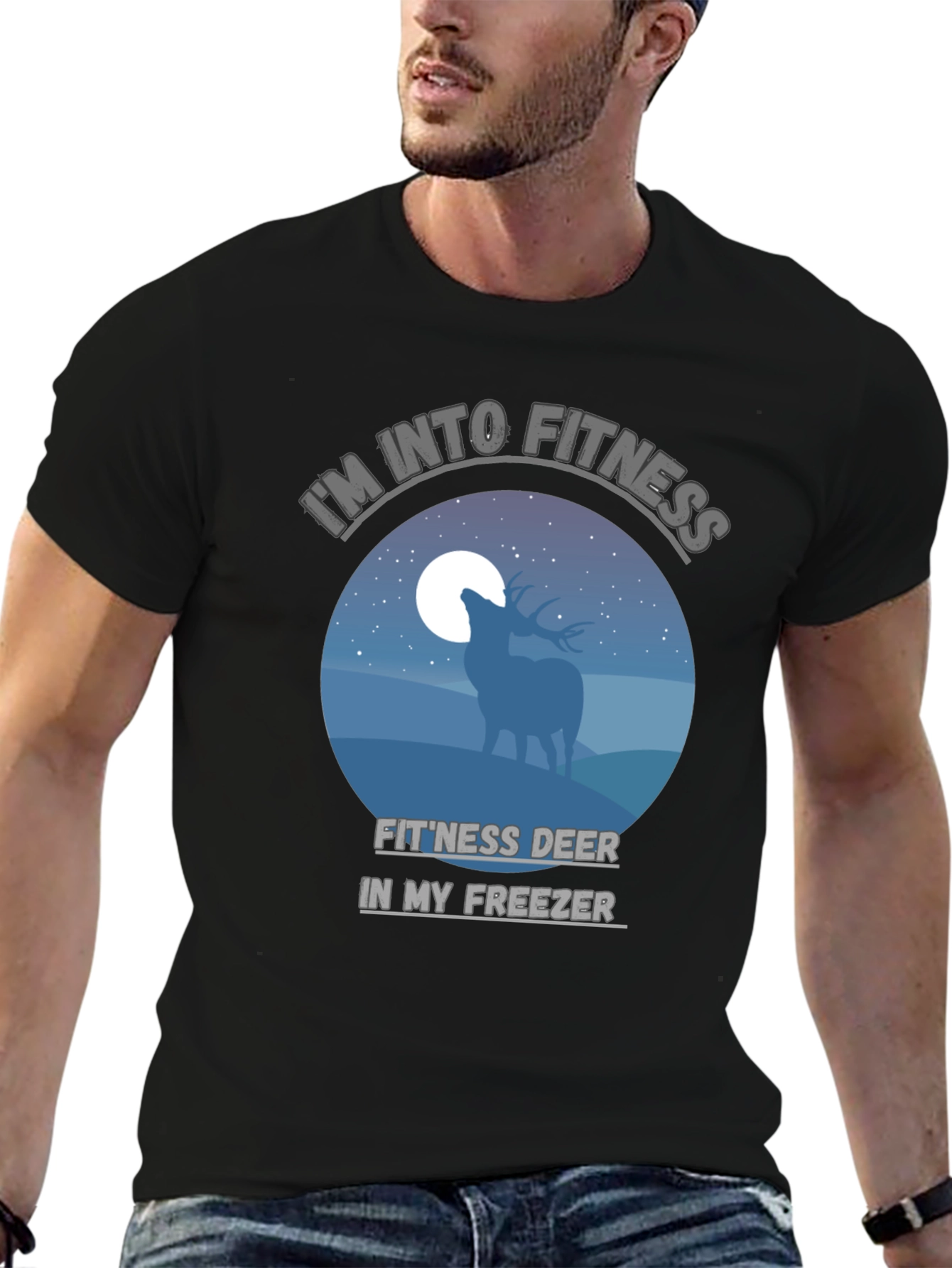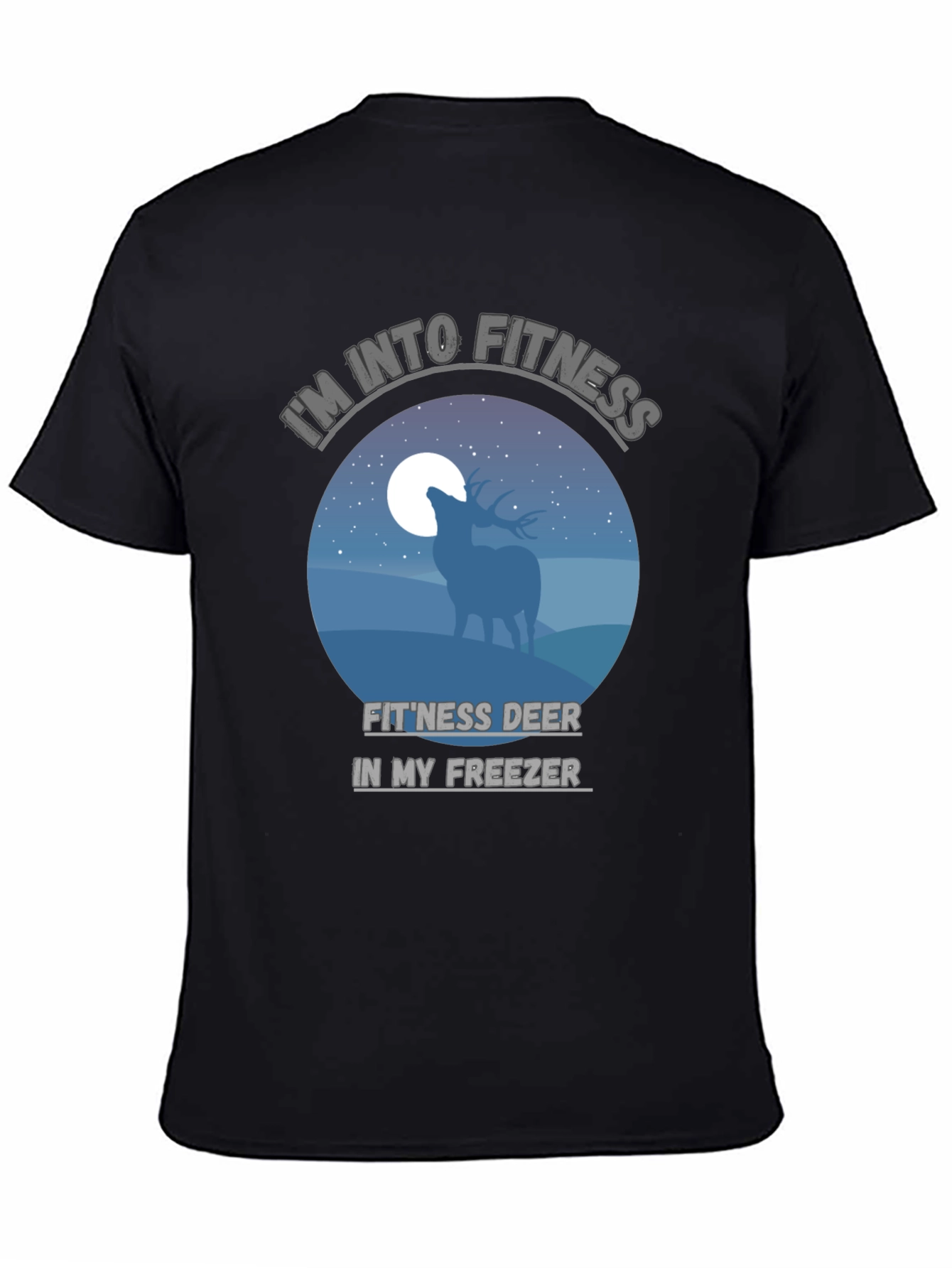Esta camiseta negra presenta un diseño único y divertido. En el centro, se observa una ilustración circular con un ciervo silueteado bajo la luz de la luna, en un paisaje nocturno azulado. La frase "I'M INTO FITNESS" rodea la parte superior del círculo y "FIT'NESS DEER IN MY FREEZER" en la parte inferior. El material parece ser de algodón suave y cómodo. Ideal para los amantes del fitness con un toque de humor, esta camiseta es perfecta para usar en el gimnasio, salir a correr o simplemente para un look casual con estilo. Un regalo original para quienes aprecian la comodidad y los diseños creativos.