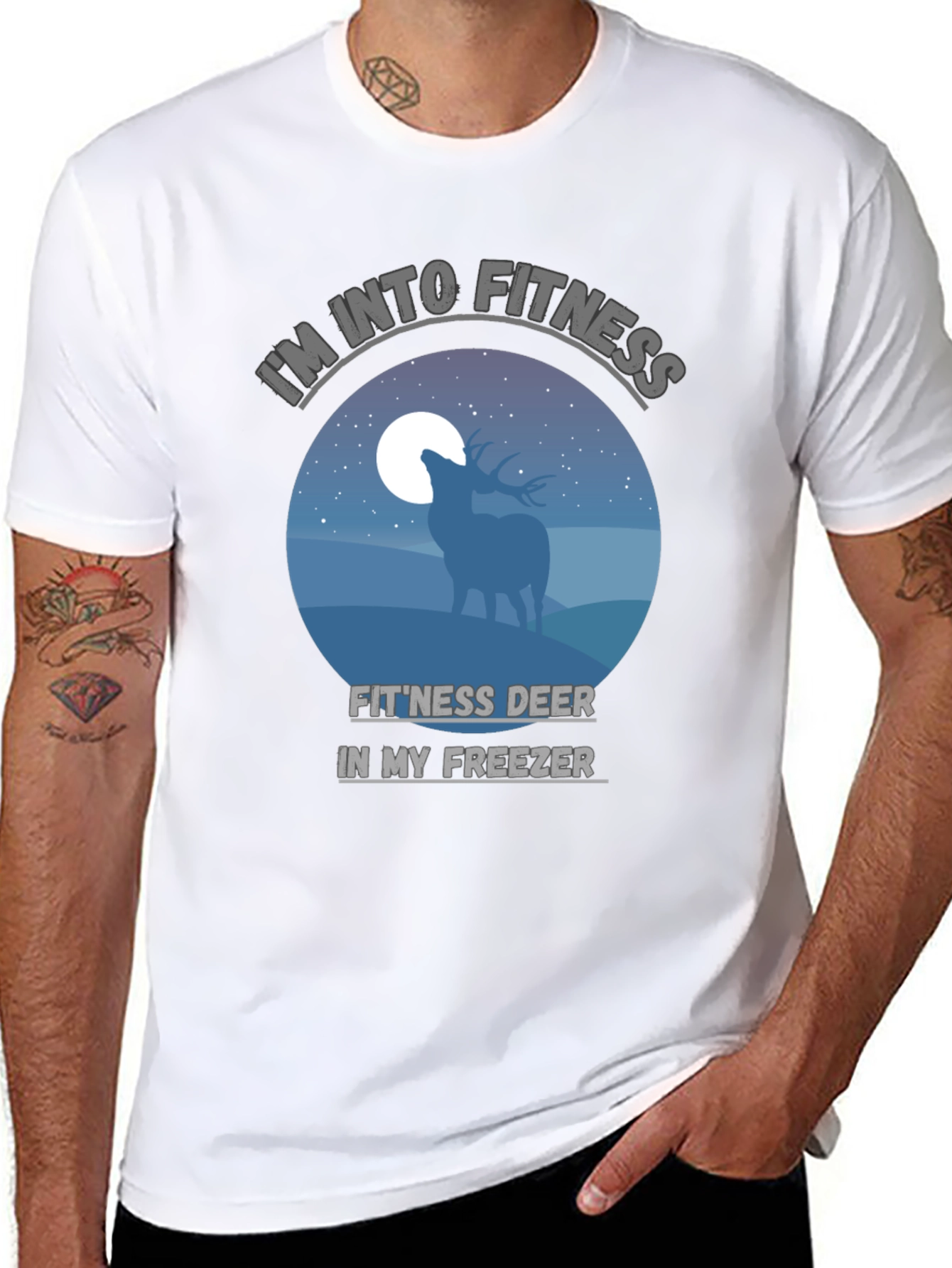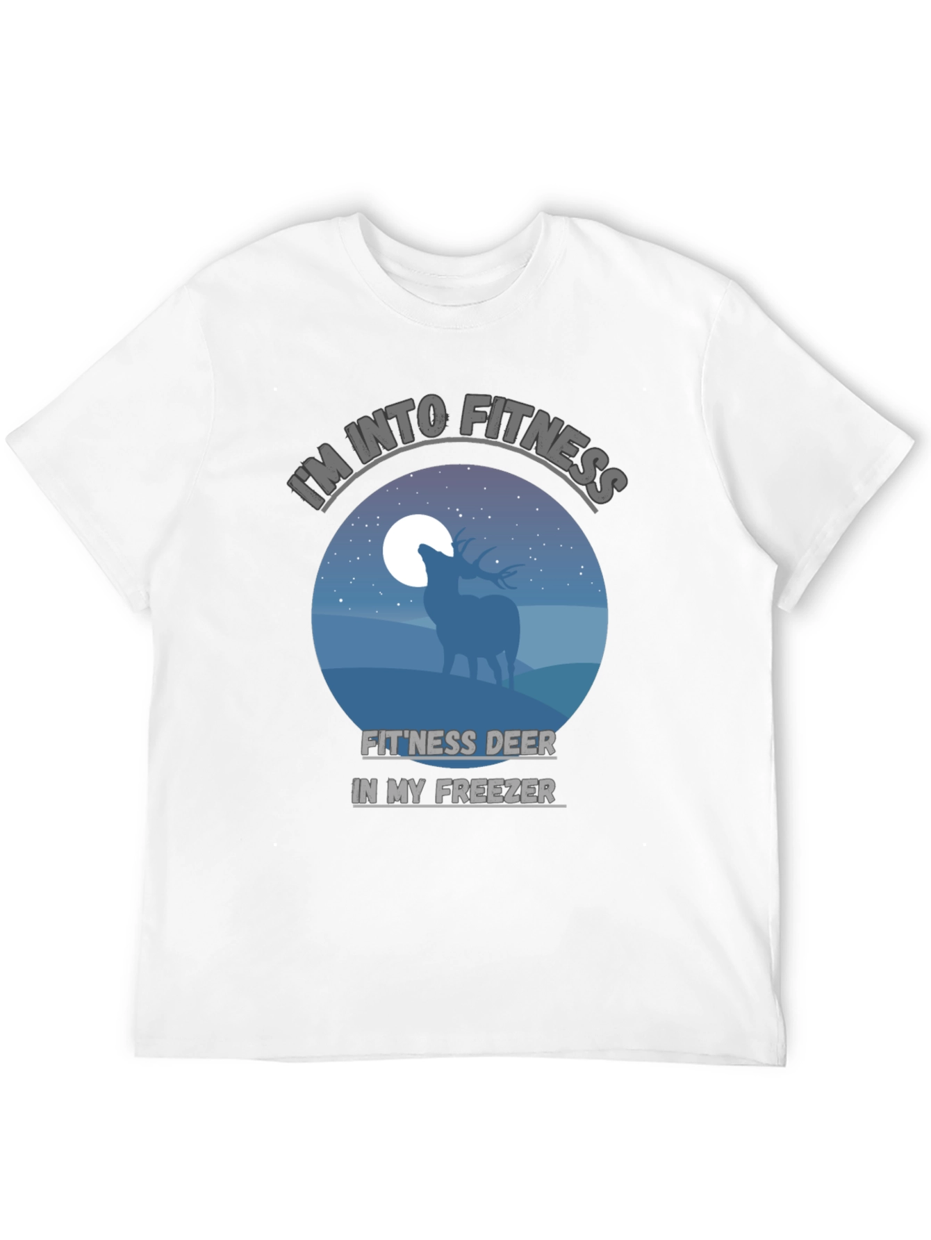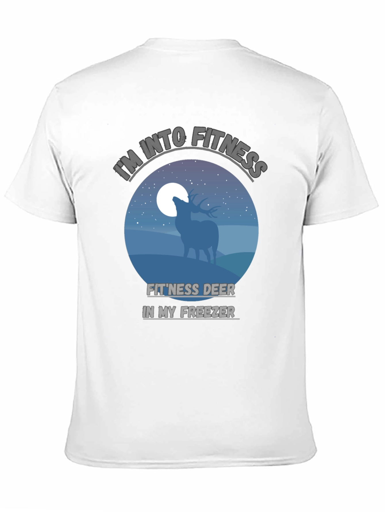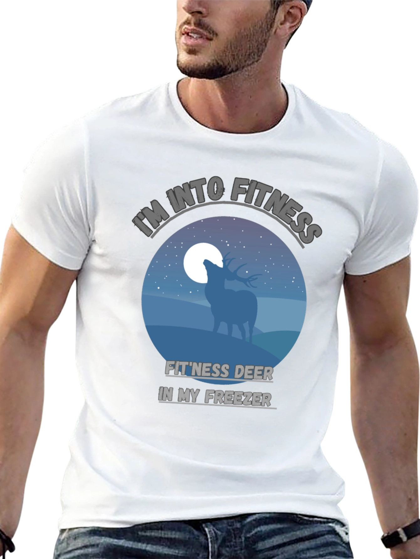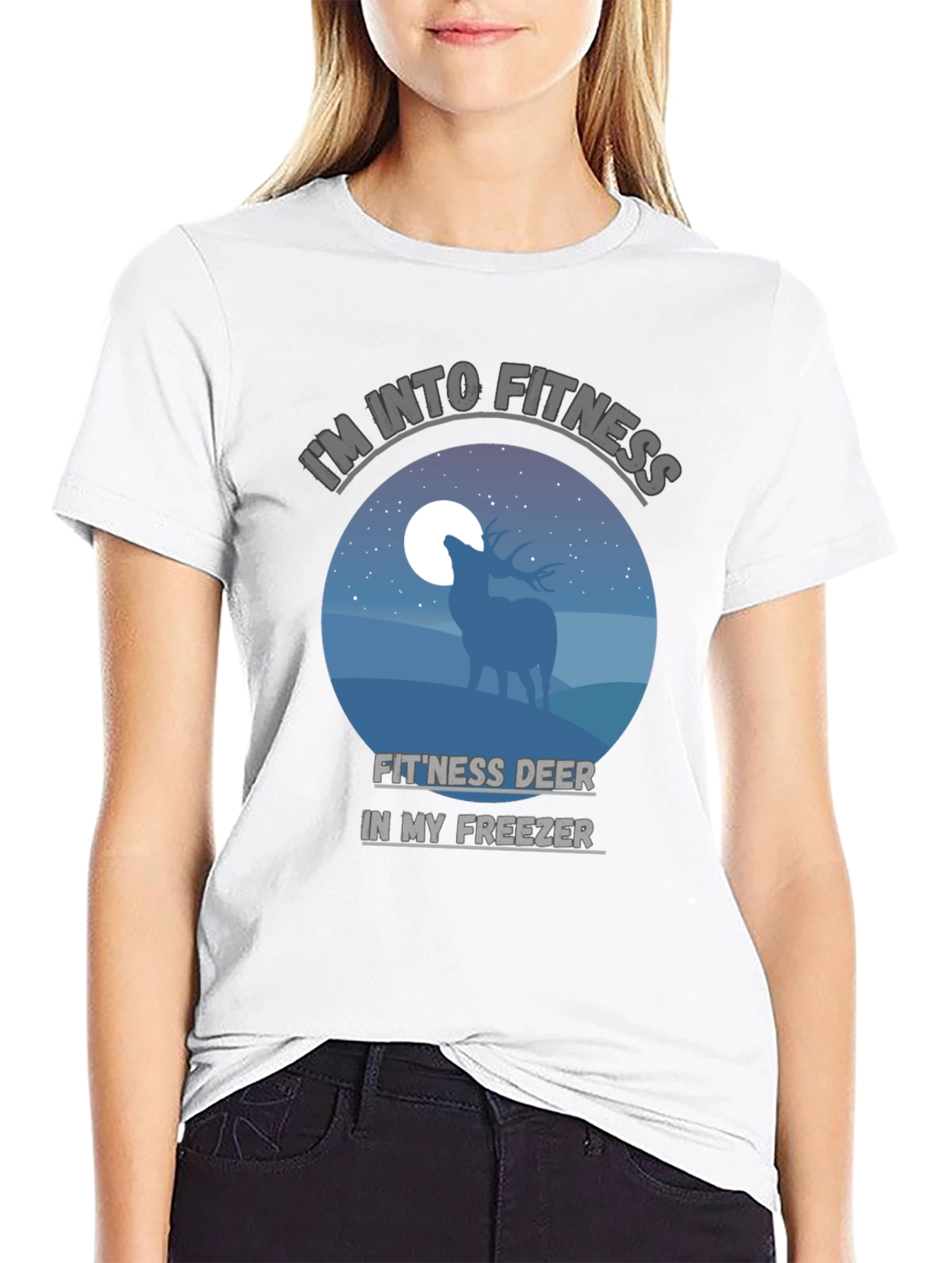 Esta camiseta negra presenta un diseño único y divertido. En el centro, se observa una ilustración circular con un ciervo silueteado bajo la luz de la luna, en un paisaje nocturno azulado. La frase "I'M INTO FITNESS" rodea la parte superior del círculo y "FIT'NESS DEER IN MY FREEZER" en la parte inferior. El material parece ser de algodón suave y cómodo. Ideal para los amantes del fitness con un toque de humor, esta camiseta es perfecta para usar en el gimnasio, salir a correr o simplemente para un look casual con estilo. Un regalo original para quienes aprecian la comodidad y los diseños creativos.