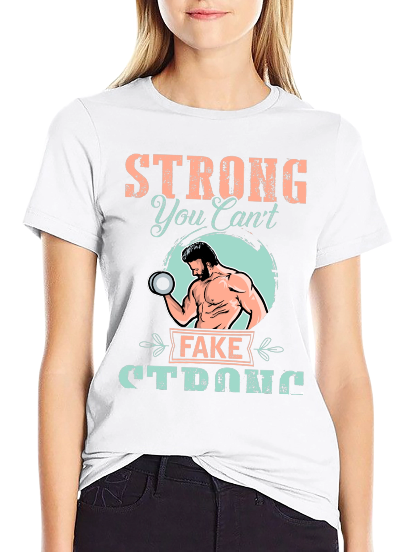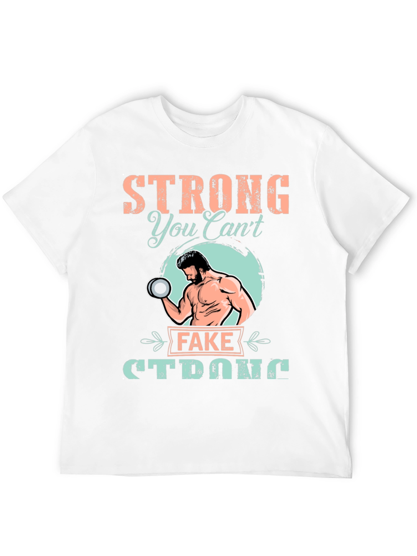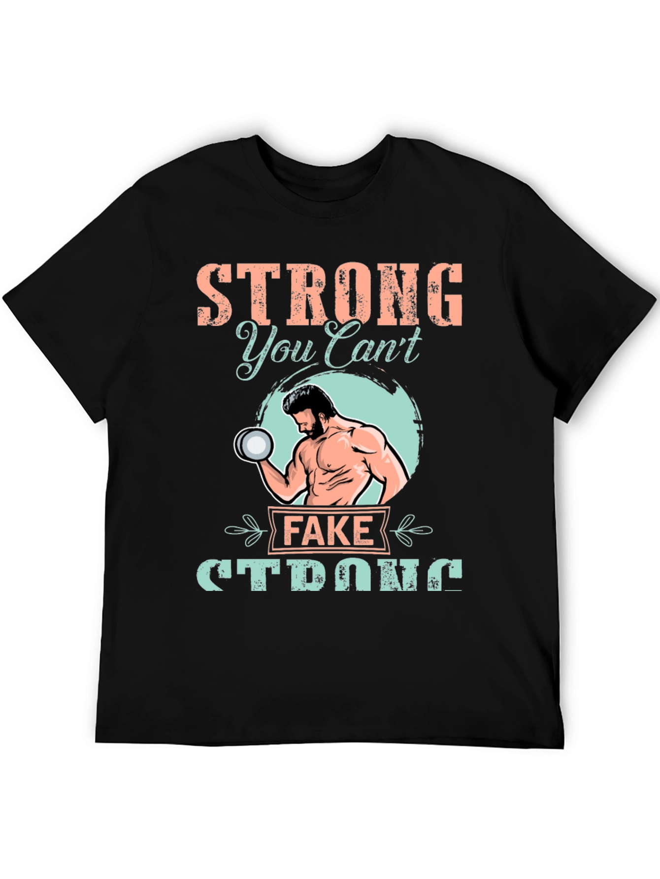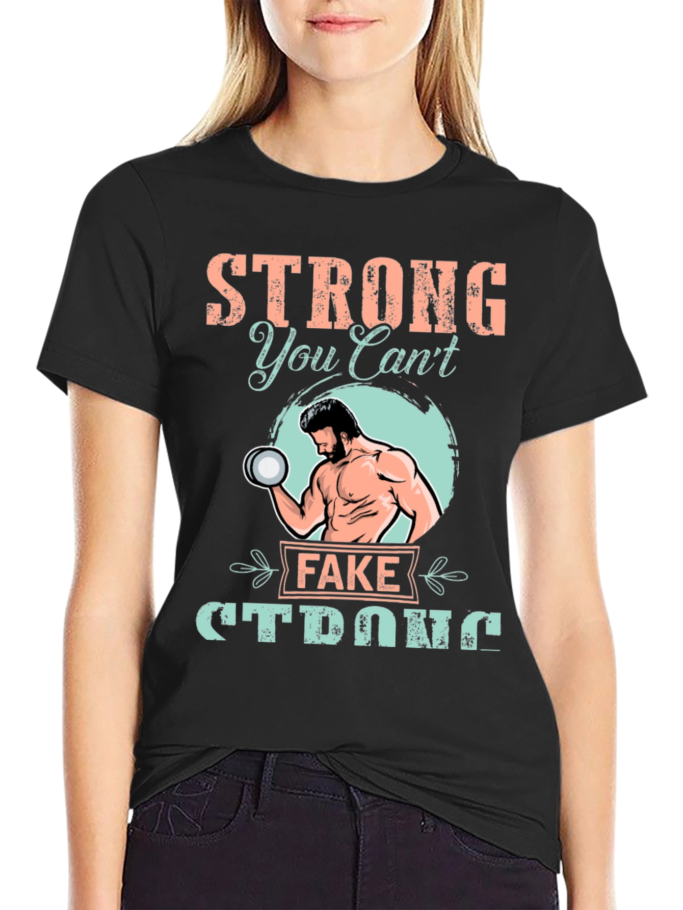 Luce tu fuerza con esta camiseta negra de diseño llamativo. Presenta un gráfico con la frase "STRONG You Can't FAKE STRONG" (Fuerte - No puedes fingirlo), ideal para los amantes del gimnasio y el fitness. La ilustración muestra a un hombre musculoso levantando pesas sobre un fondo circular en tonos celeste. El texto está dispuesto en colores contrastantes como durazno y celeste, que capturan la atención y resaltan el mensaje. Perfecta para entrenamientos o para un look casual con un toque de motivación y actitud. ¡Demuestra tu dedicación al bienestar con esta prenda única!