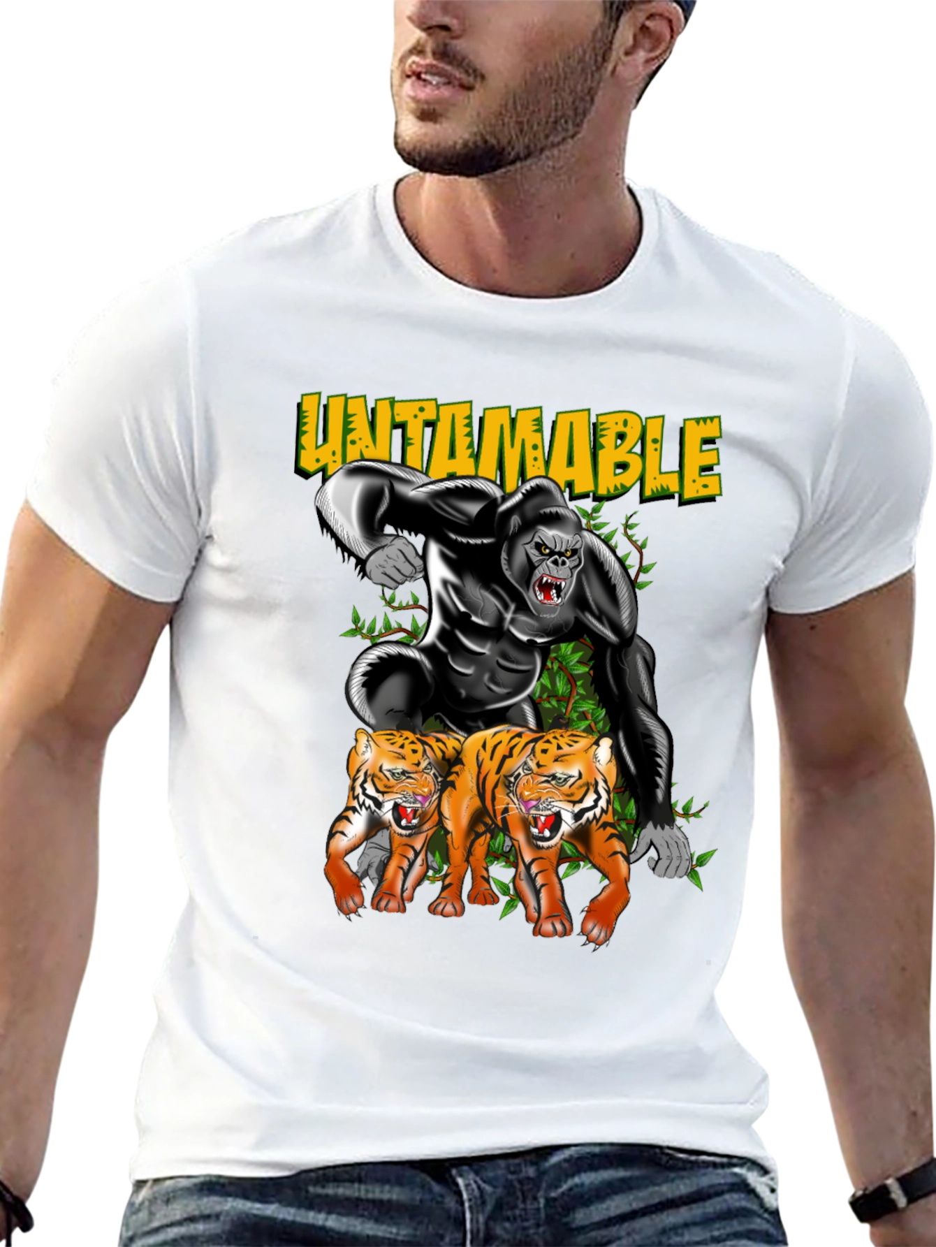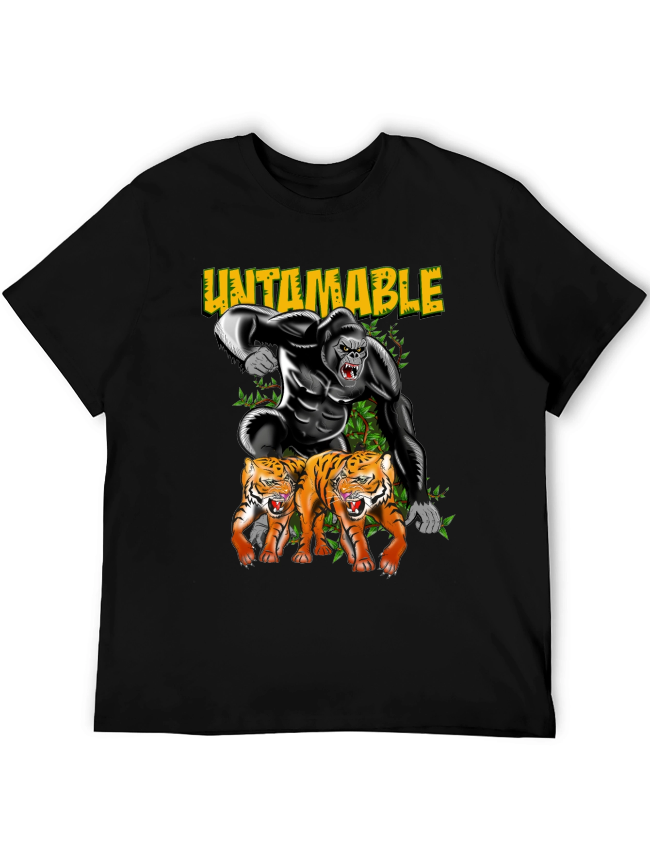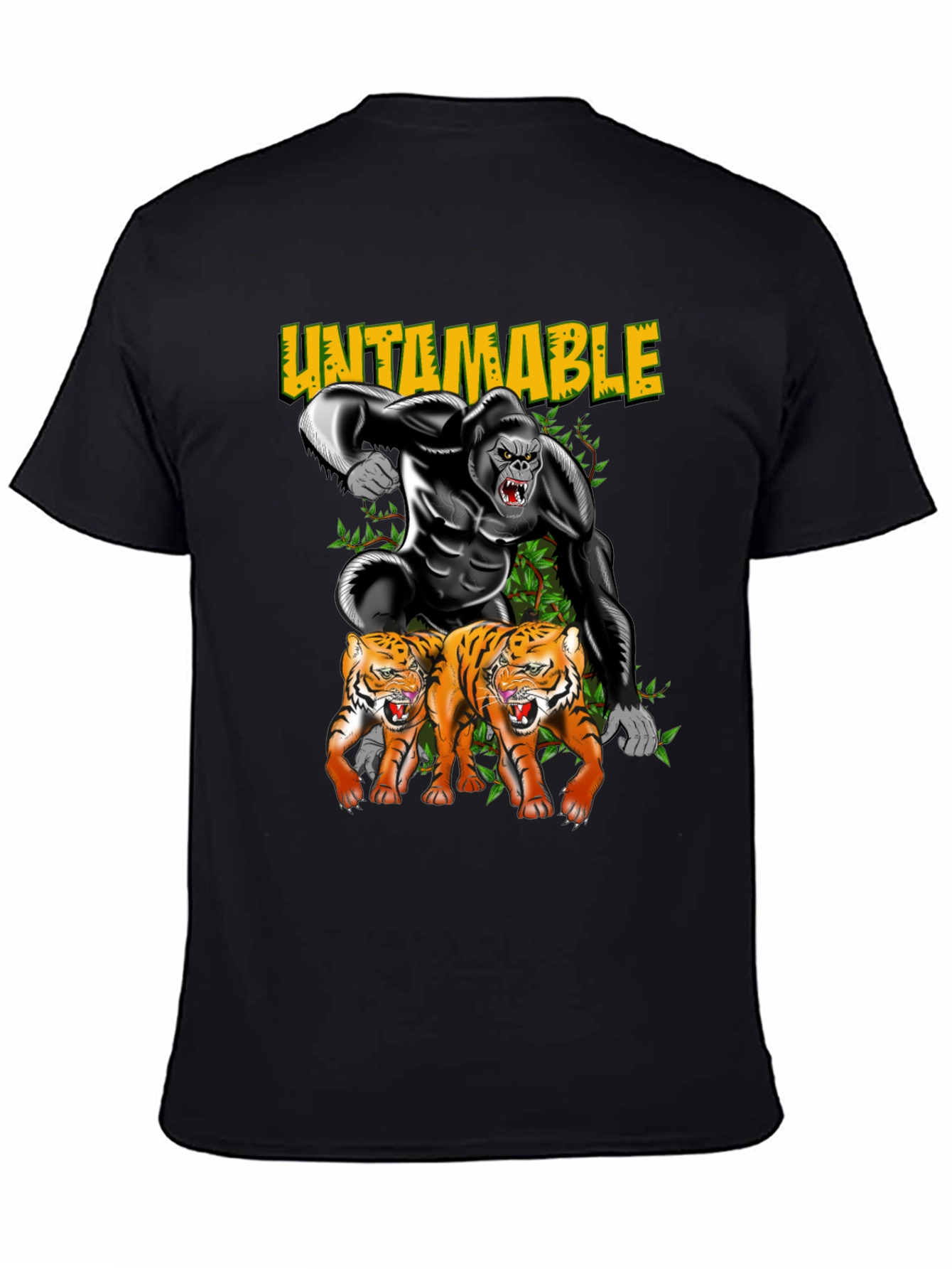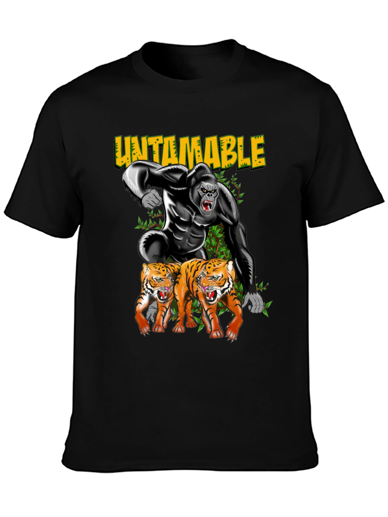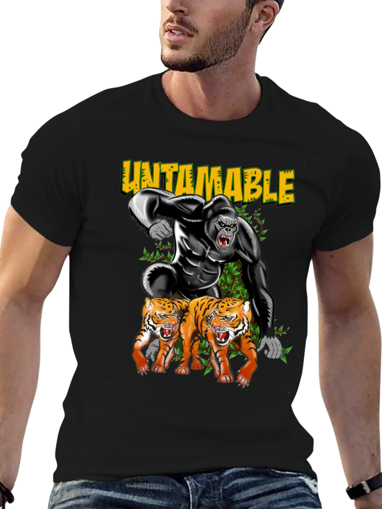 Muestra tu lado salvaje con esta camiseta negra de manga corta. Presenta un diseño llamativo con un gorila musculoso en actitud amenazante, acompañado de dos tigres feroces. La palabra "UNTAMABLE" resalta en la parte superior, subrayando el espíritu indomable. Confeccionada en tela suave y cómoda, esta camiseta es perfecta para expresar tu personalidad audaz en cualquier ocasión casual. Ideal para los amantes de los animales y los diseños atrevidos, esta camiseta seguramente llamará la atención dondequiera que vayas. Añade un toque de rebeldía a tu vestuario con esta prenda única.