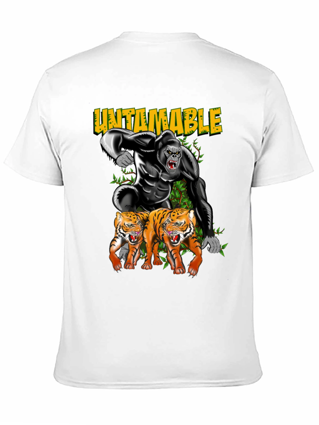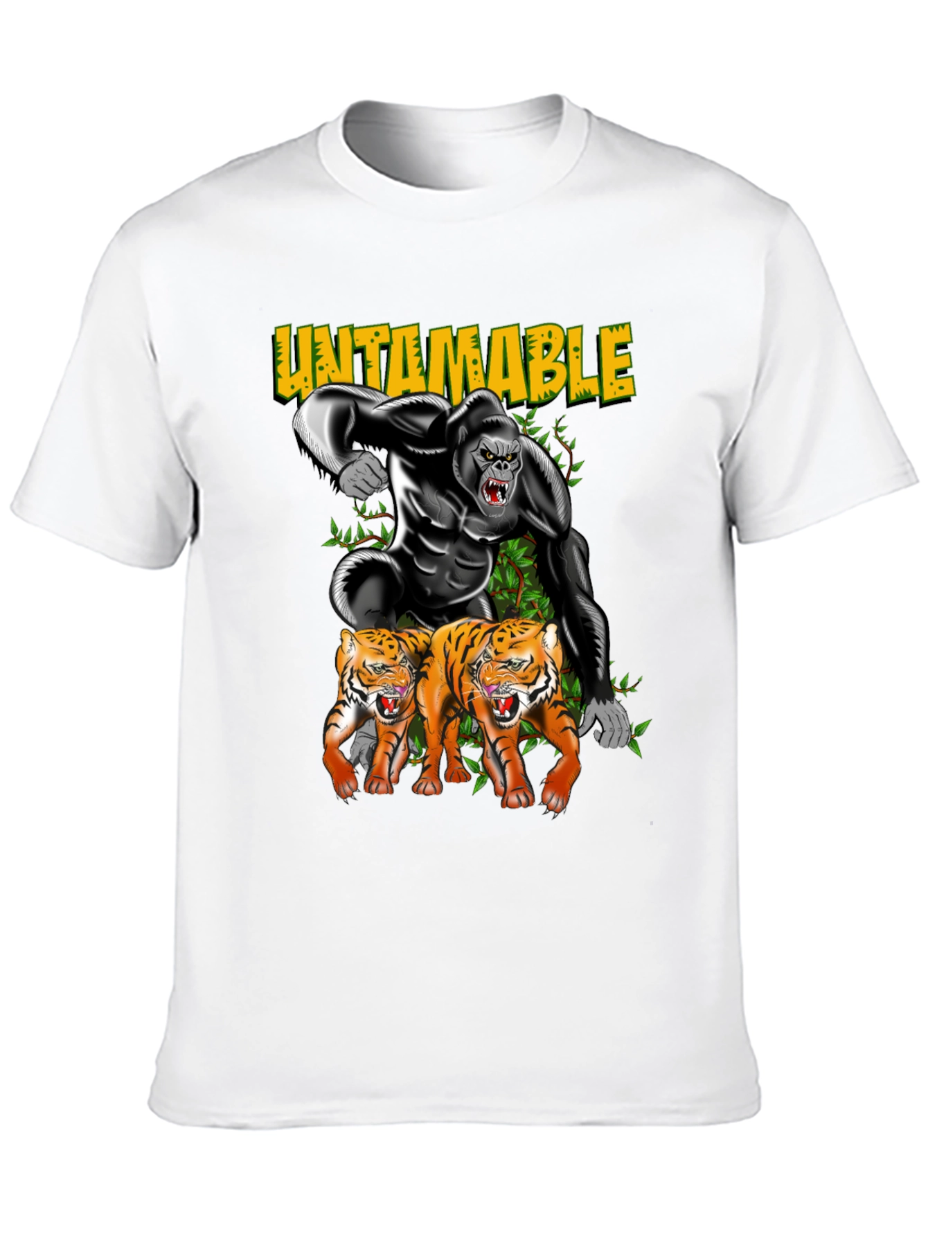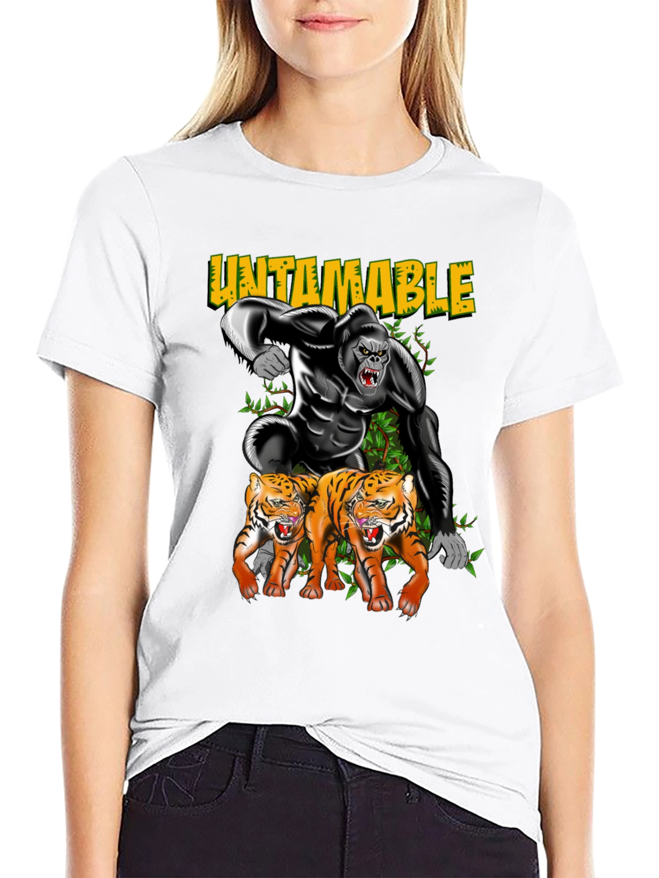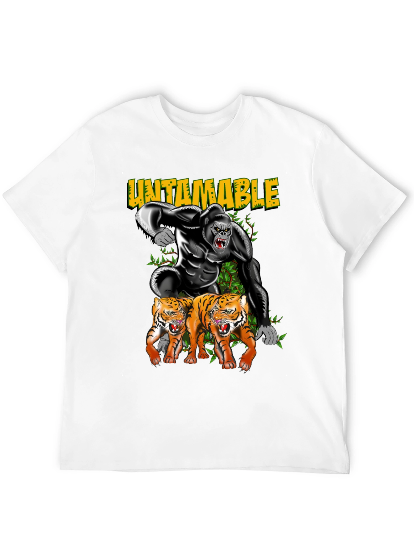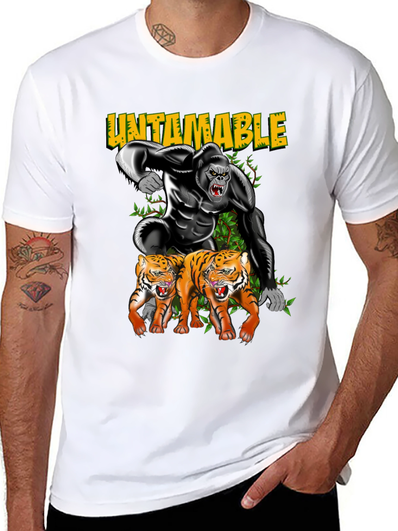 Muestra tu lado salvaje con esta camiseta negra de manga corta. Presenta un diseño llamativo con un gorila musculoso en actitud amenazante, acompañado de dos tigres feroces. La palabra "UNTAMABLE" resalta en la parte superior, subrayando el espíritu indomable. Confeccionada en tela suave y cómoda, esta camiseta es perfecta para expresar tu personalidad audaz en cualquier ocasión casual. Ideal para los amantes de los animales y los diseños atrevidos, esta camiseta seguramente llamará la atención dondequiera que vayas. Añade un toque de rebeldía a tu vestuario con esta prenda única.