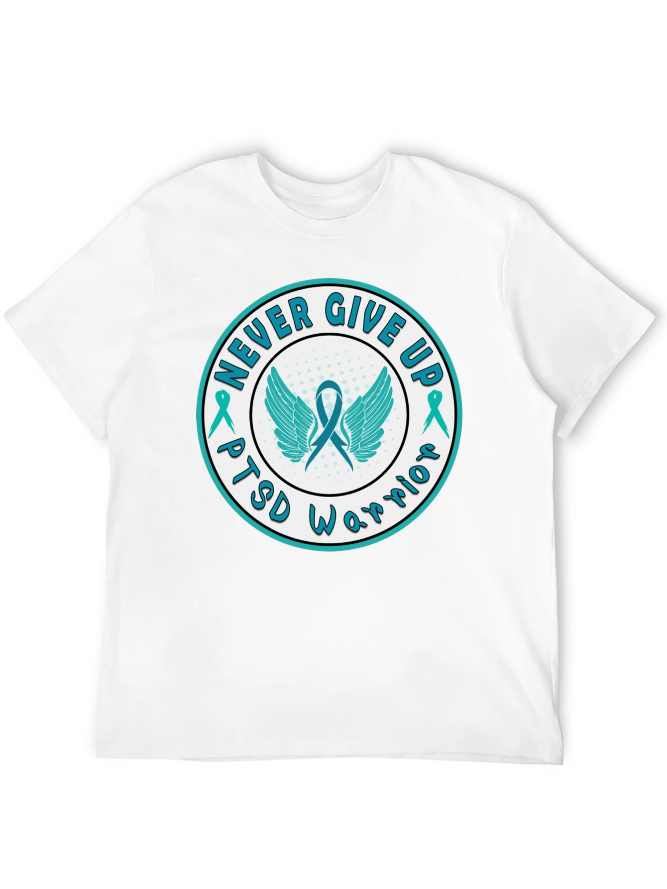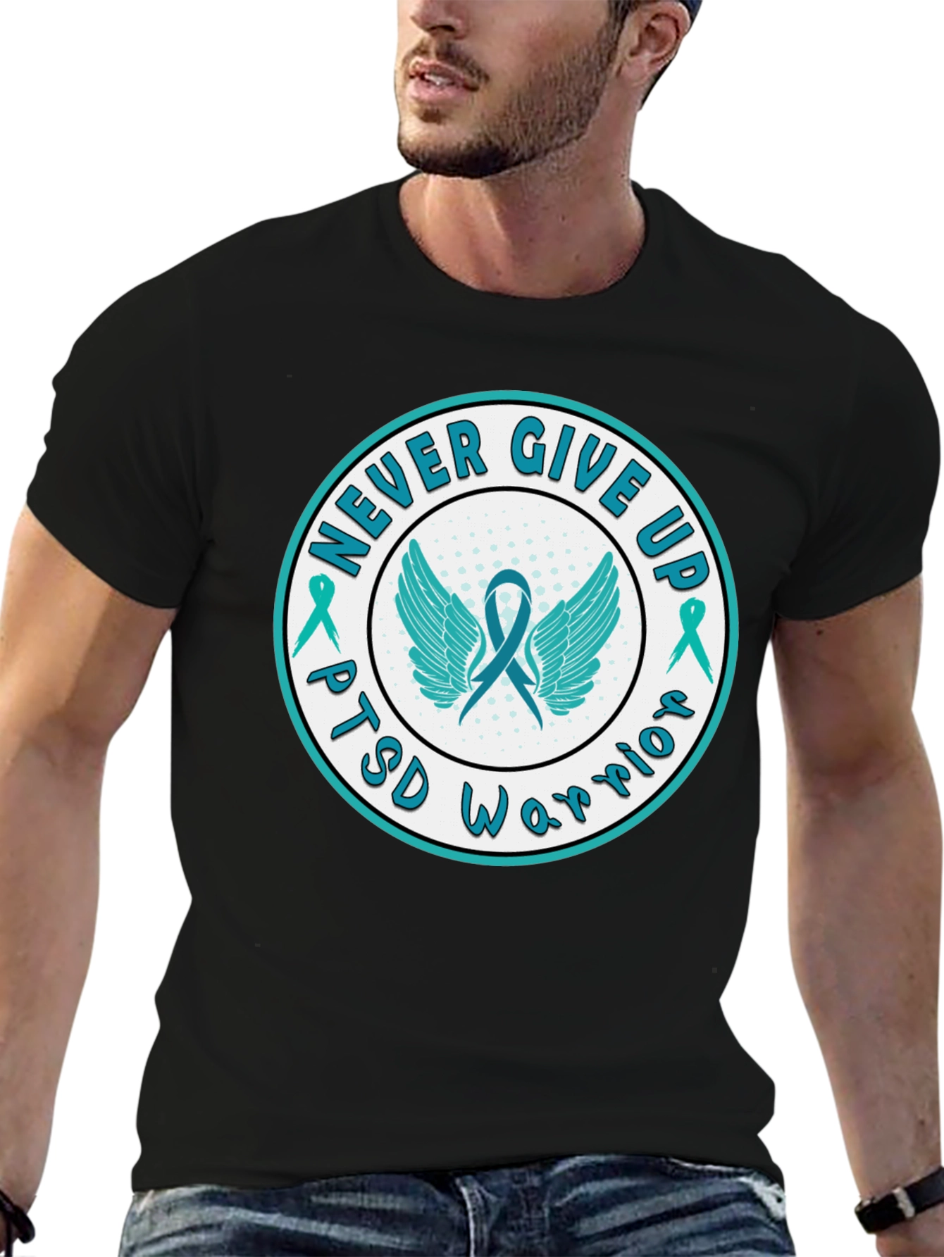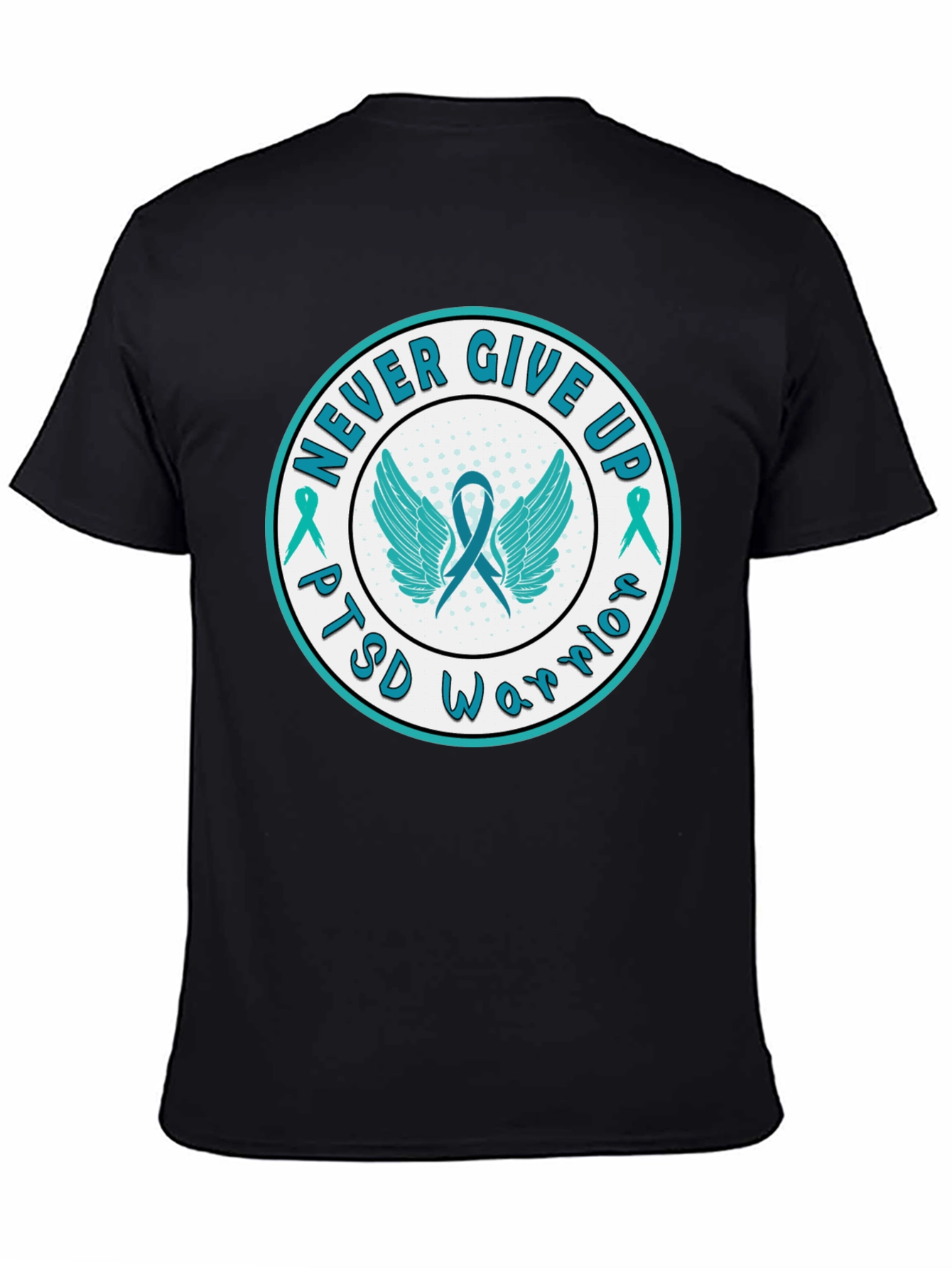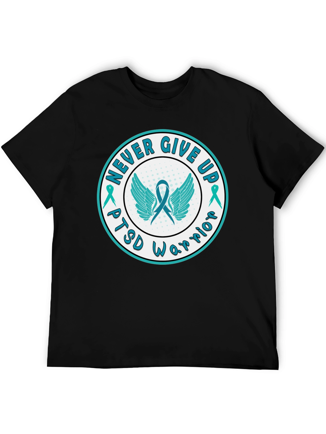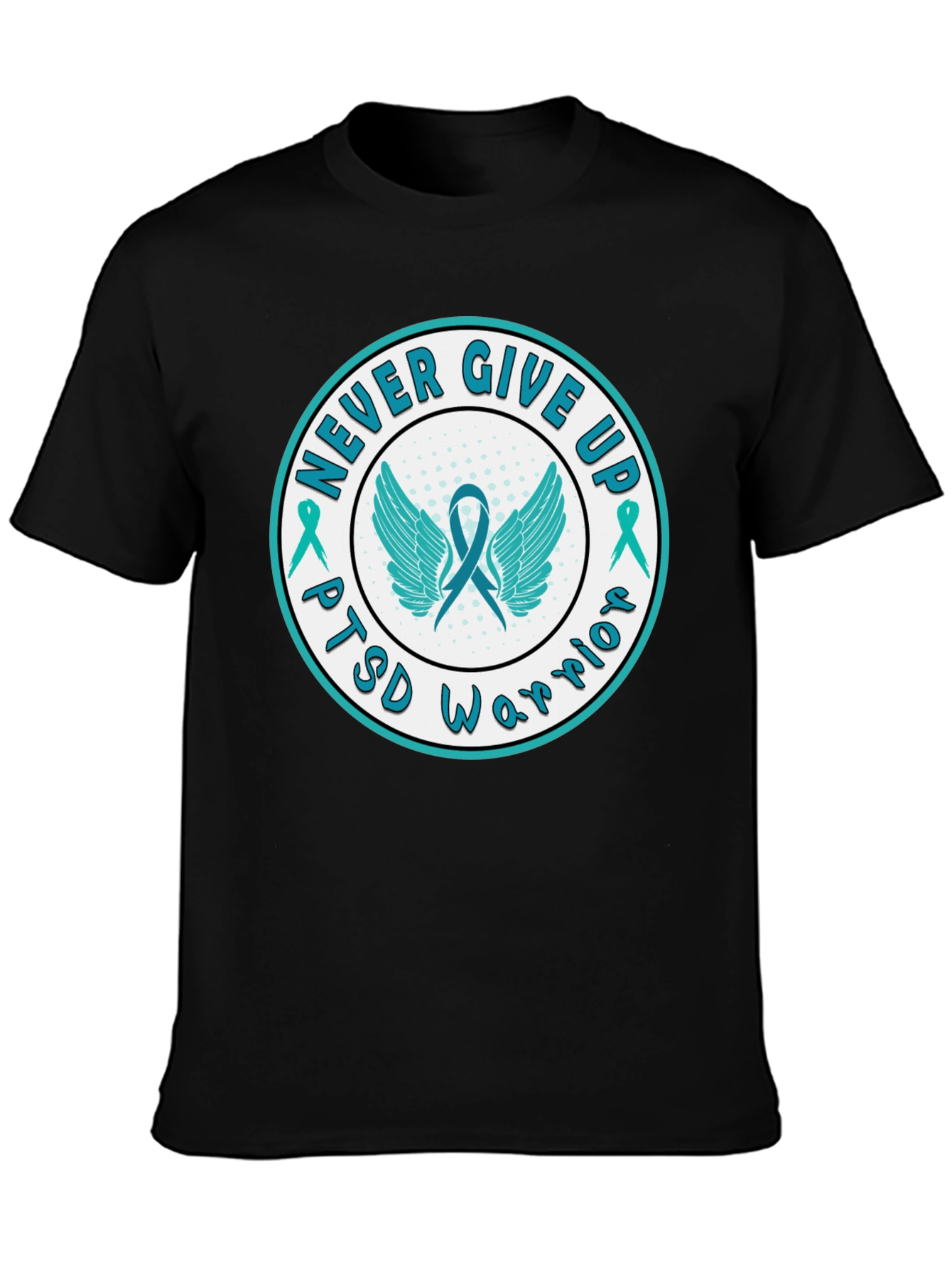 Luce esta impactante camiseta negra con un diseño conmemorativo. En el centro, un círculo con las palabras "Never Give Up" (Nunca te rindas) y "PTSD Warrior" (Guerrero PTSD) en un elegante color aguamarina. El diseño incluye un lazo con alas, símbolo de esperanza y fortaleza. Ideal para mostrar apoyo y concienciación sobre el PTSD. Fabricada con materiales cómodos y duraderos, perfecta para uso diario o eventos especiales. Únete a la causa y lleva un mensaje de resiliencia y coraje.