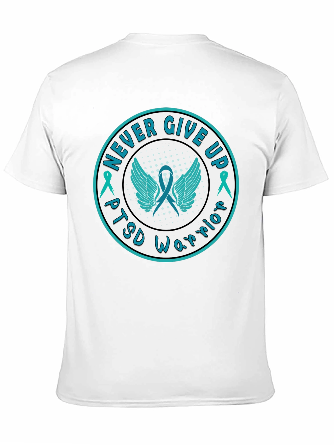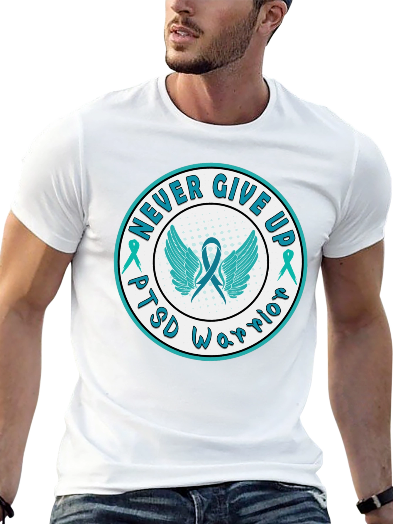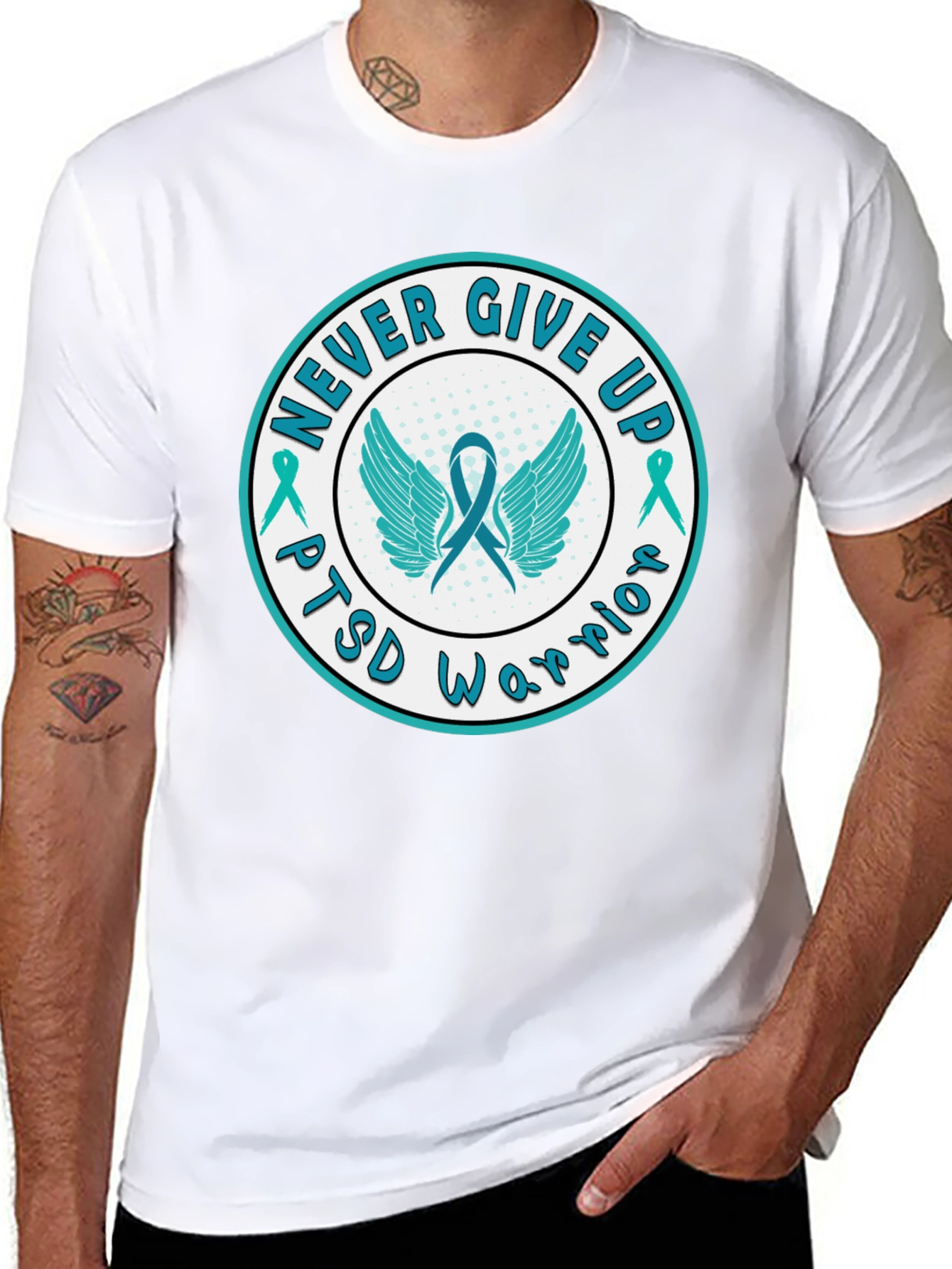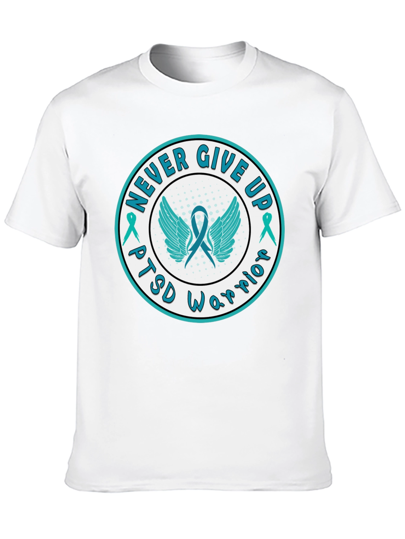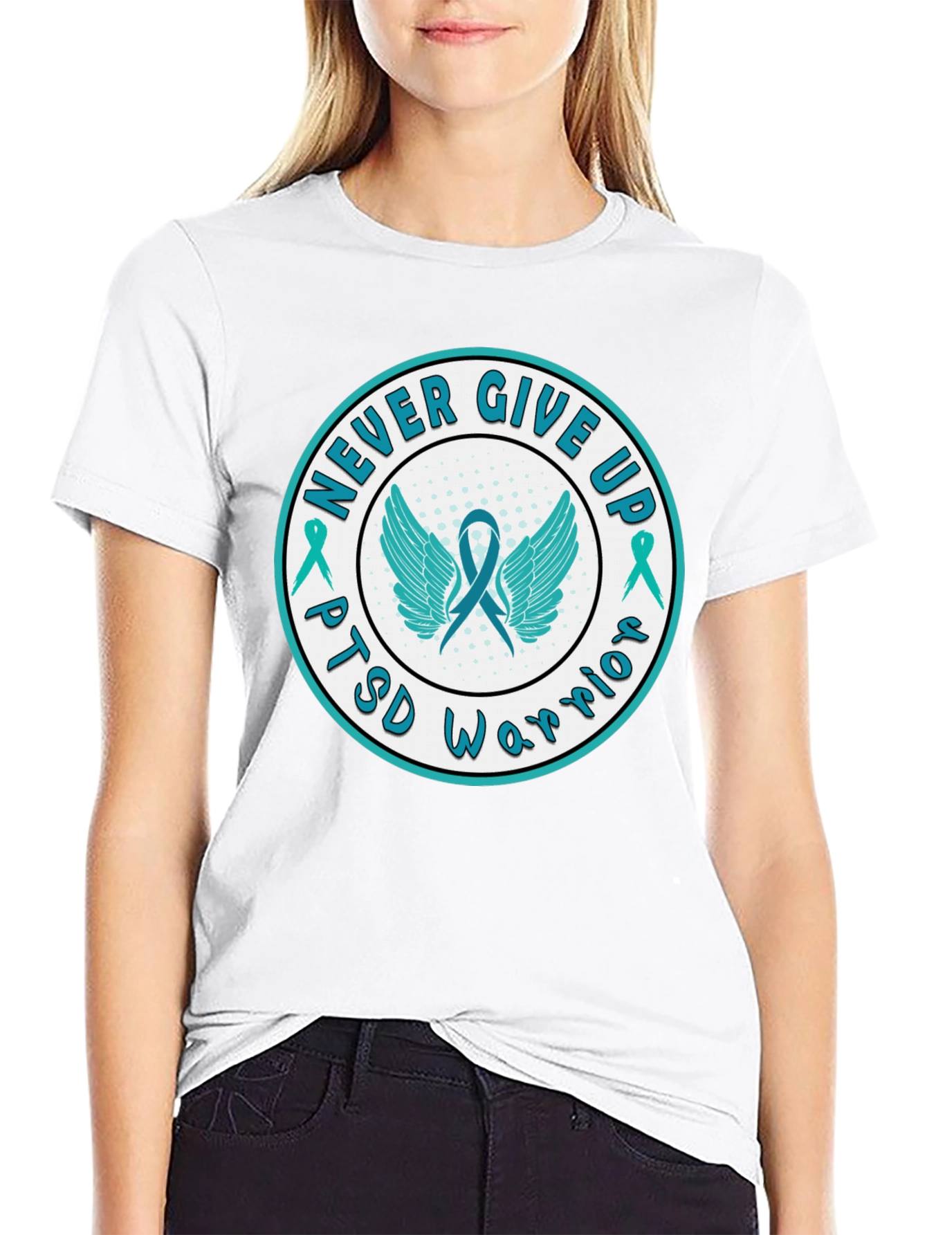 Luce esta impactante camiseta negra con un diseño conmemorativo. En el centro, un círculo con las palabras "Never Give Up" (Nunca te rindas) y "PTSD Warrior" (Guerrero PTSD) en un elegante color aguamarina. El diseño incluye un lazo con alas, símbolo de esperanza y fortaleza. Ideal para mostrar apoyo y concienciación sobre el PTSD. Fabricada con materiales cómodos y duraderos, perfecta para uso diario o eventos especiales. Únete a la causa y lleva un mensaje de resiliencia y coraje.