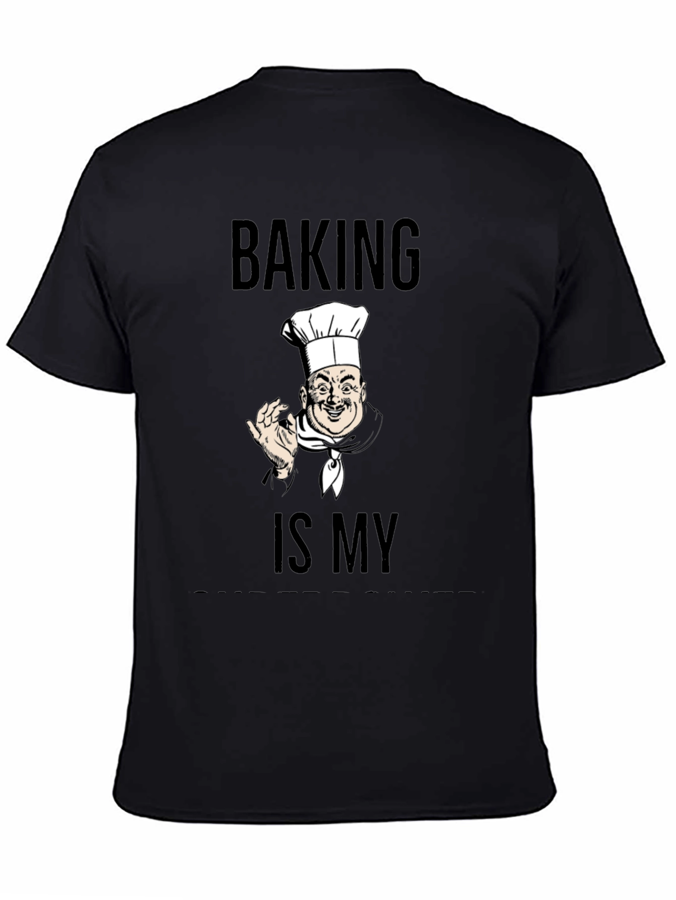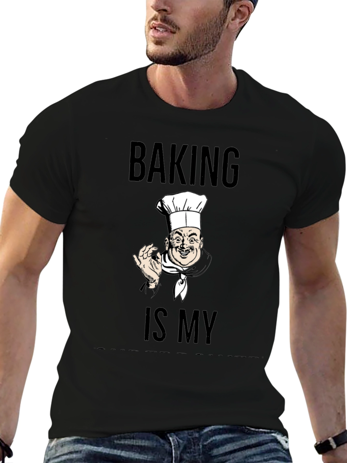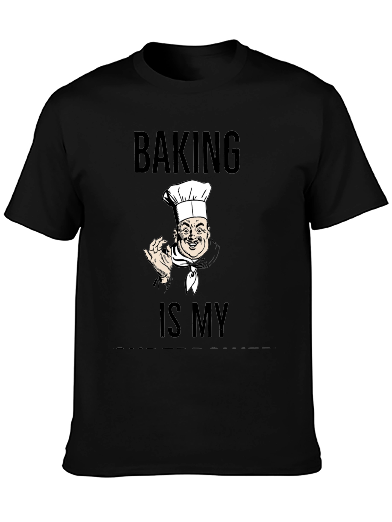 Esta elegante camiseta negra presenta un diseño único para los amantes de la repostería. Con la frase "Baking is My" (Horneando es lo Mío) impresa en negrita, junto con la ilustración de un chef sonriente, esta camiseta es perfecta para expresar tu pasión por la cocina. Fabricada con un tejido suave y cómodo, es ideal para usar mientras horneas tus delicias favoritas o simplemente para lucir un estilo original y divertido en tu día a día. Muestra tu amor por la repostería con esta prenda llamativa y de gran calidad.