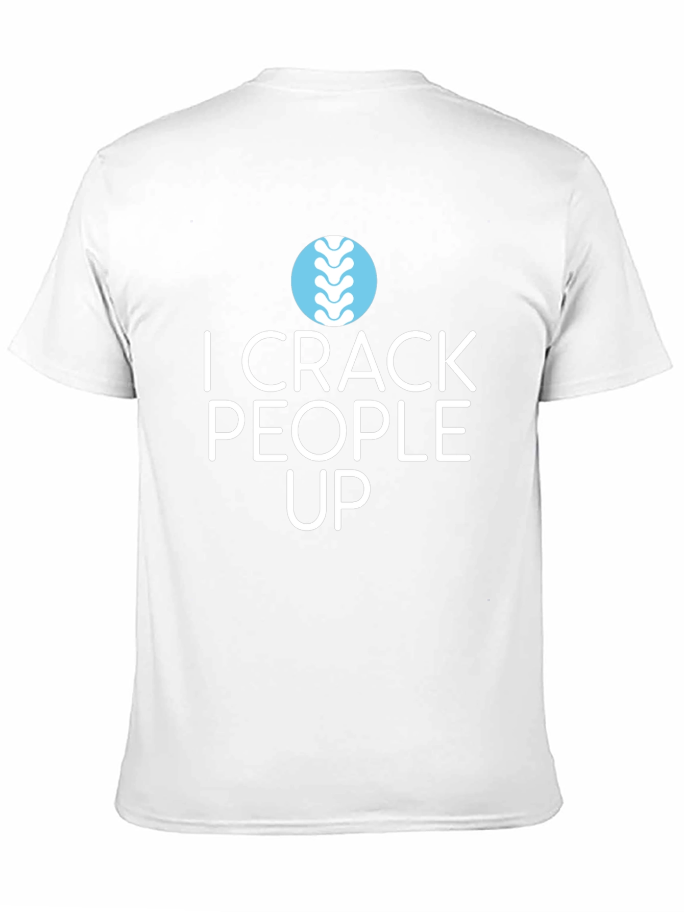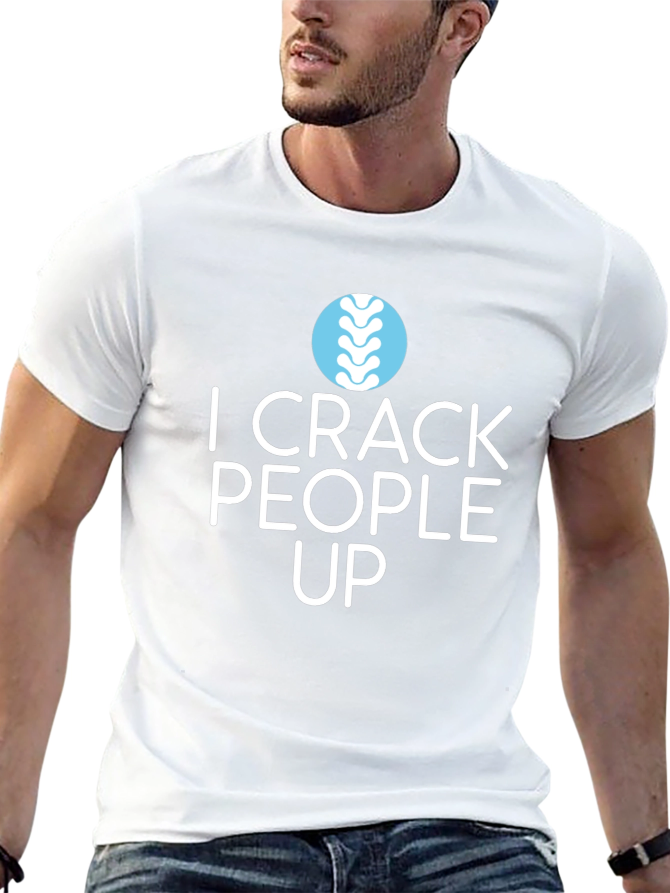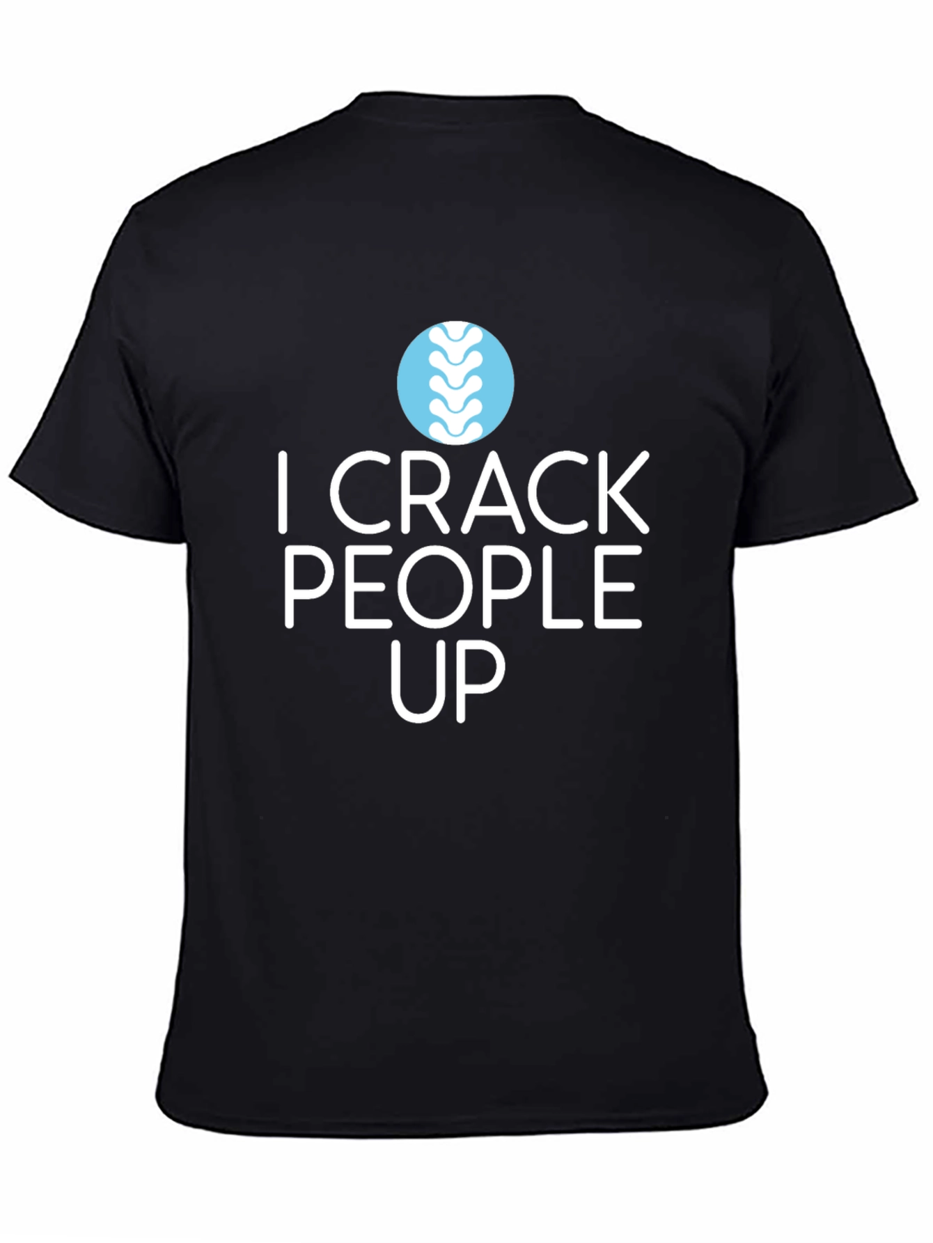 Muestra tu sentido del humor con esta camiseta negra de cuello redondo. Presenta un diseño llamativo con la frase "I Crack People Up" en letras blancas audaces, complementado con un divertido gráfico de una columna vertebral en un círculo azul. Fabricada en un tejido suave y cómodo, esta camiseta es perfecta para uso diario, ya sea para relajar en casa o para salir con amigos. Su ajuste moderno la hace ideal para combinar con jeans o pantalones casuales. Añade un toque de diversión y originalidad a tu guardarropa con esta prenda única.