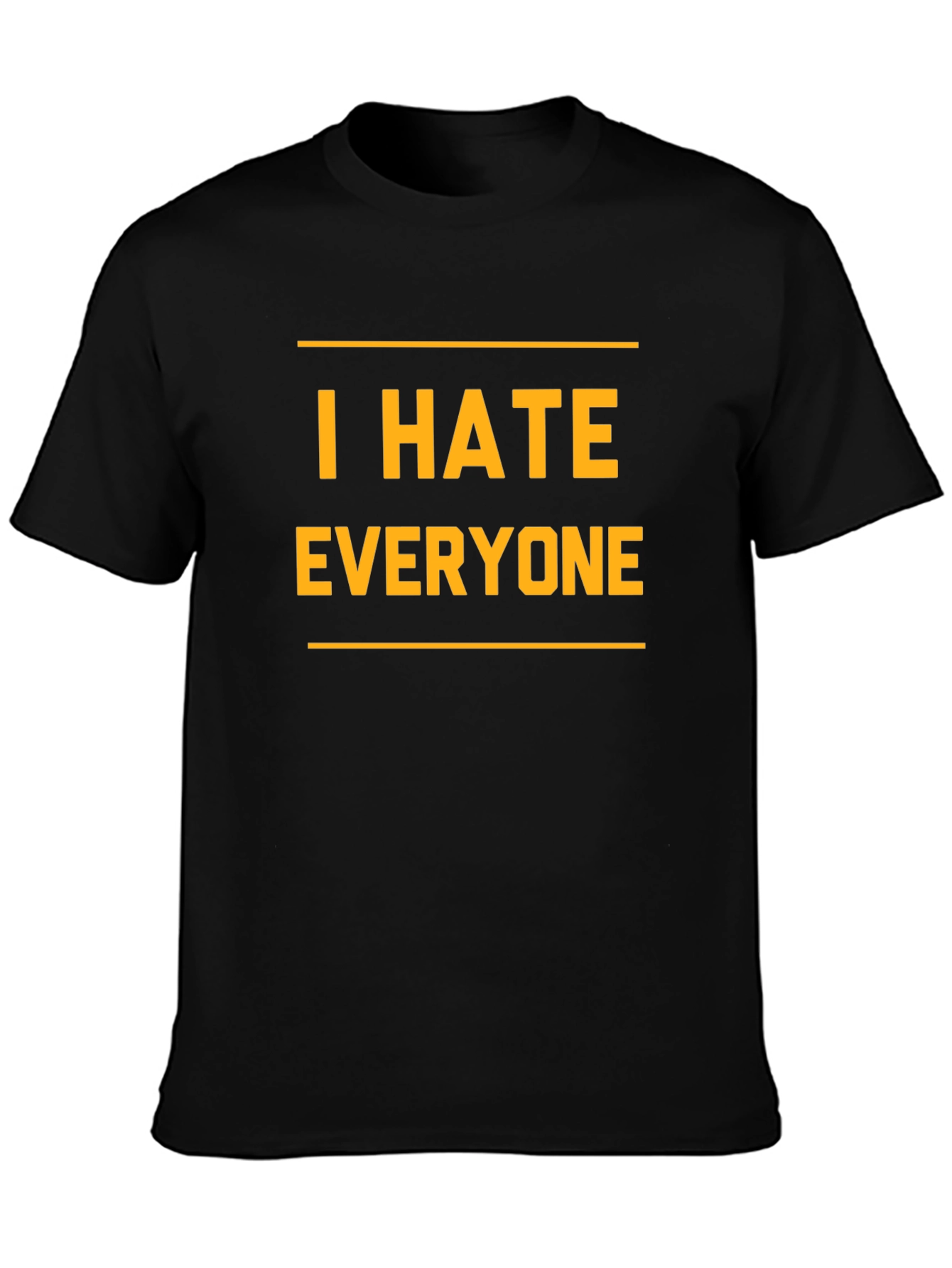 Demuestra tu lado más sarcástico con esta camiseta negra de manga corta. Con un diseño llamativo en letras amarillas y líneas horizontales que enmarcan la frase 'I HATE EVERYONE' ('Odio a todos'), esta camiseta es perfecta para aquellos que disfrutan del humor negro y no temen expresar su individualidad. El material parece ser de algodón suave, ofreciendo comodidad para el uso diario. Ideal para usar en salidas informales, eventos sociales o simplemente para relajarte en casa con un toque de ironía. ¡Deja que tu ropa hable por ti y muestra tu actitud única!