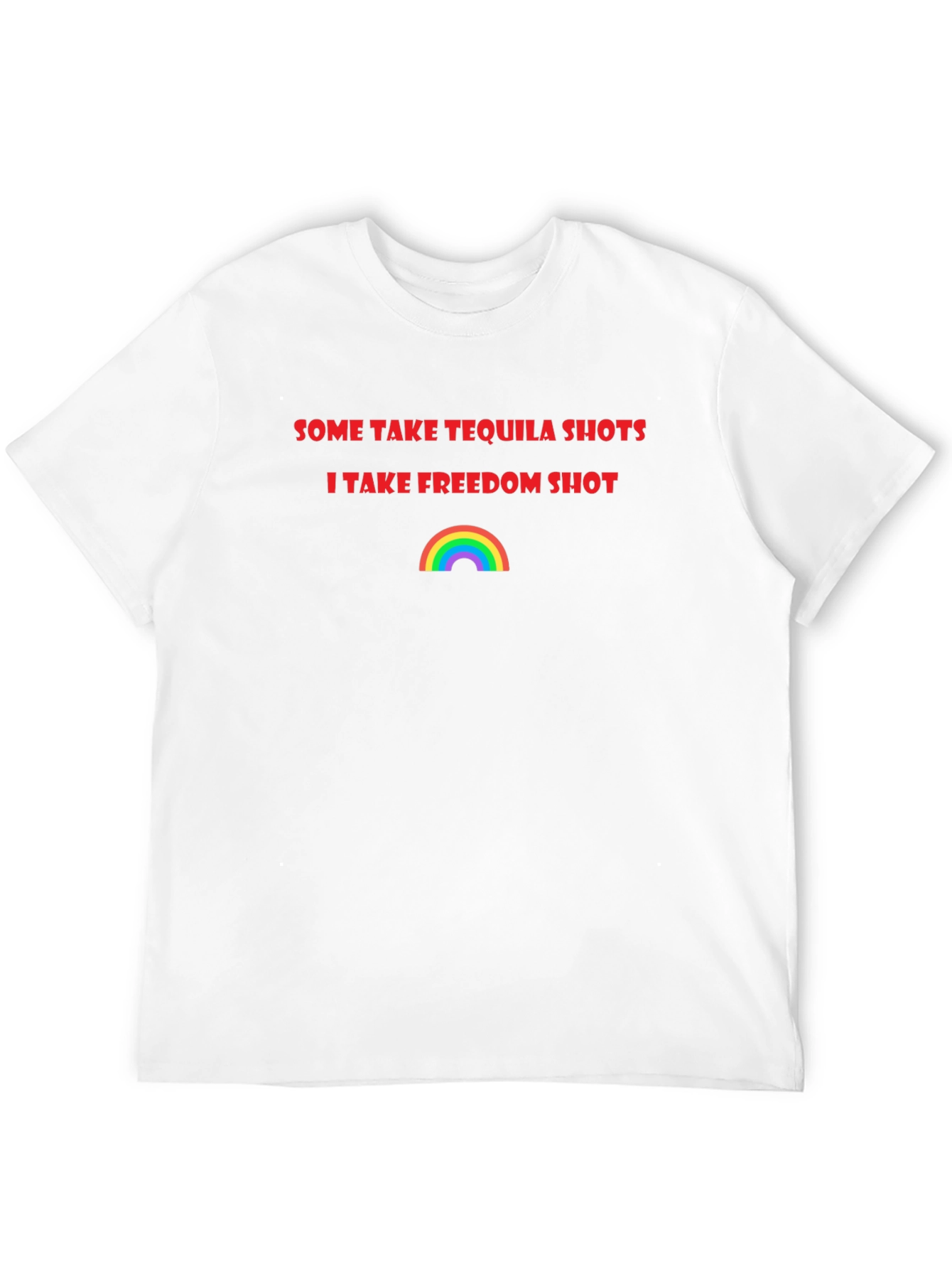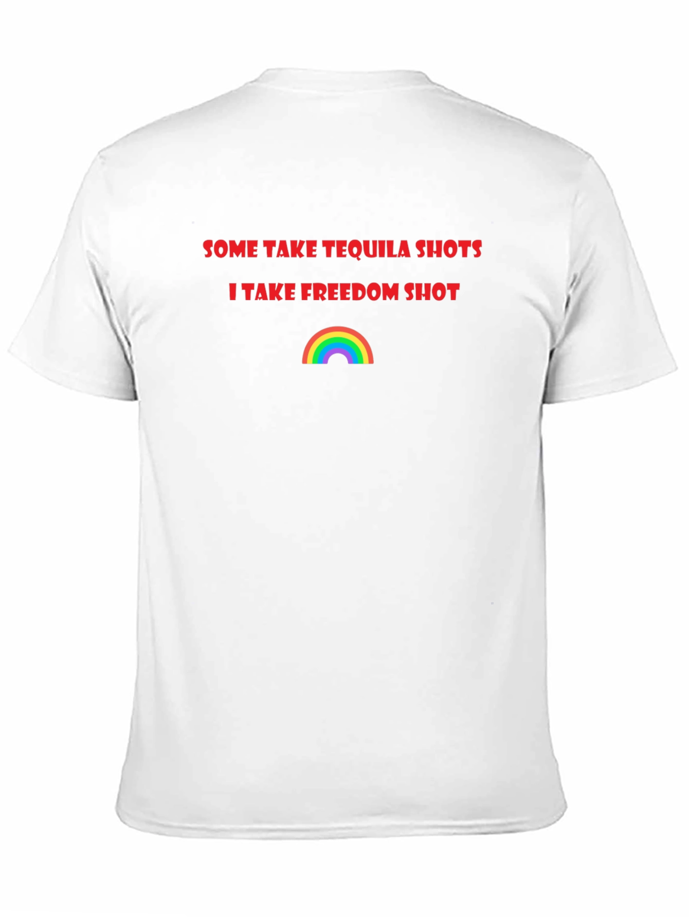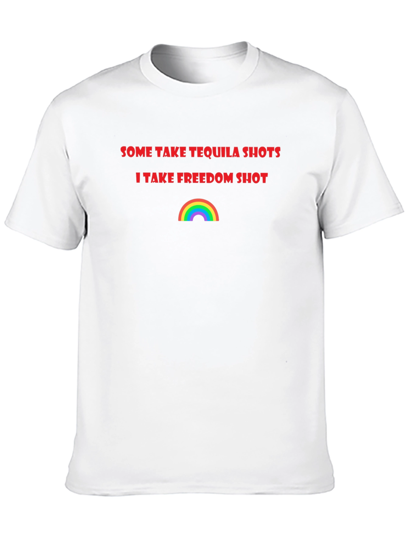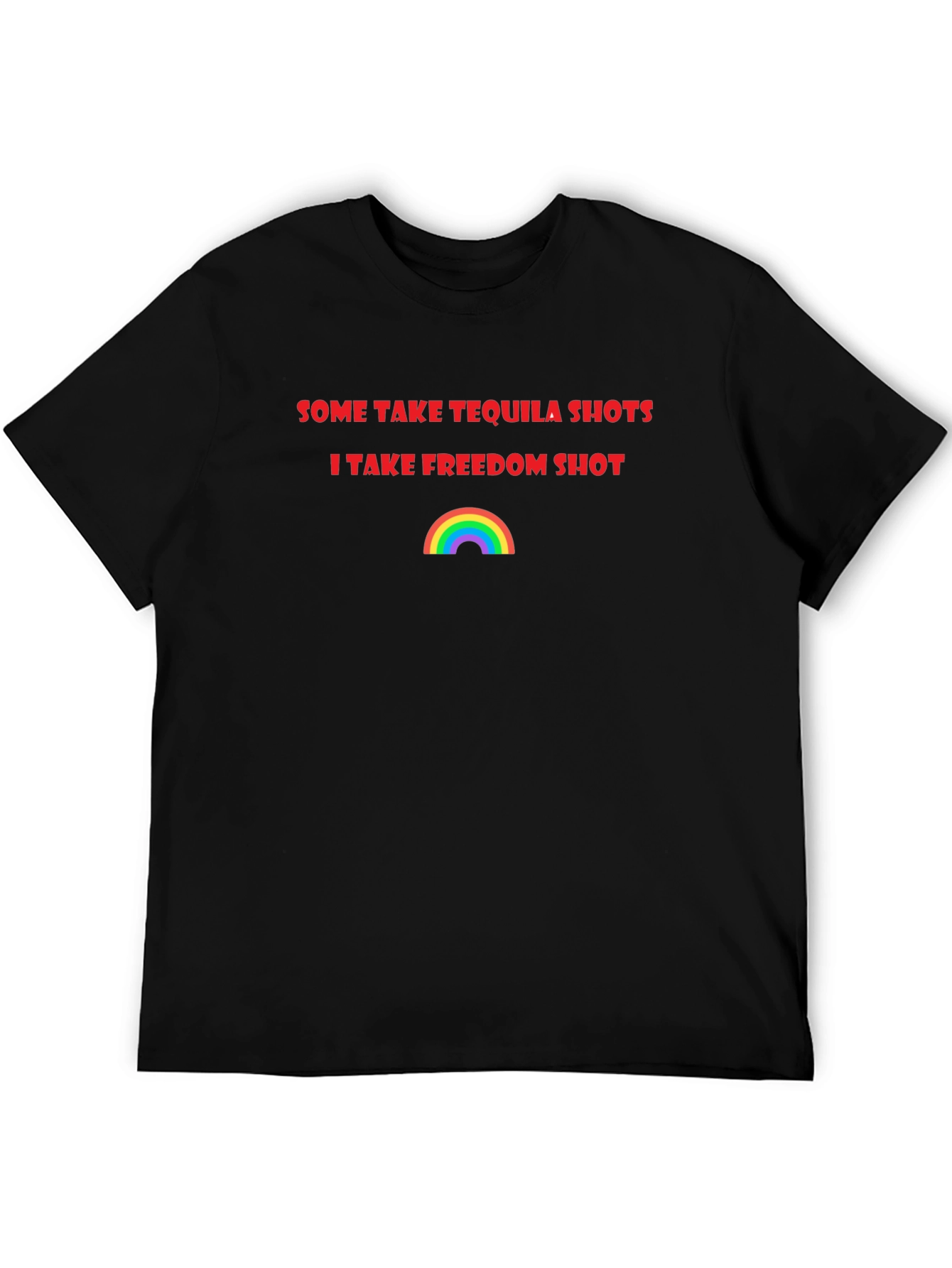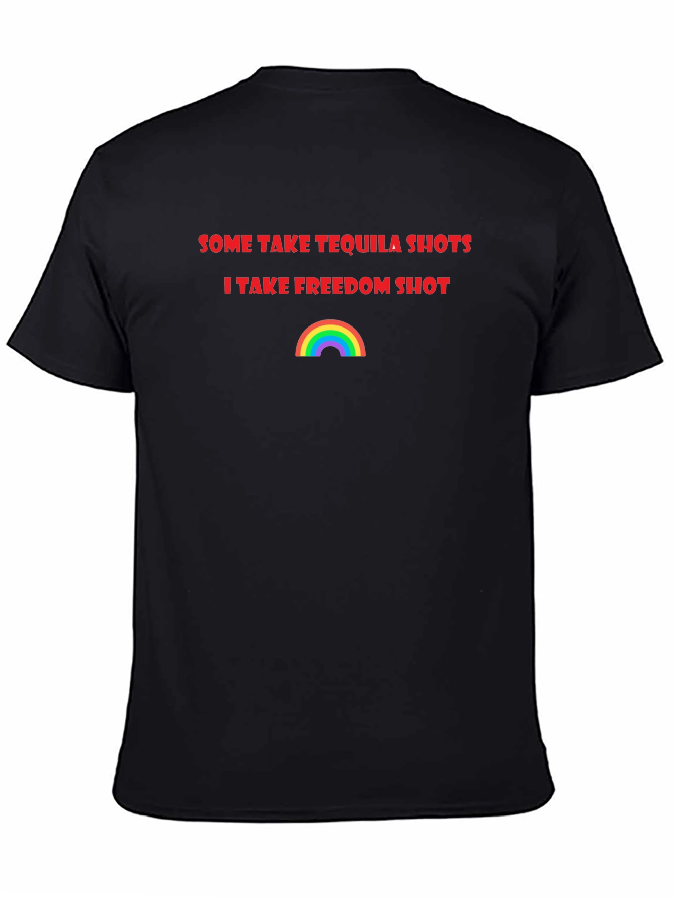 Esta camiseta negra de manga corta presenta un diseño llamativo con un toque humorístico. La frase "SOME TAKE TEQUILA SHOTS I TAKE FREEDOM SHOT", impresa en un rojo vibrante, se complementa con un pequeño arcoíris de colores brillantes. Hecha con tela suave al tacto, esta camiseta ofrece comodidad y estilo. Ideal para quienes buscan expresar su personalidad de manera divertida y relajada. Perfecta para usar en salidas casuales, fiestas, o simplemente para añadir un toque de alegría a tu día a día. Expresa tu individualidad con esta prenda única. ¡Un imprescindible en tu guardarropa!