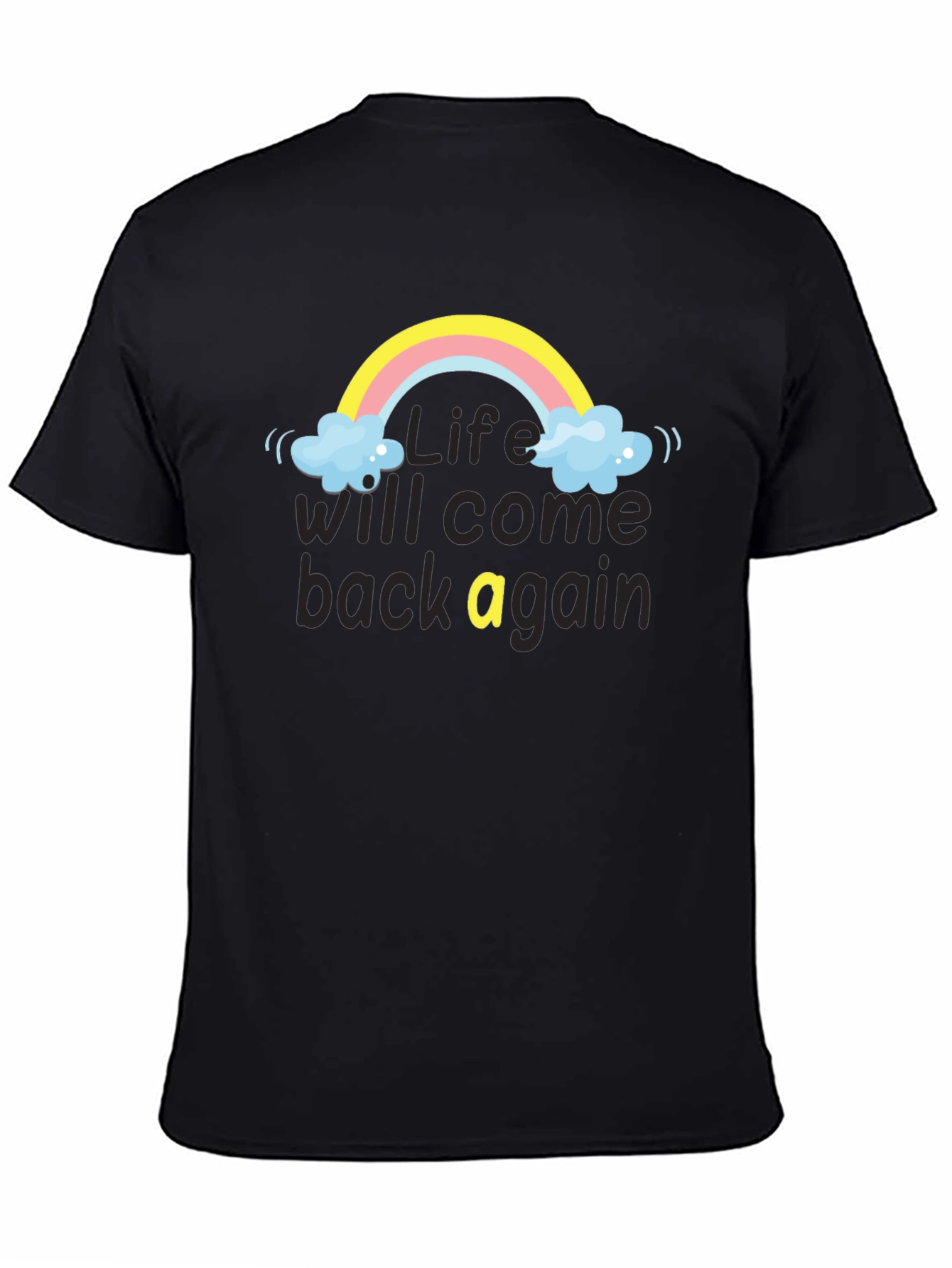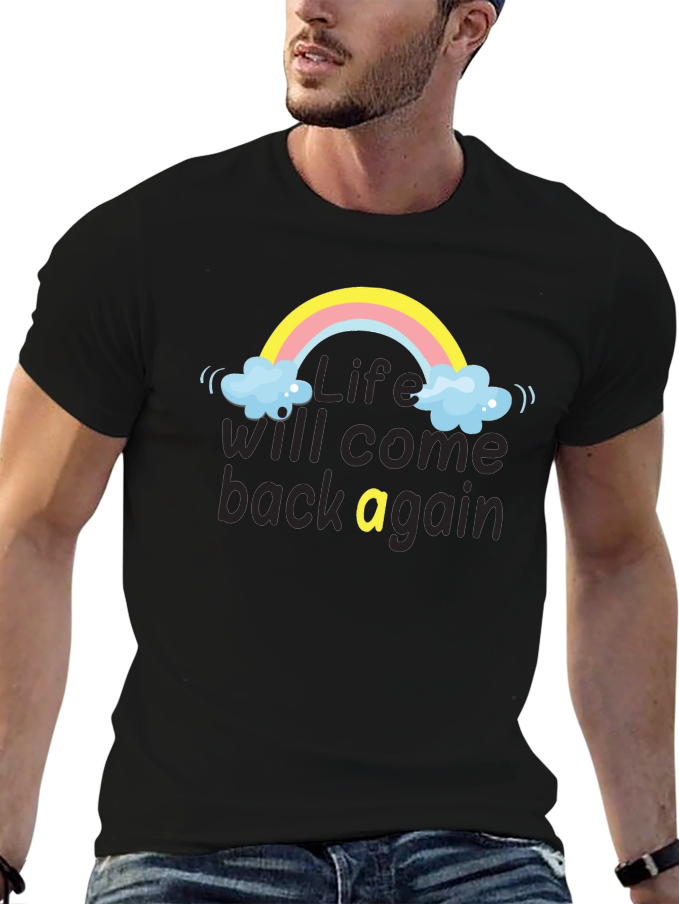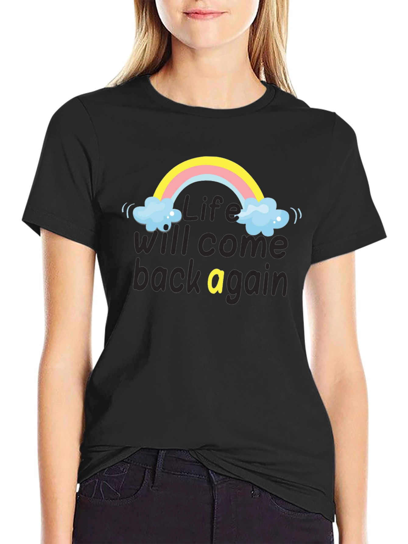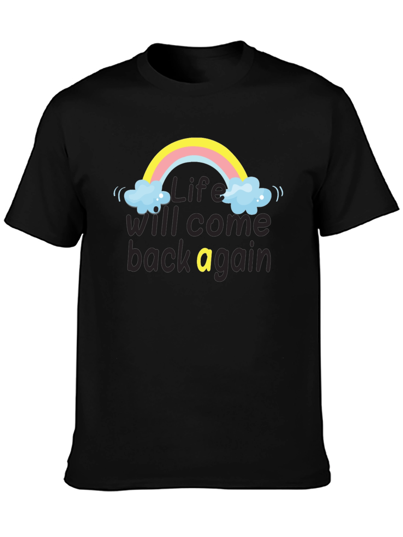 Luce esta camiseta negra con un diseño inspirador! Presenta un arcoíris alegre sobre nubes juguetonas, acompañado del mensaje 'Life will come back again'. La letra 'a' destaca en un llamativo color amarillo. Ideal para un look casual y optimista. Perfecta para expresar tu positivismo y esperanza en el futuro. Fabricada con materiales suaves y cómodos, esta camiseta es ideal para uso diario. ¡Añade un toque de color y optimismo a tu armario!