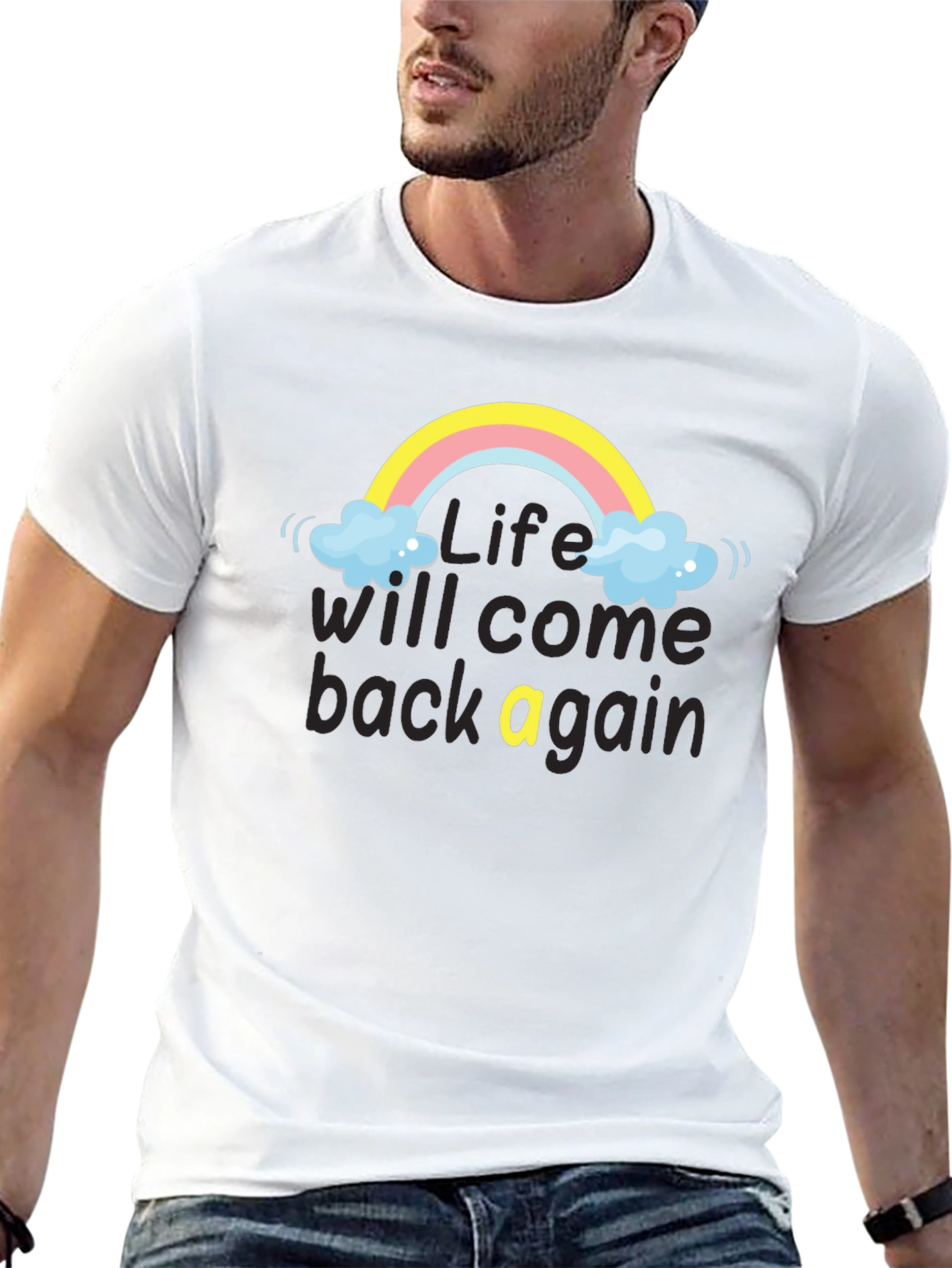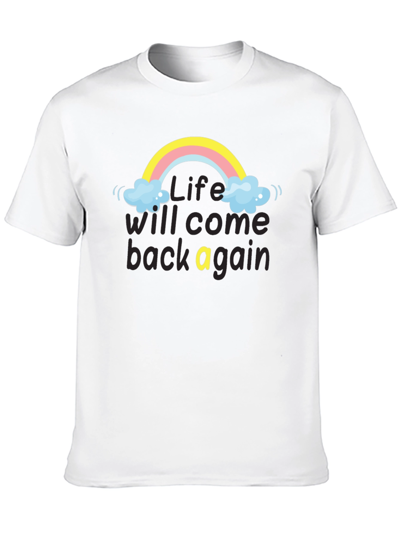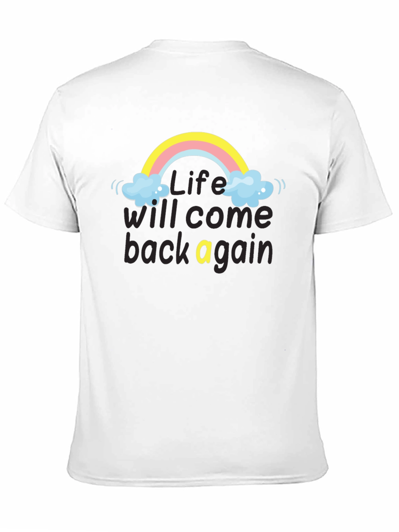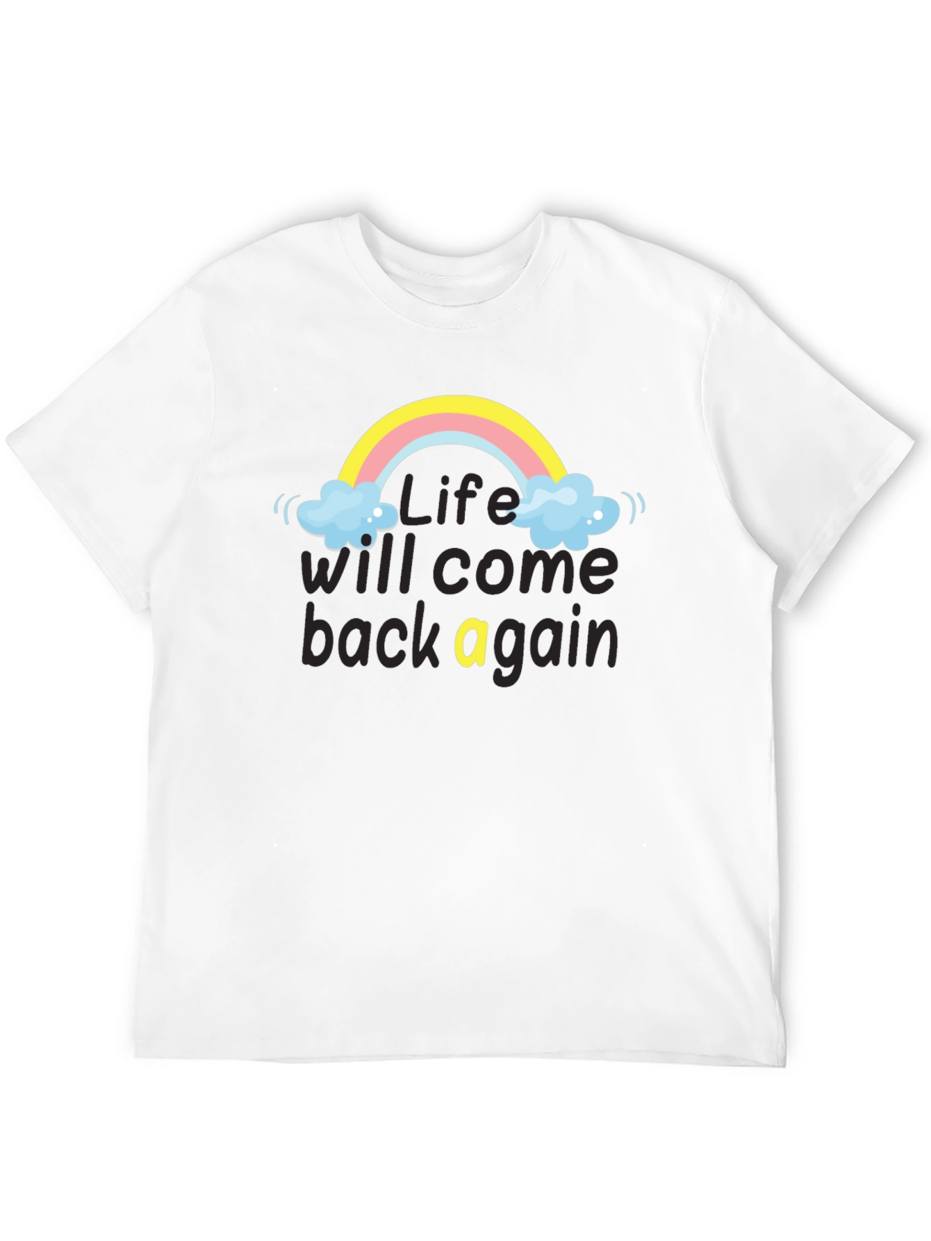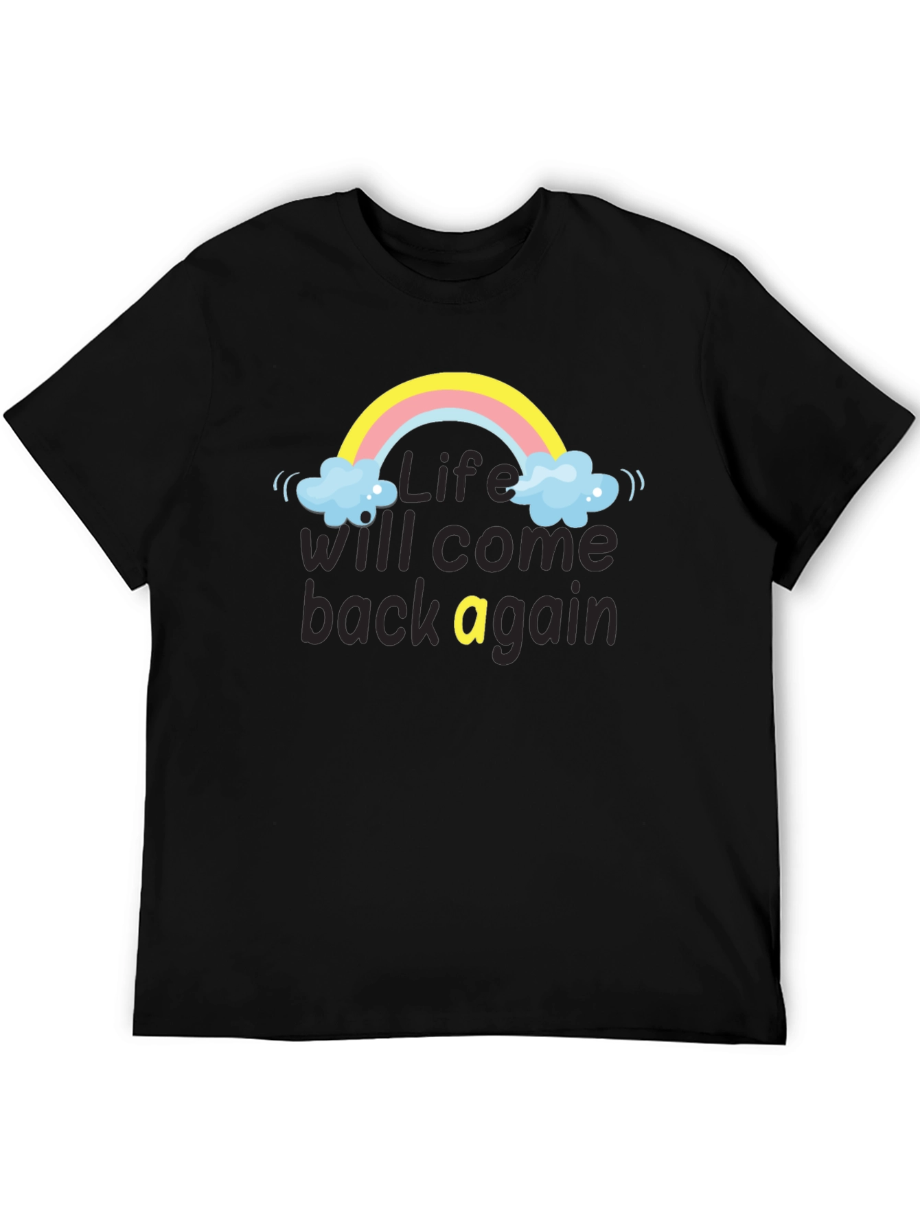 Luce esta camiseta negra con un diseño inspirador! Presenta un arcoíris alegre sobre nubes juguetonas, acompañado del mensaje 'Life will come back again'. La letra 'a' destaca en un llamativo color amarillo. Ideal para un look casual y optimista. Perfecta para expresar tu positivismo y esperanza en el futuro. Fabricada con materiales suaves y cómodos, esta camiseta es ideal para uso diario. ¡Añade un toque de color y optimismo a tu armario!