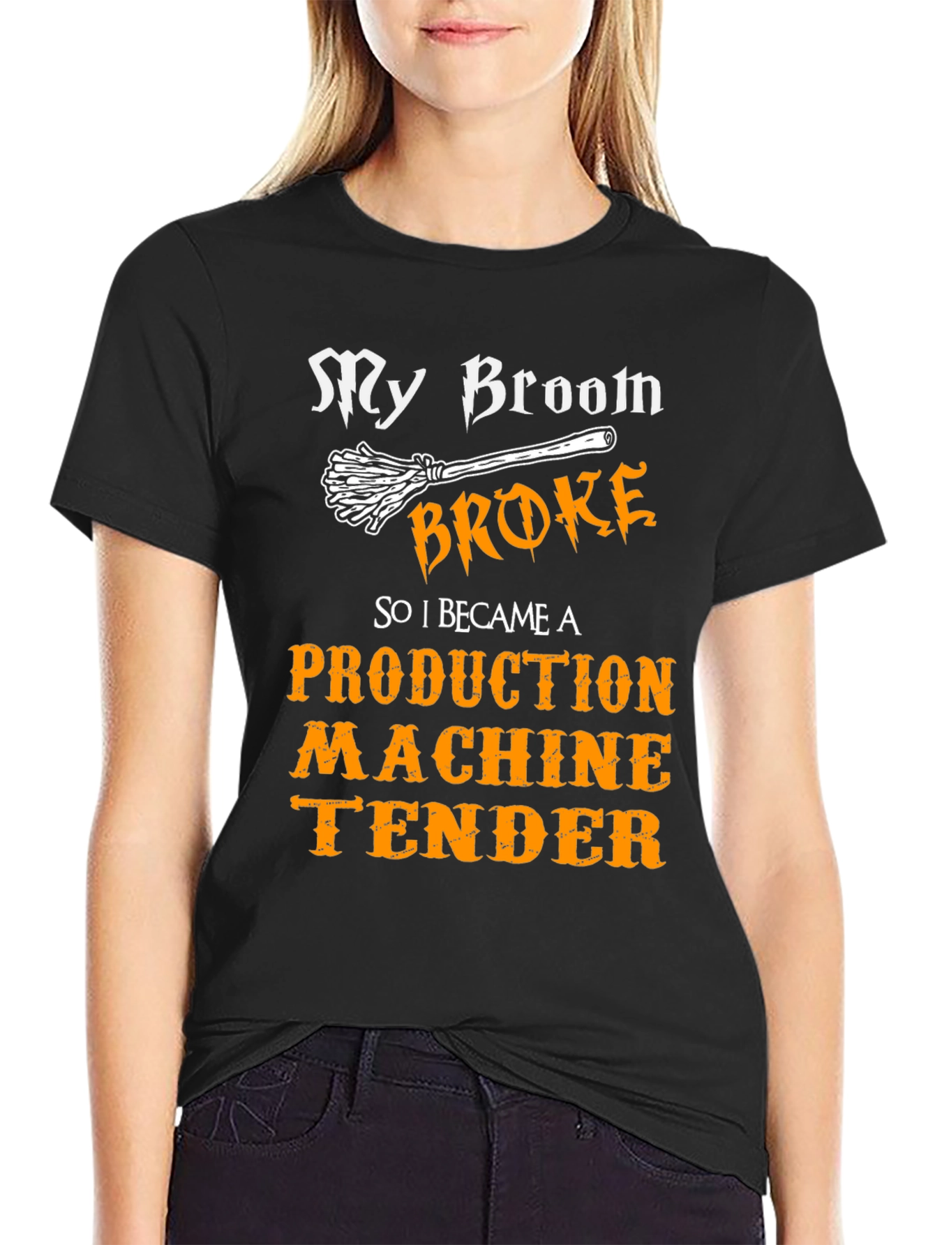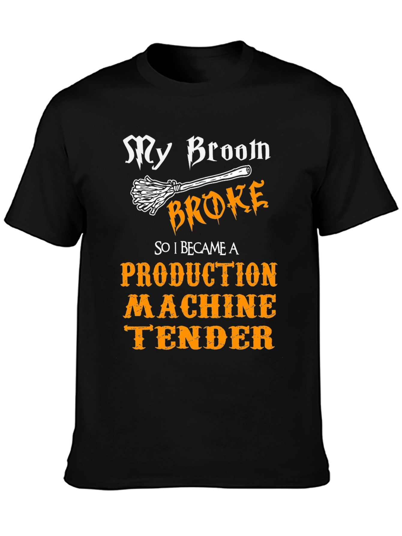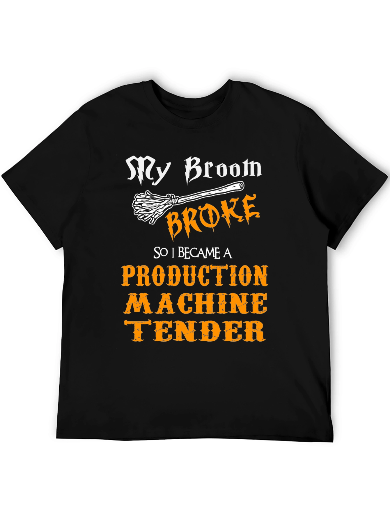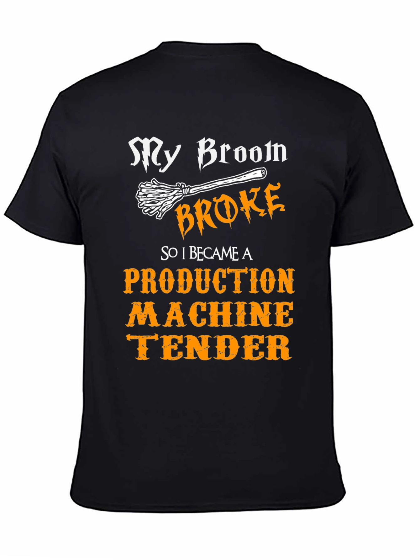 Luce esta camiseta negra con un diseño ingenioso. Presenta una ilustración de una escoba rota y el texto "My Broom BROKE SO I BECAME A PRODUCTION MACHINE TENDER". Ideal para aquellos con sentido del humor y que aprecian un diseño original. Perfecta para usar en el trabajo, en casa o para salir con amigos. Hecha con materiales cómodos y duraderos, esta camiseta es una excelente adición a cualquier guardarropa casual. ¡Demuestra tu estilo único con esta prenda llamativa y divertida!