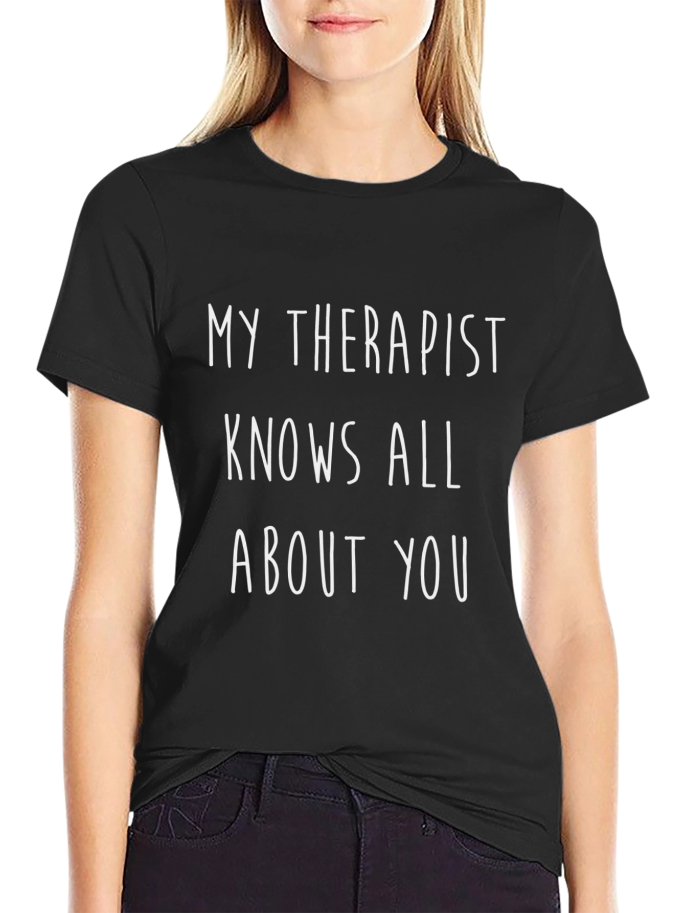 Esta camiseta negra de manga corta presenta un mensaje llamativo y divertido: "MY THERAPIST KNOWS ALL ABOUT YOU" (Mi terapeuta lo sabe todo sobre ti). El texto está impreso en letras blancas y claras, resaltando sobre el fondo oscuro. Parece estar hecha de un material suave y cómodo, ideal para el uso diario. Es una prenda perfecta para expresar tu sentido del humor y iniciar conversaciones. Úsala para una sesión de terapia, una salida casual con amigos o simplemente para relajarte en casa. Demuestra tu personalidad con esta camiseta única y original.