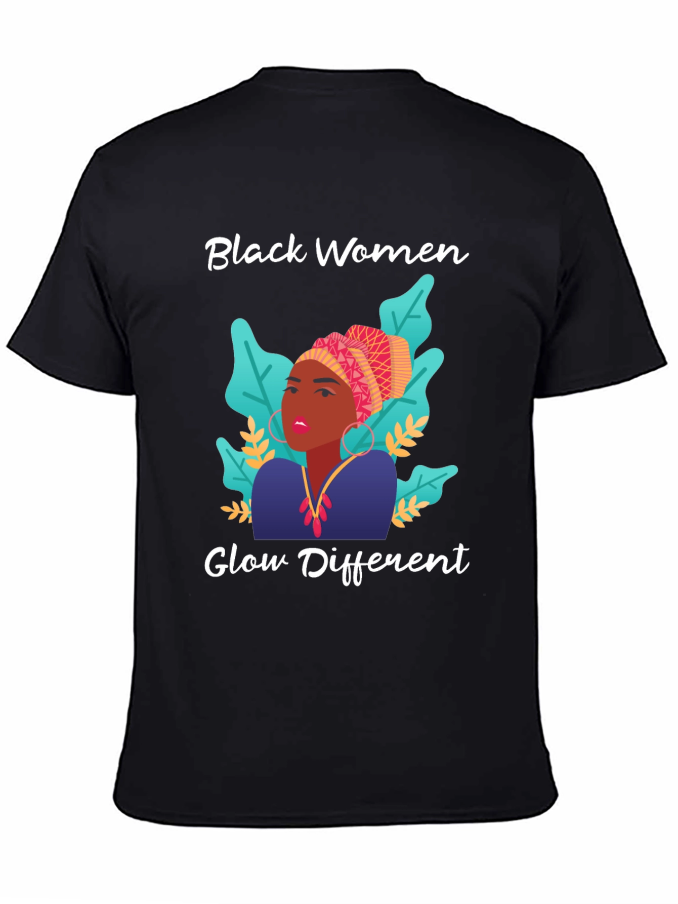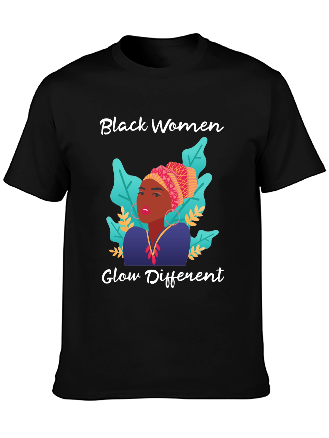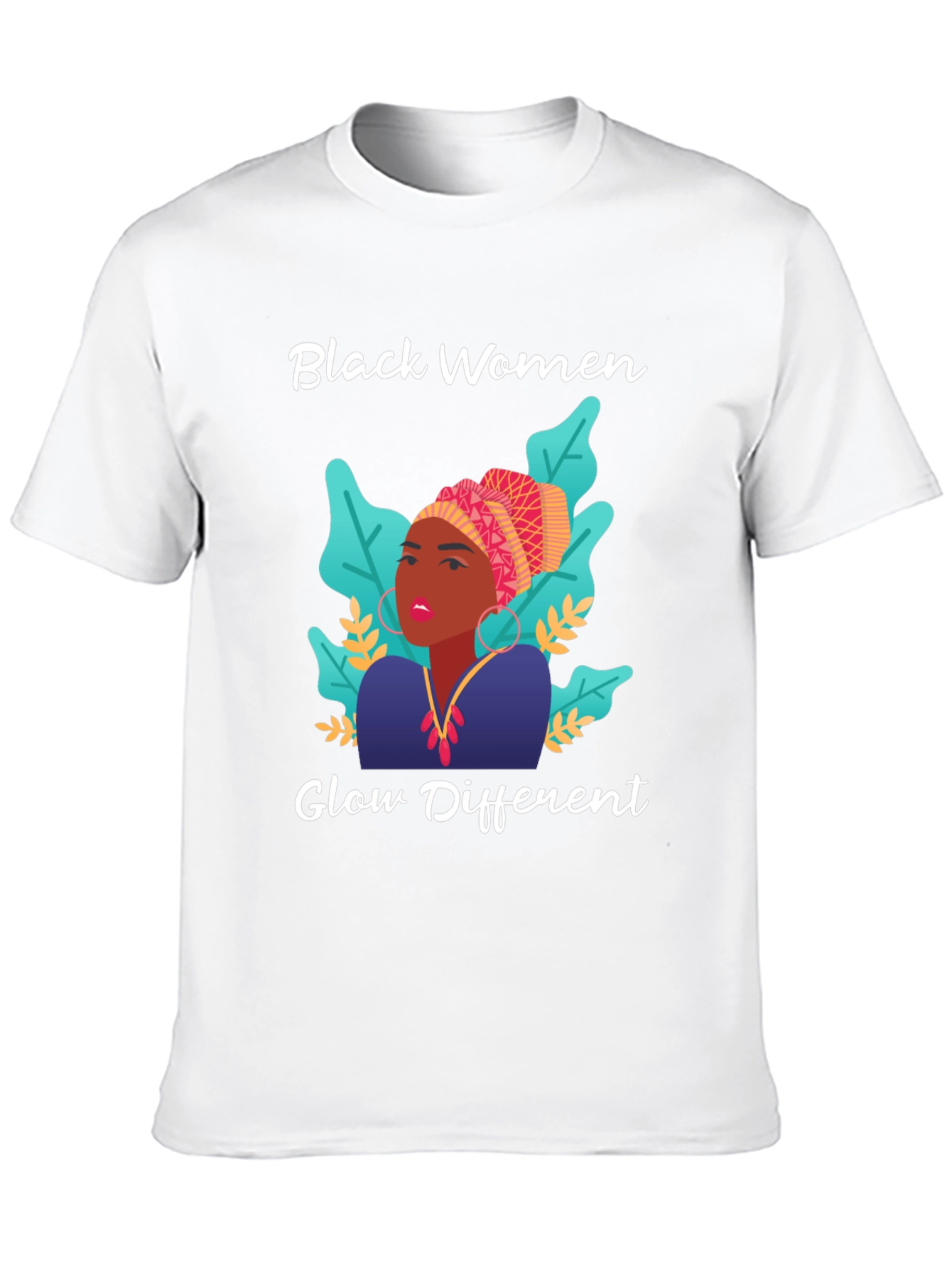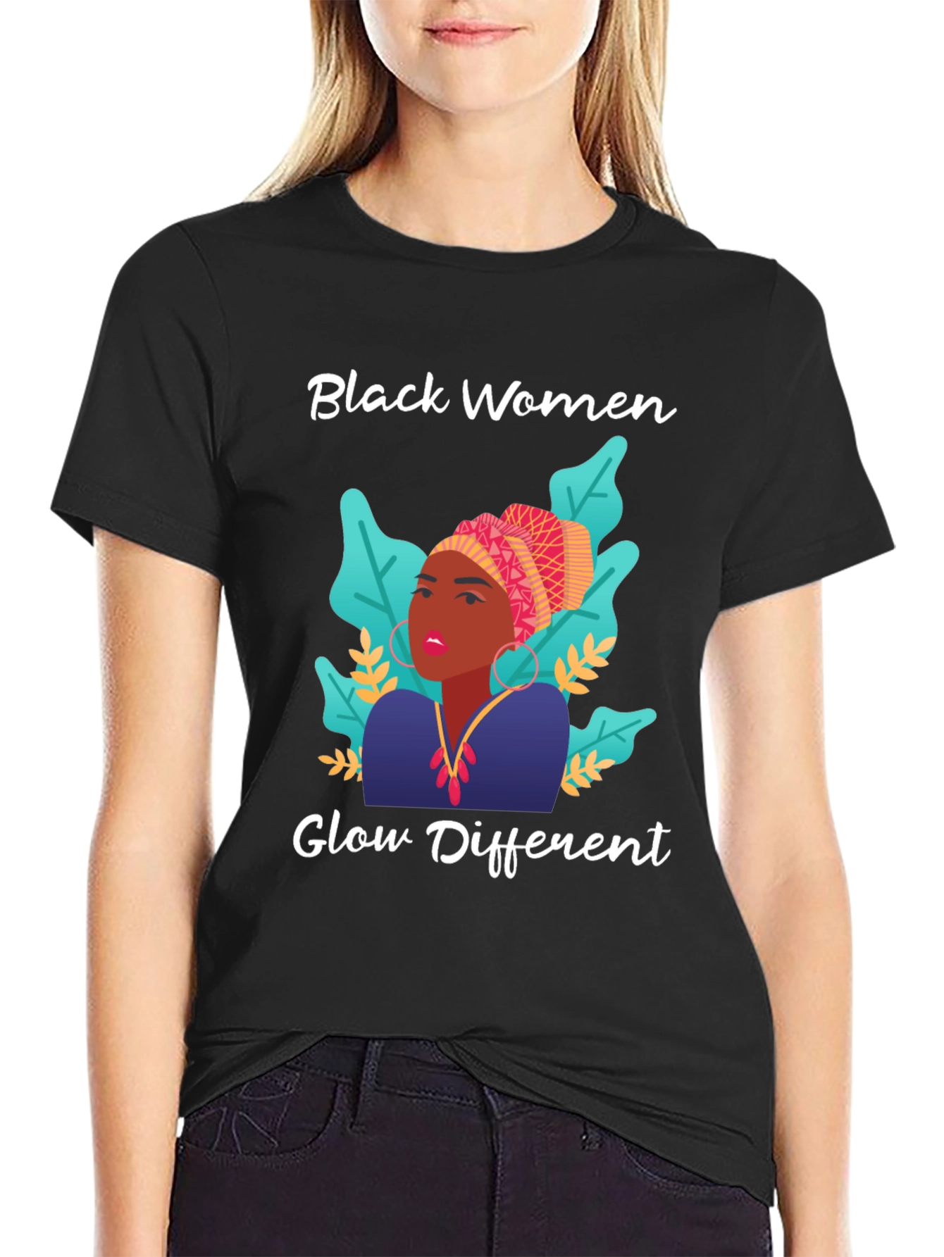 Luce esta camiseta negra con un diseño único que celebra la belleza de las mujeres negras. Con la frase "Black Women Glow Different", esta prenda destaca por su ilustración vibrante de una mujer con un turbante colorido, rodeada de hojas y detalles dorados. Perfecta para expresar tu orgullo y estilo, esta camiseta es ideal para combinar con cualquier atuendo casual. Fabricada con materiales suaves y cómodos, te asegura un ajuste perfecto y durabilidad. ¡Deja que tu luz brille con esta prenda exclusiva!