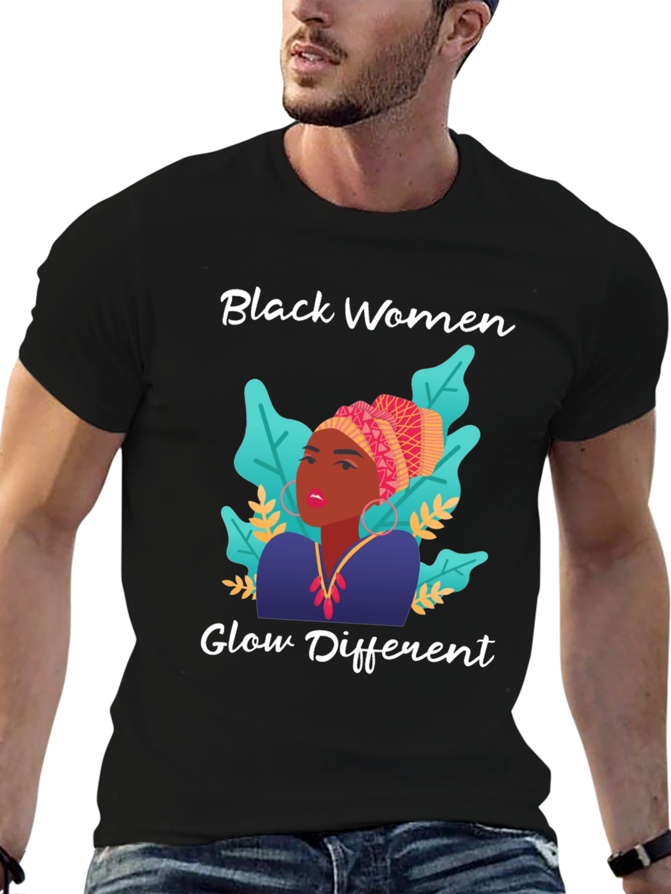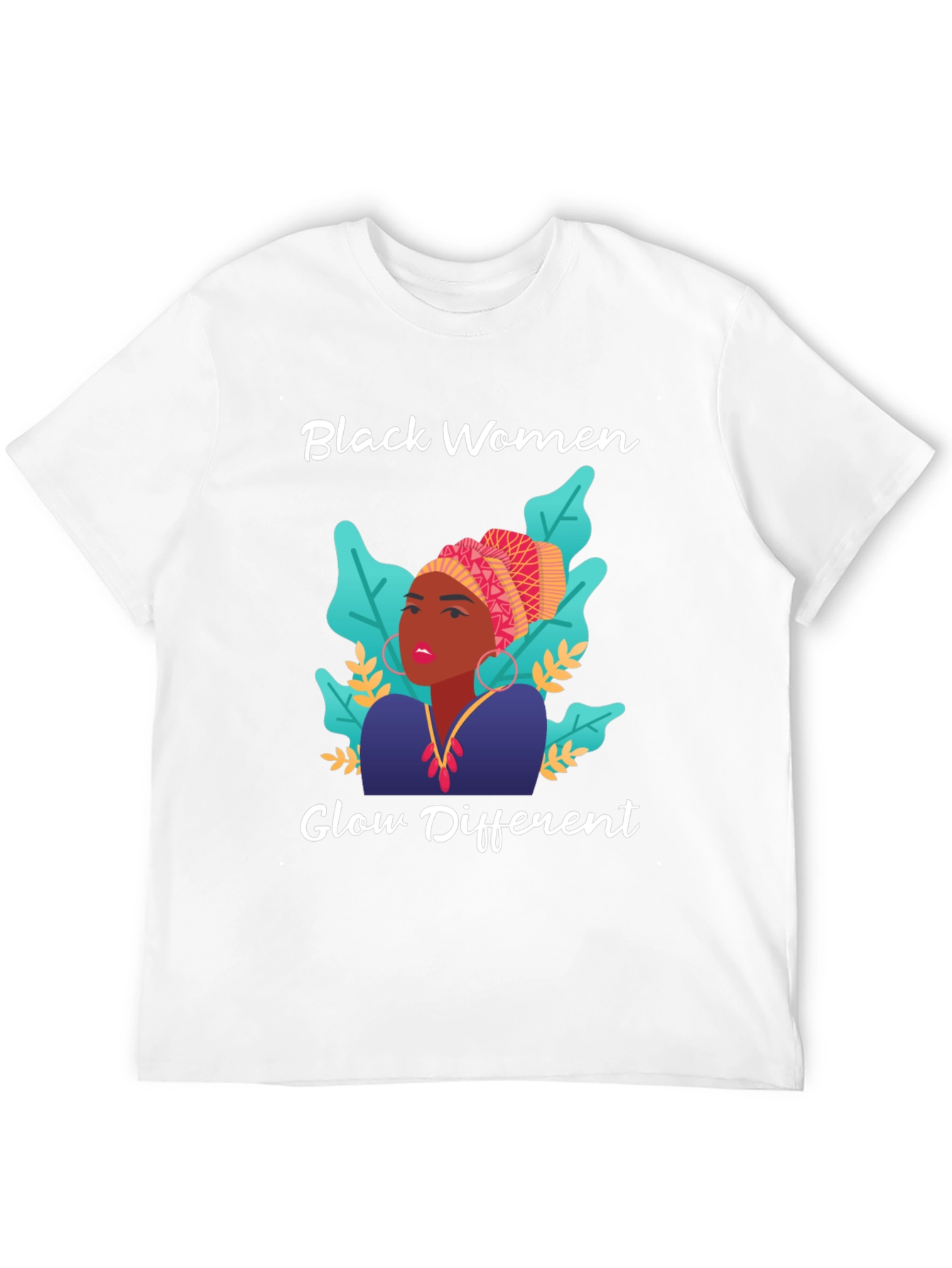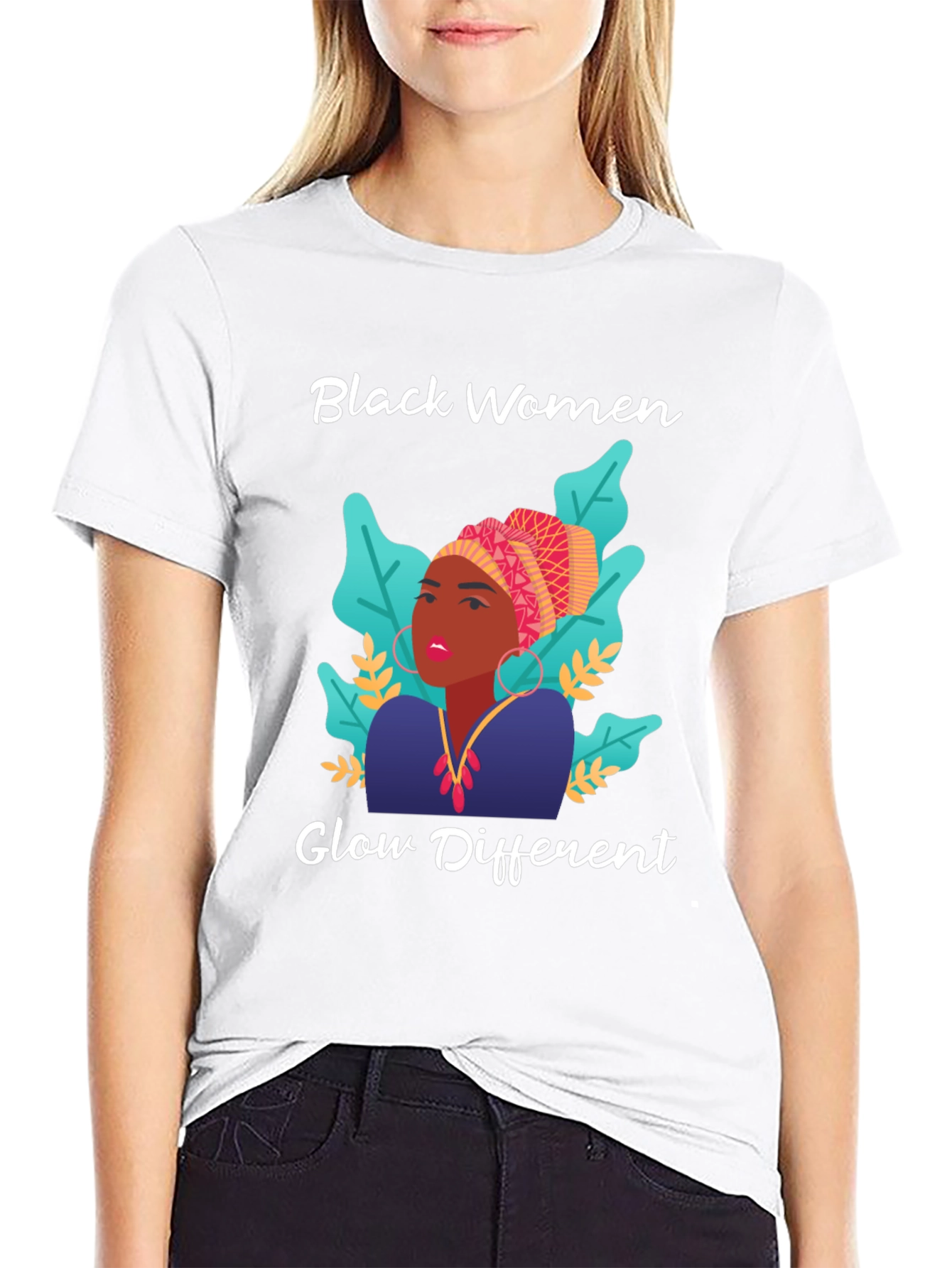 Luce esta camiseta negra con un diseño único que celebra la belleza de las mujeres negras. Con la frase "Black Women Glow Different", esta prenda destaca por su ilustración vibrante de una mujer con un turbante colorido, rodeada de hojas y detalles dorados. Perfecta para expresar tu orgullo y estilo, esta camiseta es ideal para combinar con cualquier atuendo casual. Fabricada con materiales suaves y cómodos, te asegura un ajuste perfecto y durabilidad. ¡Deja que tu luz brille con esta prenda exclusiva!