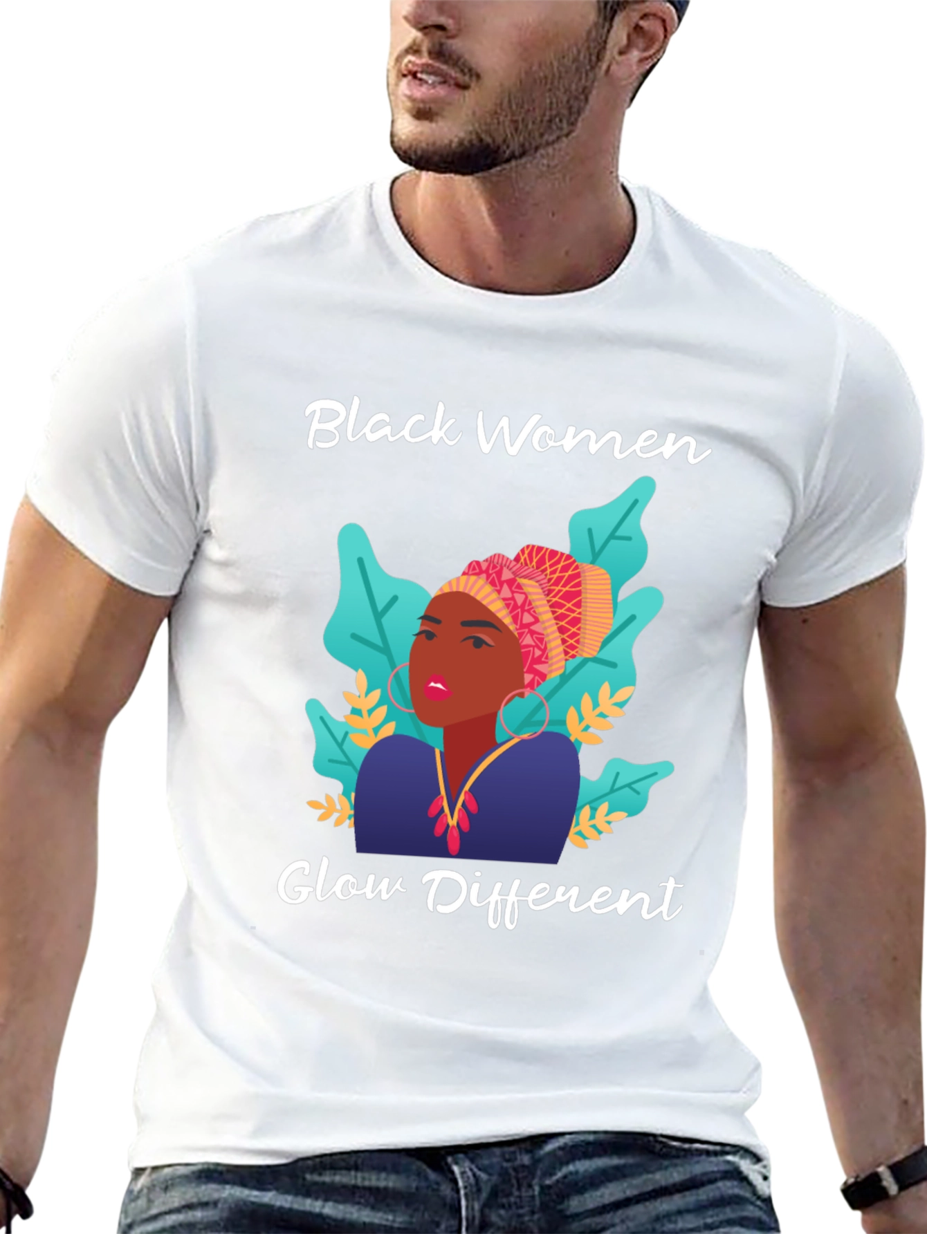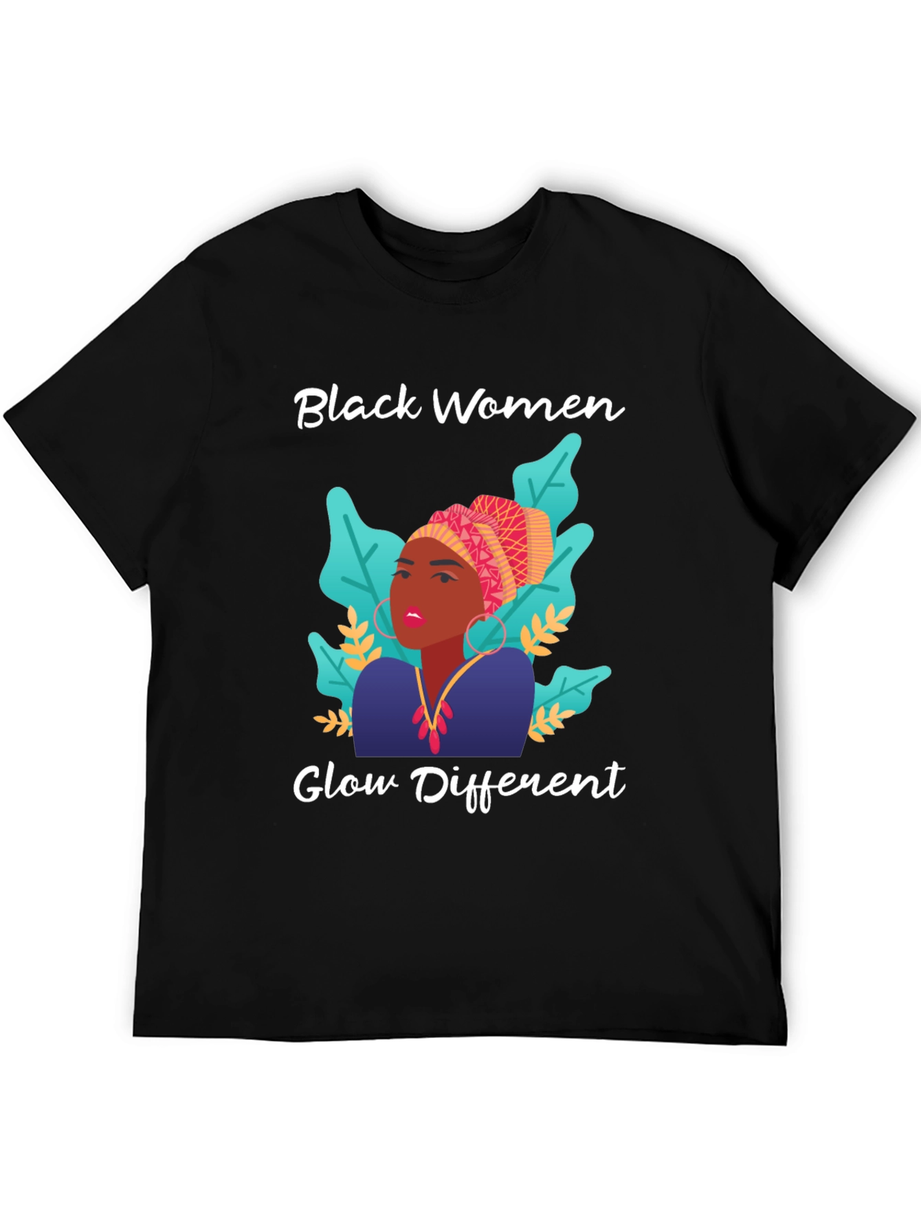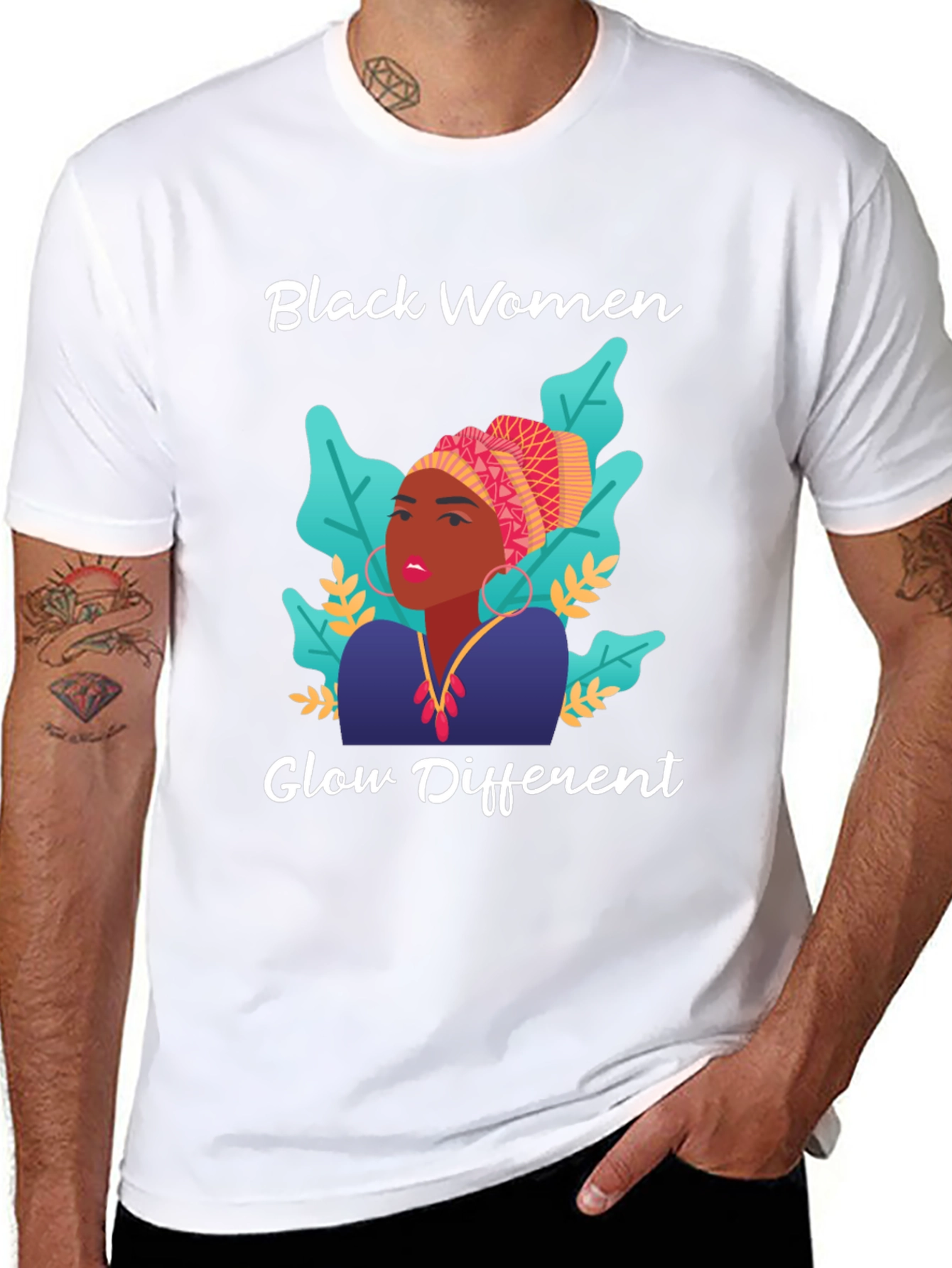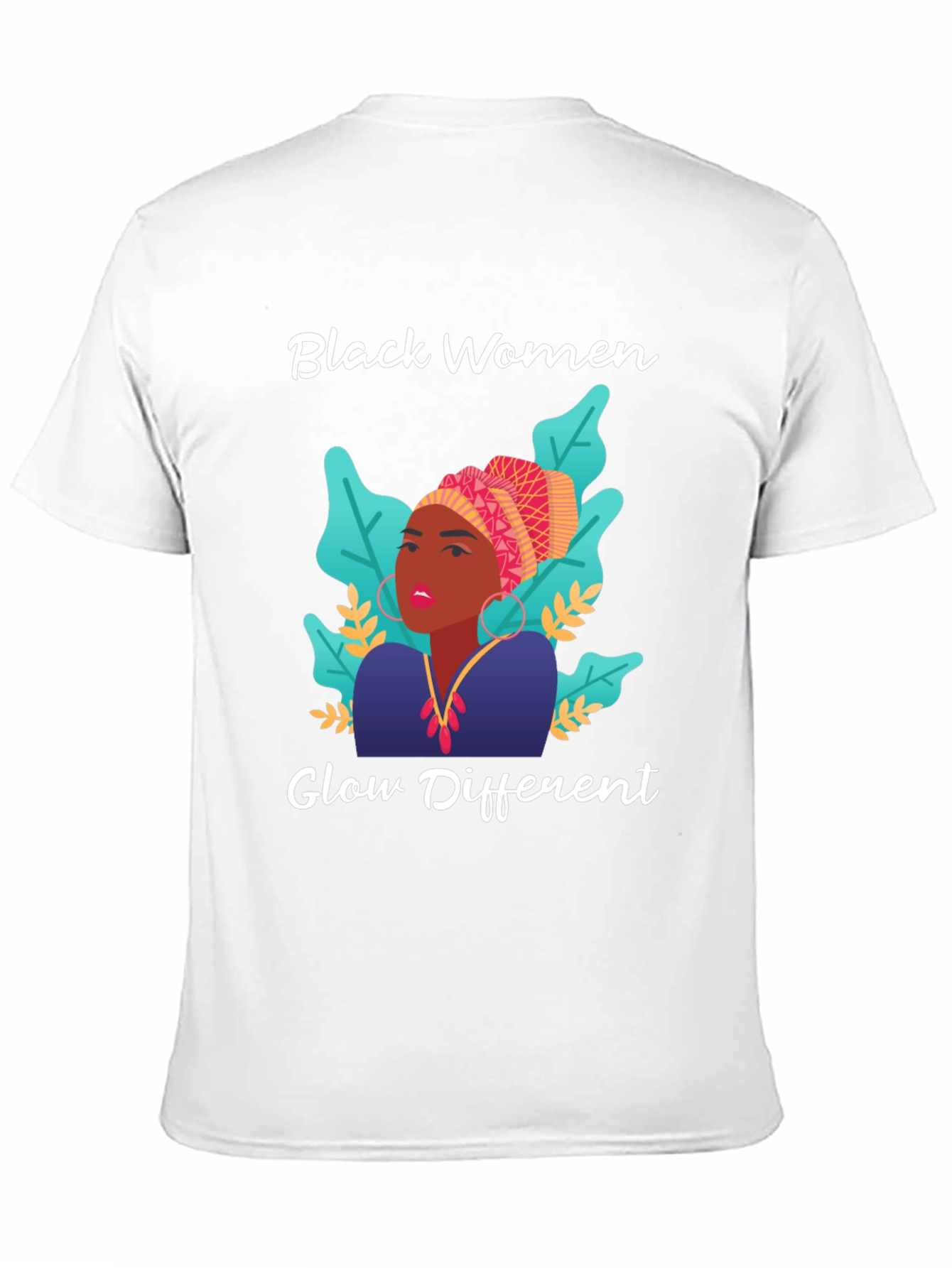 Luce esta camiseta negra con un diseño único que celebra la belleza de las mujeres negras. Con la frase "Black Women Glow Different", esta prenda destaca por su ilustración vibrante de una mujer con un turbante colorido, rodeada de hojas y detalles dorados. Perfecta para expresar tu orgullo y estilo, esta camiseta es ideal para combinar con cualquier atuendo casual. Fabricada con materiales suaves y cómodos, te asegura un ajuste perfecto y durabilidad. ¡Deja que tu luz brille con esta prenda exclusiva!