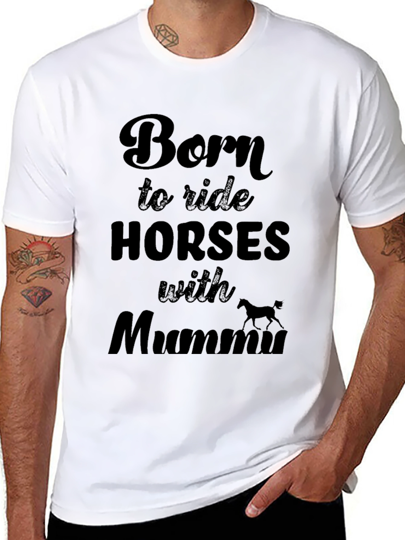 Esta camiseta negra presenta un diseño llamativo para los amantes de los caballos. Muestra el texto "Born to ride HORSES with Mummu" en una fuente estilizada. La camiseta parece ser de un material suave y cómodo, ideal para usarla en salidas casuales, eventos ecuestres o simplemente para expresar tu pasión por los caballos y el cariño por tu mamá. El diseño es simple pero efectivo, perfecto para cualquier persona que ame montar a caballo. Luce tu amor por los caballos con estilo y comodidad.