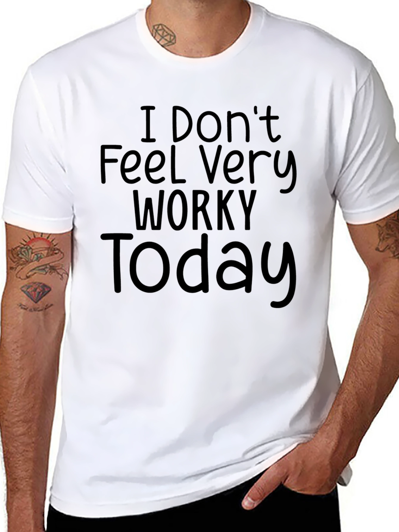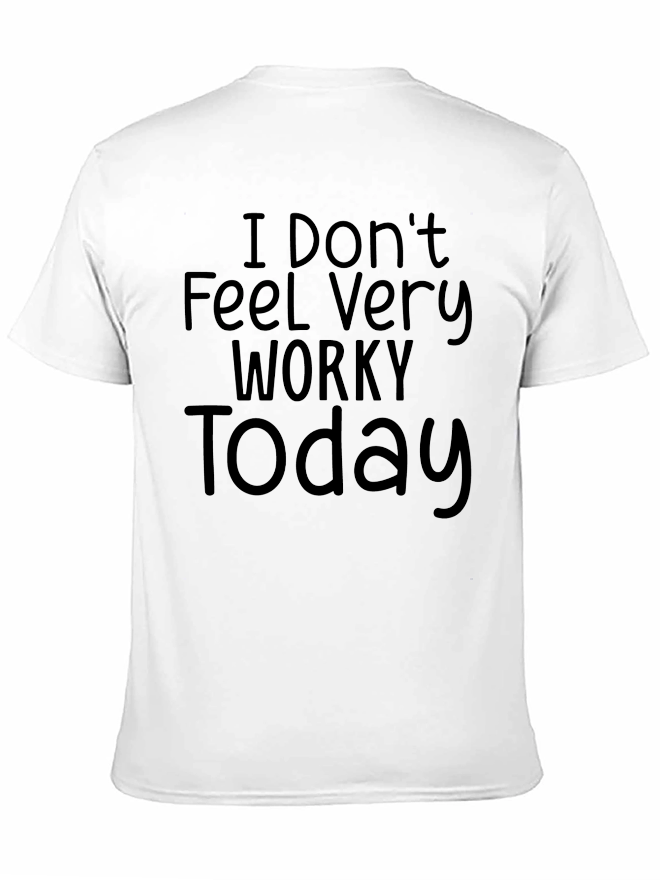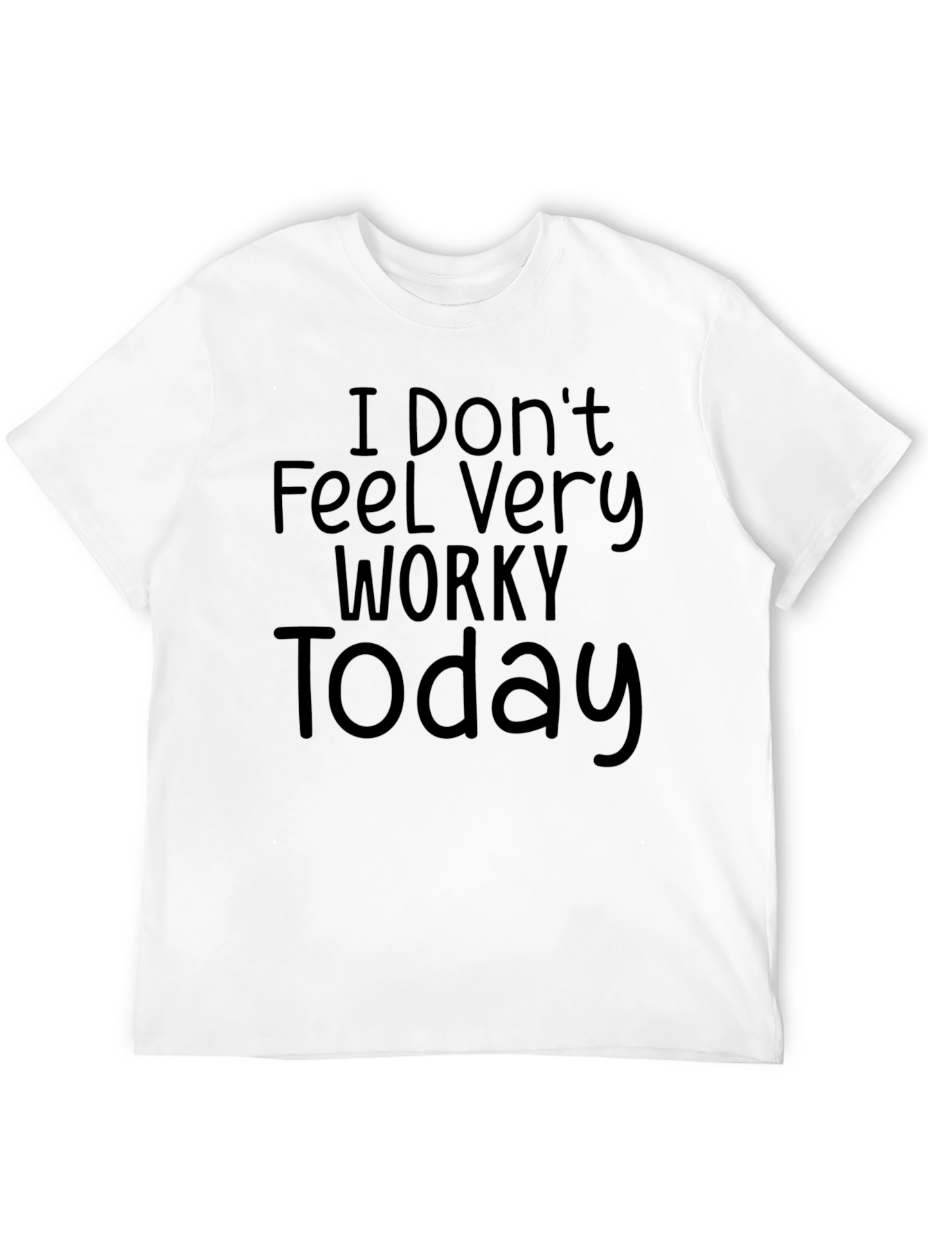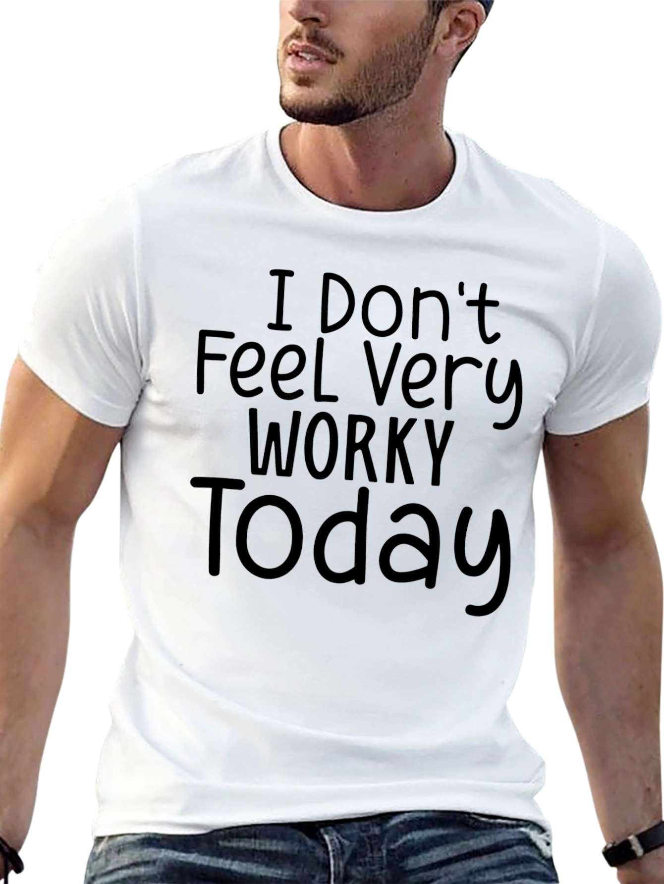 Esta camiseta negra de manga corta presenta un diseño divertido y relajado con el texto "I Don't Feel Very WORKY Today" impreso en el frente. Perfecta para esos días en los que prefieres relajarte y tomarte las cosas con calma. El color negro sólido la hace versátil y fácil de combinar con cualquier atuendo casual. Ideal para llevar en casa, salir con amigos o simplemente disfrutar de un día libre con estilo. Su corte clásico asegura comodidad y libertad de movimiento. Esta camiseta es una excelente opción para expresar tu estado de ánimo de manera original y divertida.