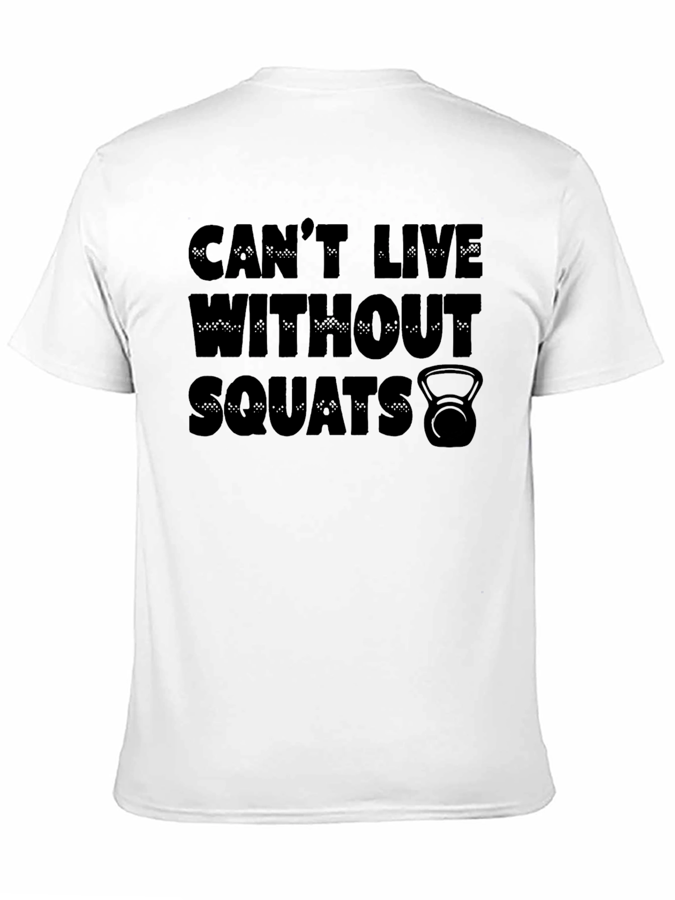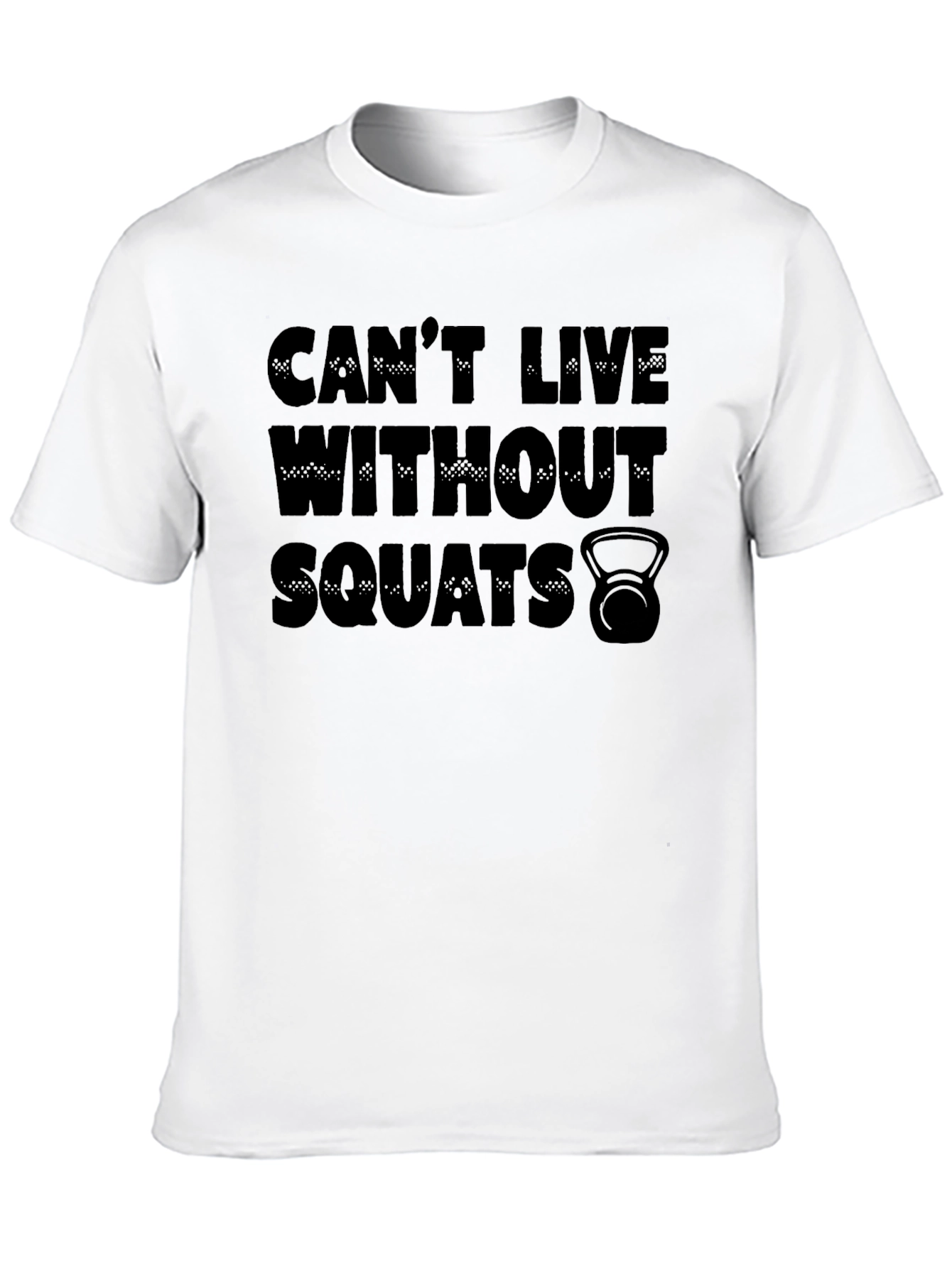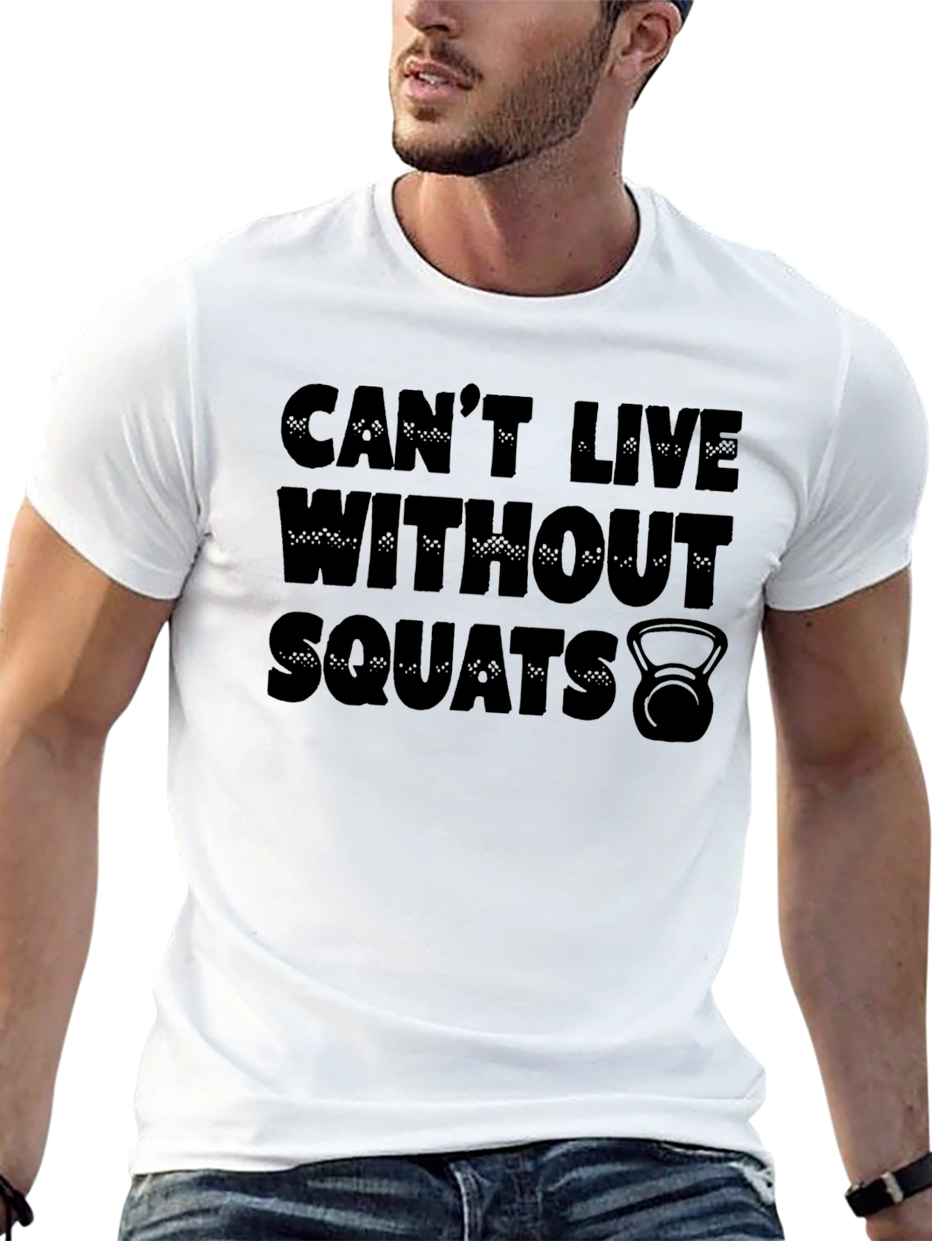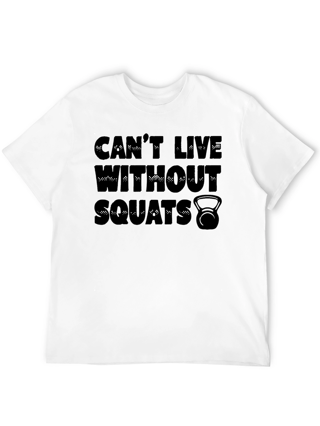 Luce tu pasión por el fitness con esta camiseta negra de corte clásico. Fabricada en un tejido que parece de algodón suave y cómodo, esta camiseta presenta un diseño llamativo con la frase "CAN'T LIVE WITHOUT SQUATS" estampada en letras grandes y negritas, junto con el dibujo de una pesa rusa. Perfecta para llevar al gimnasio, para tus entrenamientos de pierna o simplemente para mostrar tu amor por el levantamiento de pesas en tu día a día. Su estilo sencillo la hace versátil para combinar con cualquier atuendo casual. ¡Una prenda imprescindible para los amantes del fitness!