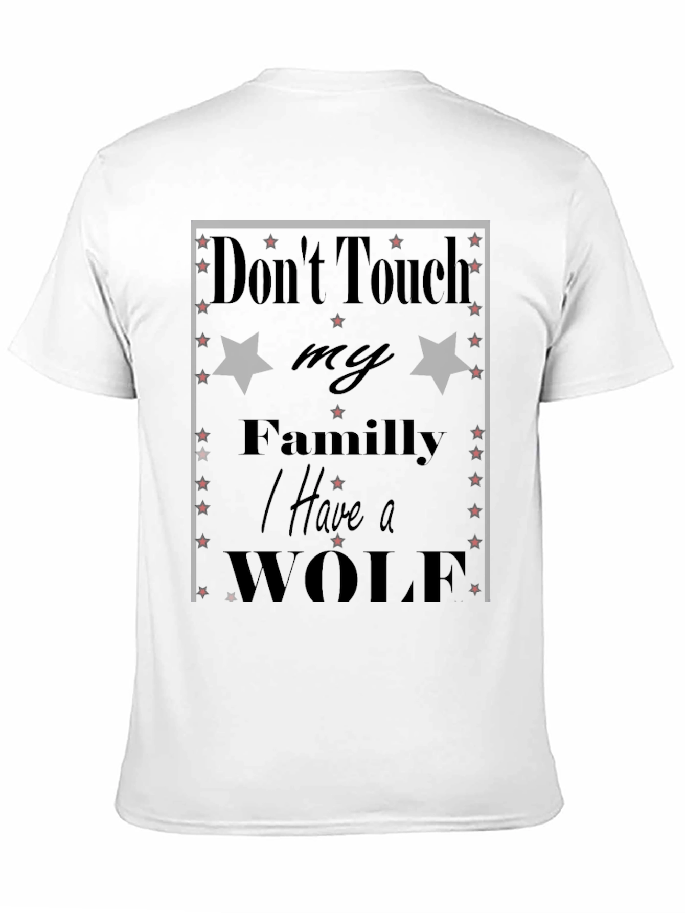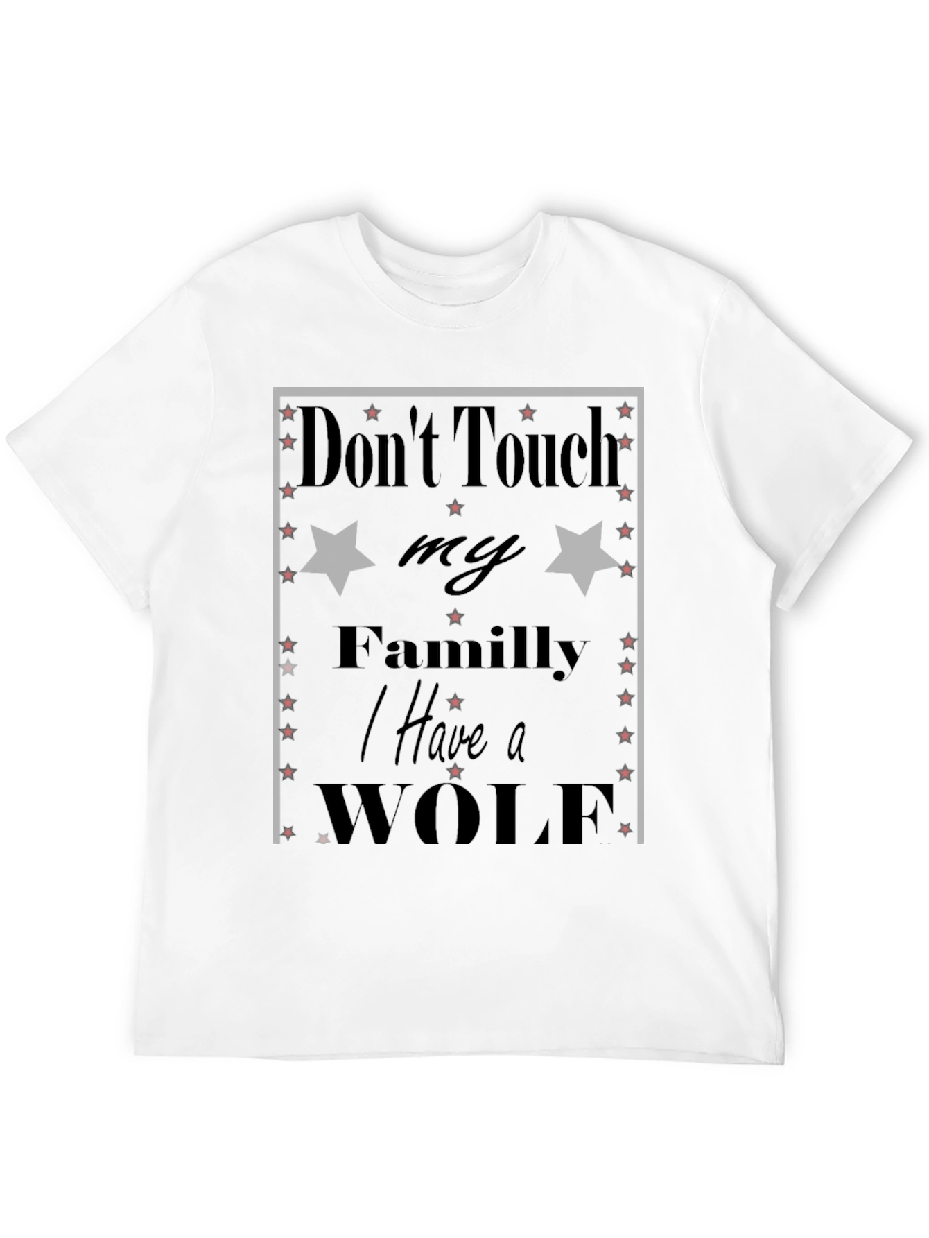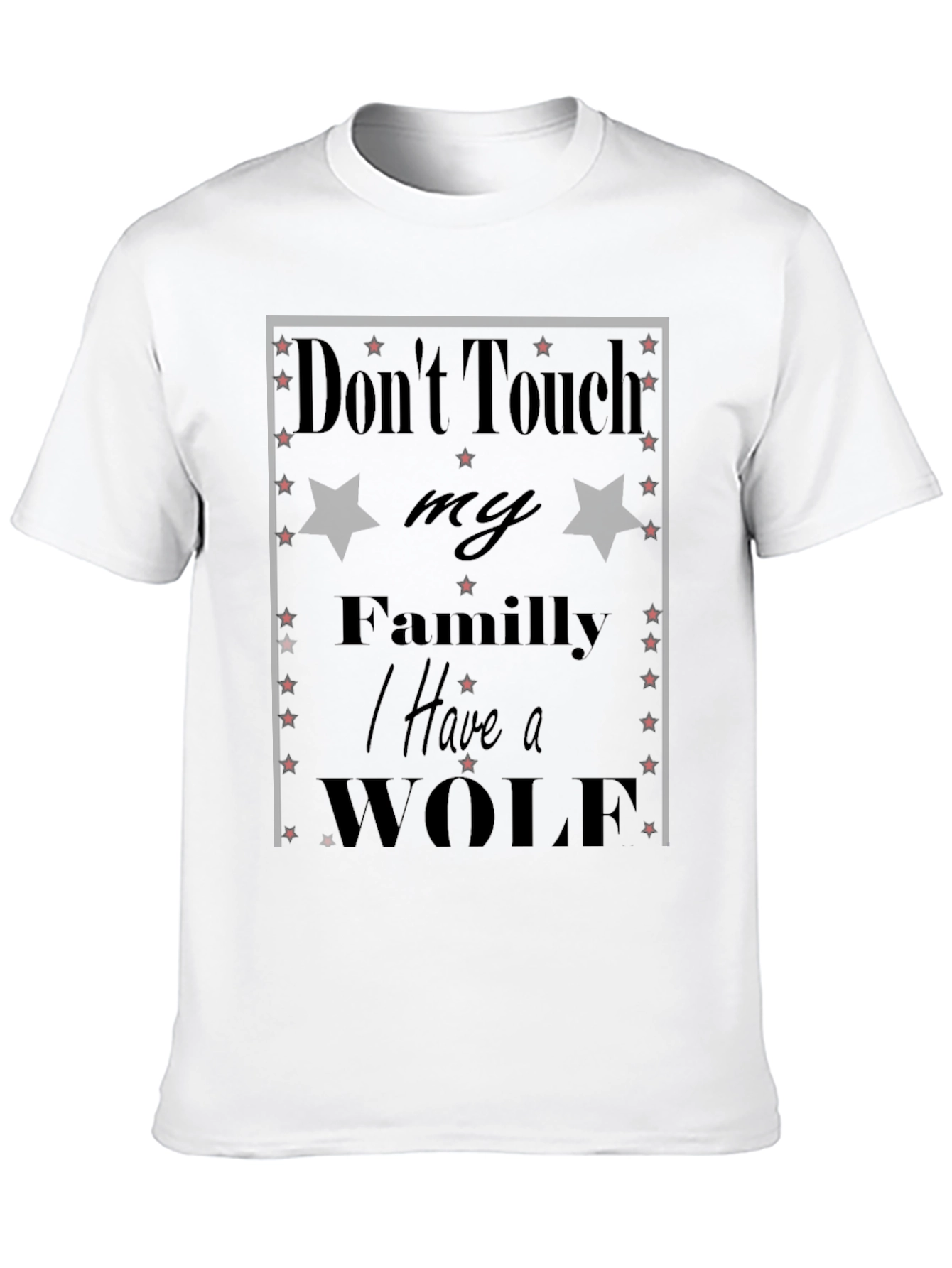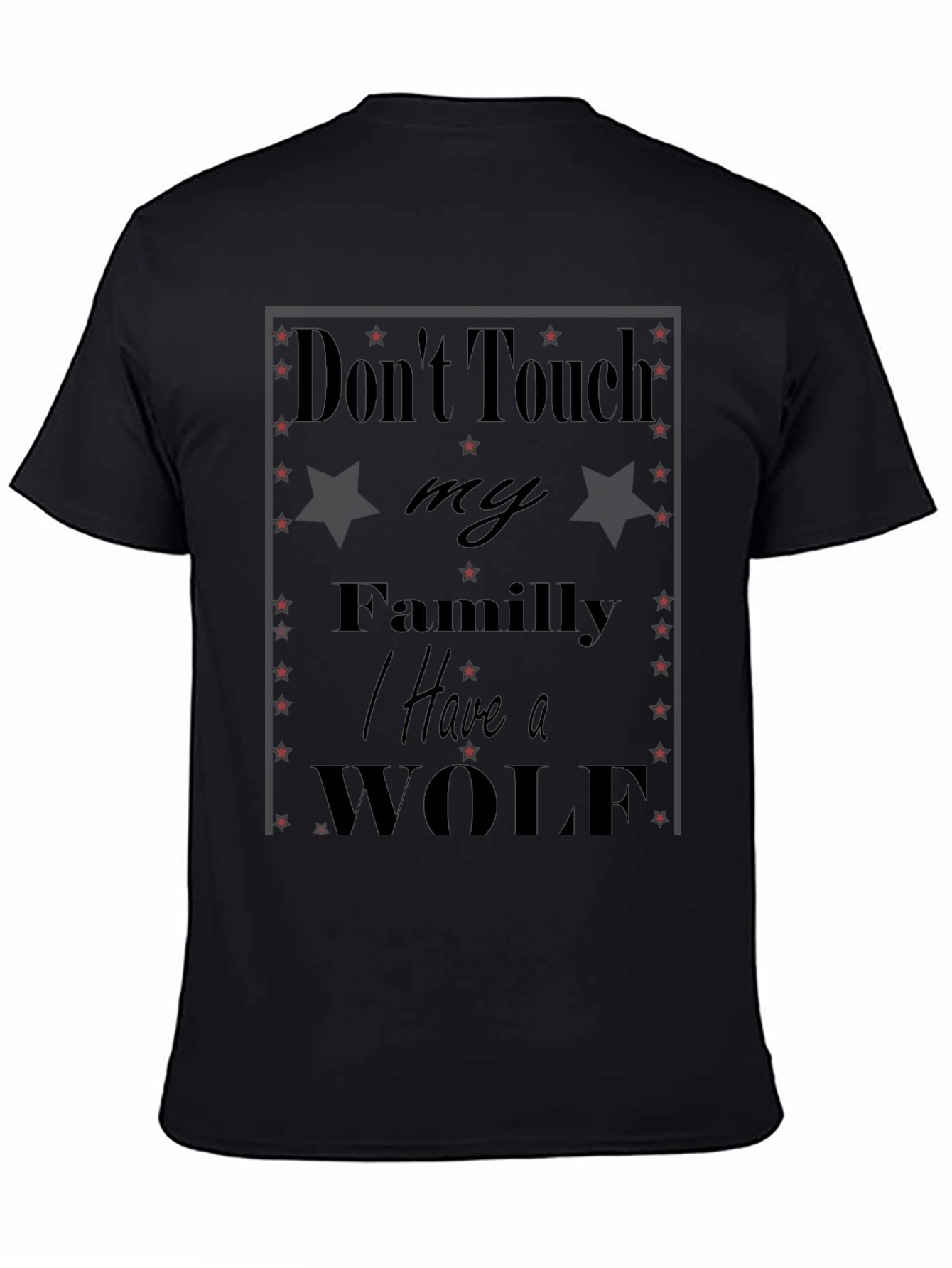 Esta camiseta negra presenta un diseño audaz y llamativo con el texto "Don't Touch my Family I Have a WOLF". El diseño incorpora estrellas rojas y estrellas negras. Es una prenda perfecta para expresar tu fuerte sentido de protección hacia tu familia. Fabricada con materiales suaves y cómodos, esta camiseta es ideal para uso diario y destaca por su estilo único y mensaje contundente. Combínala con jeans, pantalones casuales o shorts para un look relajado pero con actitud. Perfecta para quienes buscan una prenda original y con significado.