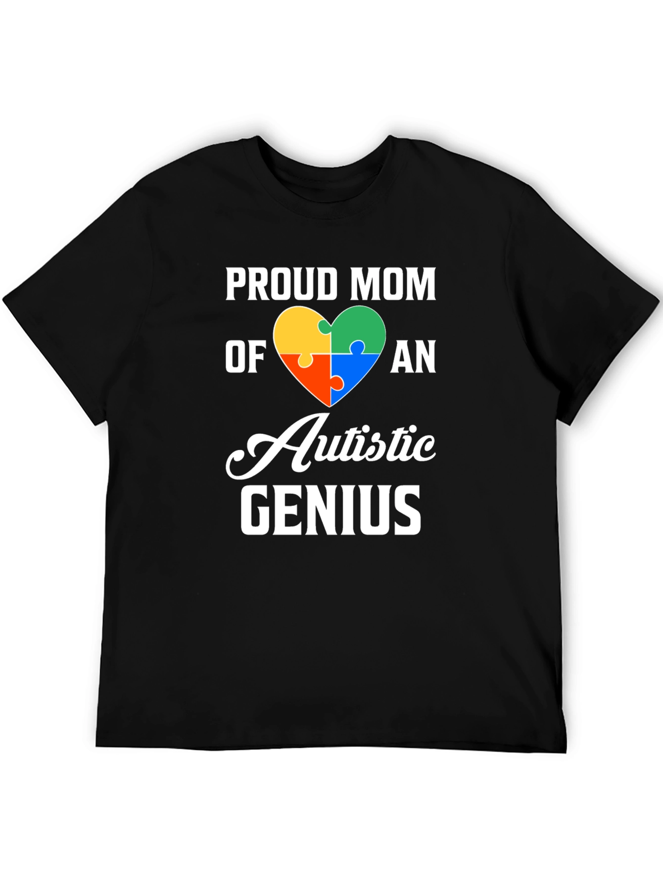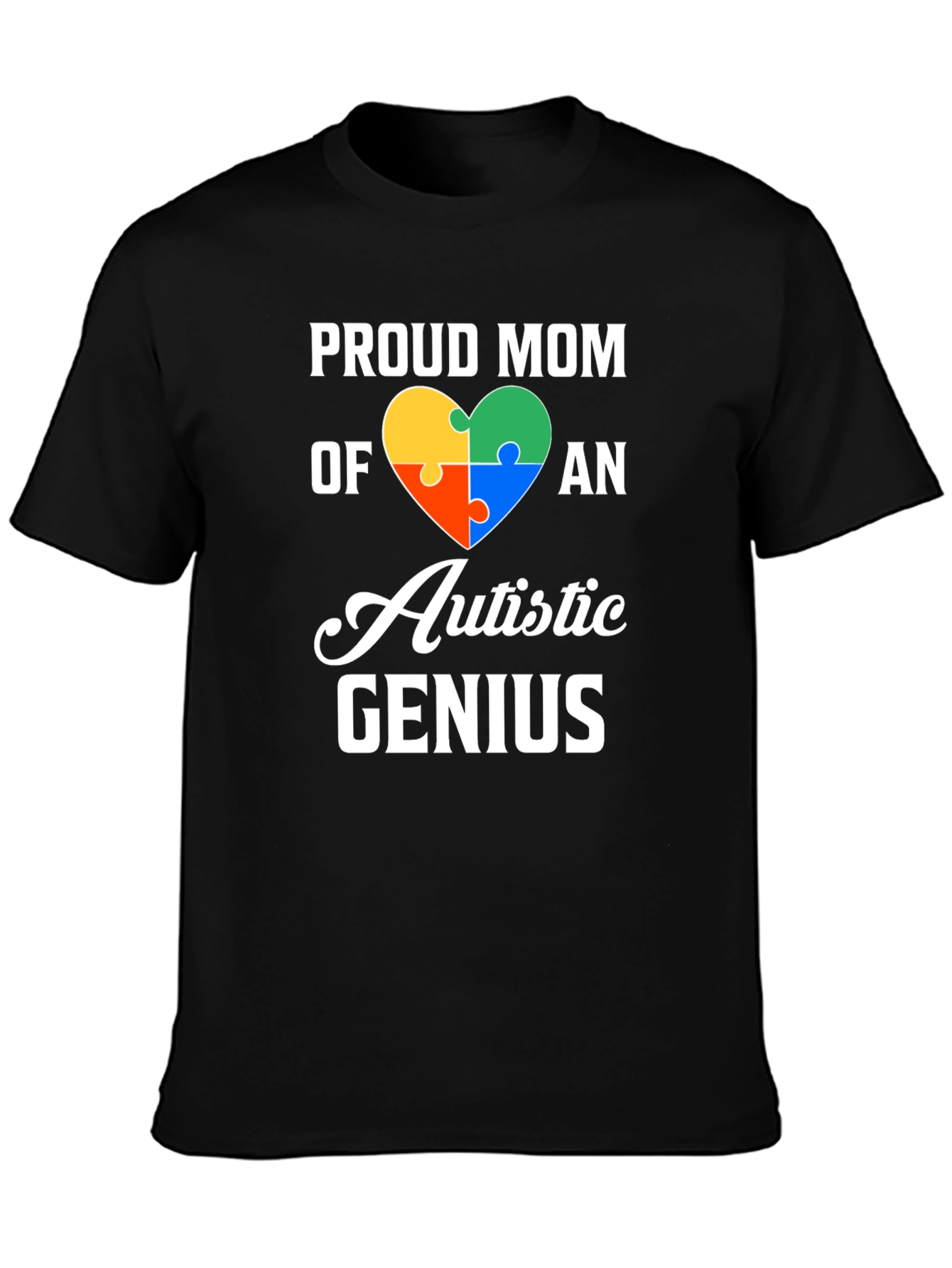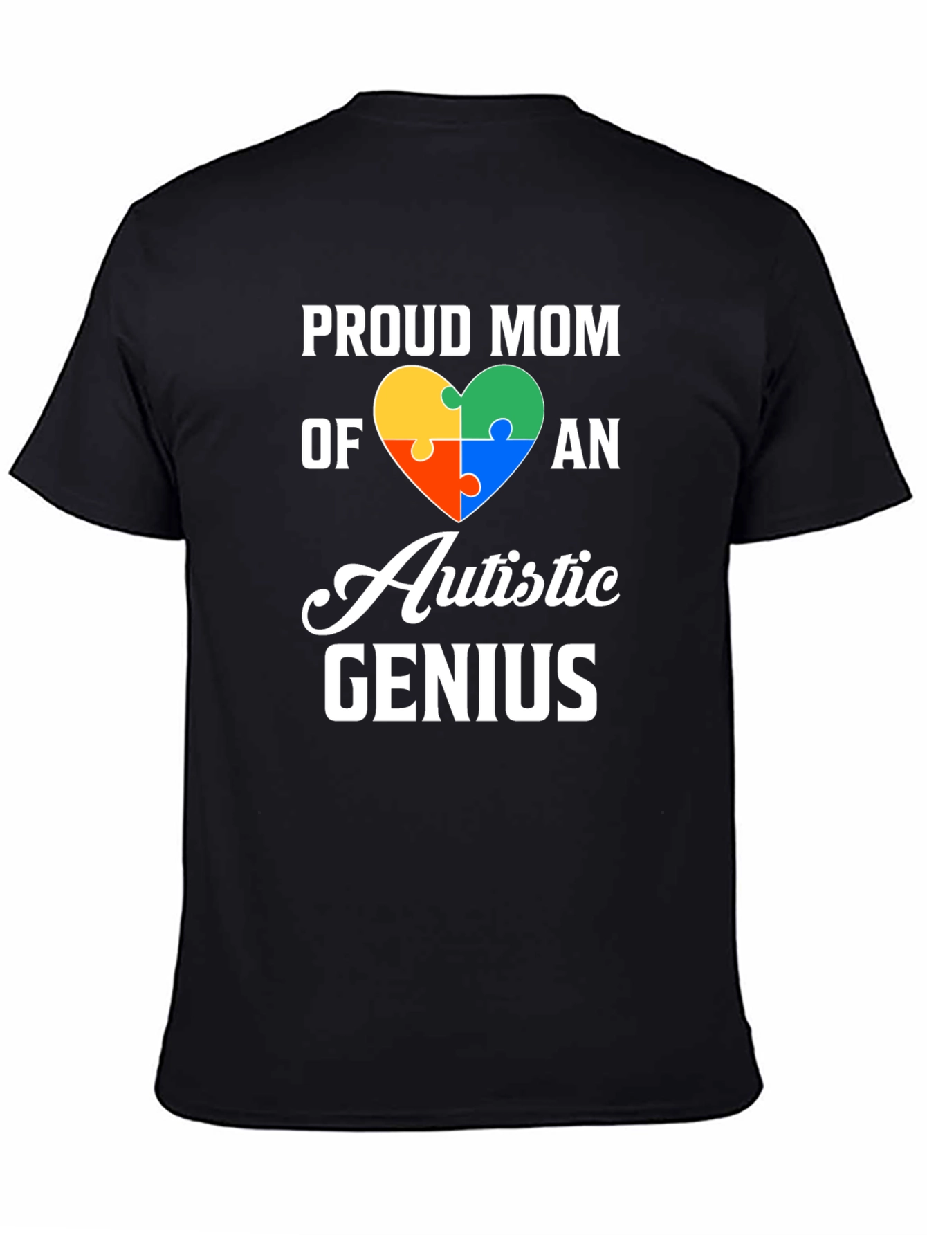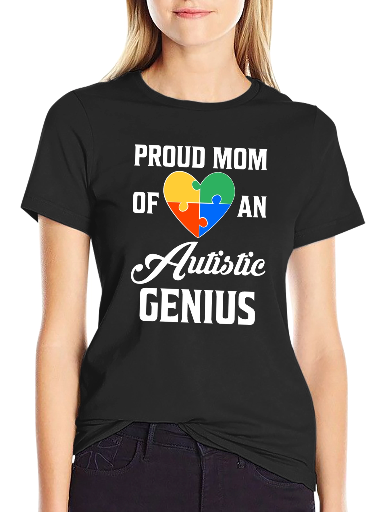 Muestre su apoyo y orgullo con esta camiseta negra de manga corta. Presenta un diseño llamativo con el texto "PROUD MOM OF AN Autistic GENIUS", decorado con un corazón de rompecabezas en colores vibrantes. Ideal para usar en eventos de concientización sobre el autismo, reuniones familiares o simplemente para expresar su amor y admiración por su hijo o hija. Confeccionada con materiales cómodos y duraderos, esta camiseta es perfecta para el uso diario. Una declaración poderosa de amor y aceptación.