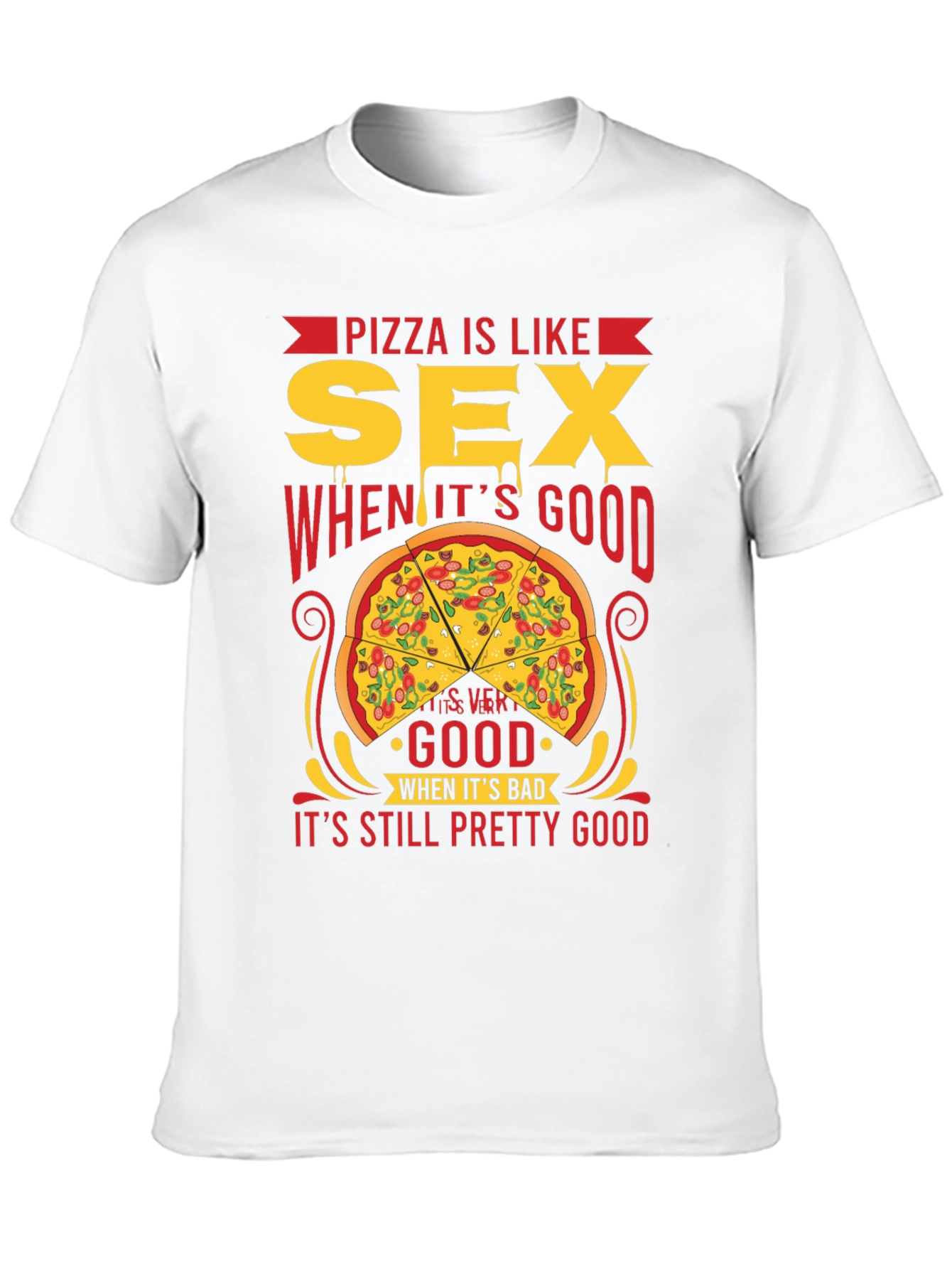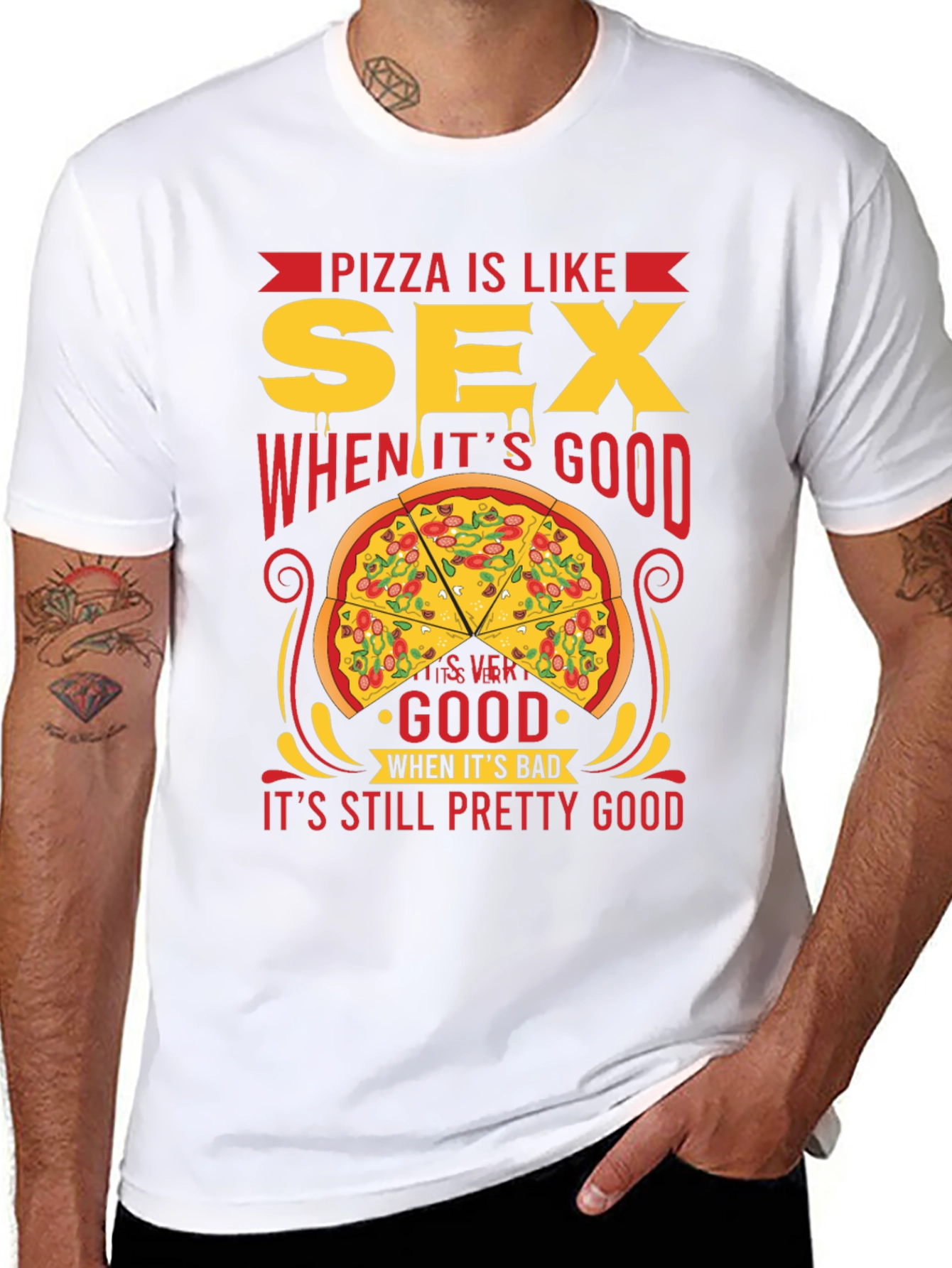 Luce esta divertida camiseta negra con un diseño llamativo. La frase "Pizza es como Sexo" destaca en colores amarillo y rojo, acompañada de una ilustración de una pizza. Ideal para los amantes de la pizza y el humor. Perfecta para usar en salidas casuales, reuniones con amigos o simplemente para expresar tu pasión por la buena comida. El diseño original seguro llamará la atención y provocará sonrisas. Fabricada con materiales cómodos y duraderos, esta camiseta es una excelente adición a tu guardarropa. ¡Muestra tu estilo único con esta prenda original!