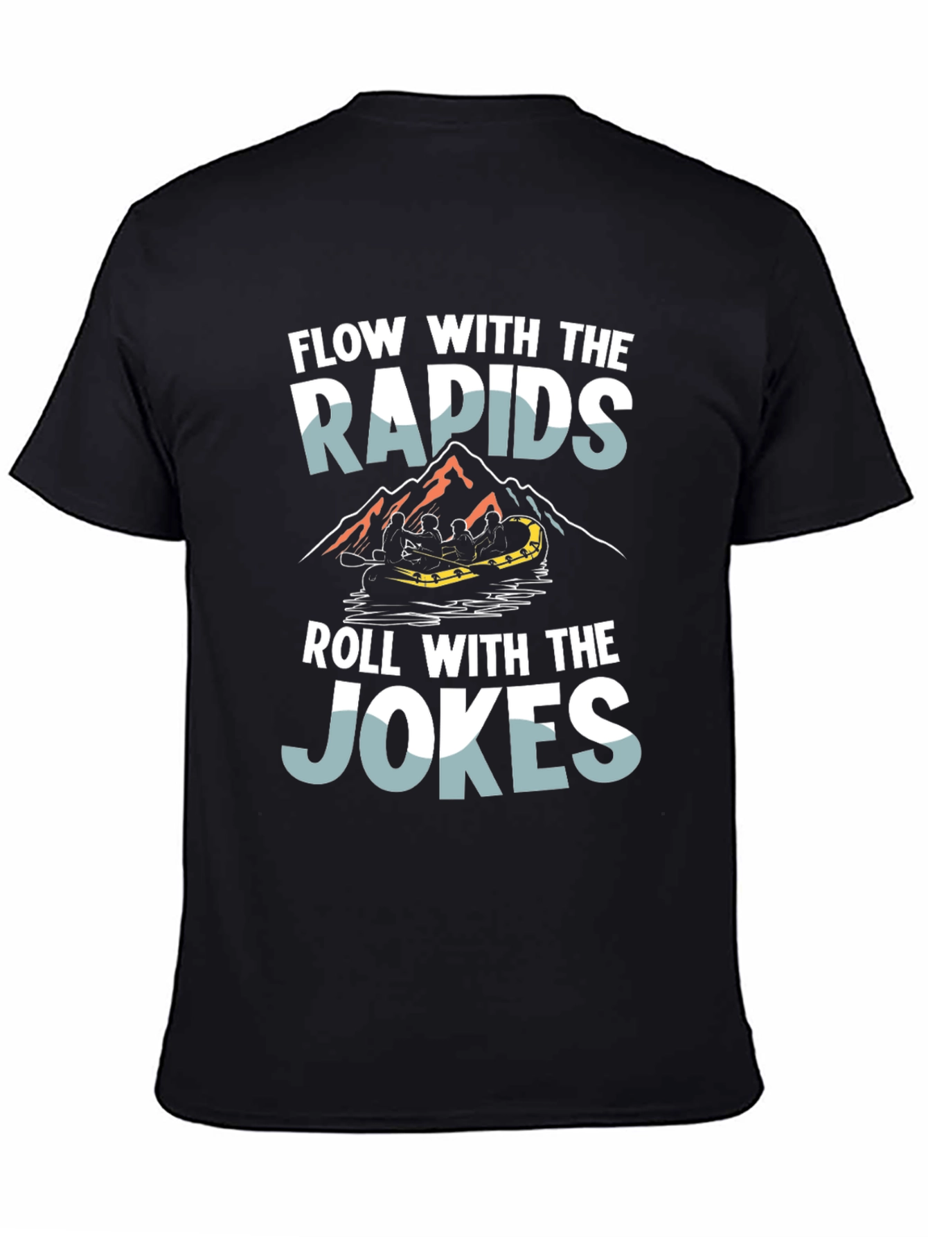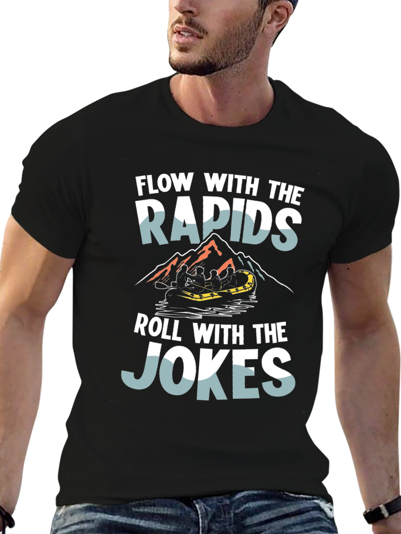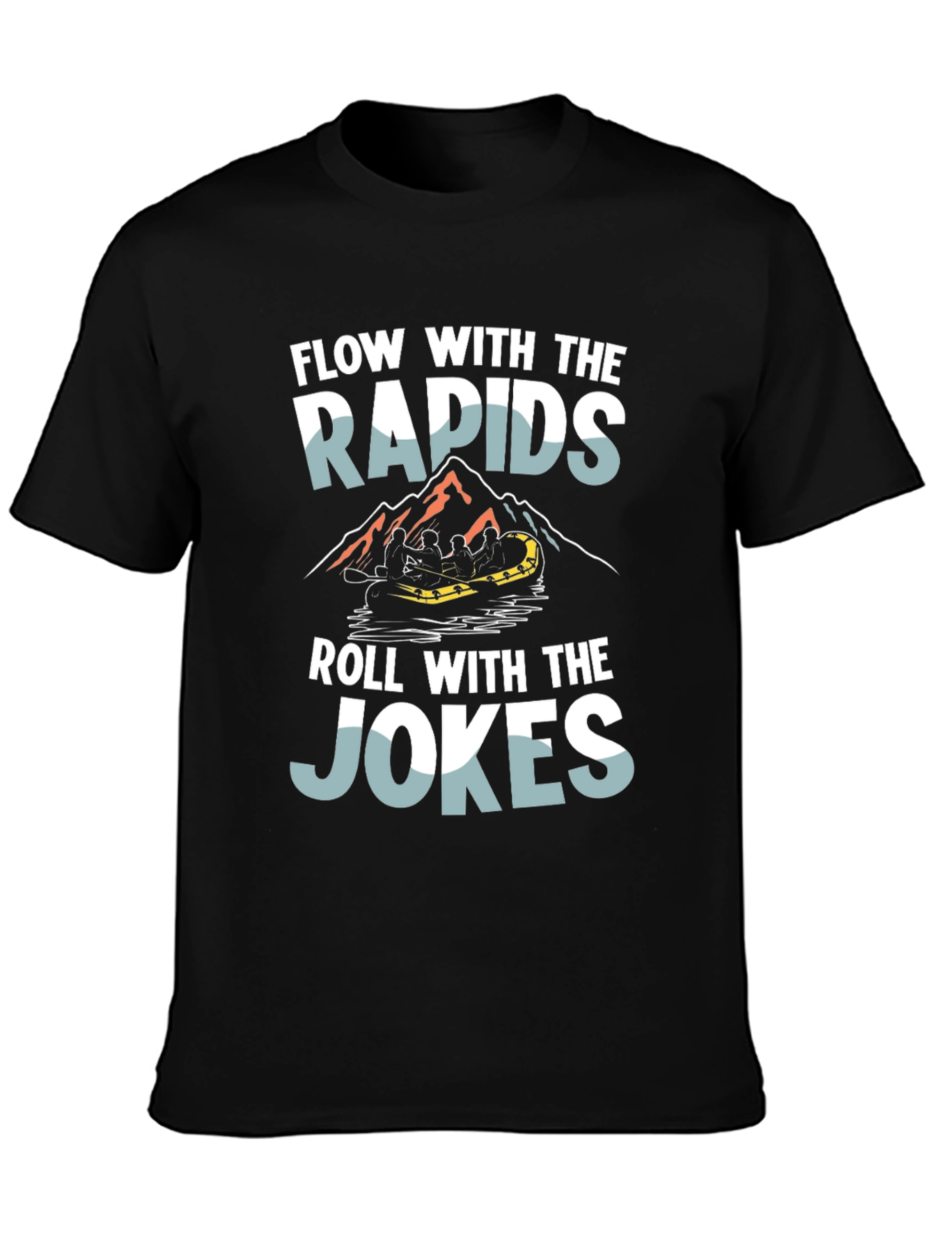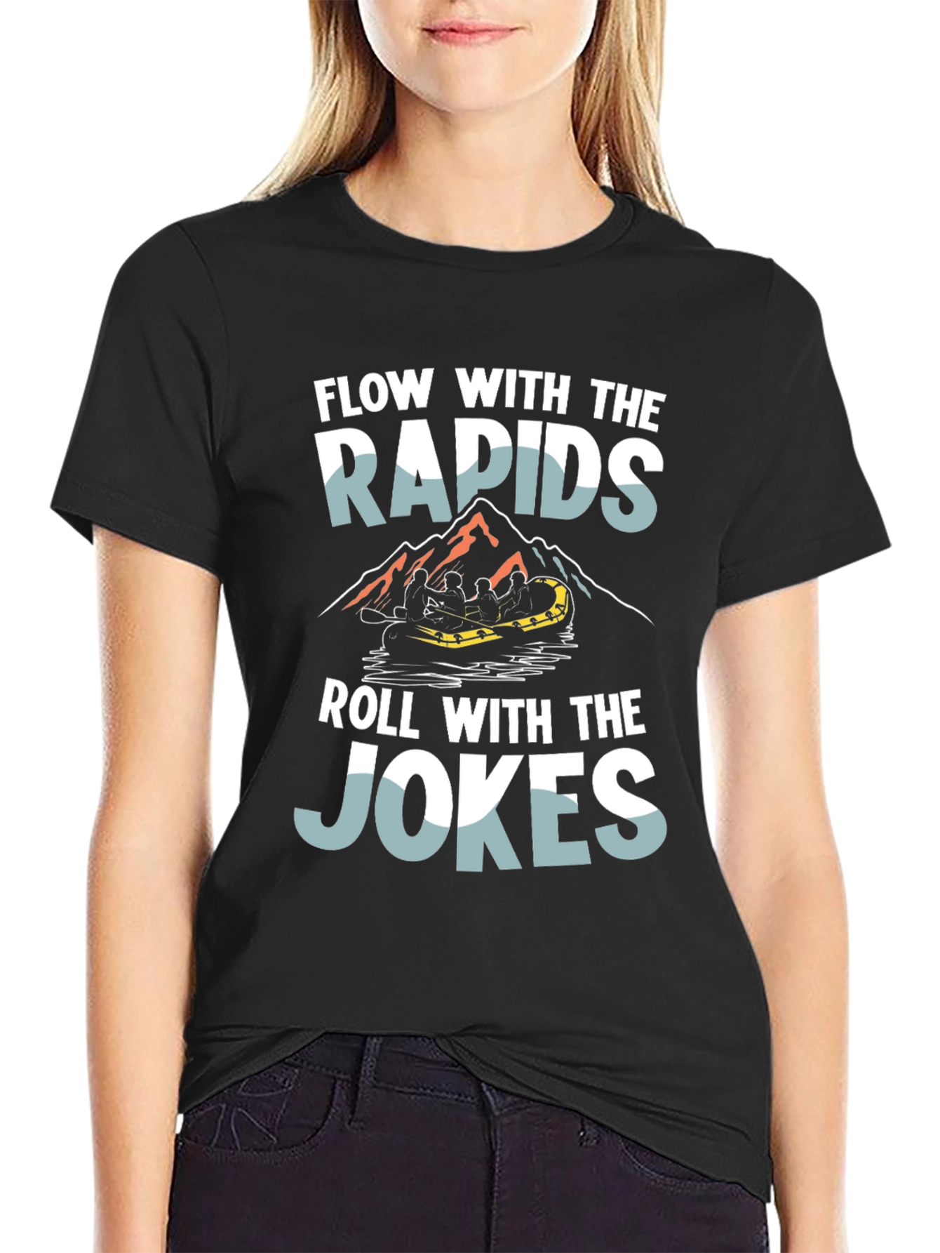 Esta camiseta negra presenta un diseño divertido y original. Con la frase "Flow with the Rapids, Roll with the Jokes" (Fluye con los rápidos, rueda con los chistes), la camiseta evoca una actitud relajada y aventurera. El diseño incluye una ilustración de una balsa navegando en rápidos con un fondo montañoso. Ideal para los amantes de la naturaleza, los deportes de aventura y aquellos con un gran sentido del humor. Perfecta para usar en salidas casuales, actividades al aire libre o simplemente para expresar tu personalidad única. ¡Atrévete a lucir esta camiseta y contagia tu buena onda!