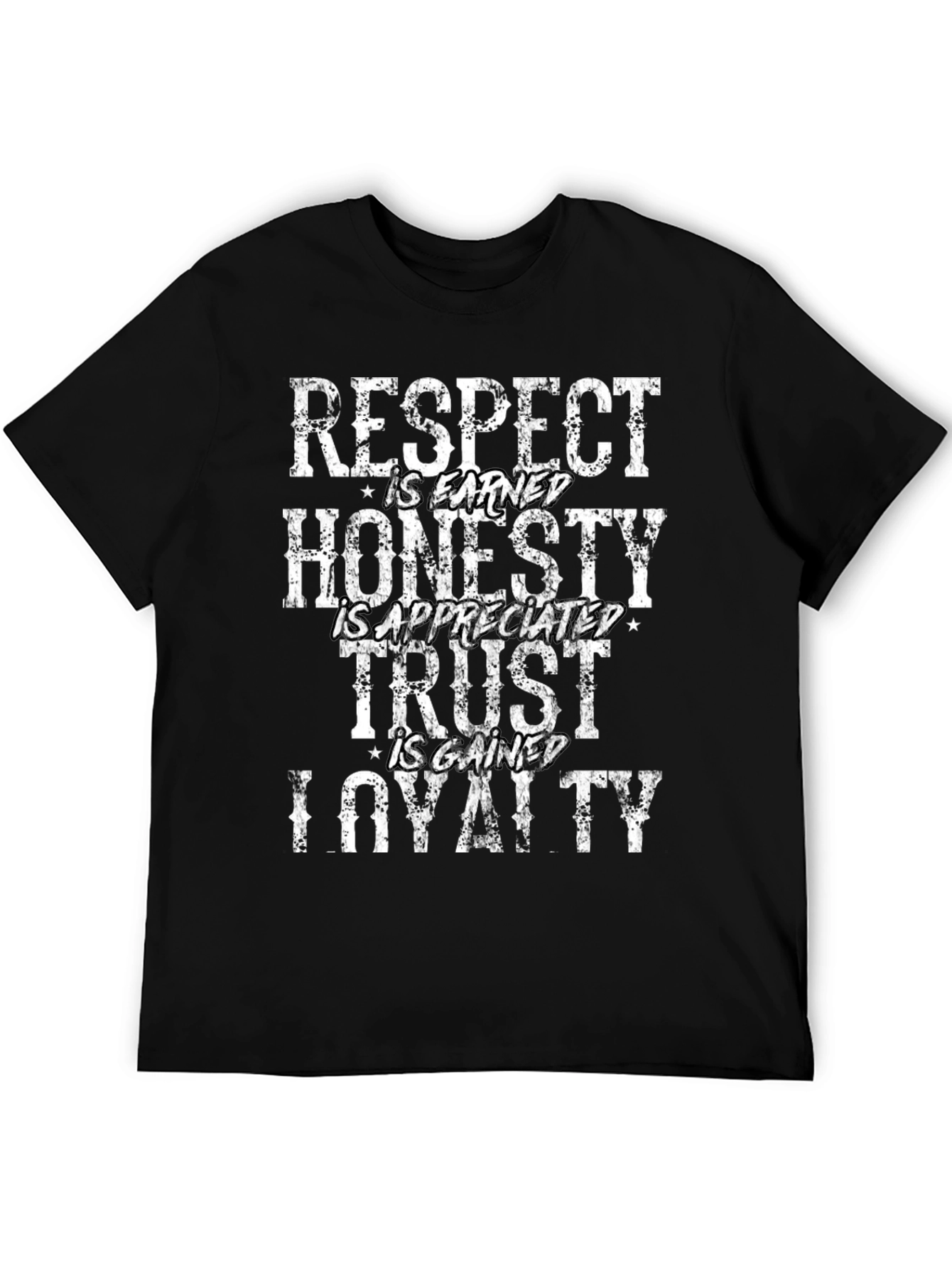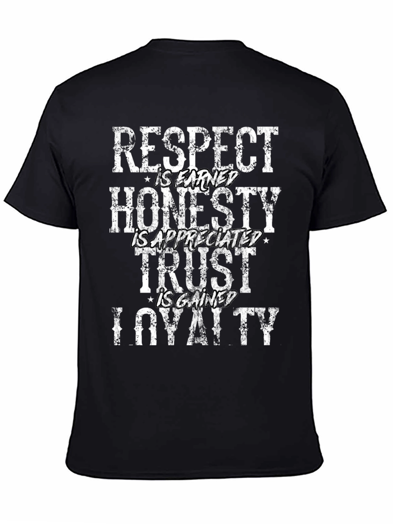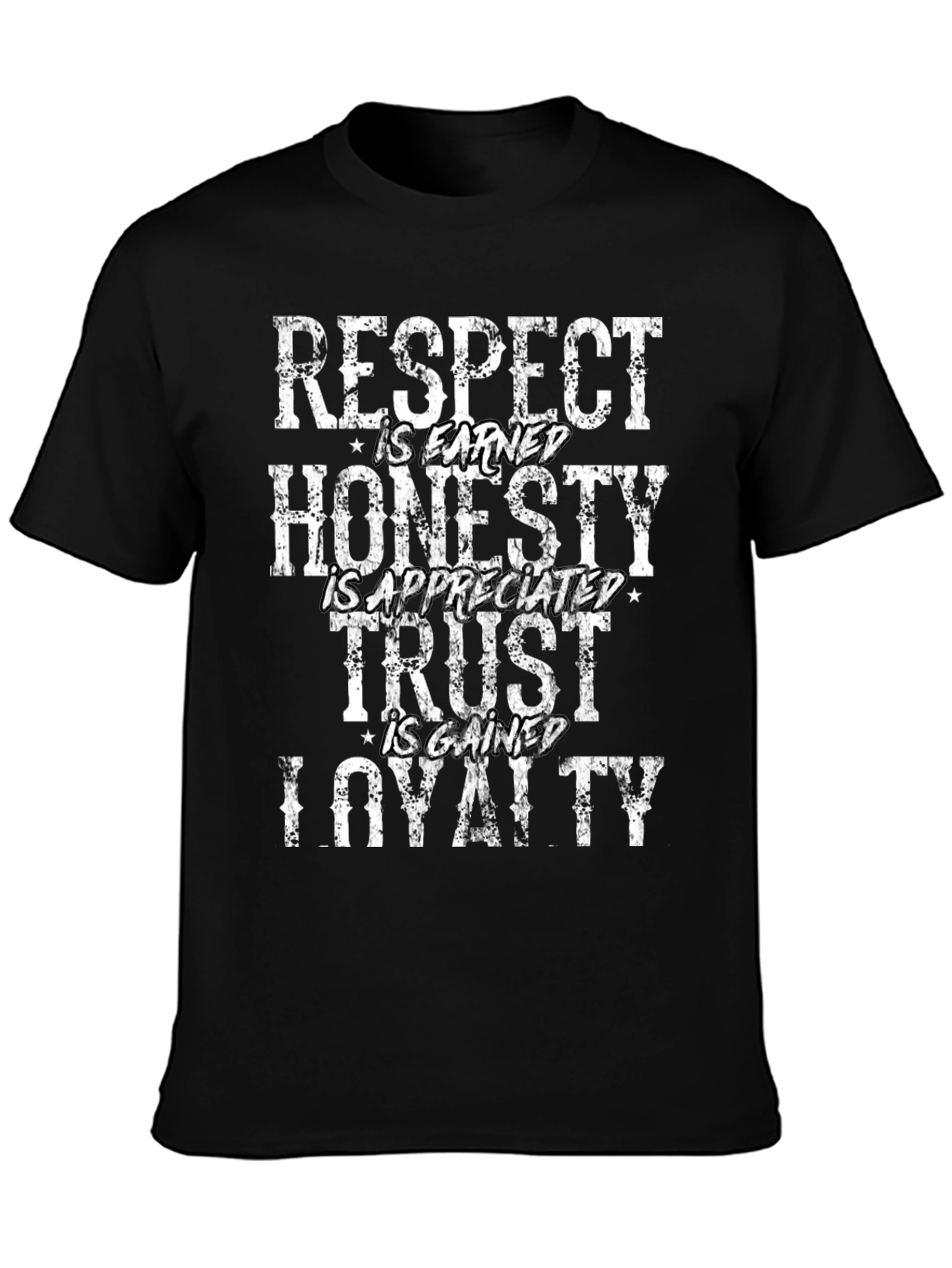Luce esta elegante camiseta negra con un mensaje poderoso. La frase "Respeto es ganado, Honradez es apreciada, Confianza es ganada, Lealtad" está impresa en letras blancas con un efecto desgastado que le da un toque vintage. Perfecta para hombres que valoran estos principios y quieren expresarlos con estilo. Confeccionada en un tejido suave y cómodo, esta camiseta de manga corta es ideal para el uso diario, ya sea para salir con amigos o para un look casual pero con significado. Su diseño simple y directo la hace versátil y fácil de combinar con cualquier outfit. Demuestra tu carácter con esta prenda única.