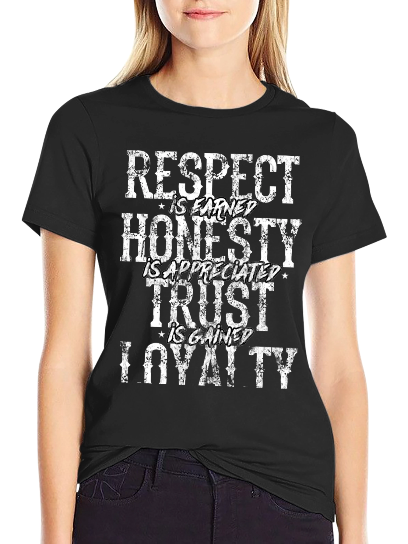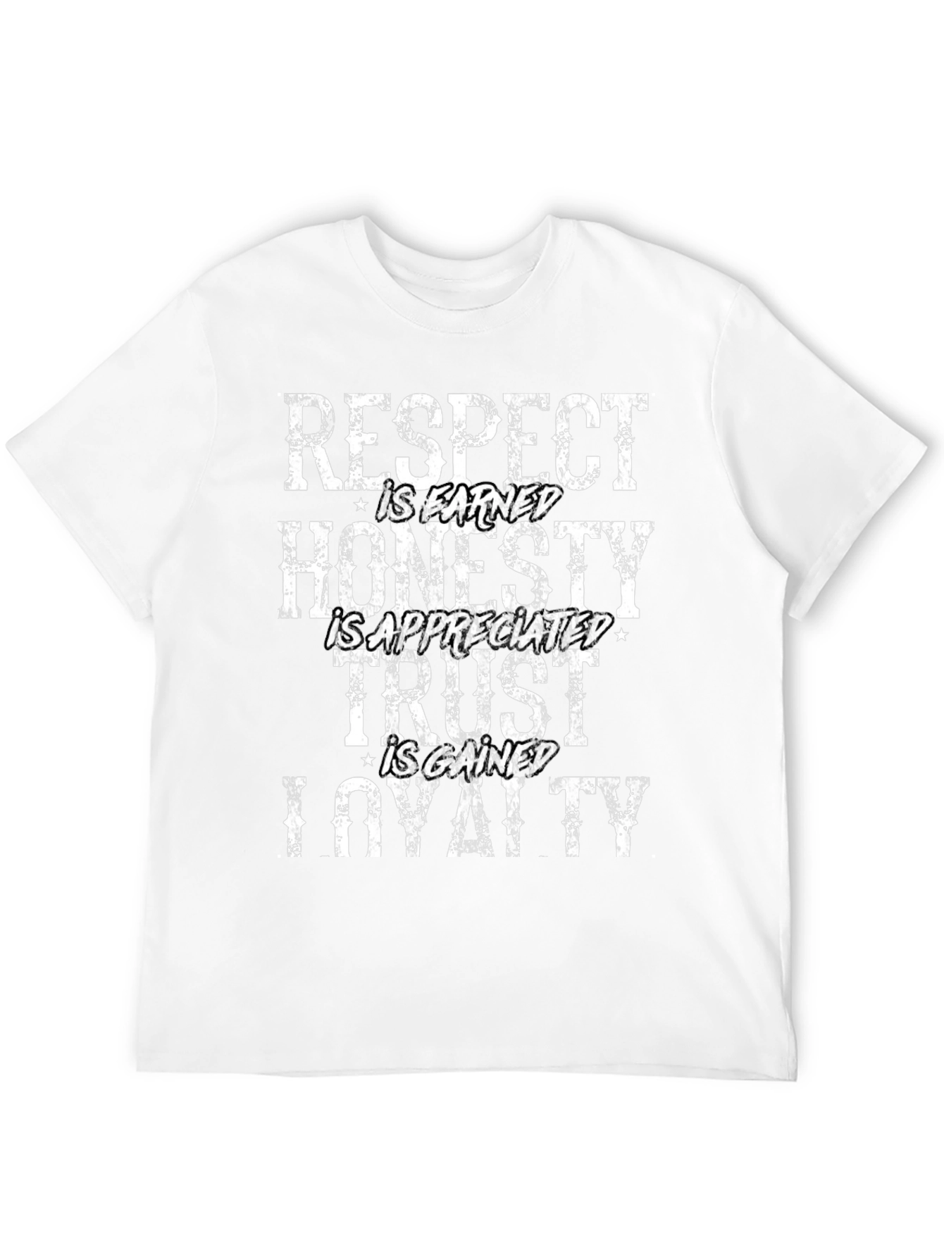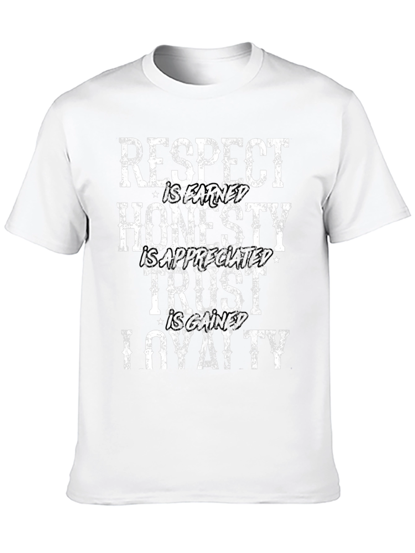 Luce esta elegante camiseta negra con un mensaje poderoso. La frase "Respeto es ganado, Honradez es apreciada, Confianza es ganada, Lealtad" está impresa en letras blancas con un efecto desgastado que le da un toque vintage. Perfecta para hombres que valoran estos principios y quieren expresarlos con estilo. Confeccionada en un tejido suave y cómodo, esta camiseta de manga corta es ideal para el uso diario, ya sea para salir con amigos o para un look casual pero con significado. Su diseño simple y directo la hace versátil y fácil de combinar con cualquier outfit. Demuestra tu carácter con esta prenda única.