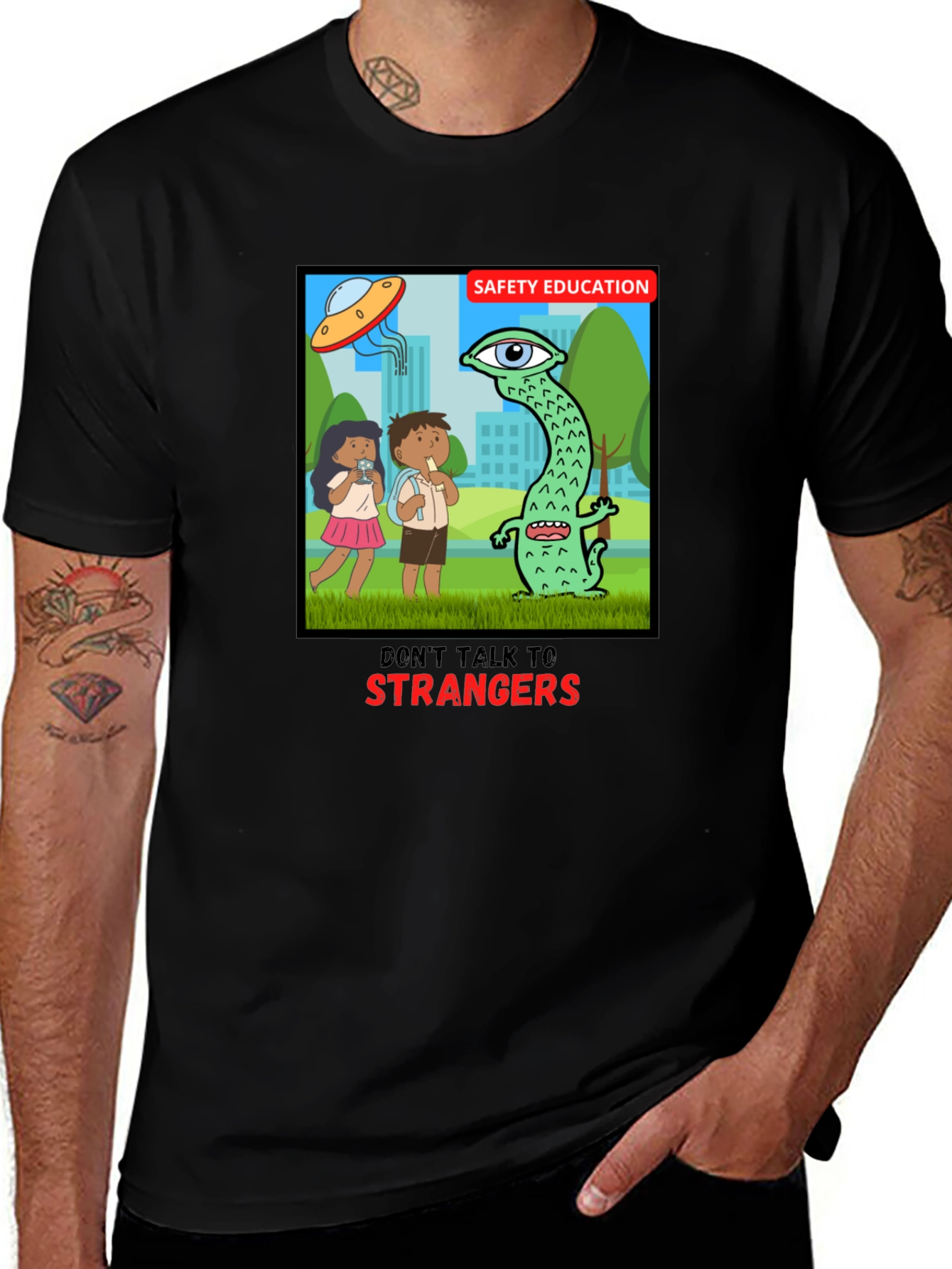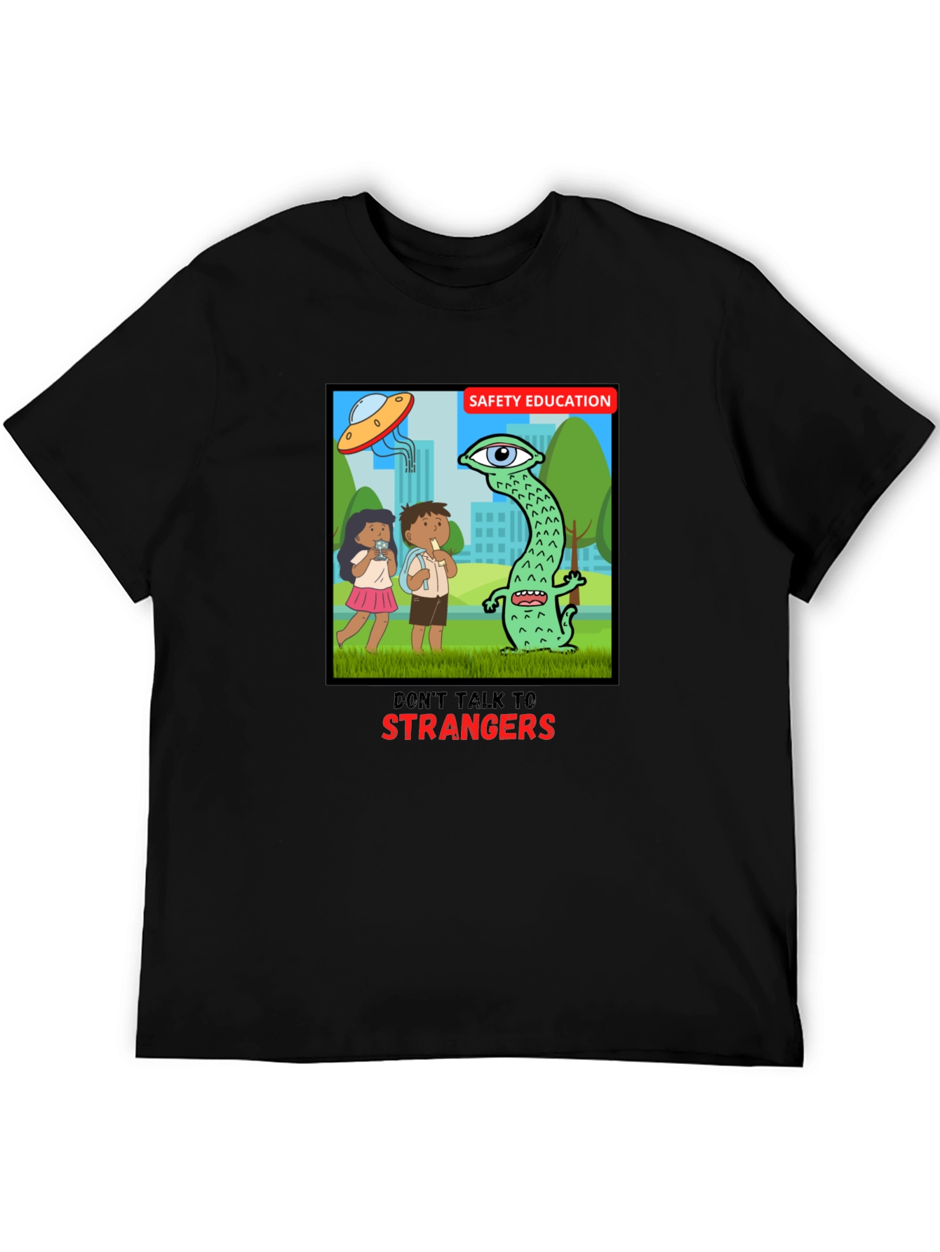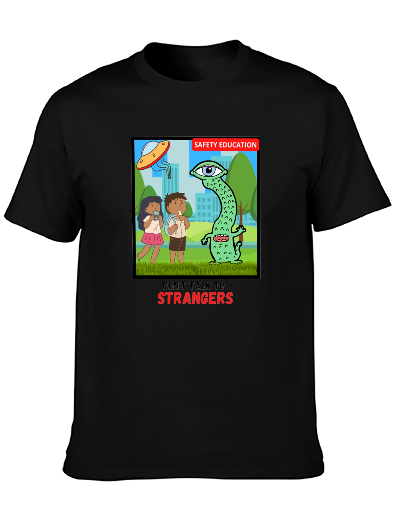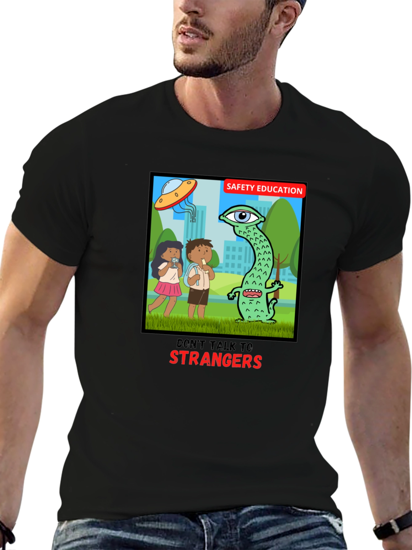 Esta llamativa camiseta negra presenta un diseño educativo y divertido, ideal para concienciar sobre la seguridad infantil. En el centro, se muestra una escena colorida con personajes de dibujos animados: niños, un extraterrestre simpático y un OVNI. El lema "SAFETY EDUCATION" y "DON'T TALK TO STRANGERS" (NO HABLES CON EXTRAÑOS) resaltan en rojo, enfatizando el mensaje clave. Fabricada con materiales suaves y cómodos, esta camiseta es perfecta para el uso diario. Su diseño único y mensaje importante la convierten en una excelente opción para vestir a los más pequeños con estilo y propósito, fomentando la conversación sobre la seguridad en el entorno. ¡Una prenda ideal para padres conscientes!