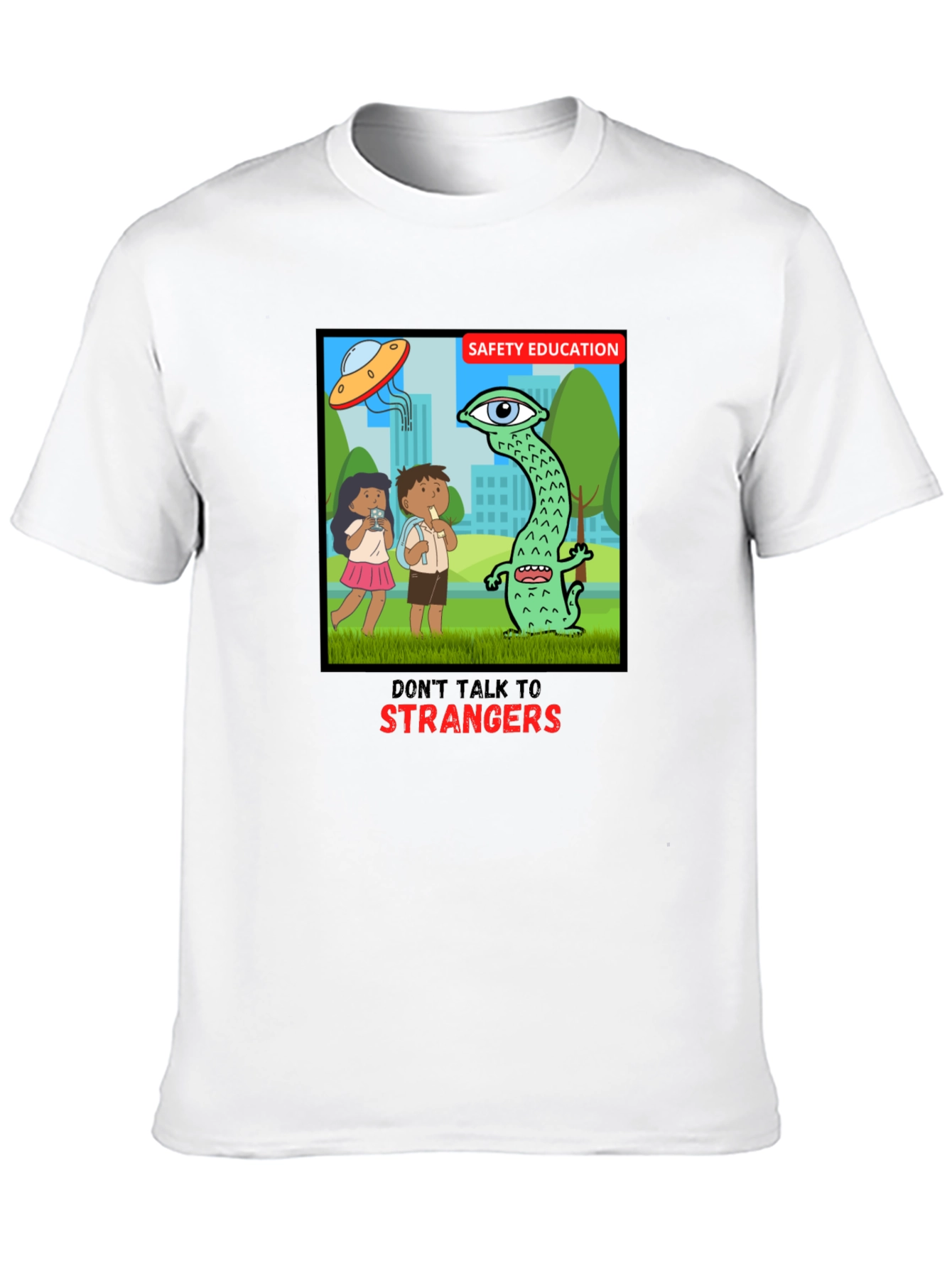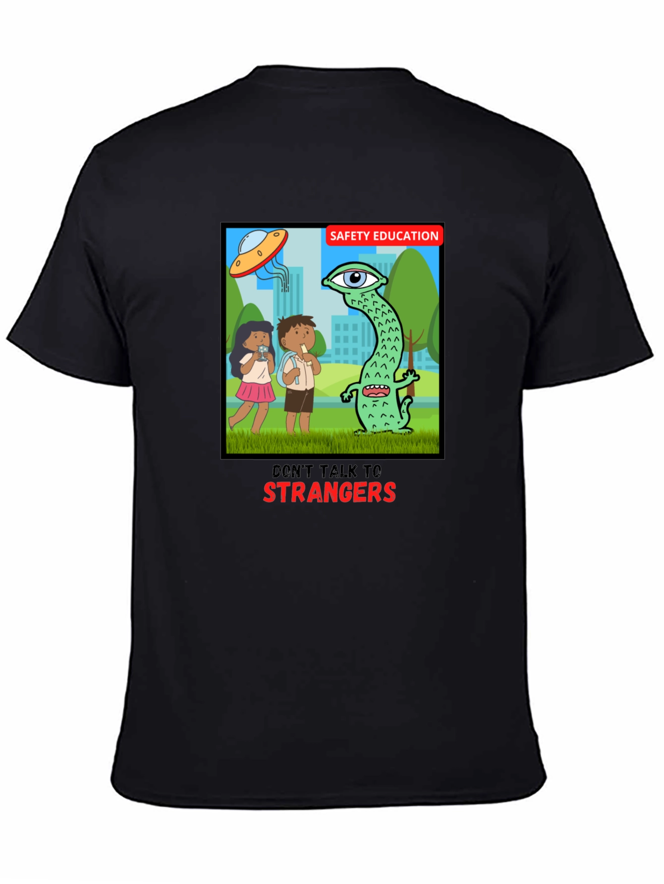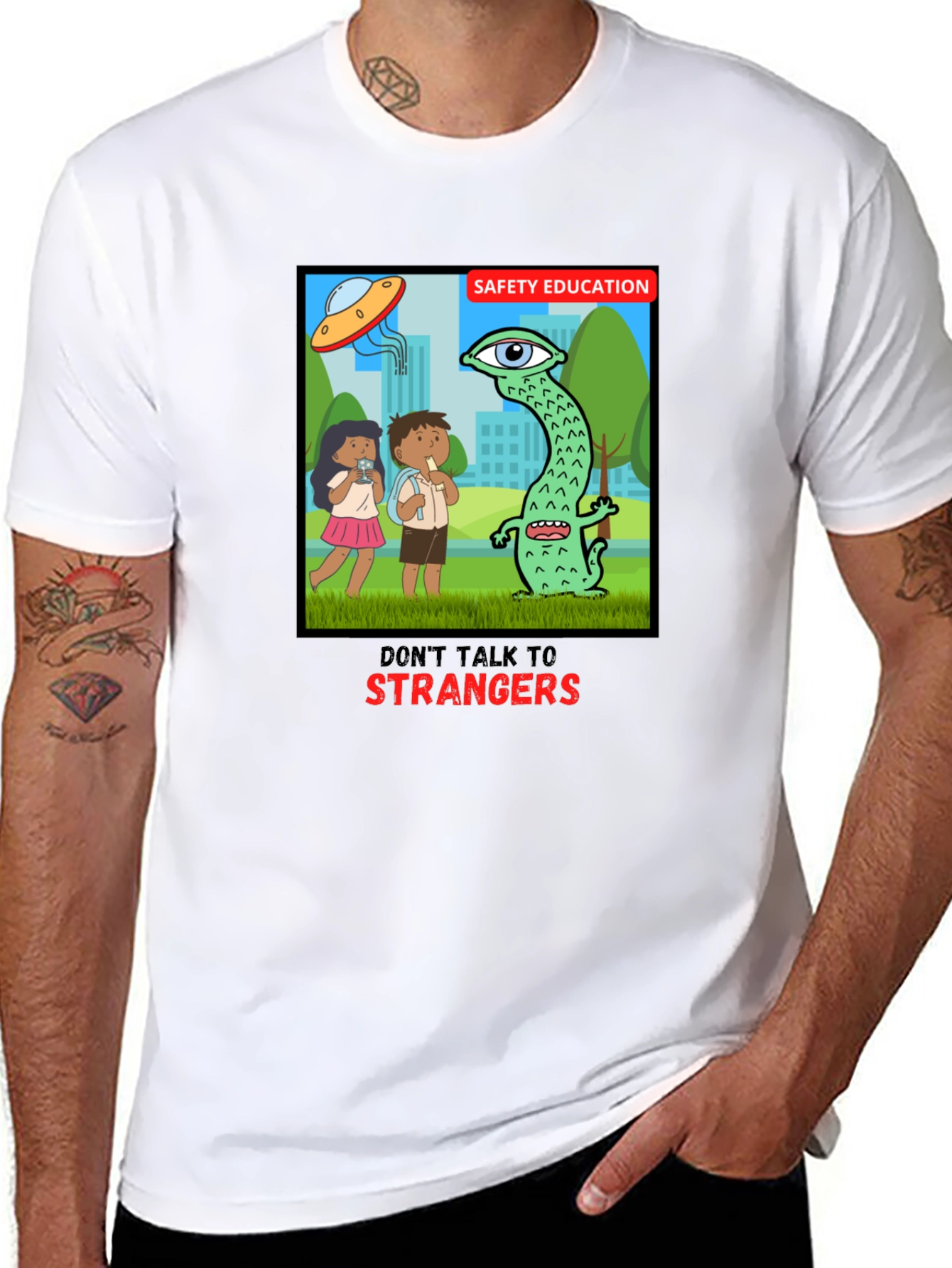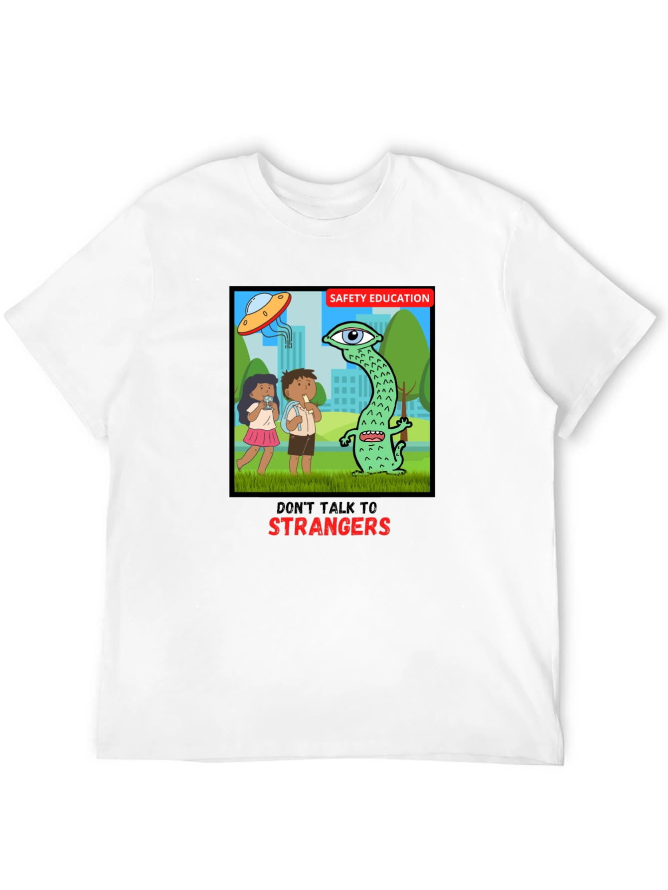 Esta llamativa camiseta negra presenta un diseño educativo y divertido, ideal para concienciar sobre la seguridad infantil. En el centro, se muestra una escena colorida con personajes de dibujos animados: niños, un extraterrestre simpático y un OVNI. El lema "SAFETY EDUCATION" y "DON'T TALK TO STRANGERS" (NO HABLES CON EXTRAÑOS) resaltan en rojo, enfatizando el mensaje clave. Fabricada con materiales suaves y cómodos, esta camiseta es perfecta para el uso diario. Su diseño único y mensaje importante la convierten en una excelente opción para vestir a los más pequeños con estilo y propósito, fomentando la conversación sobre la seguridad en el entorno. ¡Una prenda ideal para padres conscientes!