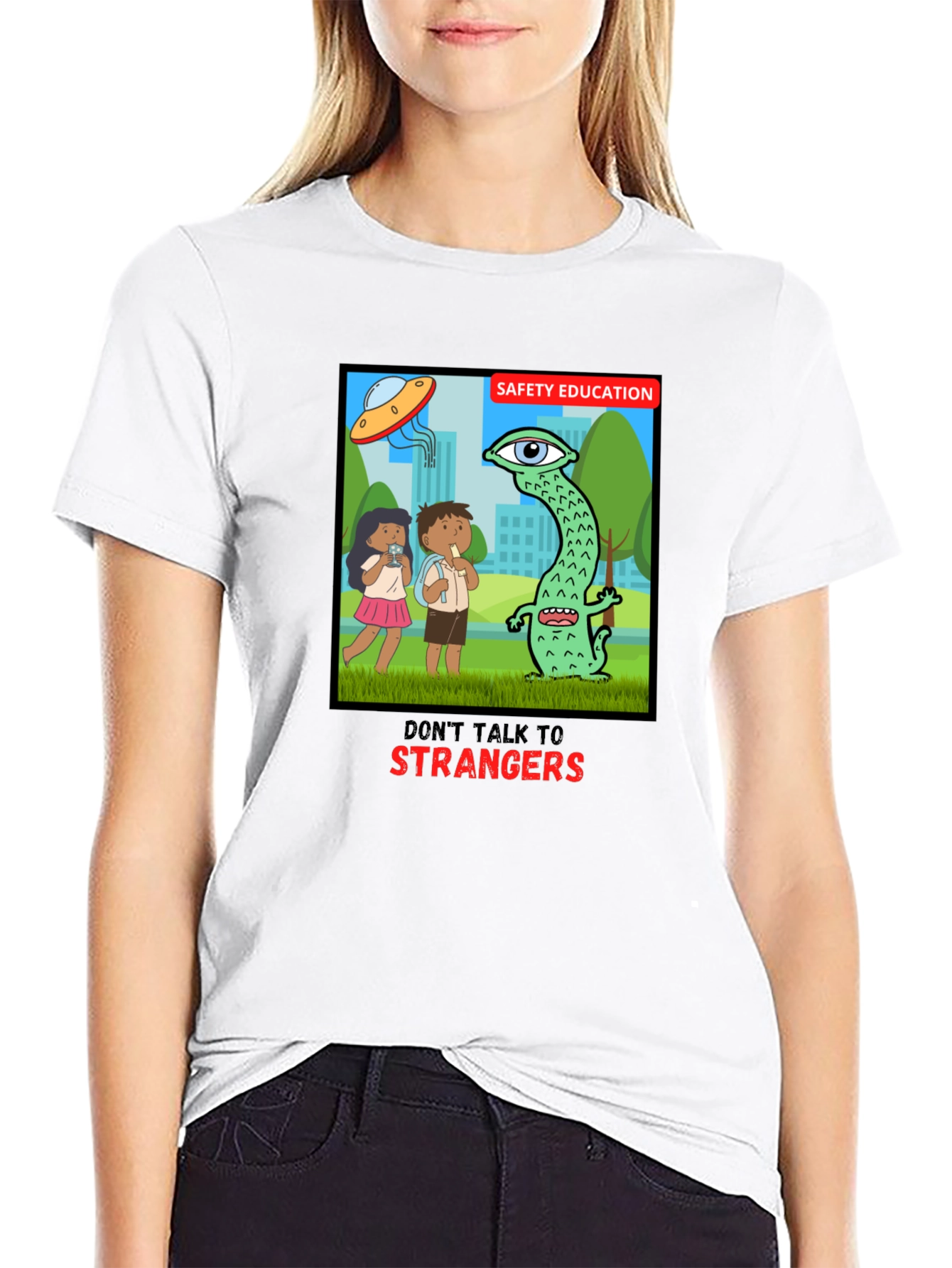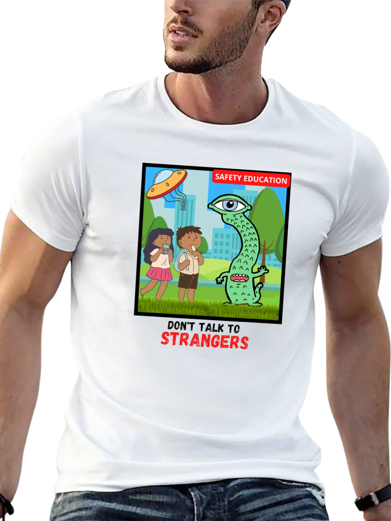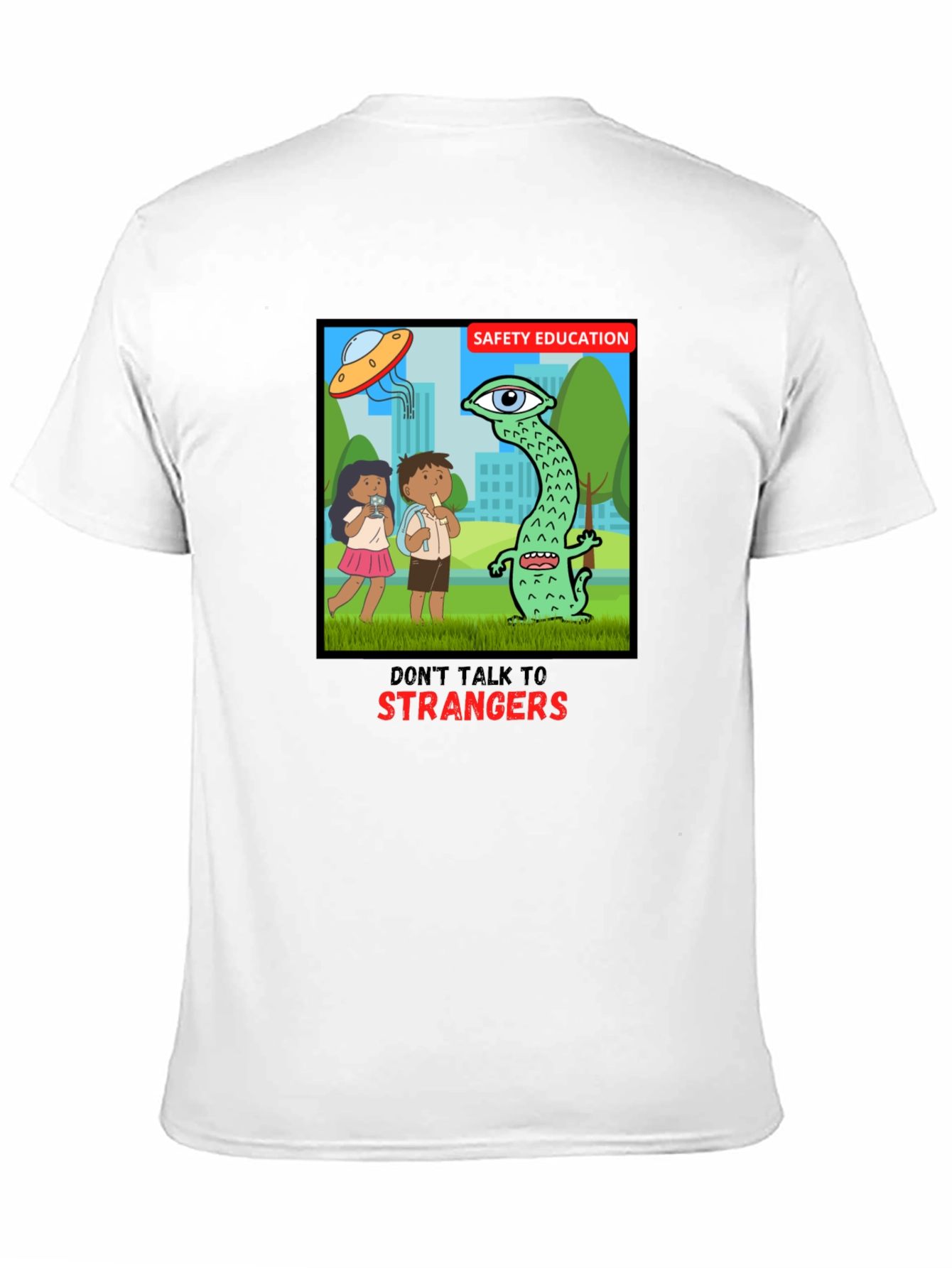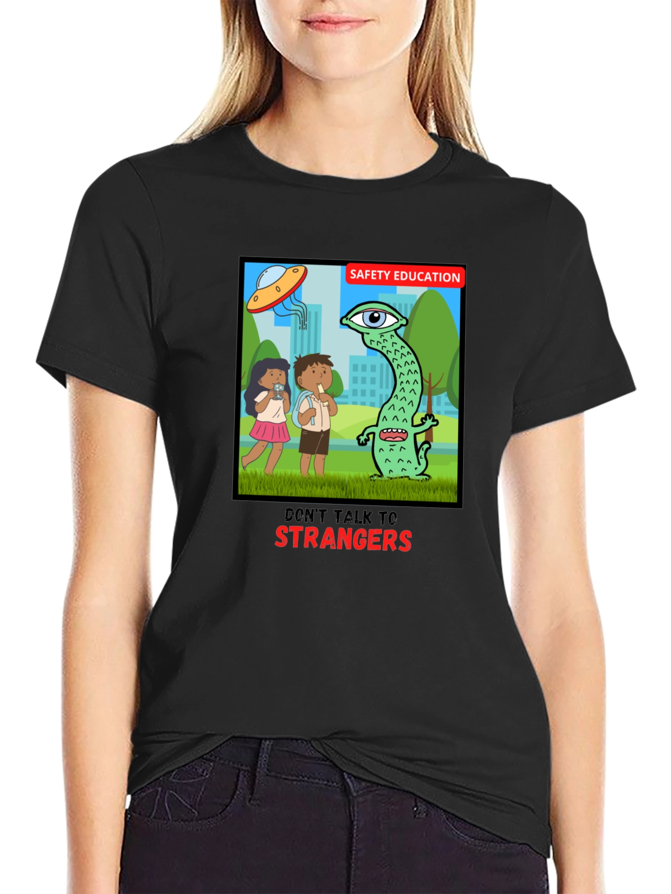 Esta llamativa camiseta negra presenta un diseño educativo y divertido, ideal para concienciar sobre la seguridad infantil. En el centro, se muestra una escena colorida con personajes de dibujos animados: niños, un extraterrestre simpático y un OVNI. El lema "SAFETY EDUCATION" y "DON'T TALK TO STRANGERS" (NO HABLES CON EXTRAÑOS) resaltan en rojo, enfatizando el mensaje clave. Fabricada con materiales suaves y cómodos, esta camiseta es perfecta para el uso diario. Su diseño único y mensaje importante la convierten en una excelente opción para vestir a los más pequeños con estilo y propósito, fomentando la conversación sobre la seguridad en el entorno. ¡Una prenda ideal para padres conscientes!