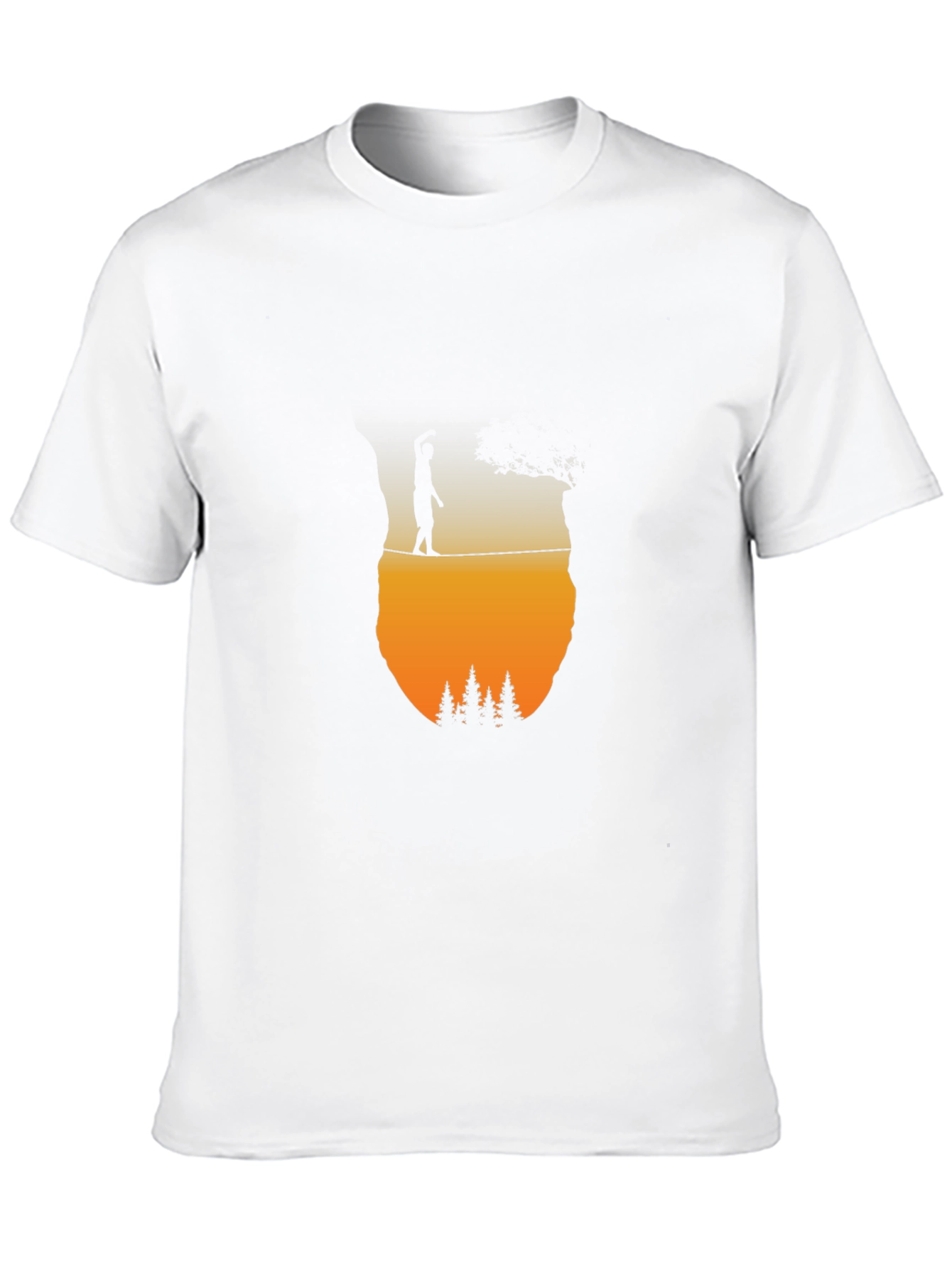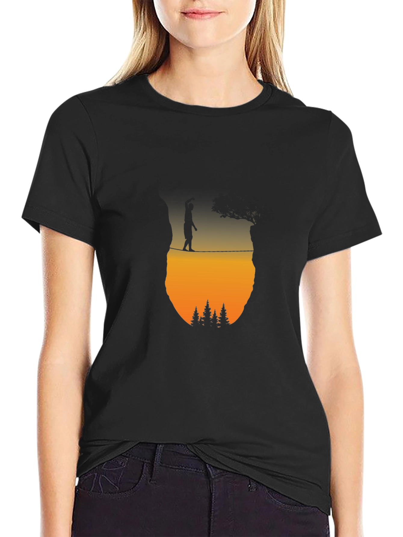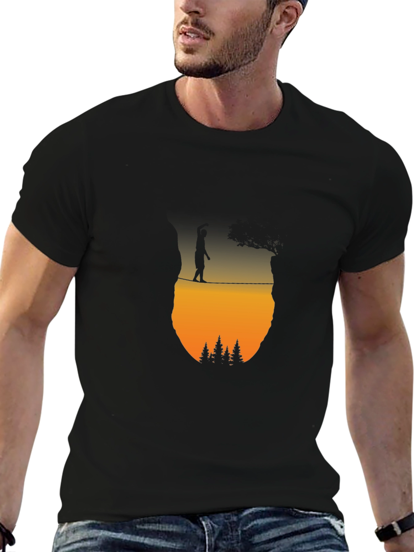 Luce esta camiseta negra con un diseño intrigante. Presenta una silueta de un equilibrista sobre una cuerda, con un fondo de atardecer anaranjado y árboles oscuros. La escena evoca aventura y serenidad. Fabricada con un tejido suave y cómodo, esta camiseta de manga corta es perfecta para un look casual y relajado. Ideal para expresar tu estilo único y tu pasión por la naturaleza y los desafíos. Llévala para tus actividades diarias, salidas con amigos o simplemente para relajarte en casa. Un diseño que seguro llamará la atención.