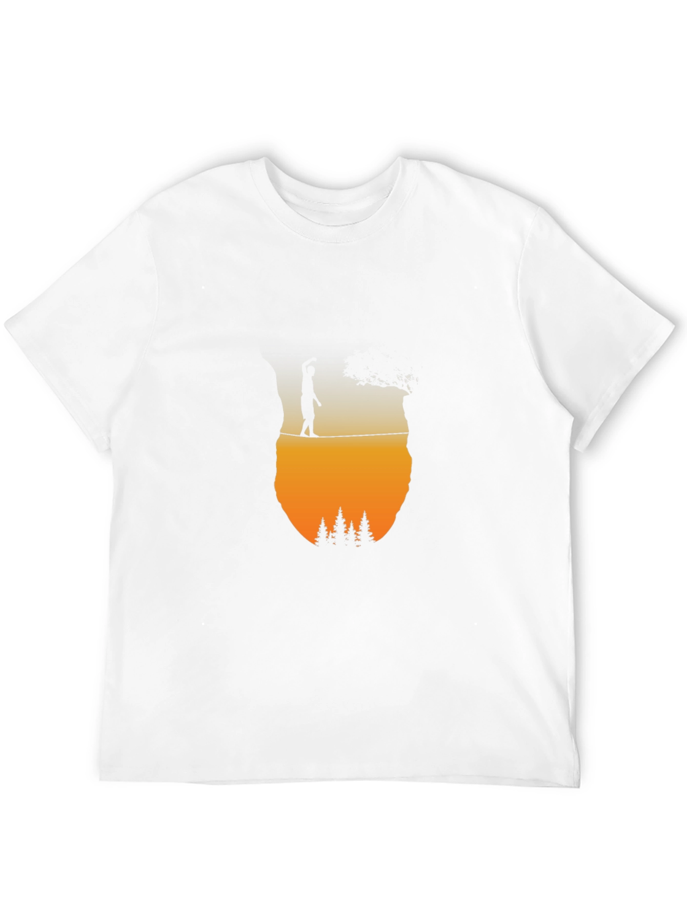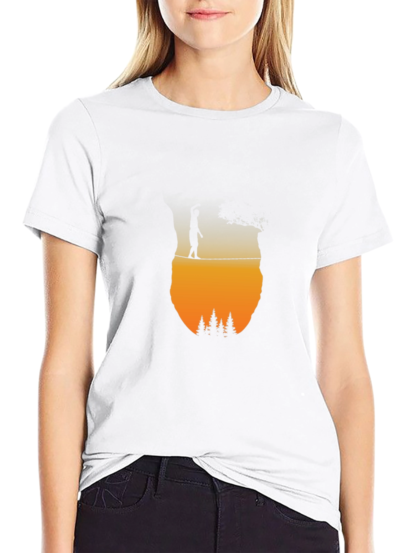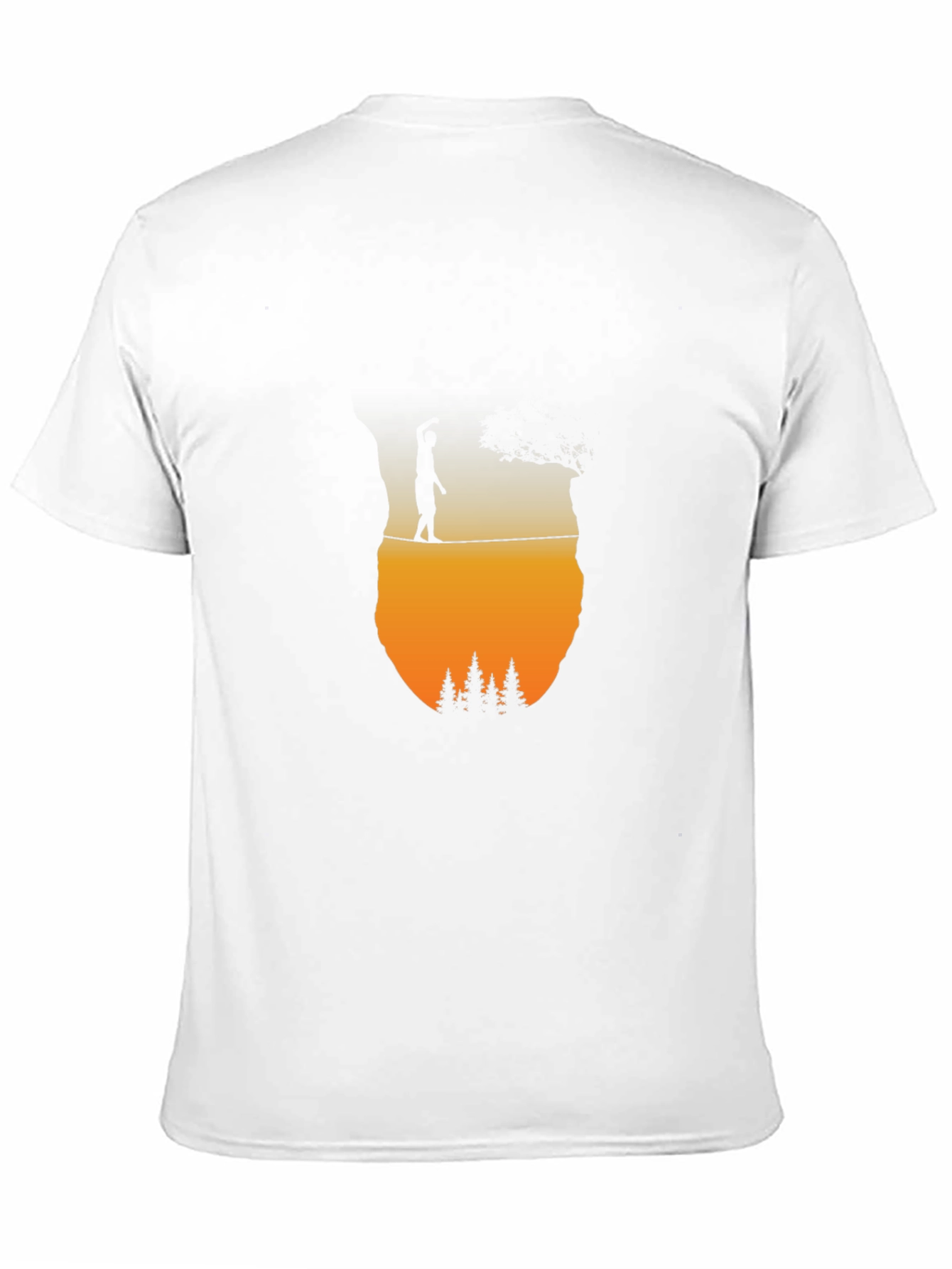 Luce esta camiseta negra con un diseño intrigante. Presenta una silueta de un equilibrista sobre una cuerda, con un fondo de atardecer anaranjado y árboles oscuros. La escena evoca aventura y serenidad. Fabricada con un tejido suave y cómodo, esta camiseta de manga corta es perfecta para un look casual y relajado. Ideal para expresar tu estilo único y tu pasión por la naturaleza y los desafíos. Llévala para tus actividades diarias, salidas con amigos o simplemente para relajarte en casa. Un diseño que seguro llamará la atención.