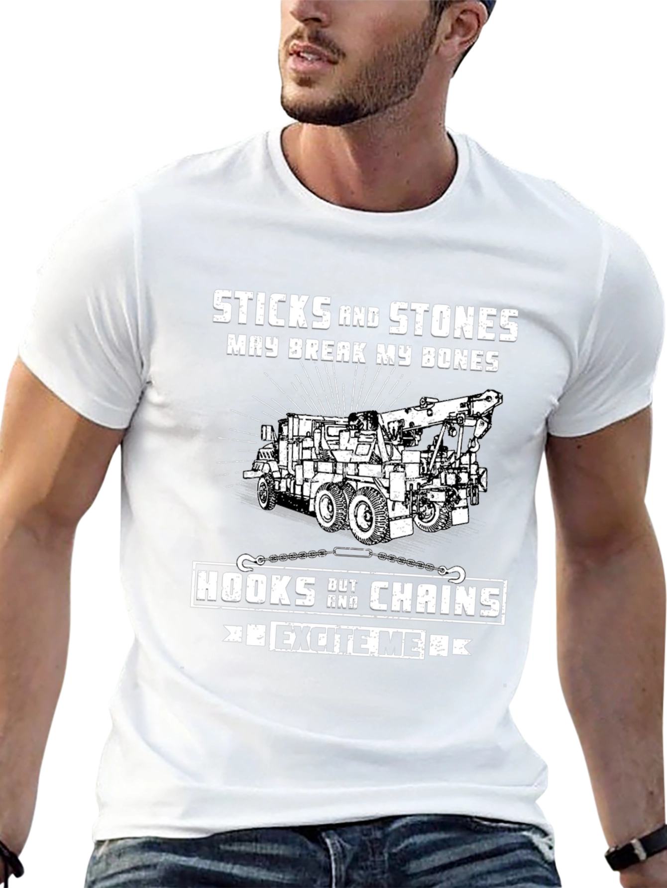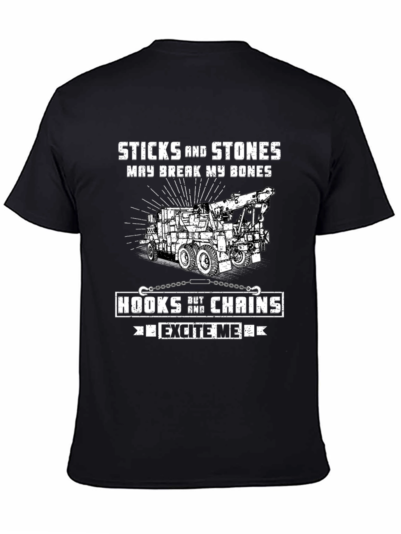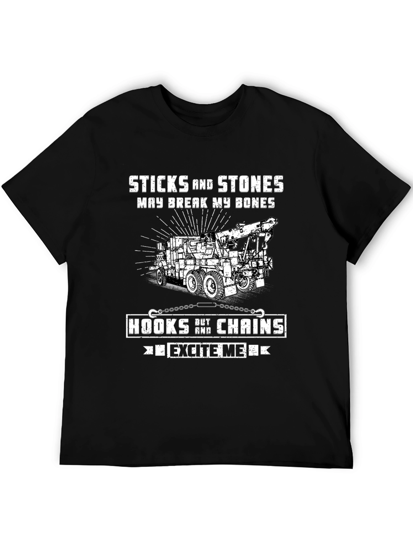 Muestra tu pasión por los remolques con esta camiseta negra de manga corta. El diseño llamativo presenta un gráfico de un camión de remolque intrincadamente detallado con el texto "STICKS and STONES MAY BREAK MY BONES HOOKS AND CHAINS EXCITE ME" estampado en blanco. Ideal para usar en el trabajo, eventos de camiones, o simplemente para mostrar tu amor por la maquinaria pesada. Fabricada con un material suave y cómodo, esta camiseta ofrece estilo y durabilidad. Perfecta para cualquier amante de los camiones o para aquellos que aprecian el humor audaz.