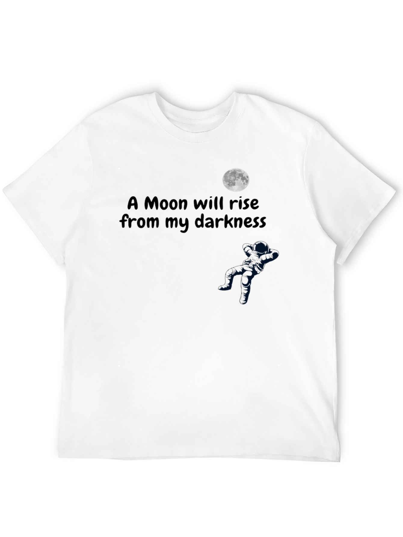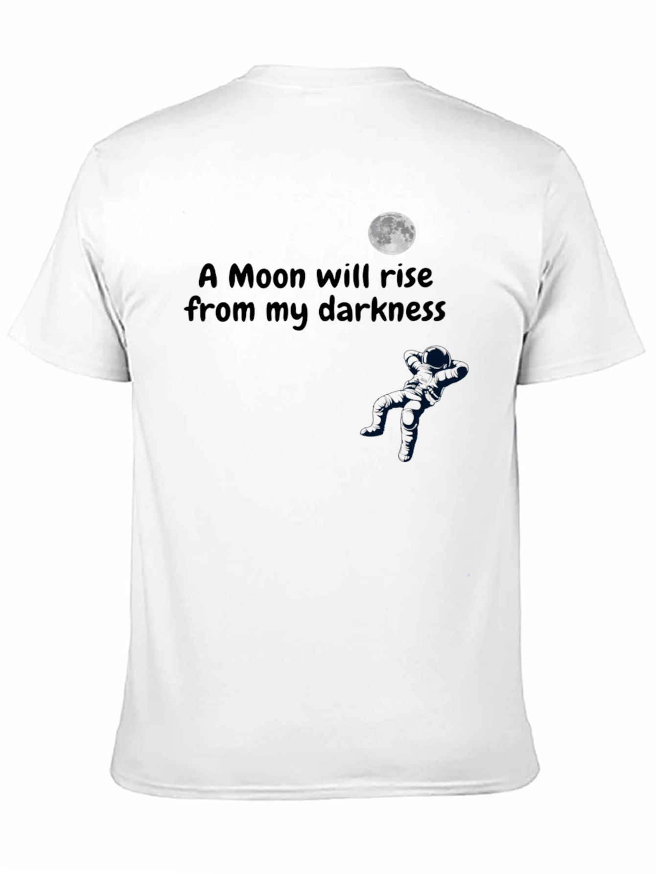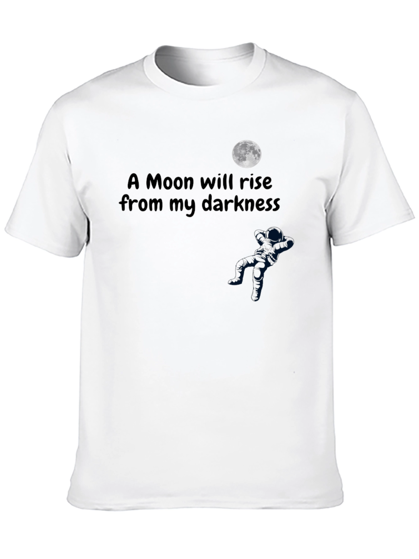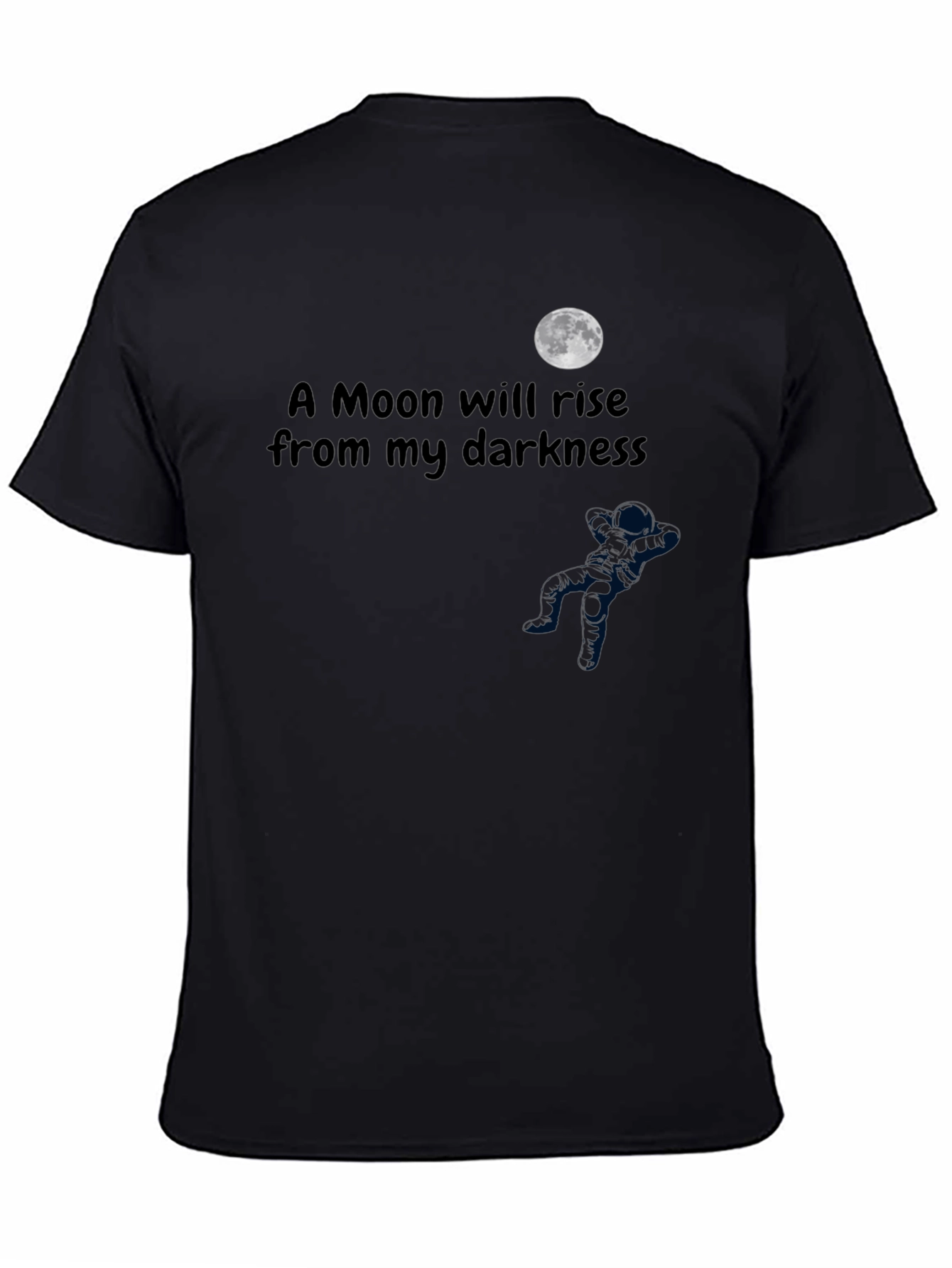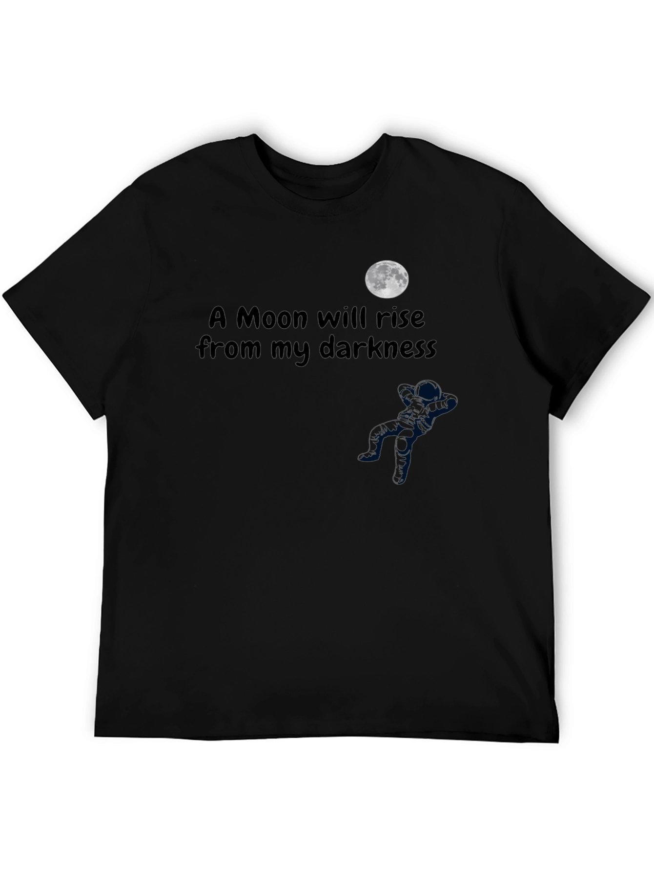 Esta camiseta negra de manga corta presenta un diseño intrigante y reflexivo. En el pecho, se lee la frase "Una Luna Surgirá de mi Oscuridad", acompañada de una imagen de una luna llena y una figura estilizada de un astronauta en un tono azul contrastante. El diseño sugiere un tema de esperanza y renacimiento, lo que la convierte en una prenda ideal para expresar individualidad y un sentido profundo del ser. La tela parece ser suave y cómoda, perfecta para usar en cualquier ocasión casual. Ideal para quienes buscan una prenda única y con significado.