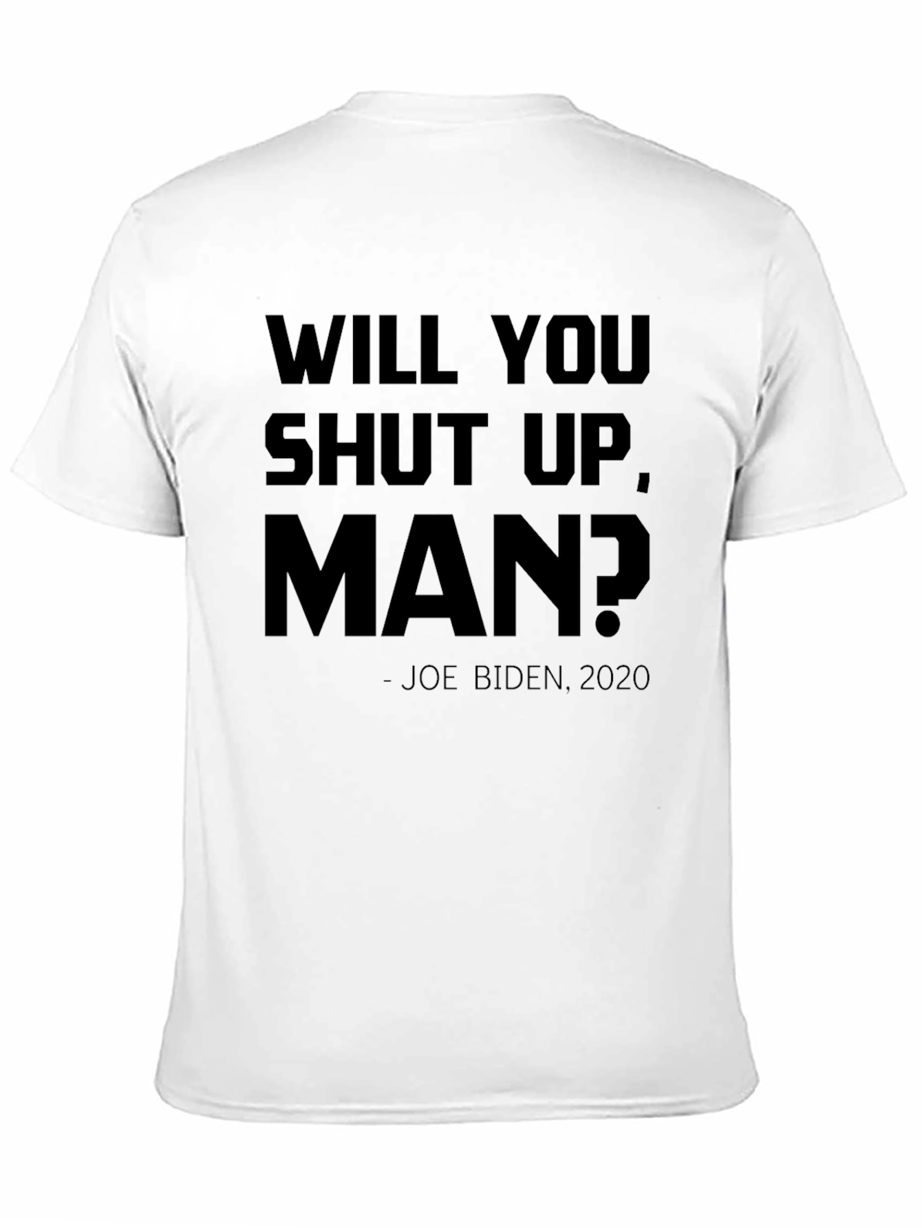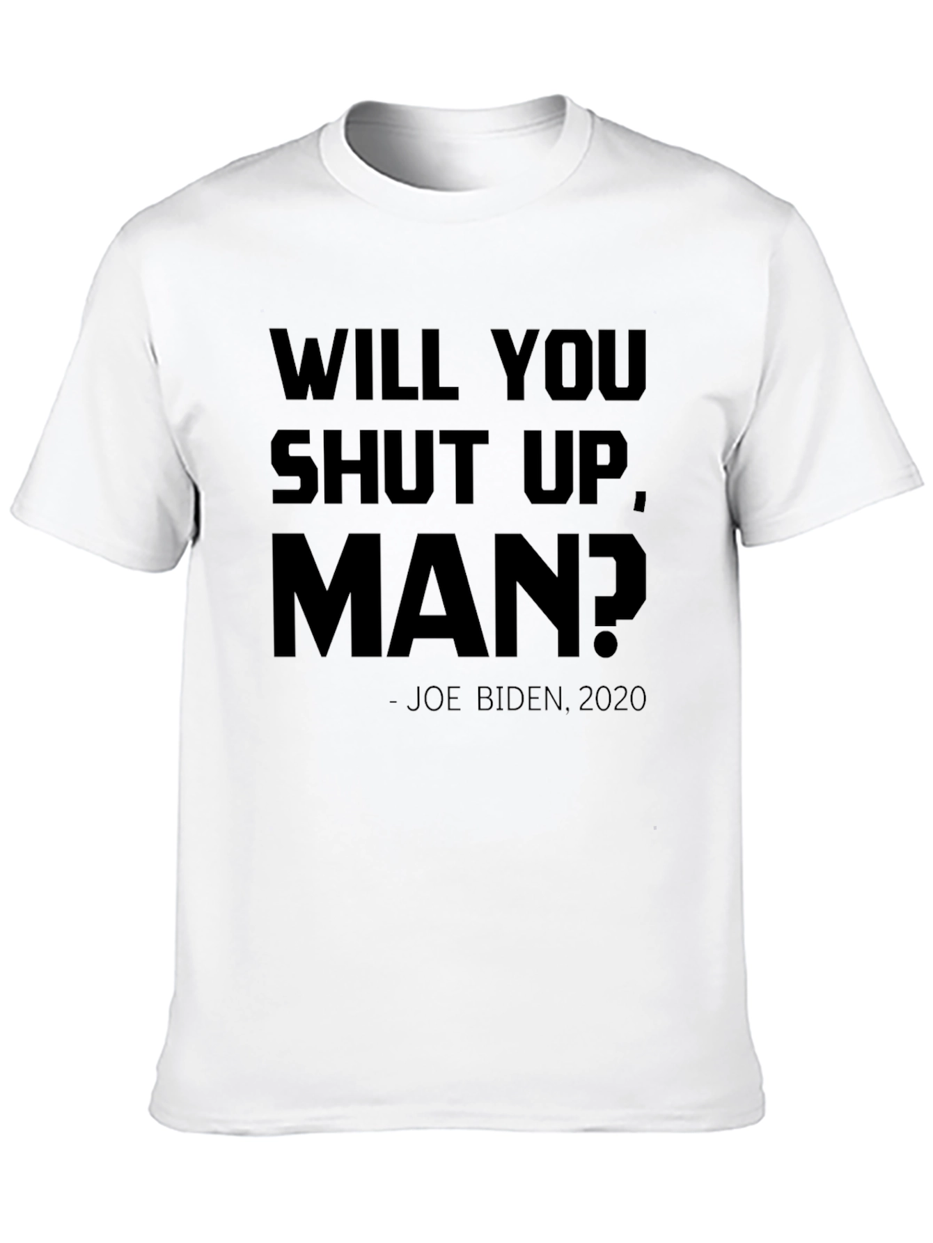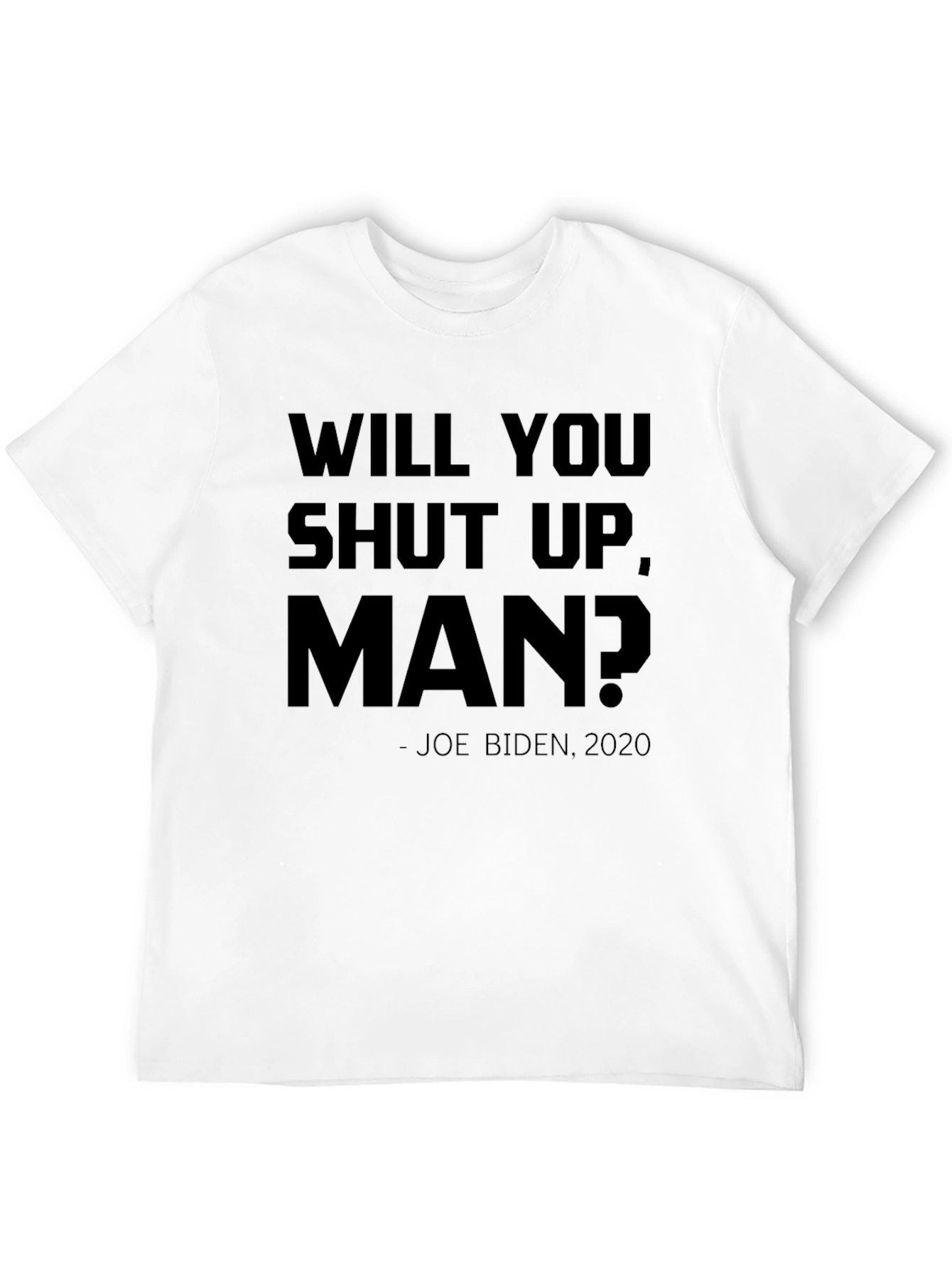 Muestra tu sentido del humor con esta camiseta negra de manga corta. Presenta la frase "WILL YOU SHUT UP, MAN?" en letras mayúsculas, acompañada de "- JOE BIDEN, 2020". Ideal para expresar una opinión política con un toque de sarcasmo o simplemente para iniciar una conversación. Perfecta para llevar en eventos informales, reuniones con amigos o para el día a día. Su diseño sencillo y el color negro la hacen fácil de combinar con cualquier estilo. Fabricada con materiales de alta calidad para garantizar comodidad y durabilidad.