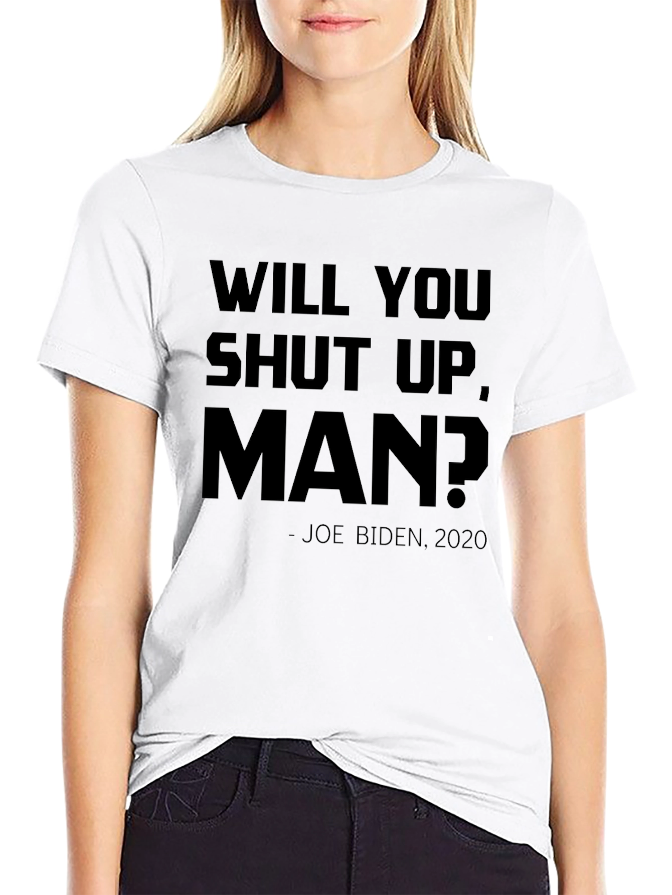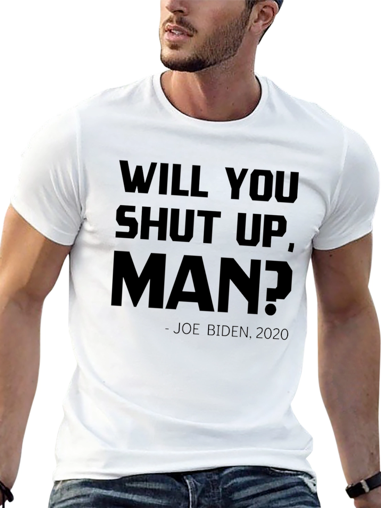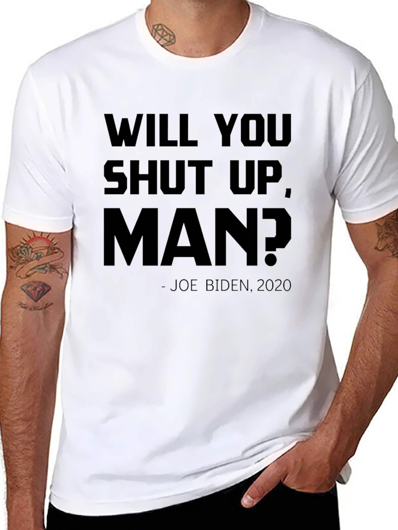Muestra tu sentido del humor con esta camiseta negra de manga corta. Presenta la frase "WILL YOU SHUT UP, MAN?" en letras mayúsculas, acompañada de "- JOE BIDEN, 2020". Ideal para expresar una opinión política con un toque de sarcasmo o simplemente para iniciar una conversación. Perfecta para llevar en eventos informales, reuniones con amigos o para el día a día. Su diseño sencillo y el color negro la hacen fácil de combinar con cualquier estilo. Fabricada con materiales de alta calidad para garantizar comodidad y durabilidad.