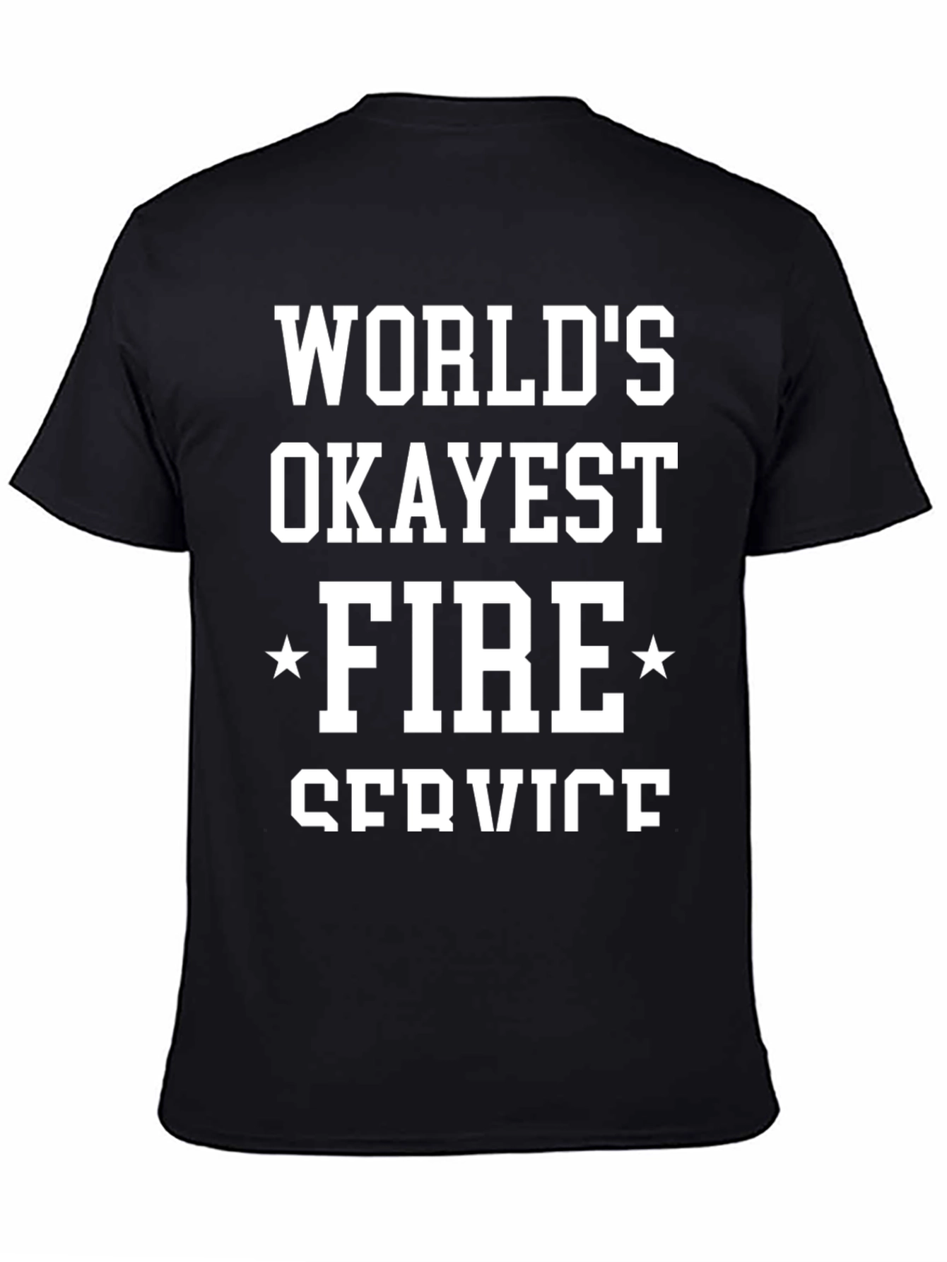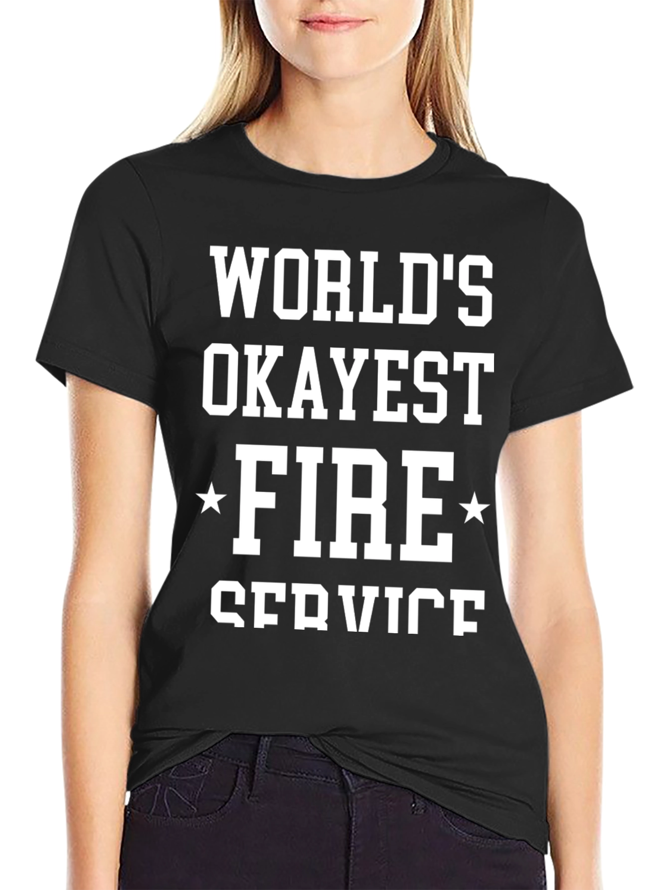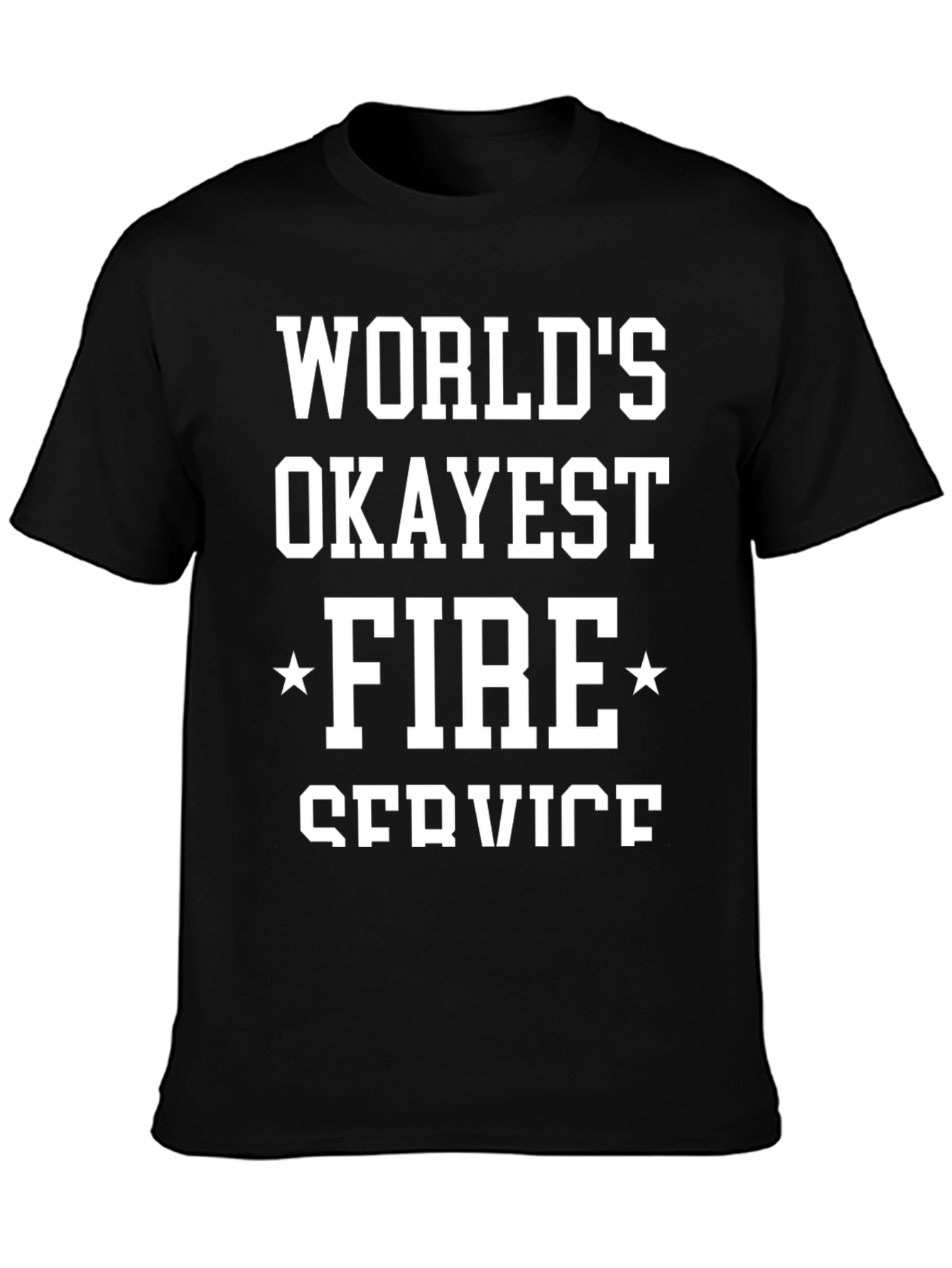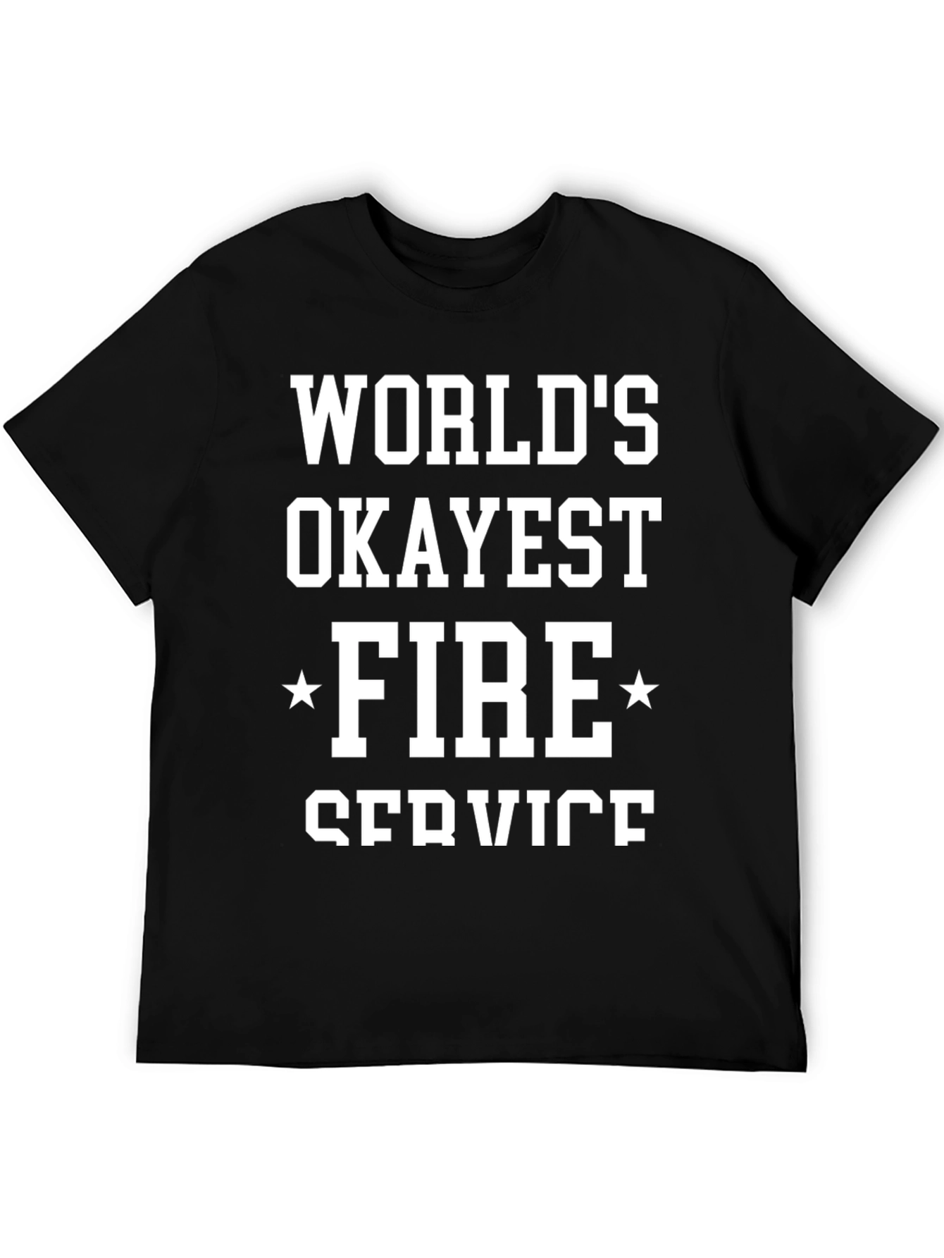Esta camiseta negra presenta un diseño llamativo en letras blancas, ideal para aquellos con sentido del humor. El texto "WORLD'S OKAYEST FIRE SERVICE" (El servicio de bomberos más o menos del mundo) está impreso en un estilo de bloque robusto, flanqueado por estrellas decorativas. Perfecta para bomberos o entusiastas que aprecian el humor y la comodidad. Su corte clásico y tejido suave prometen confort durante todo el día, haciéndola ideal para uso casual, eventos temáticos o como un regalo original y divertido. Demuestra tu actitud relajada con esta prenda única.