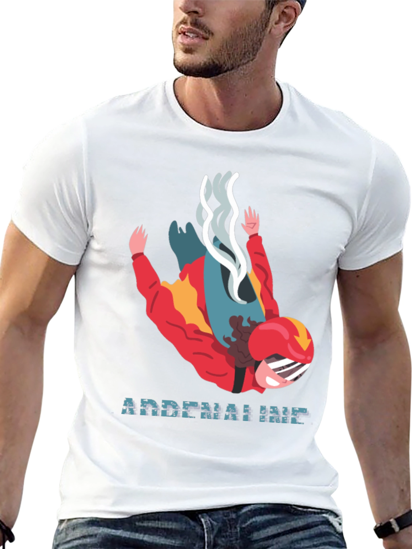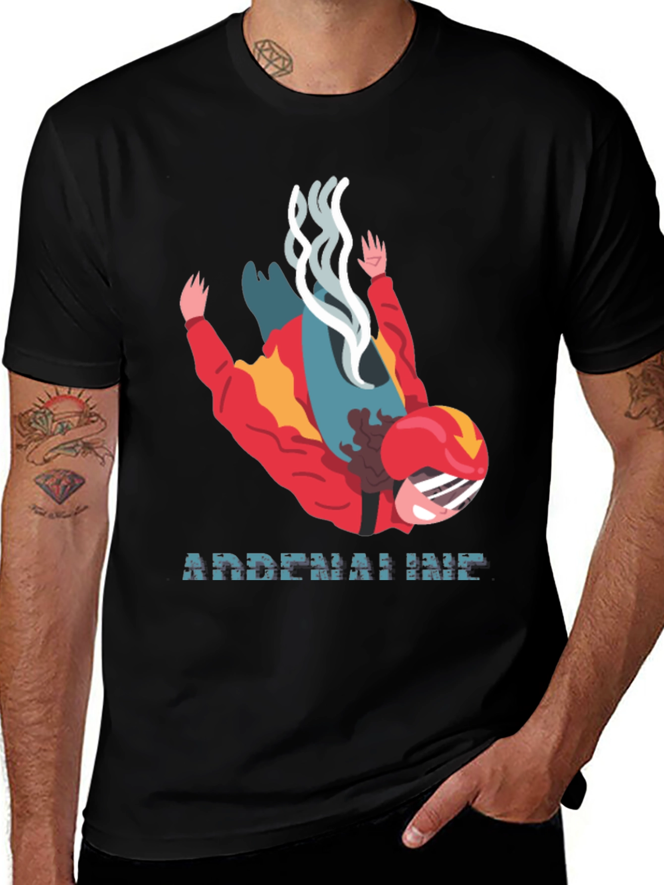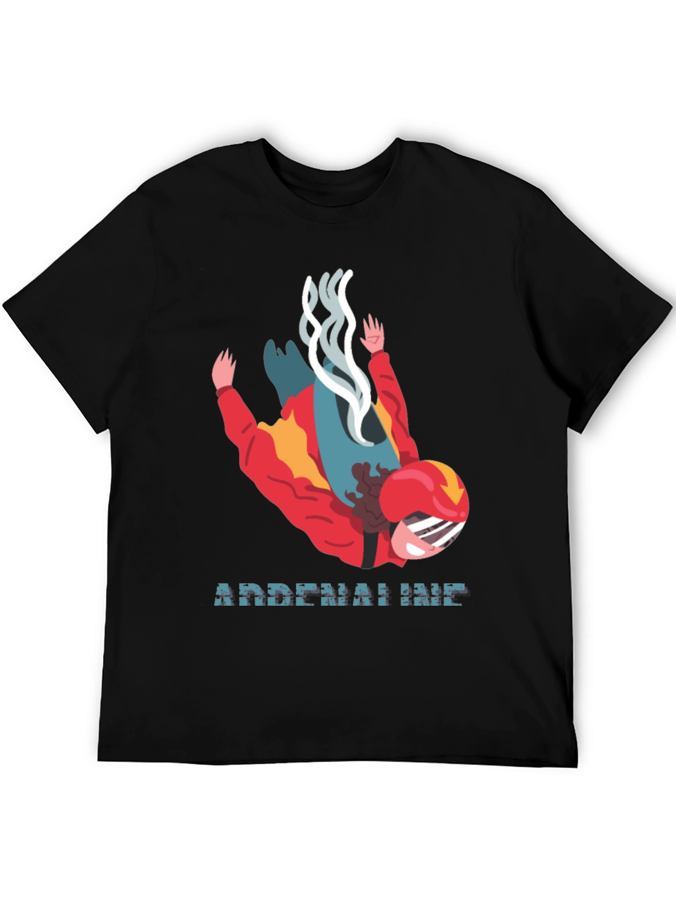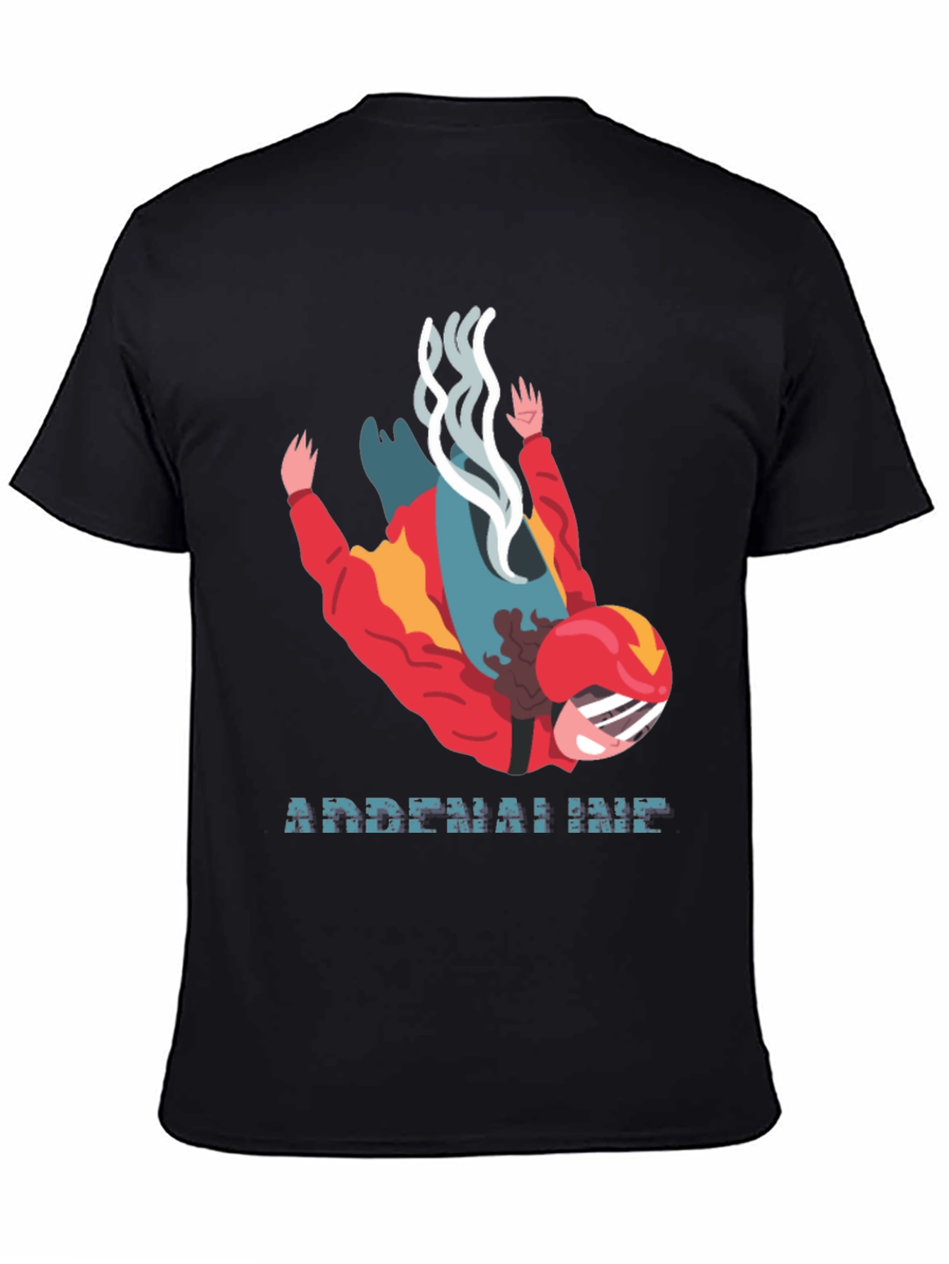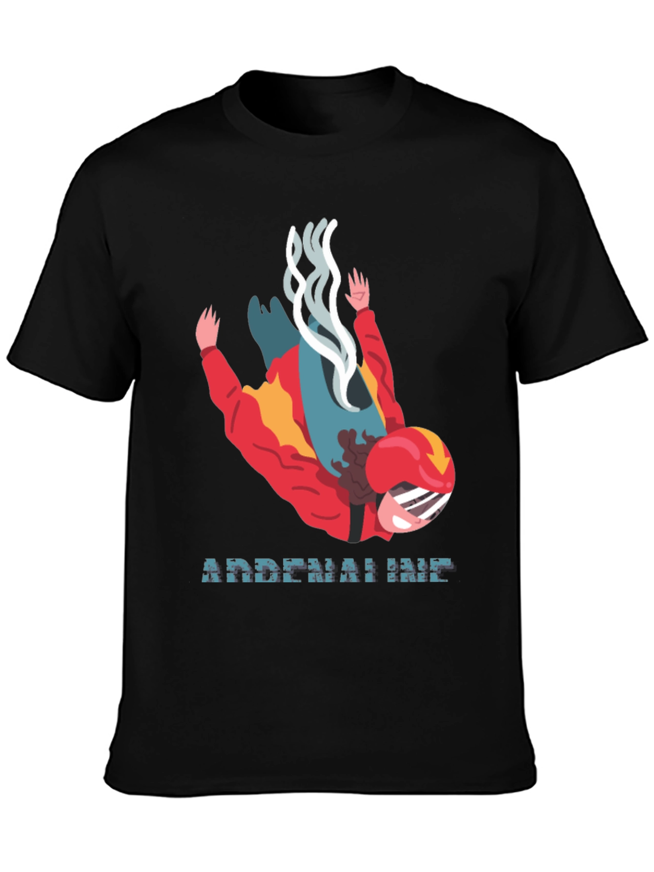 Eleva tu estilo con esta camiseta negra de diseño audaz. Presenta una ilustración vibrante de un paracaidista en caída libre, destacando su equipo en tonos rojos, amarillos y azules. La palabra "ADRENALINE" está impresa con un efecto de estilo moderno. Confeccionada con un tejido suave y cómodo, esta camiseta de corte clásico es perfecta para los amantes de los deportes extremos, los entusiastas del paracaidismo o aquellos que buscan una prenda con un toque de aventura. Combínala con jeans o pantalones deportivos para un look casual y lleno de energía. ¡Una declaración de estilo para los espíritus libres!