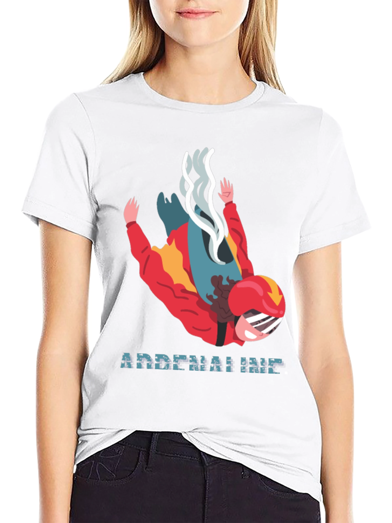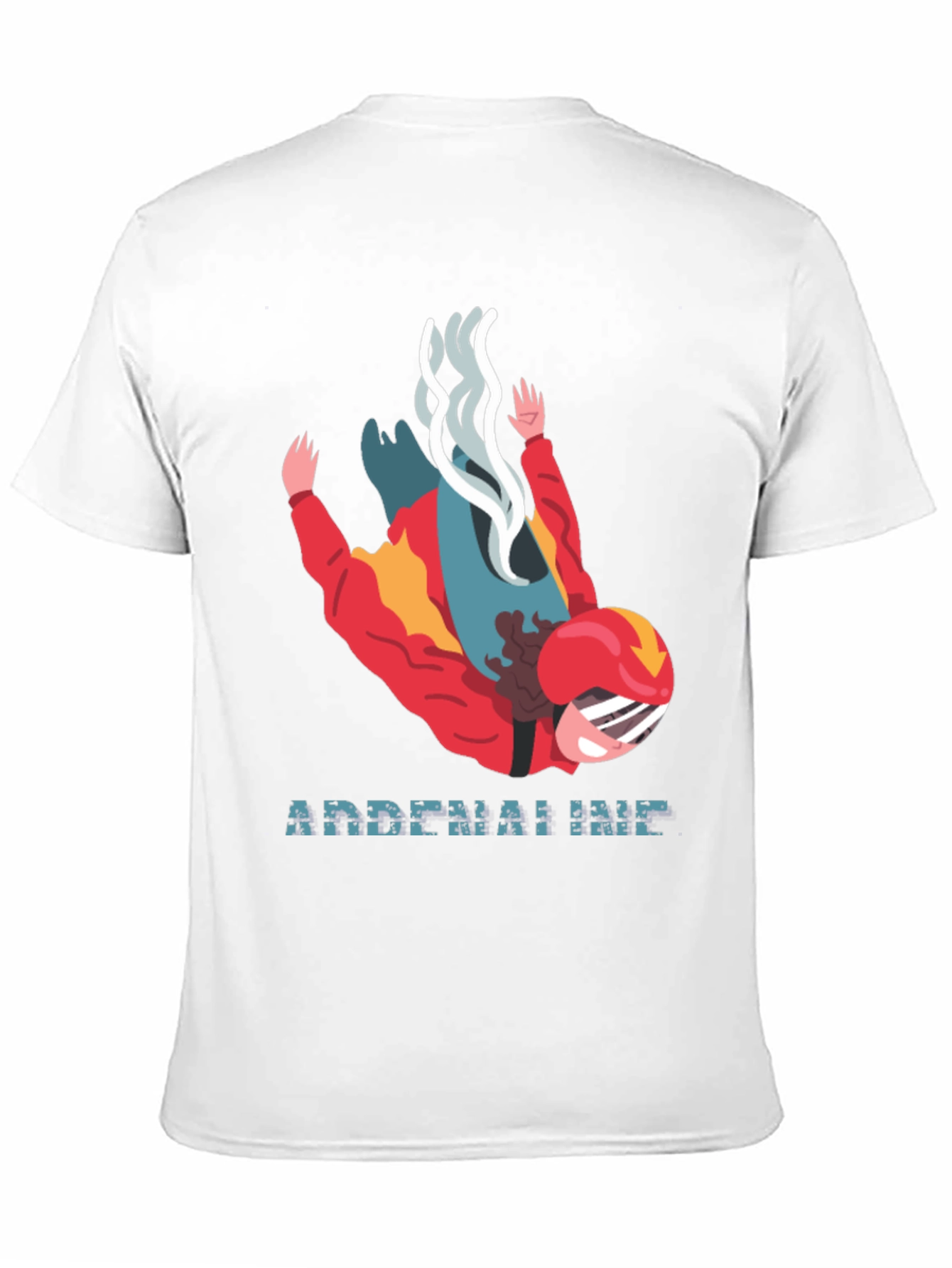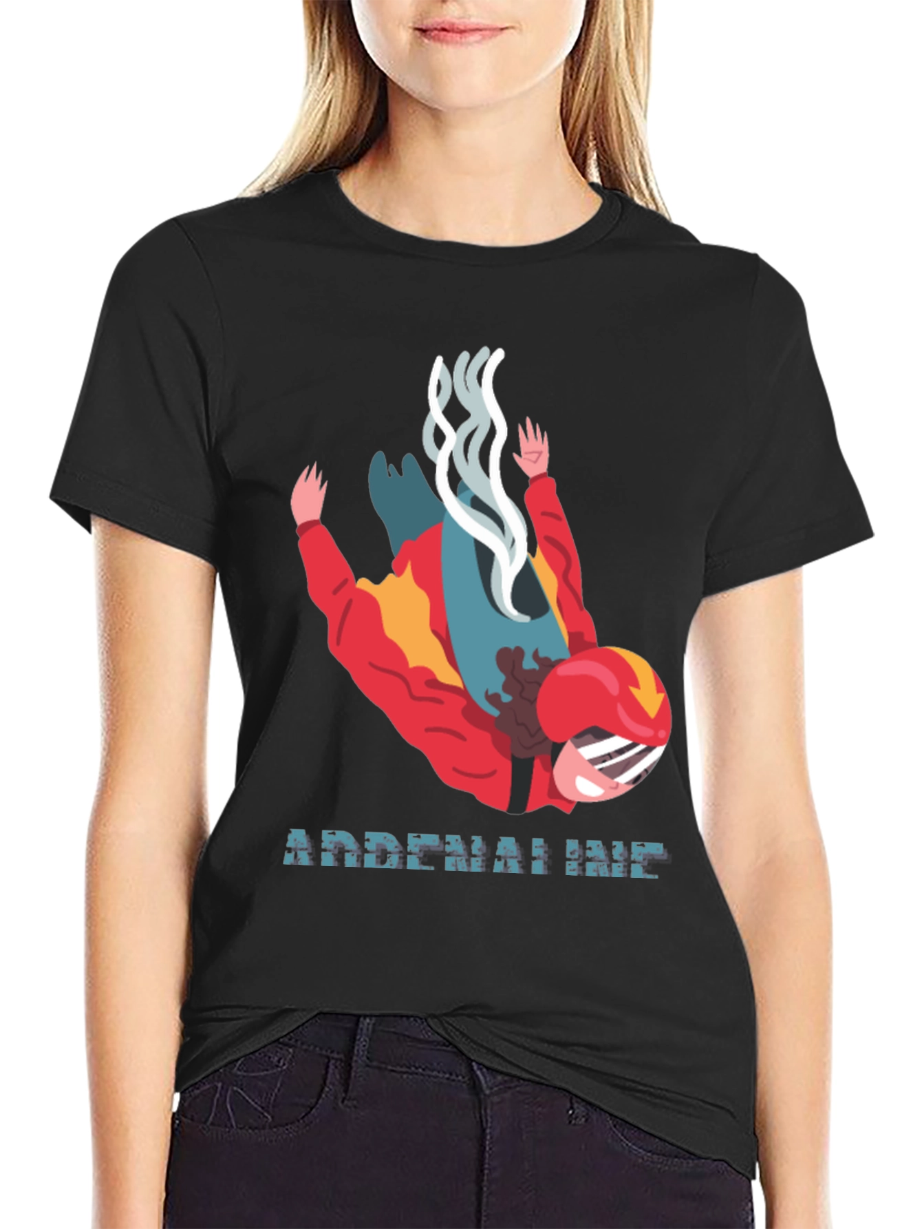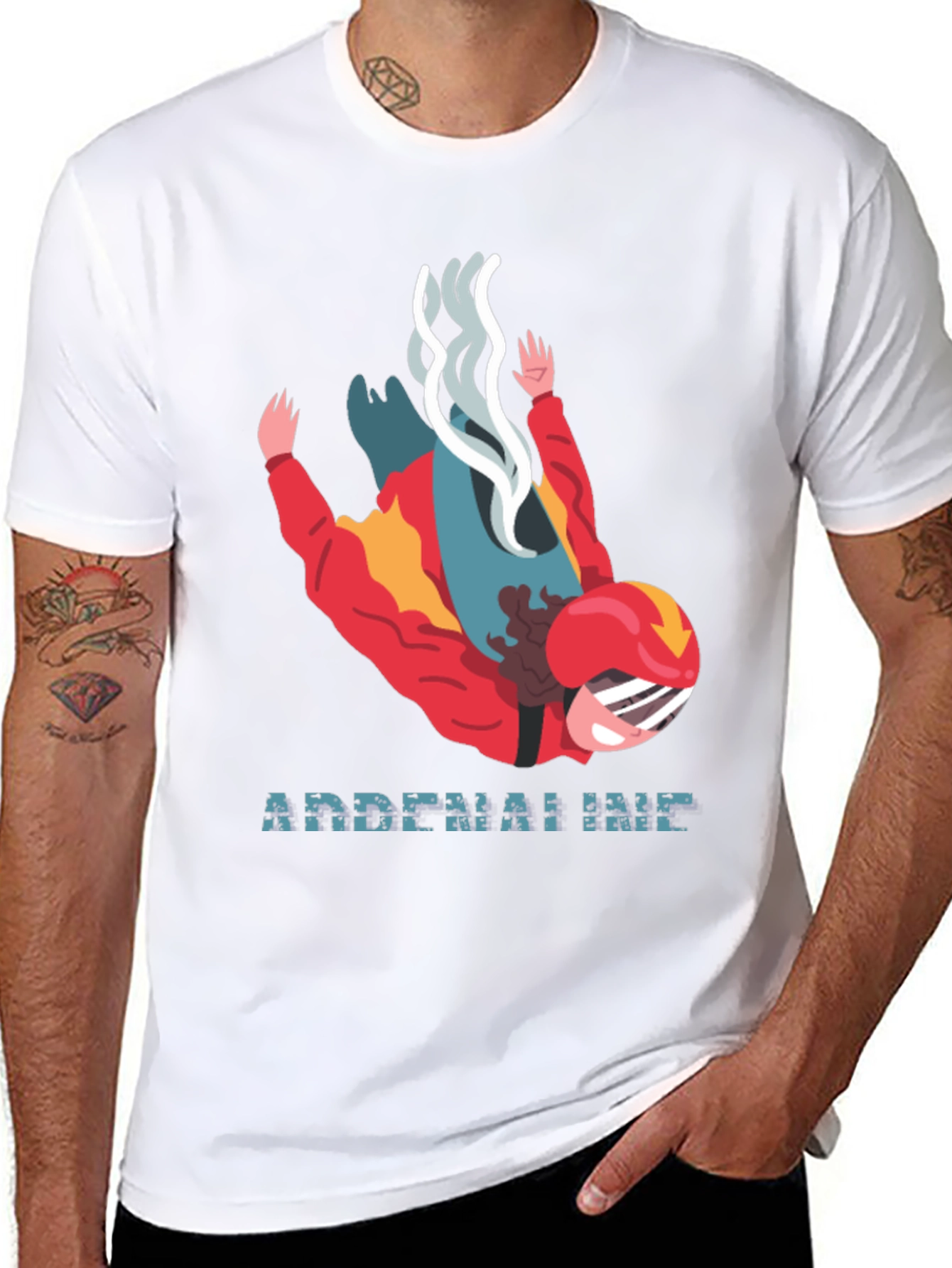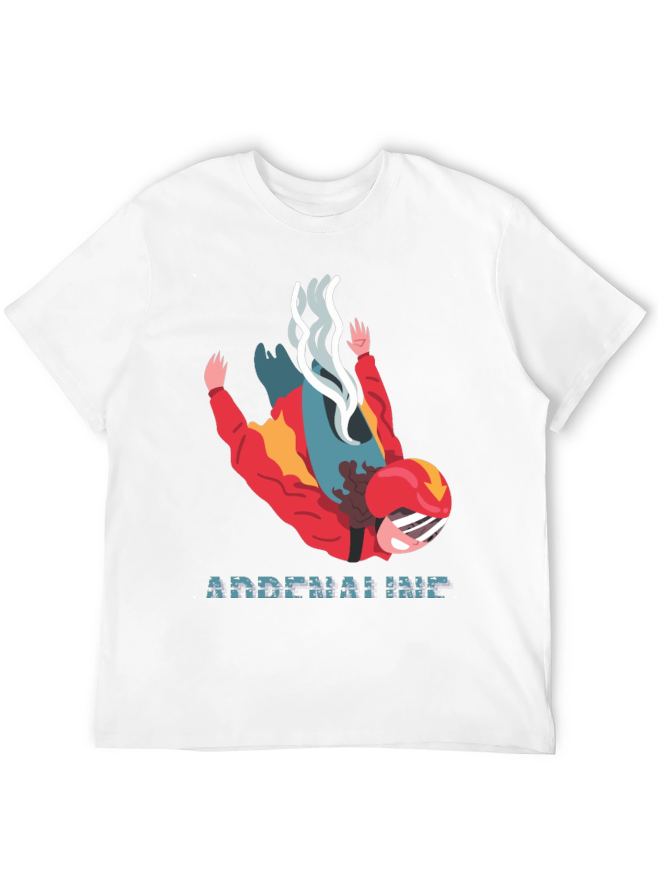 Eleva tu estilo con esta camiseta negra de diseño audaz. Presenta una ilustración vibrante de un paracaidista en caída libre, destacando su equipo en tonos rojos, amarillos y azules. La palabra "ADRENALINE" está impresa con un efecto de estilo moderno. Confeccionada con un tejido suave y cómodo, esta camiseta de corte clásico es perfecta para los amantes de los deportes extremos, los entusiastas del paracaidismo o aquellos que buscan una prenda con un toque de aventura. Combínala con jeans o pantalones deportivos para un look casual y lleno de energía. ¡Una declaración de estilo para los espíritus libres!