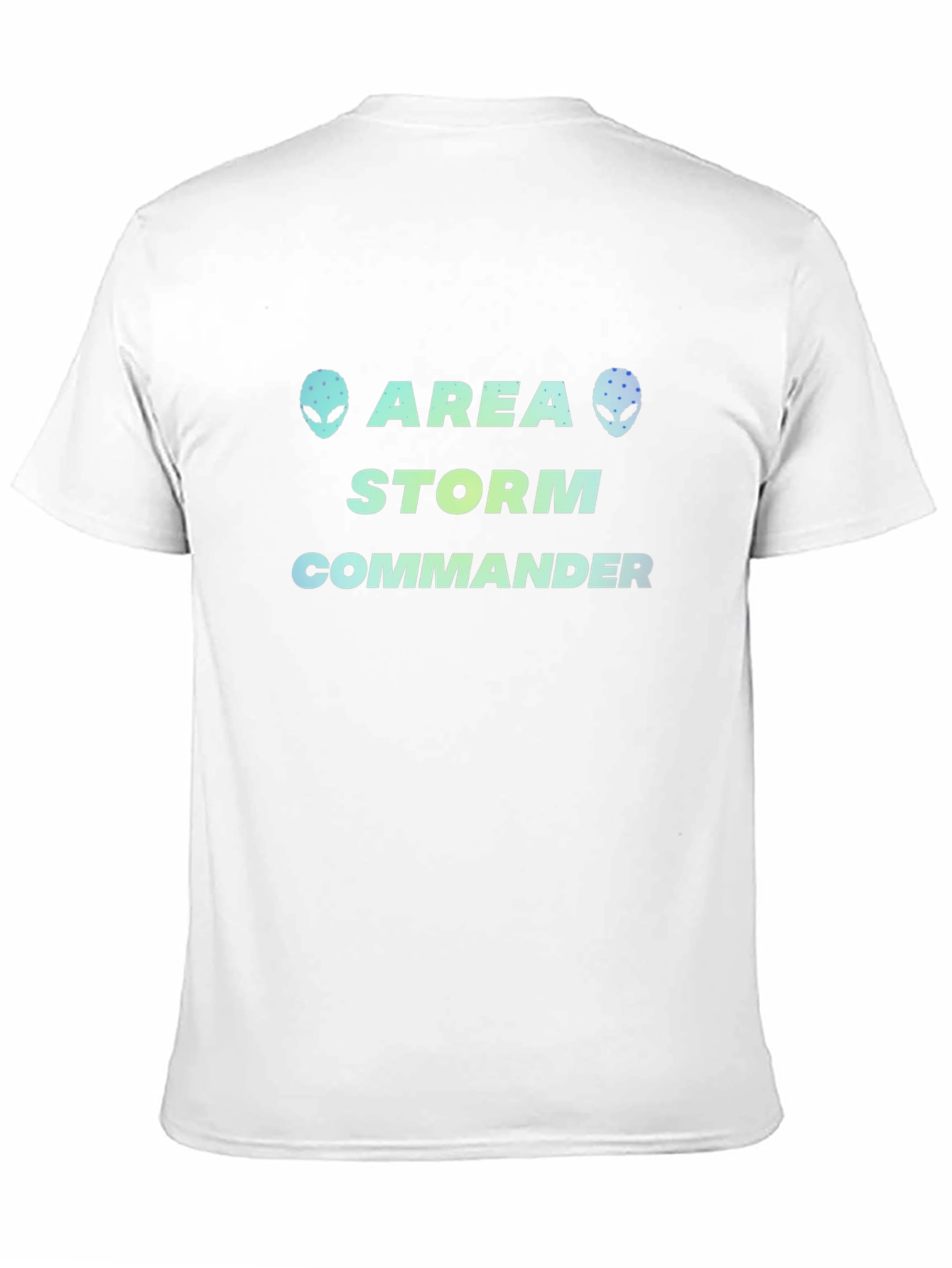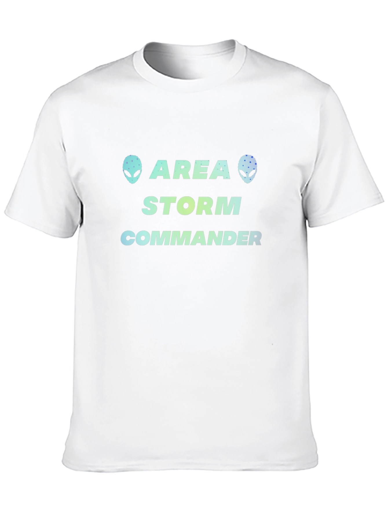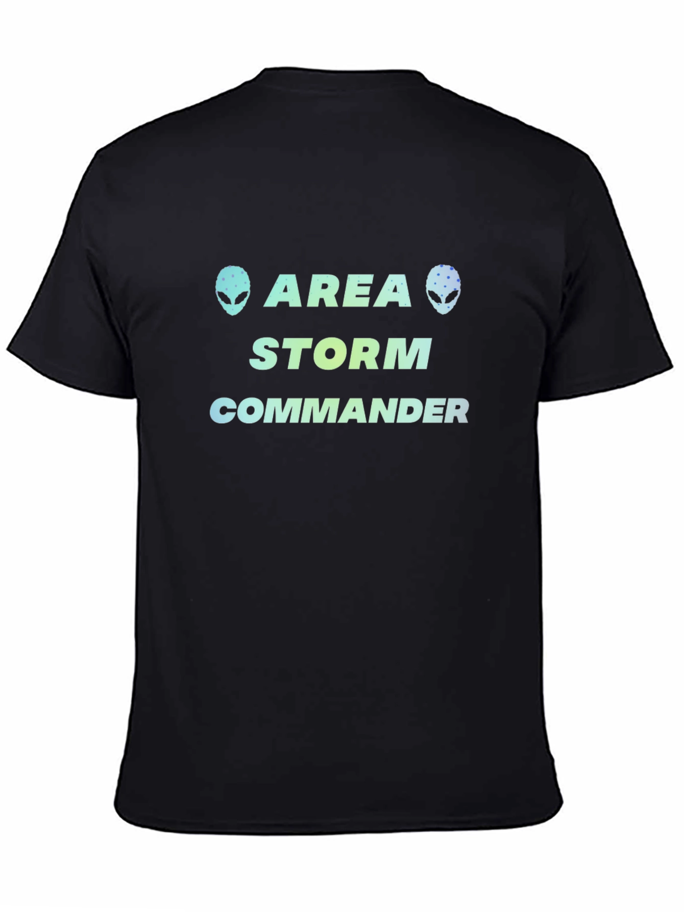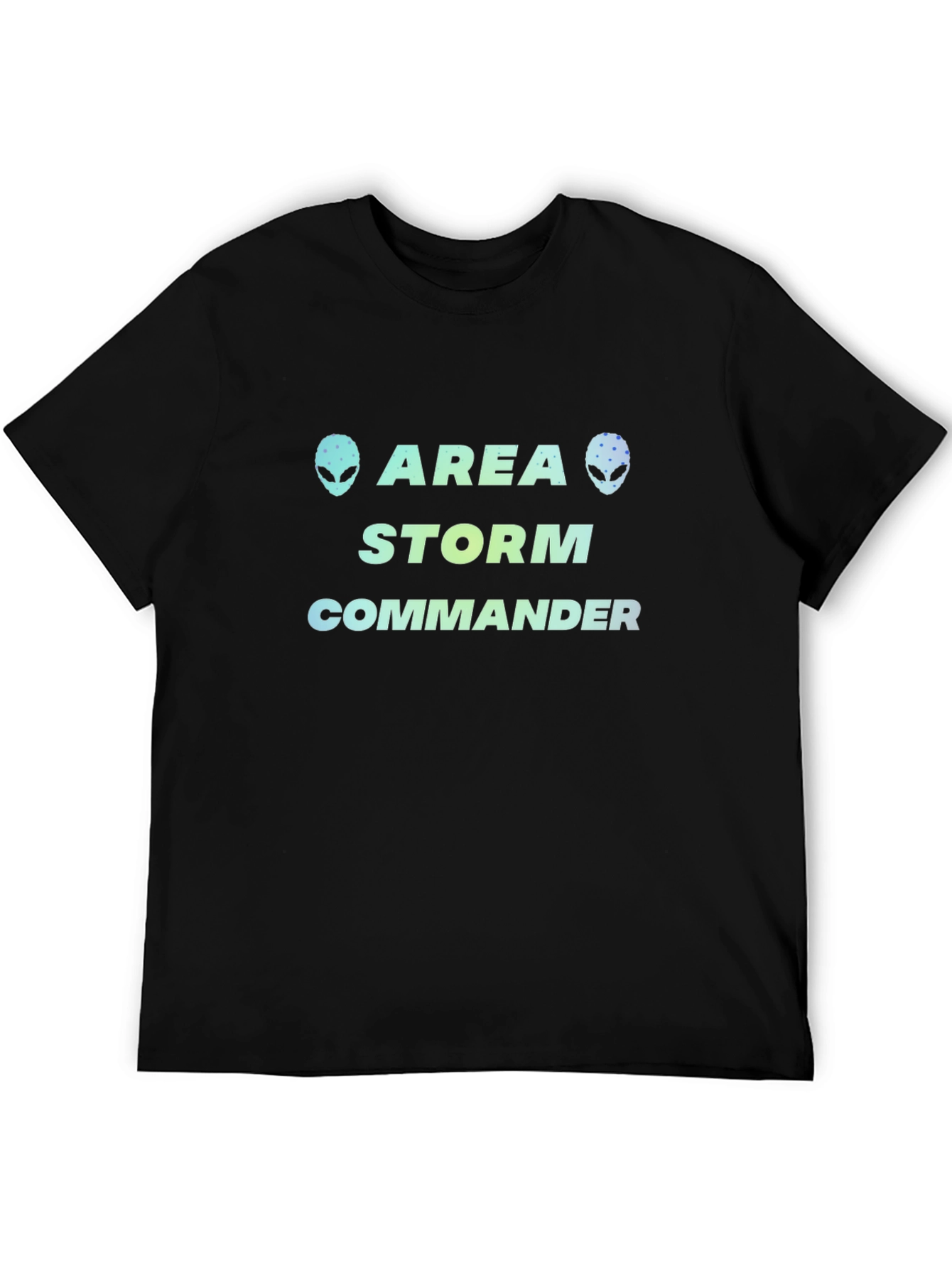 Muestra tu lado divertido con esta camiseta negra de manga corta. En el centro, destaca un diseño con las palabras "AREA STORM COMMANDER", flanqueadas por dos imágenes de cabezas de extraterrestres. El diseño presenta un degradado de color que va del azul al verde. Ideal para destacar en cualquier evento casual, esta camiseta es perfecta para los amantes de los temas espaciales y la cultura pop. Su corte clásico asegura un ajuste cómodo y favorecedor para cualquier tipo de cuerpo. Combínala con jeans o pantalones casuales para un look relajado y con estilo.