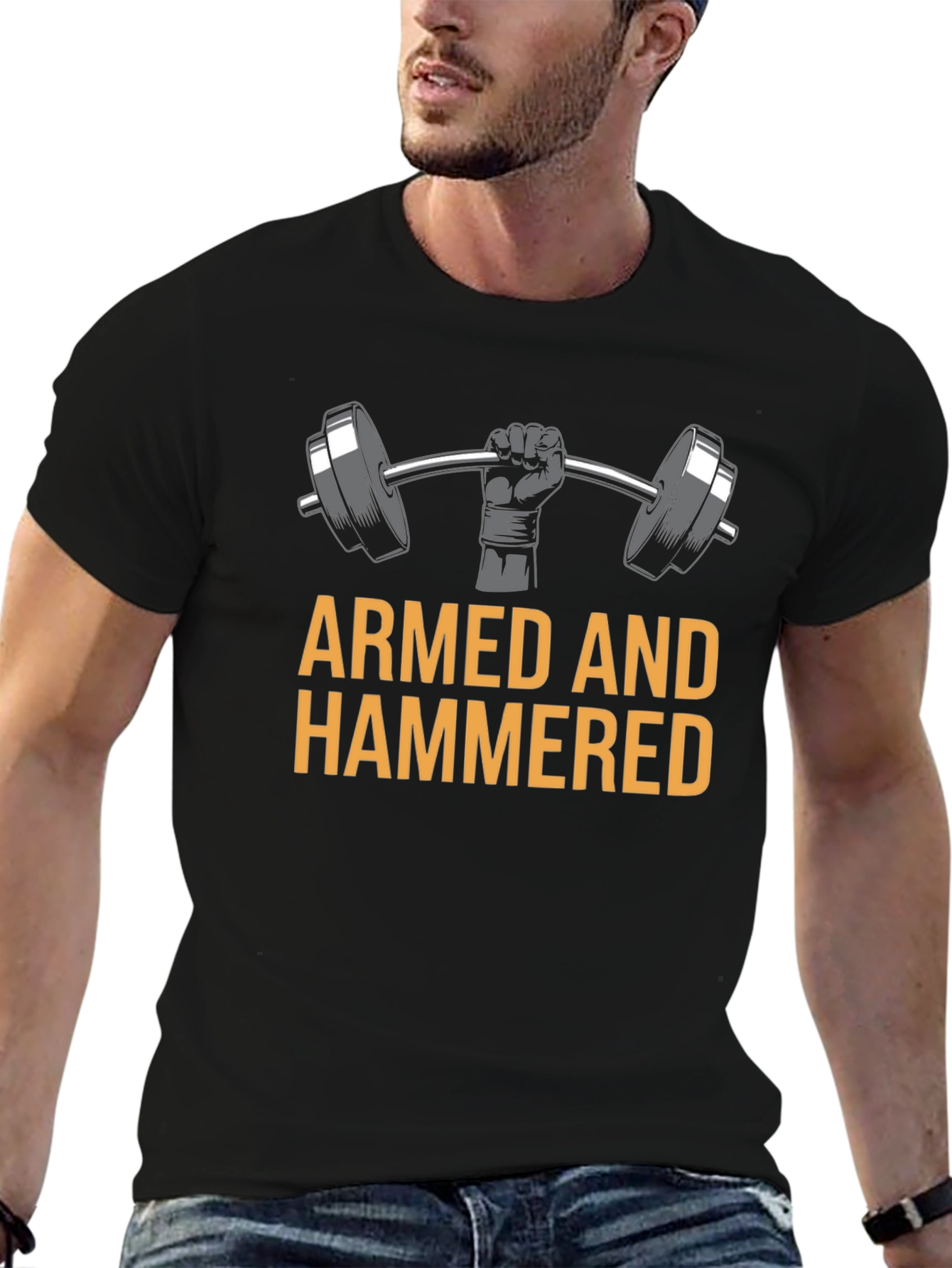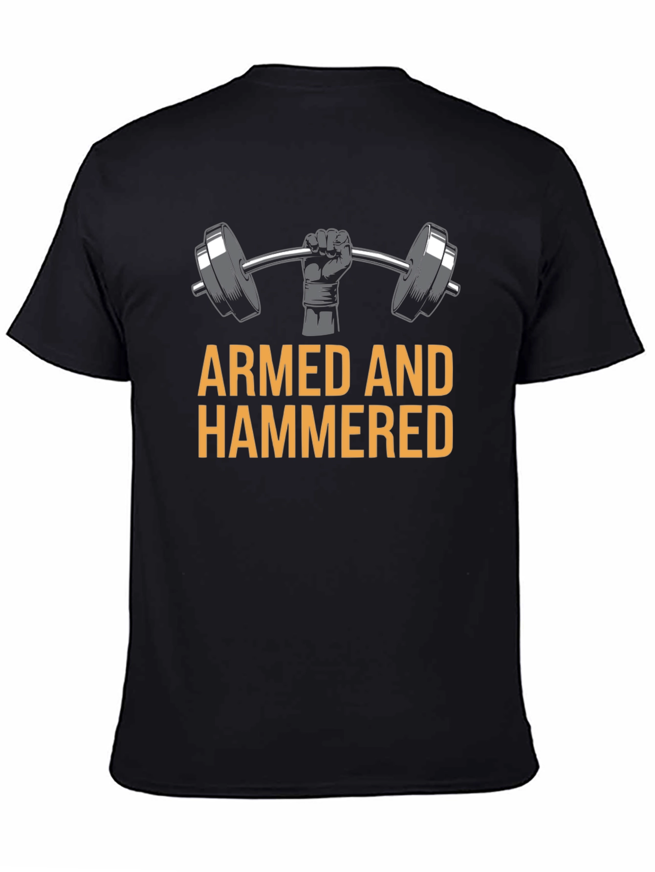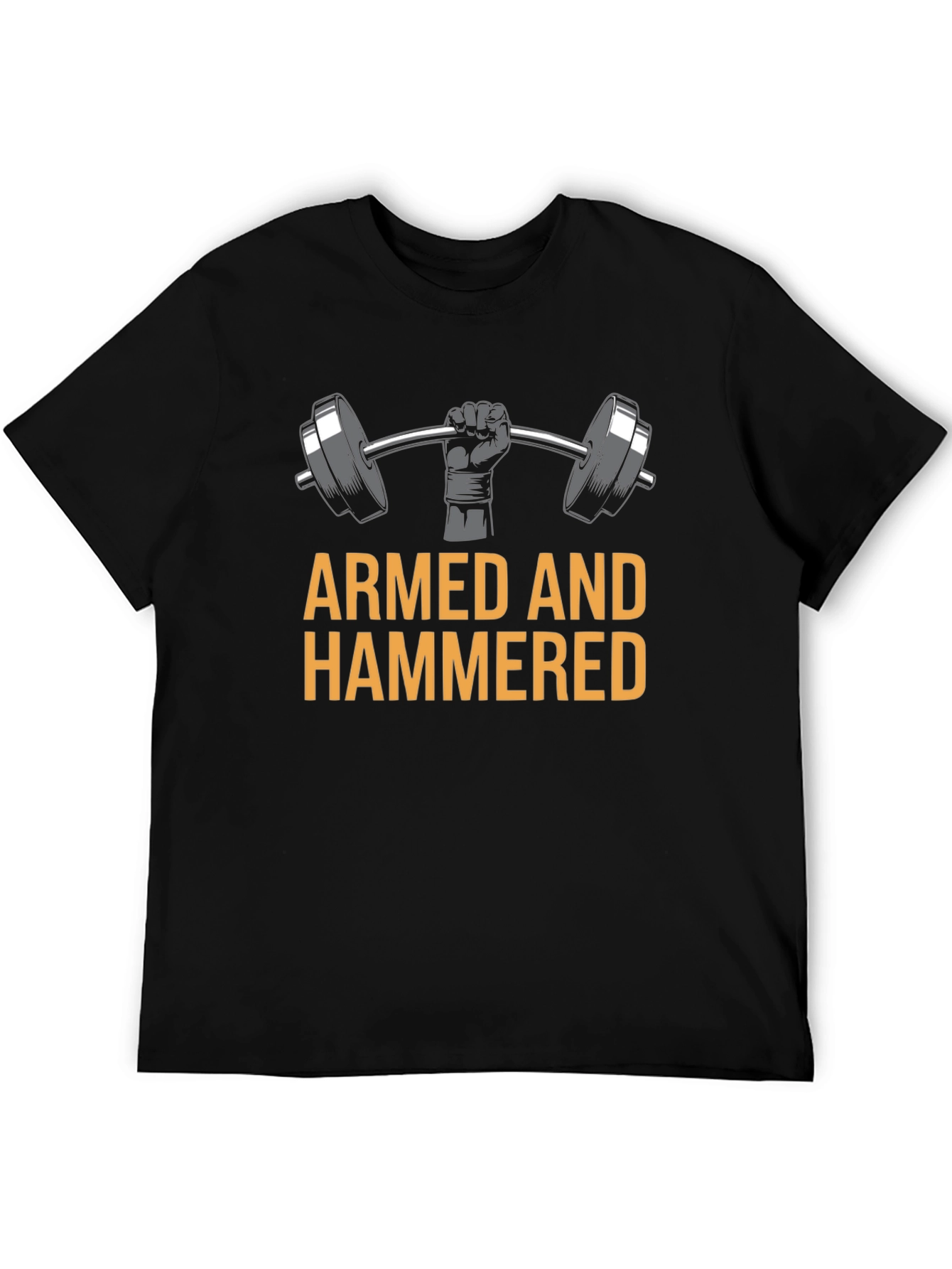 Muestra tu pasión por el gimnasio con esta camiseta negra de diseño único. Presenta un estampado llamativo de una mano sosteniendo una barra con pesas, acompañado del texto 'ARMED AND HAMMERED' en color dorado, ideal para motivarte en tus entrenamientos. Fabricada con materiales suaves y cómodos, esta camiseta es perfecta para sesiones intensas en el gimnasio o para un estilo casual. Su corte clásico y ajuste cómodo la hacen una prenda versátil para cualquier ocasión. Ideal para aquellos que aman levantar pesas y quieren lucir un estilo atlético y moderno.